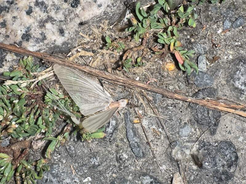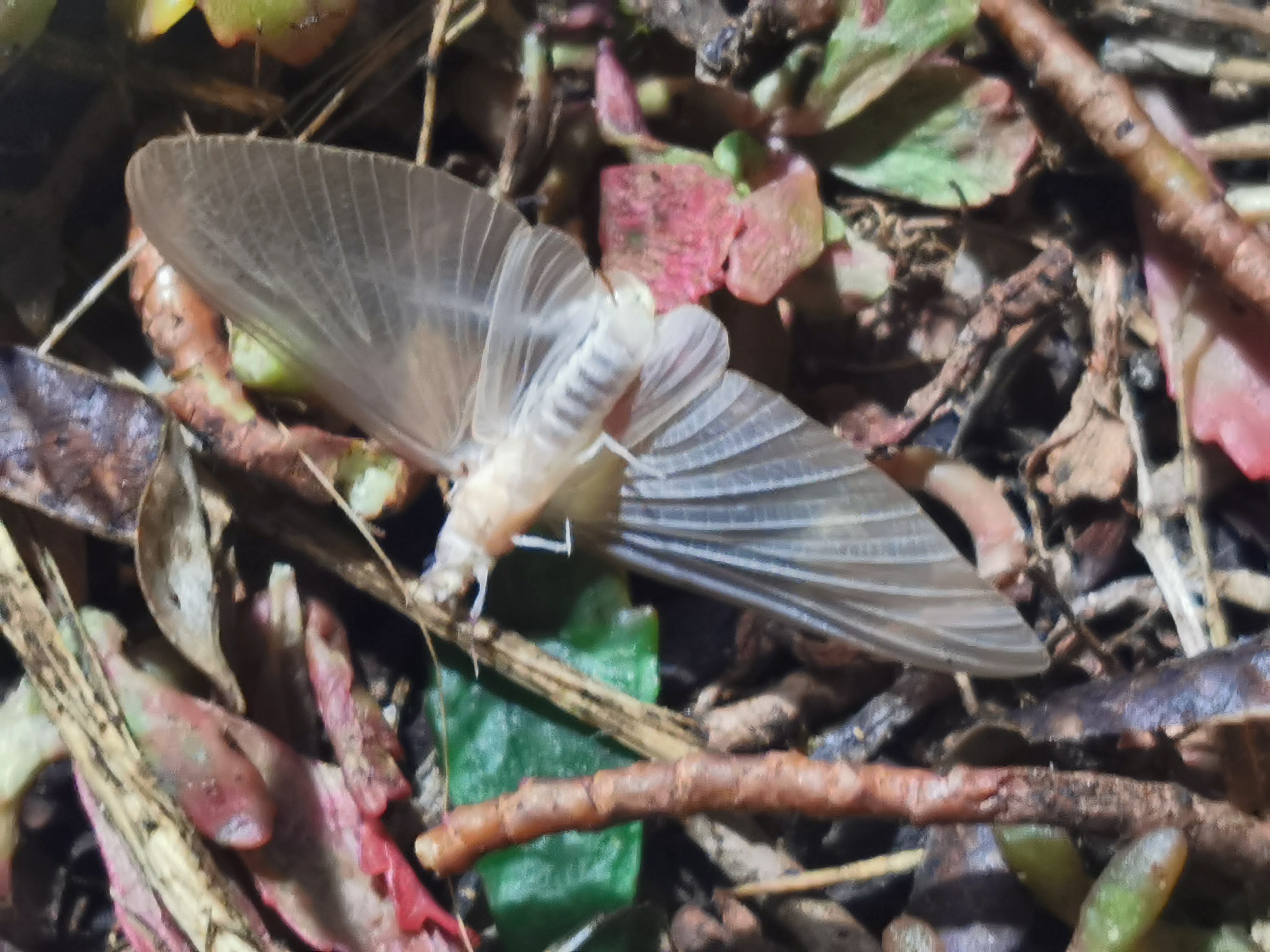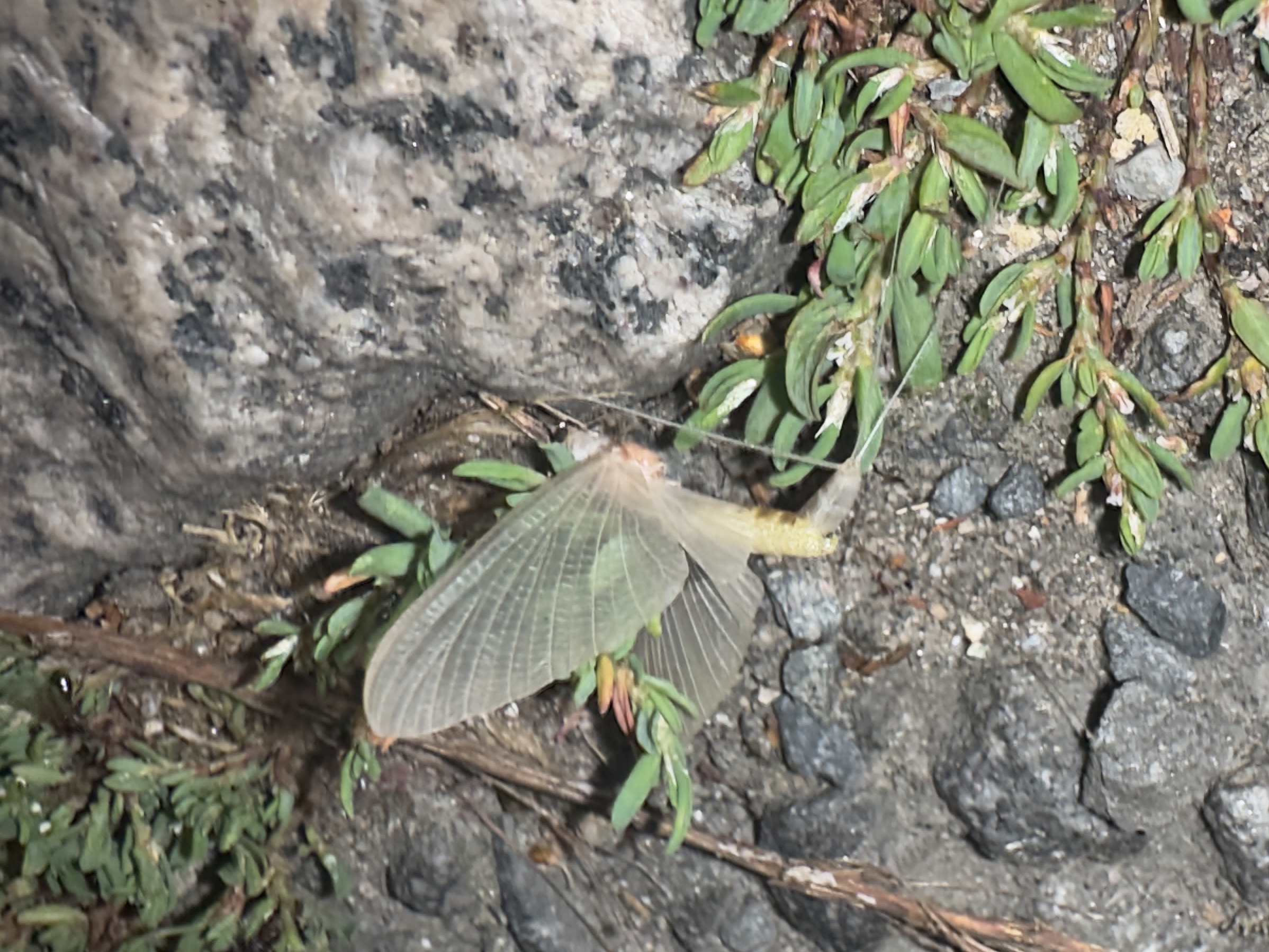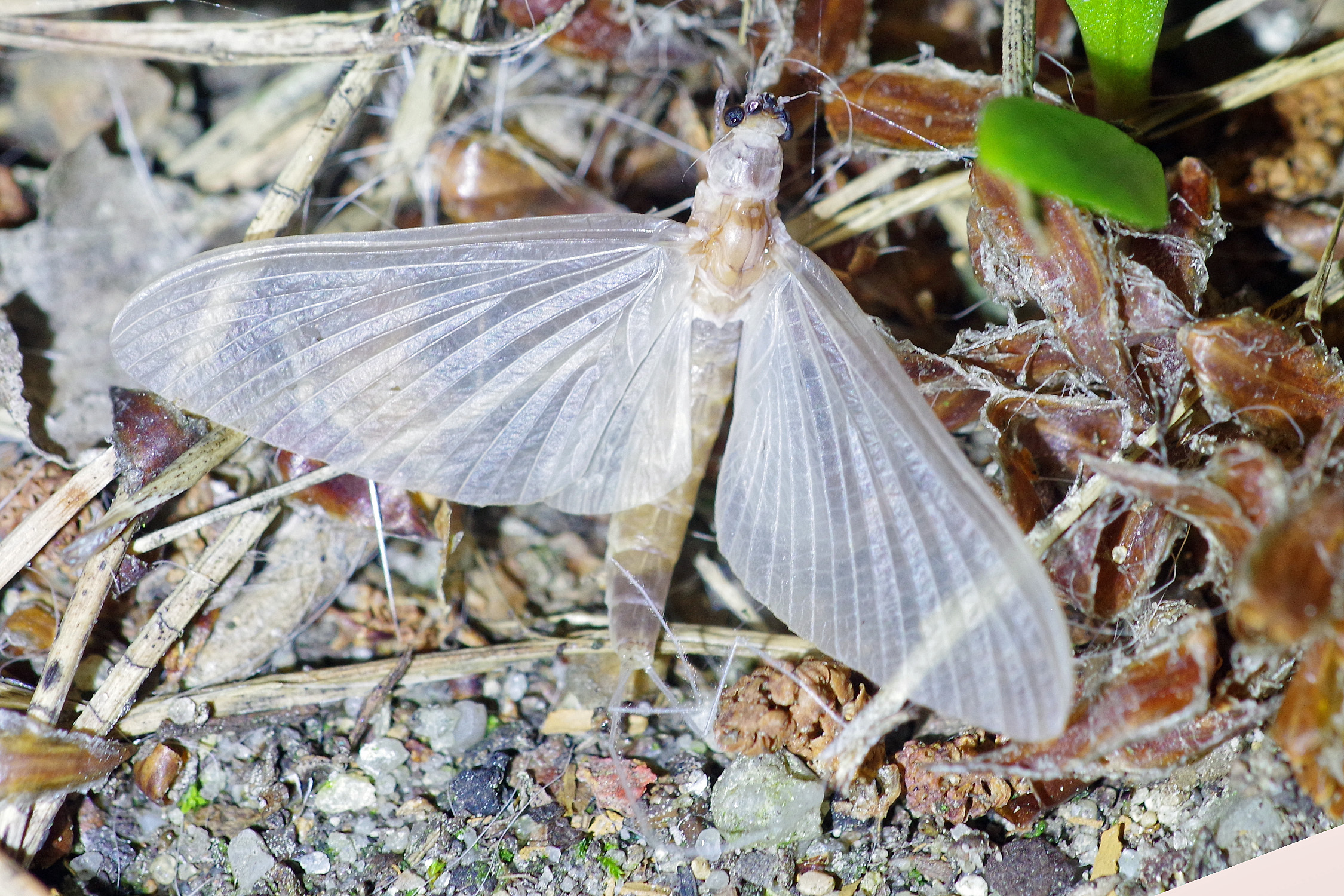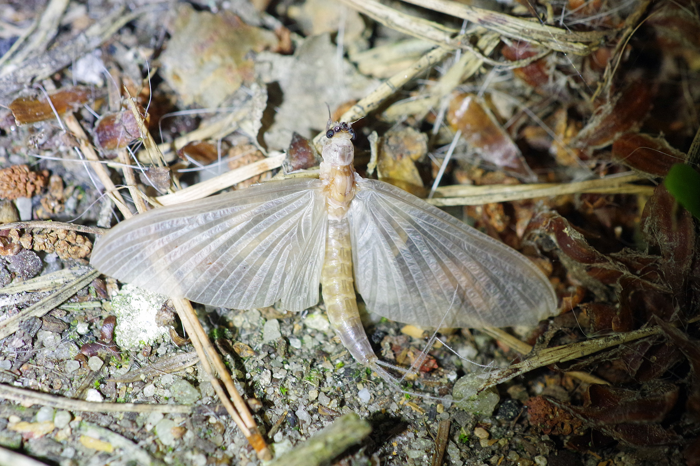 Am Morgen nach dem Massenflug. Die Weibchen sind verendet. Nach der Paarung ist ihr Hinterleib aufgeplatzt, um die vielen Eier freizugeben, doch gelangen sie bei den vielen Tieren, die vom Kunstlicht an Land gelockt wurden, nicht ins Wasser, wo sich die Larven entwickeln. Schwandorf, Juli 2019