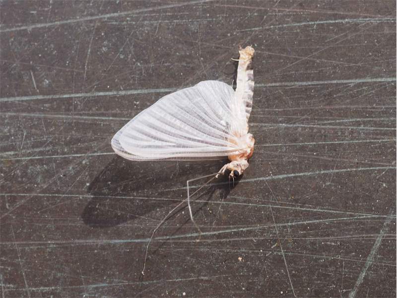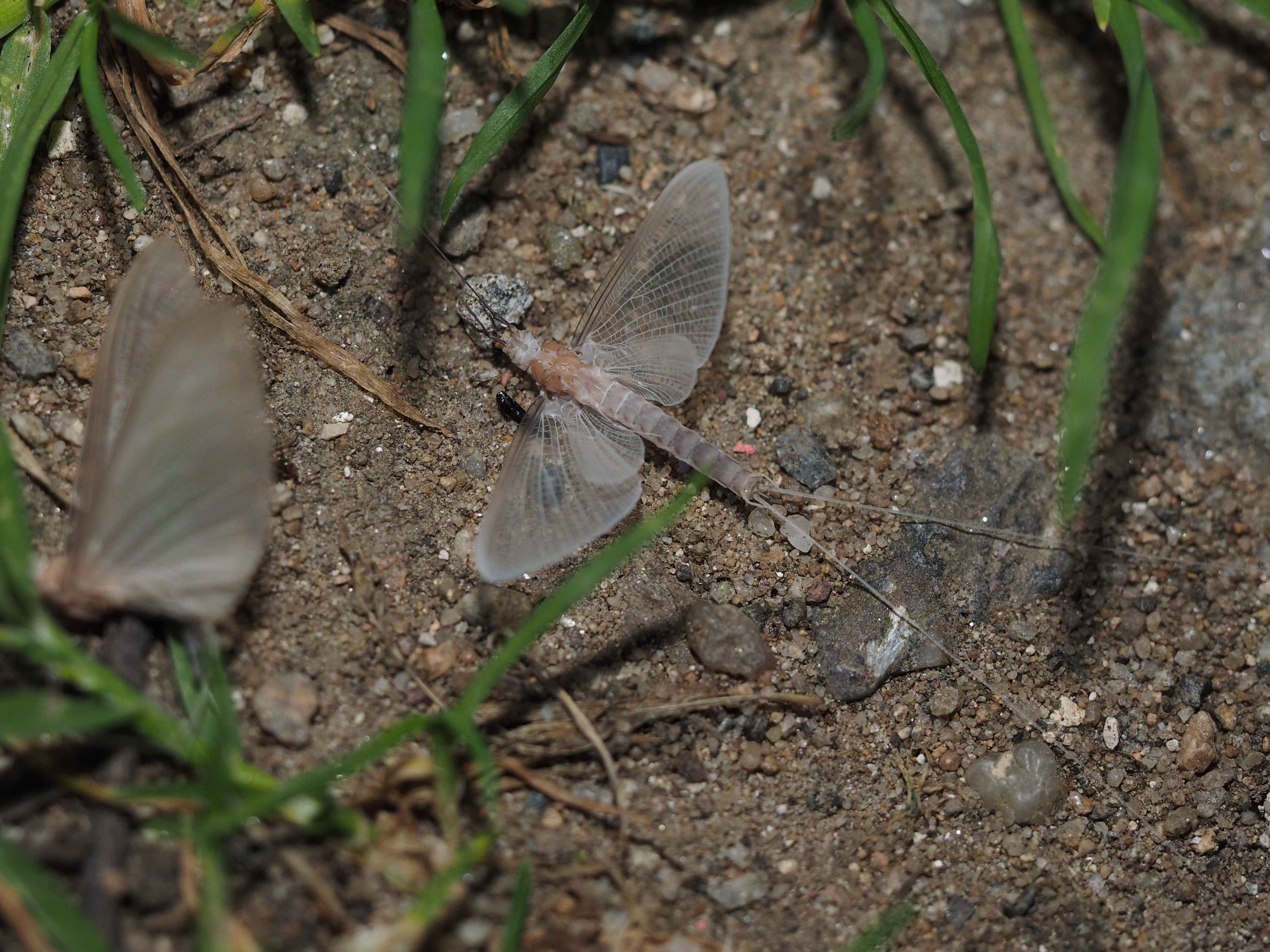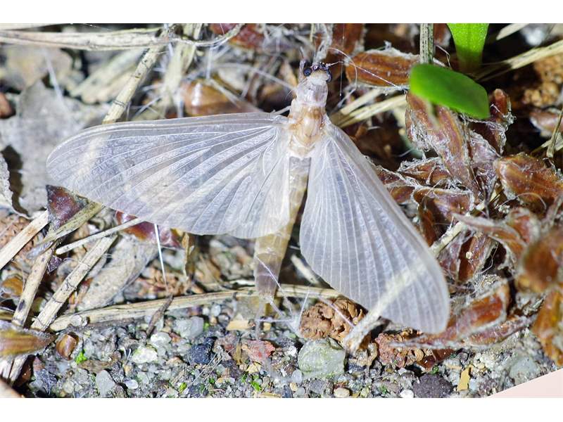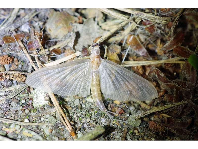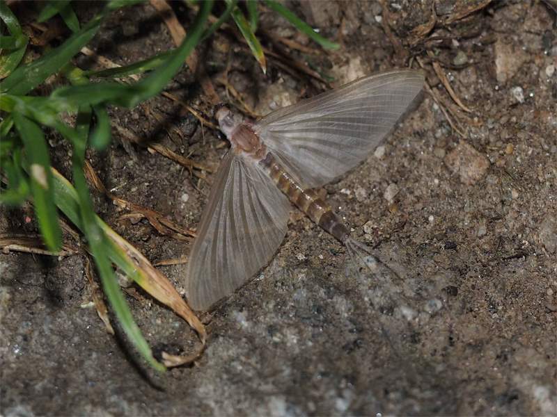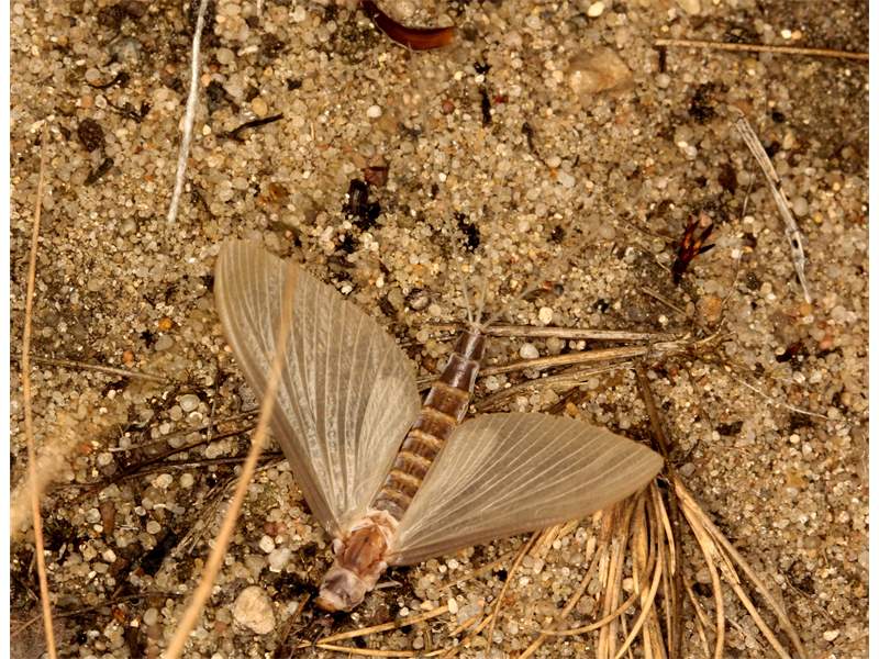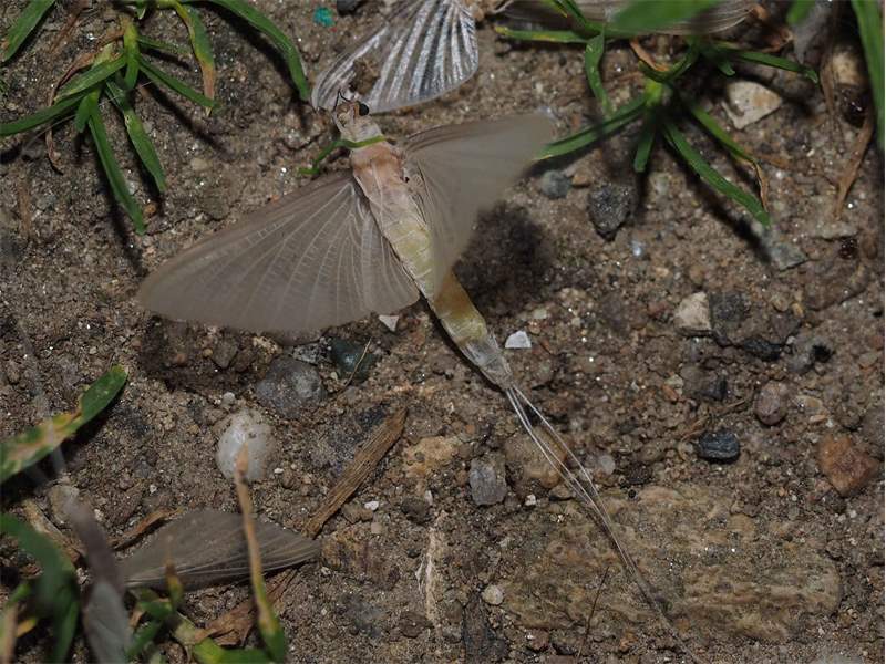 Am Morgen nach dem Massenflug. Die Weibchen sind verendet. Nach der Paarung ist ihr Hinterleib aufgeplatzt, um die vielen Eier freizugeben, doch gelangen sie bei den vielen Tieren, die vom Kunstlicht an Land gelockt wurden, nicht ins Wasser, wo sich die Larven entwickeln. Schwandorf, Juli 2019 (© Matthias Nuß)( Bild vergrößern)