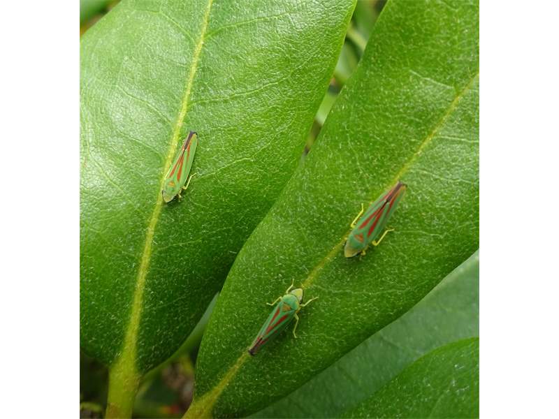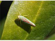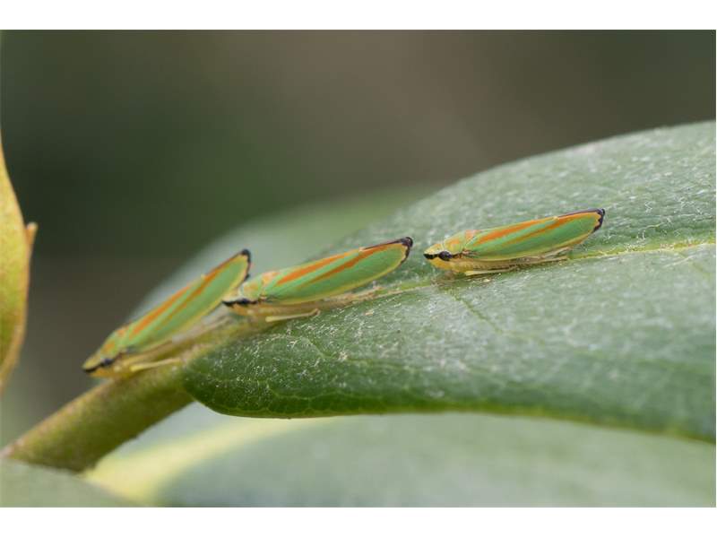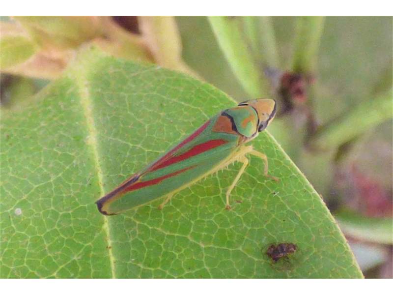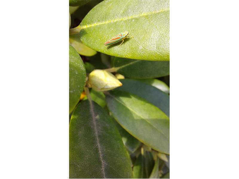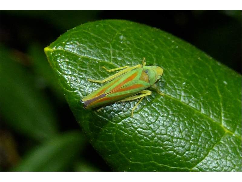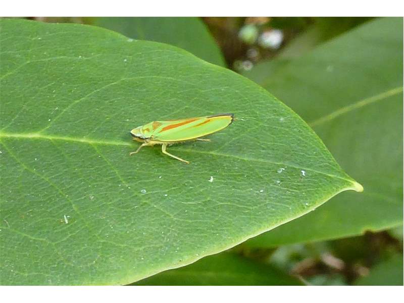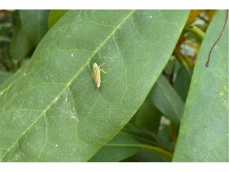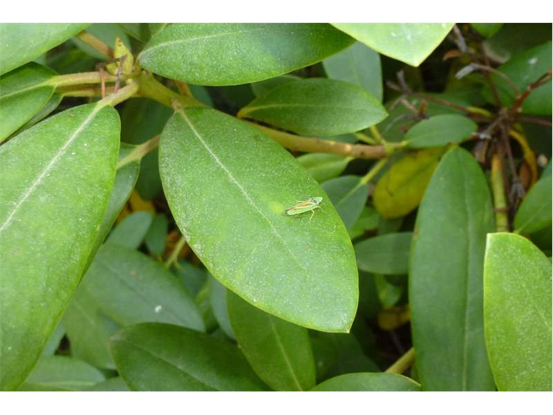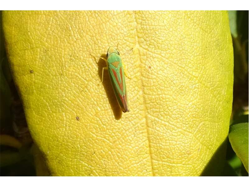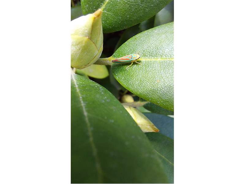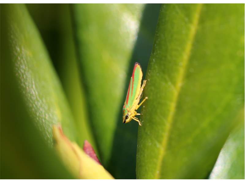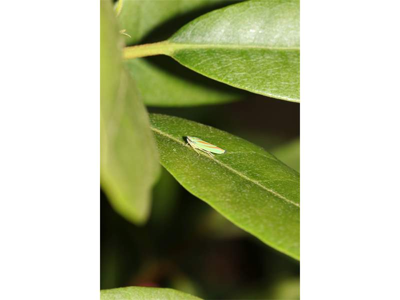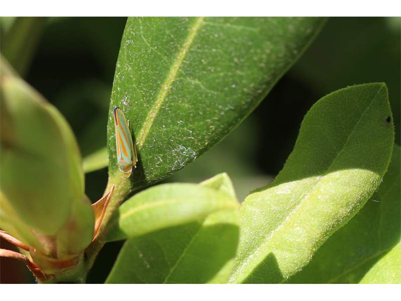 Rhododendronzikade (Graphocephala fennahi Young, 1977), an Rhododendron im Wohngrundstück, 01896 Lichtenberg, Juli 2018. (© Uwe Schäfer)( Bild vergrößern)