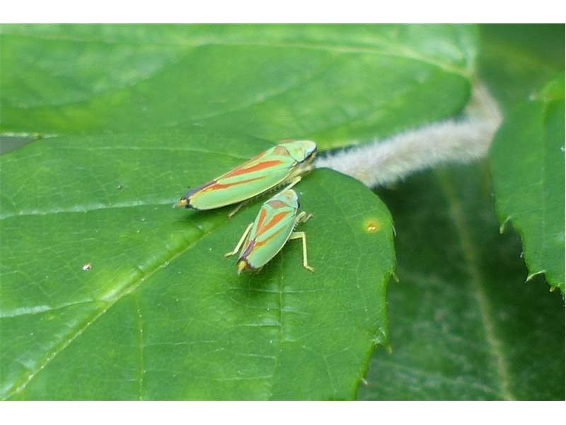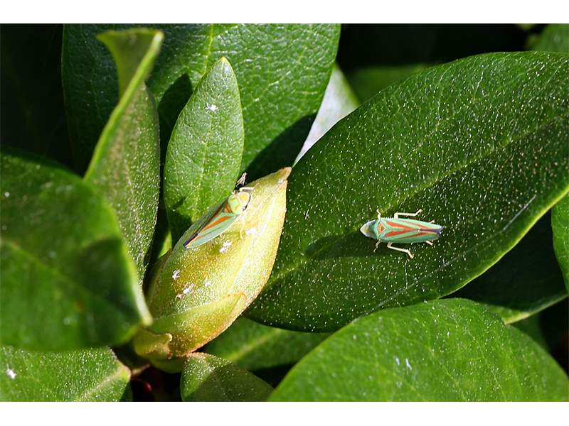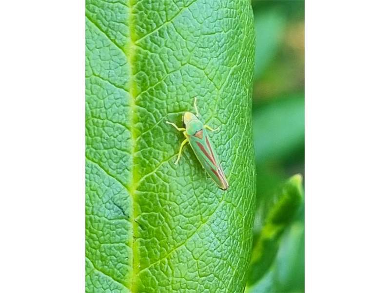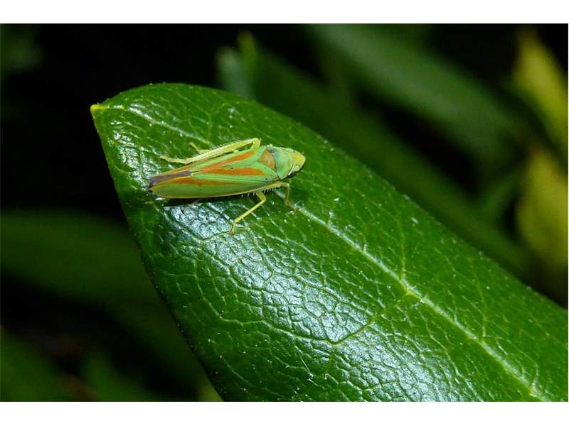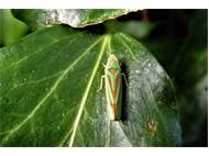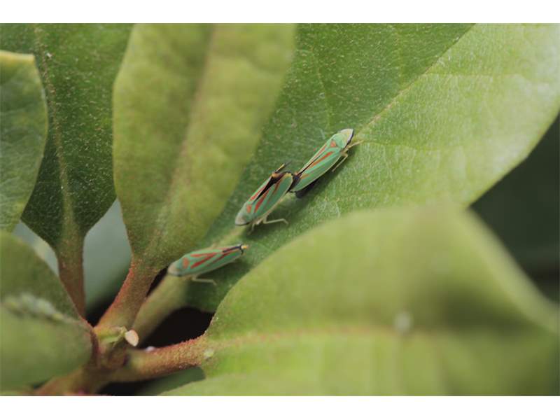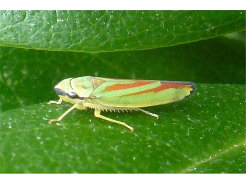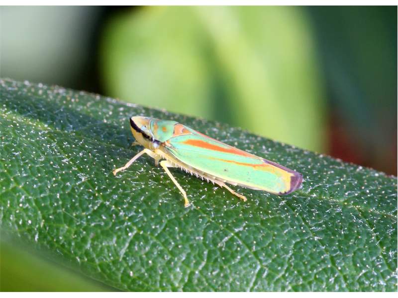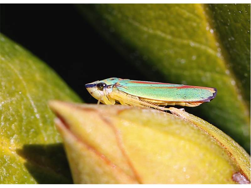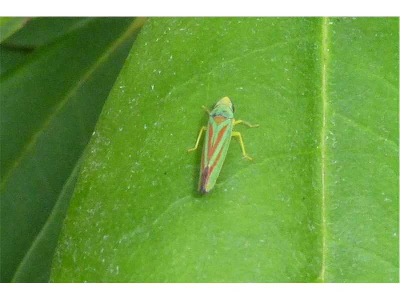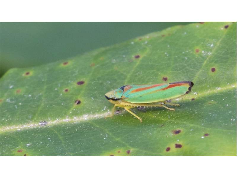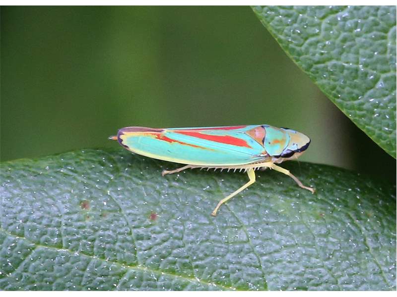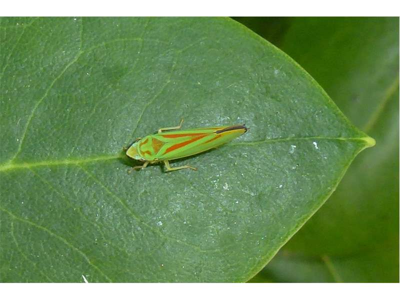 Rhododendronzikade (Graphocephala fennahi Young, 1977), an Rhododendron im Wohngrundstück, 01896 Lichtenberg, Juli 2018. (© Uwe Schäfer)( Bild vergrößern)
