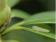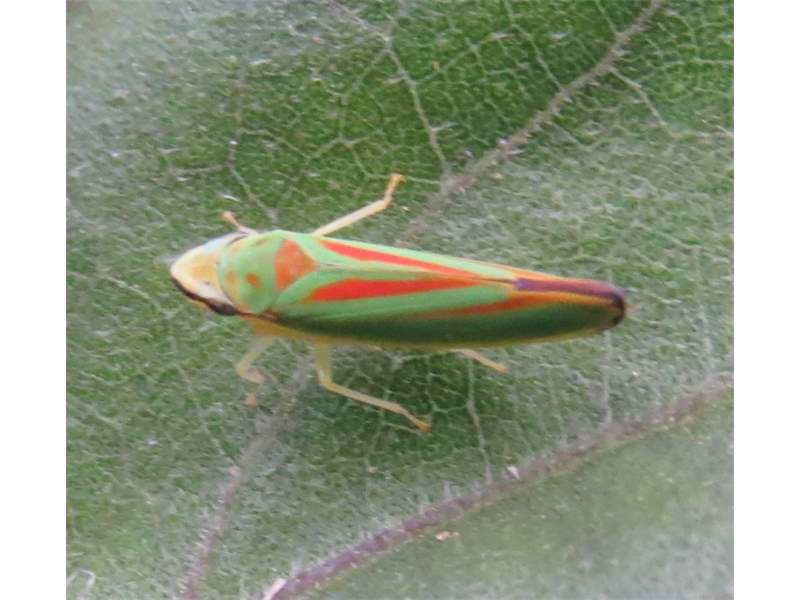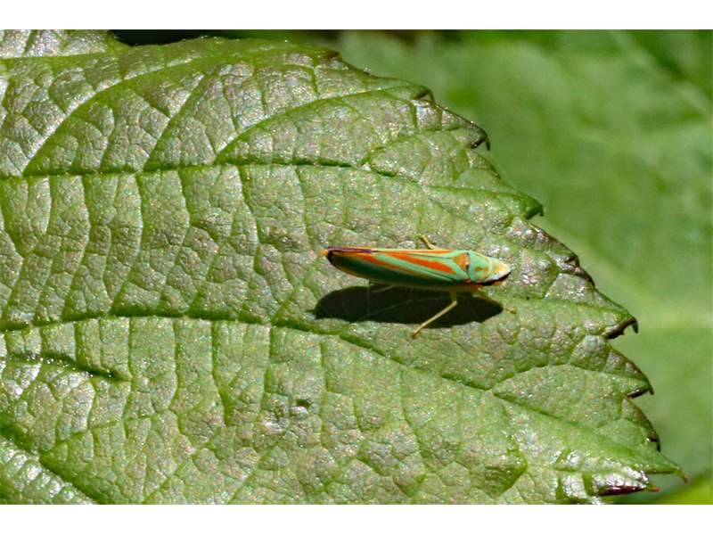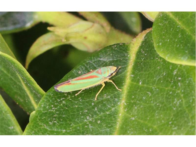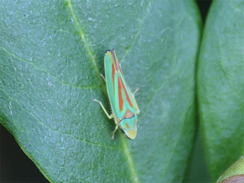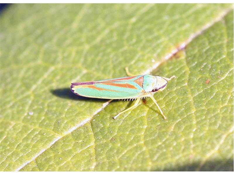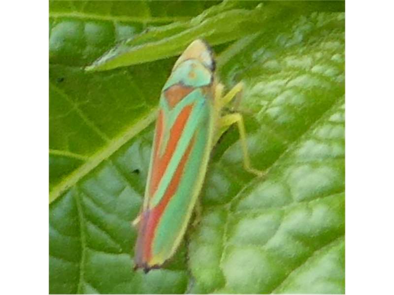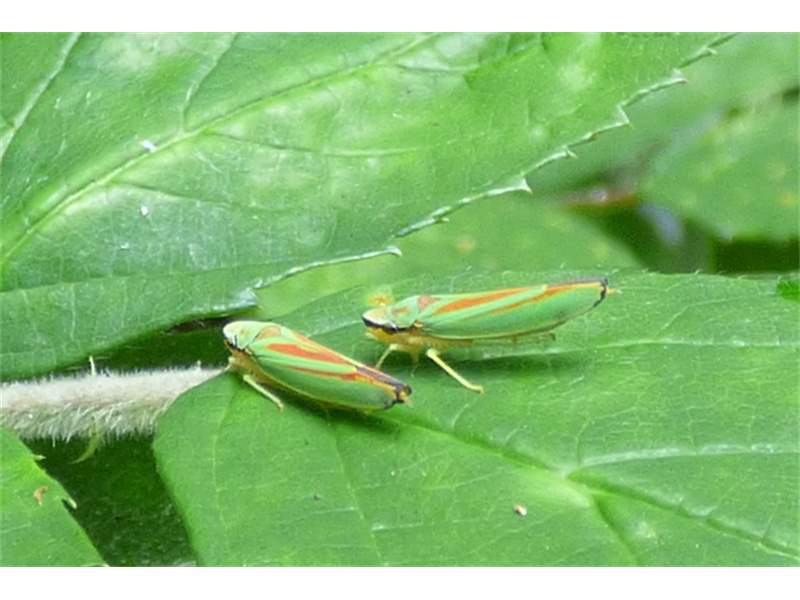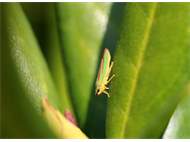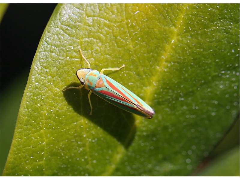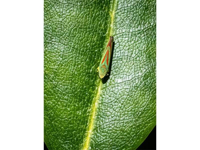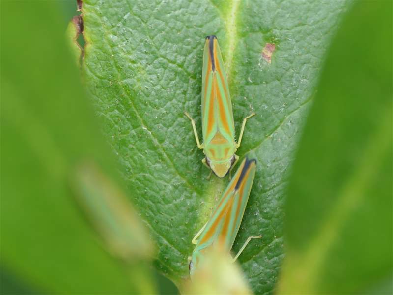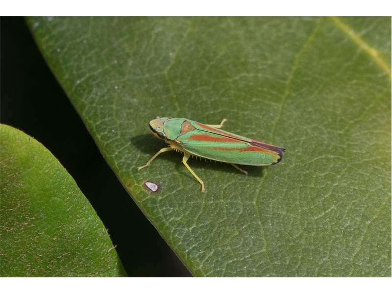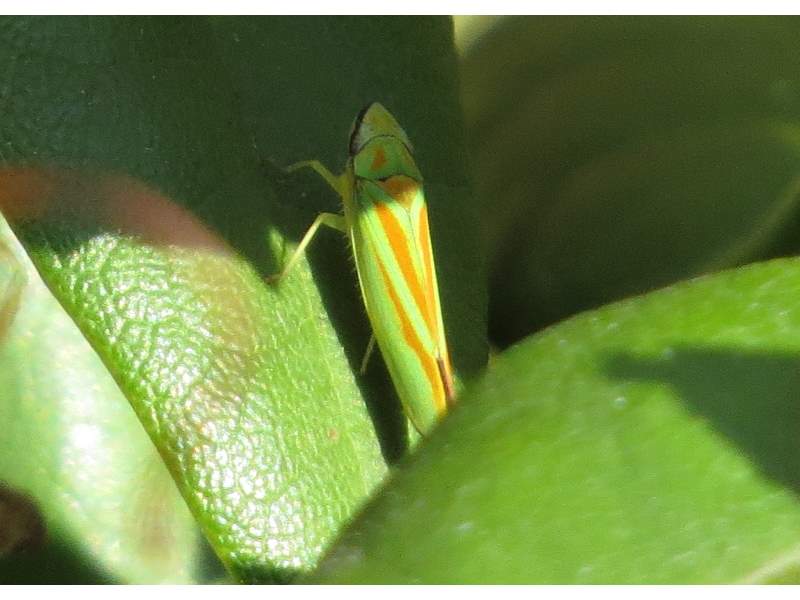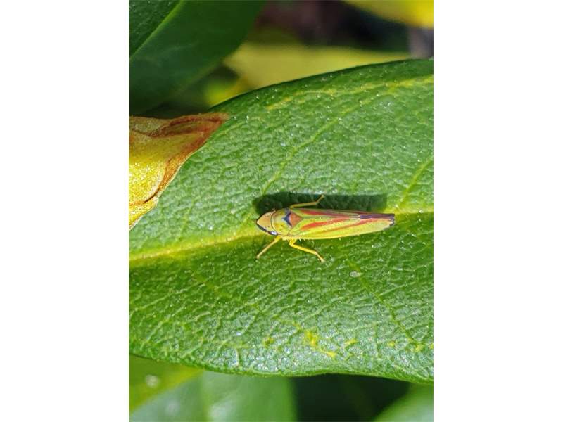 Rhododendronzikade (Graphocephala fennahi Young, 1977), an Rhododendron im Wohngrundstück, 01896 Lichtenberg, Juli 2018. (© Uwe Schäfer)( Bild vergrößern)