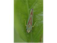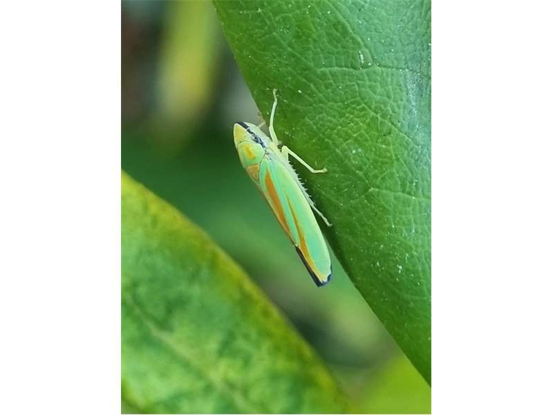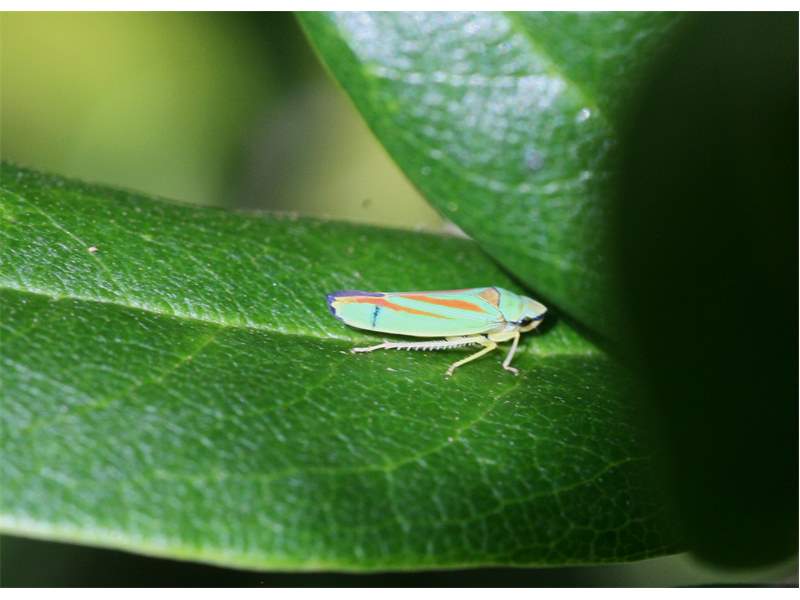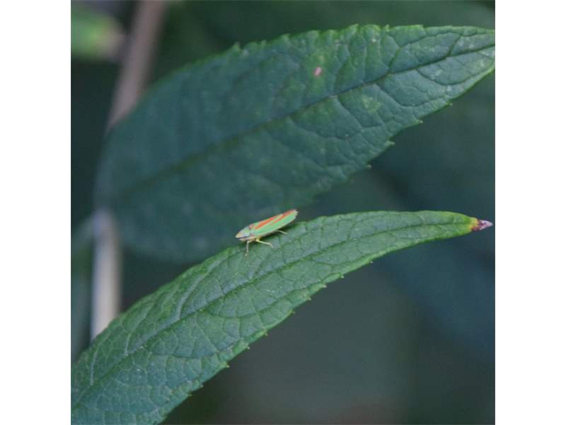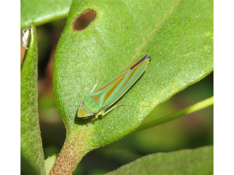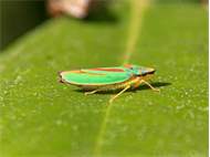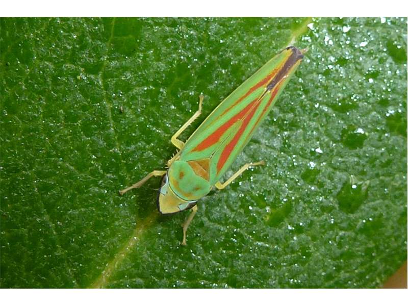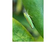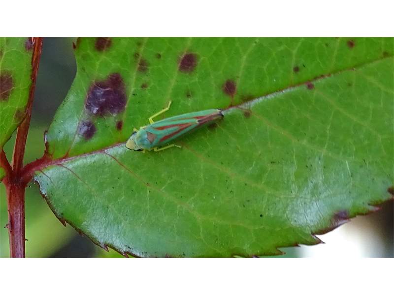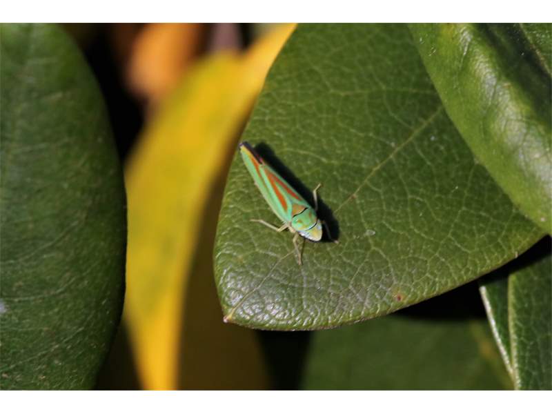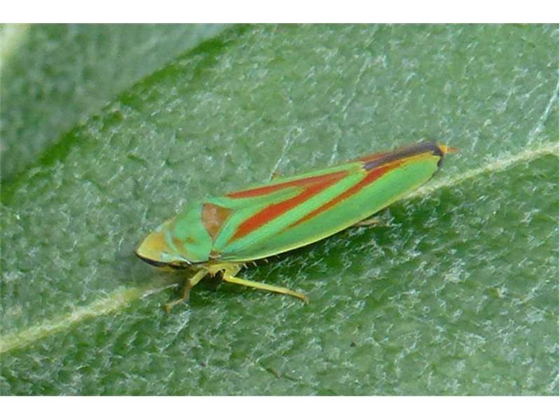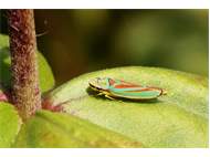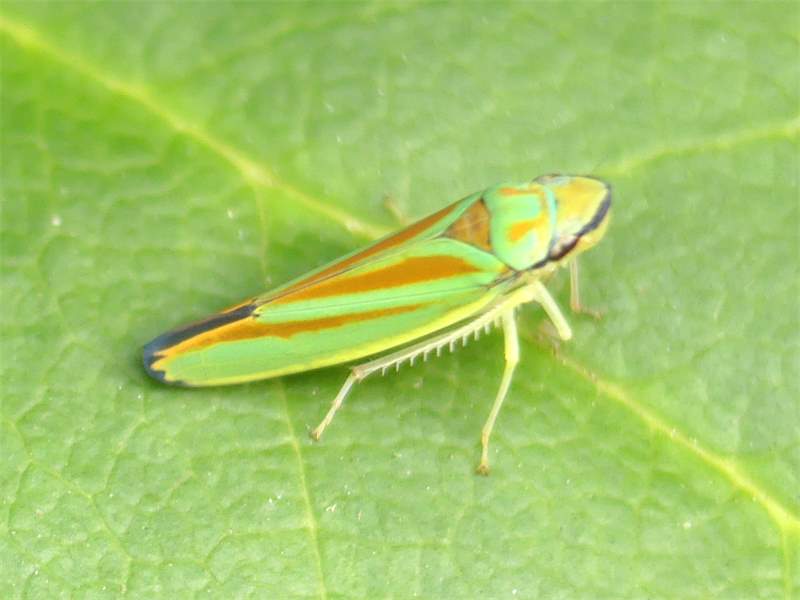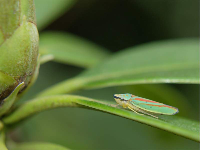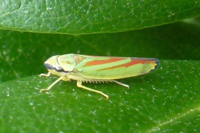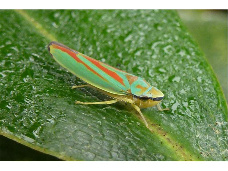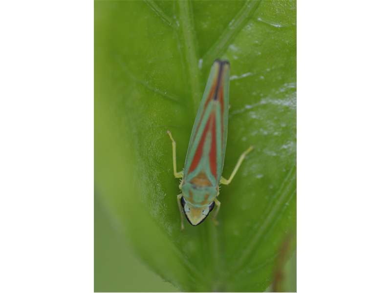 Rhododendronzikade (Graphocephala fennahi Young, 1977), an Rhododendron im Wohngrundstück, 01896 Lichtenberg, Juli 2018. (© Uwe Schäfer)( Bild vergrößern)