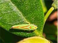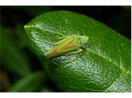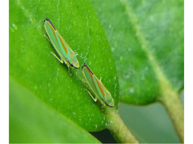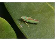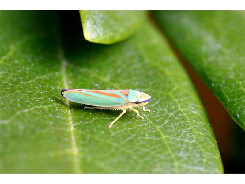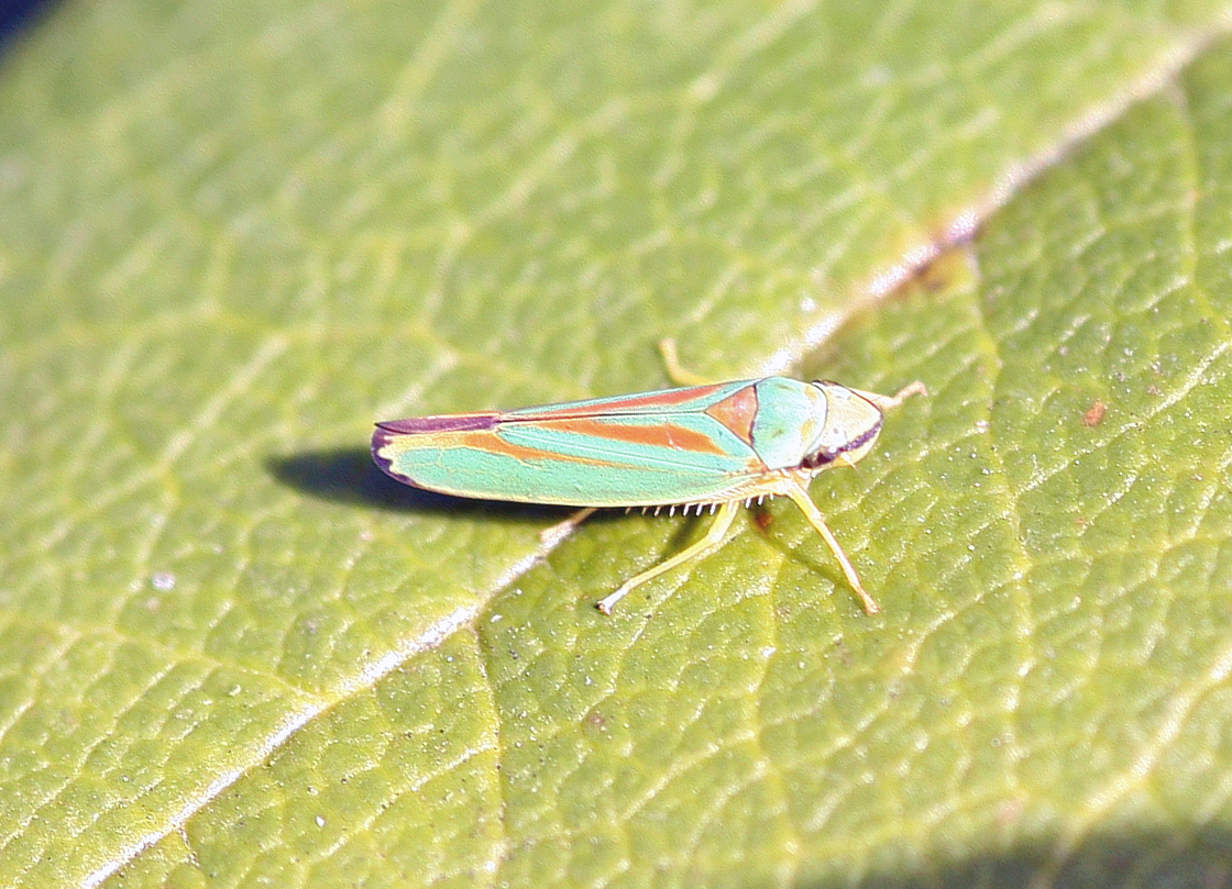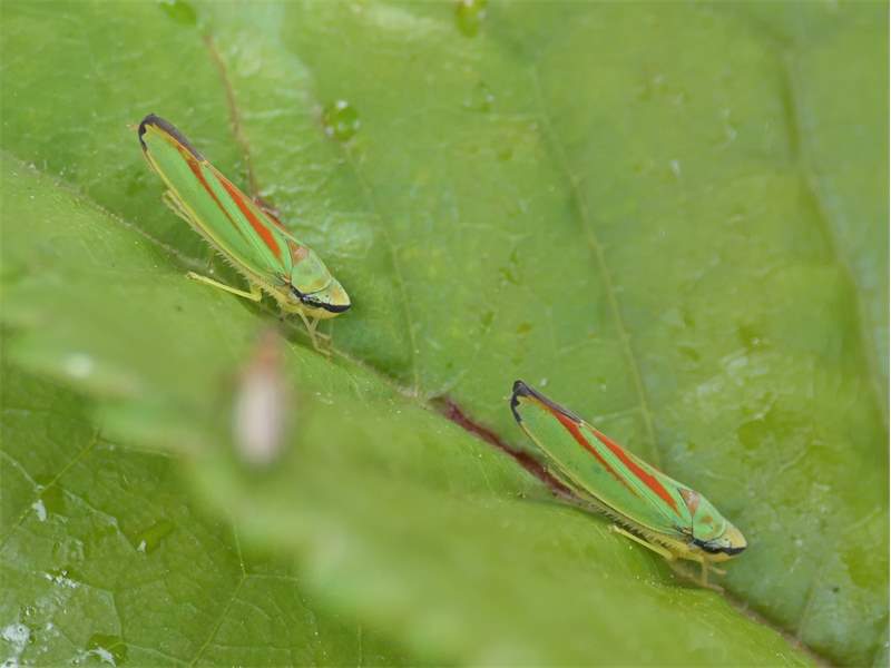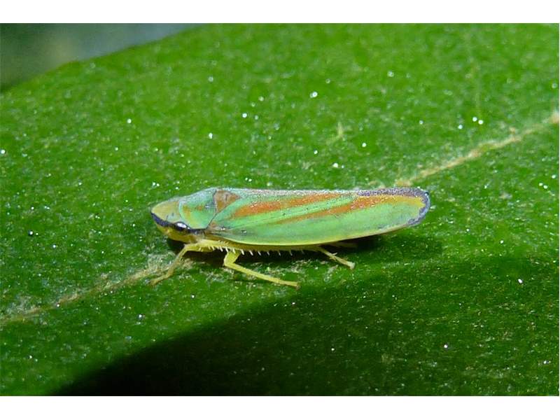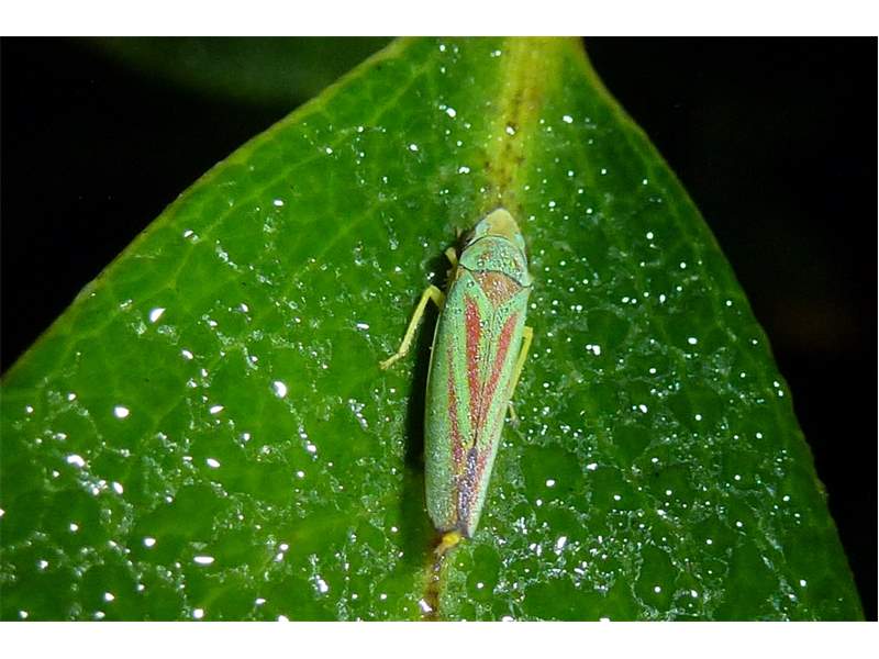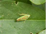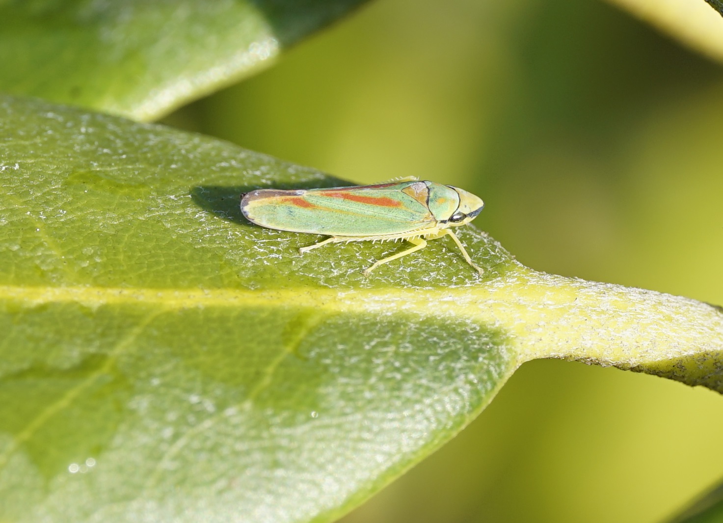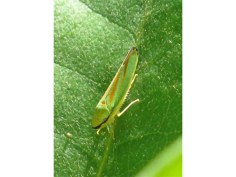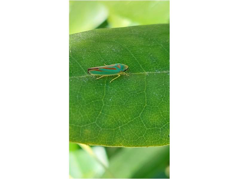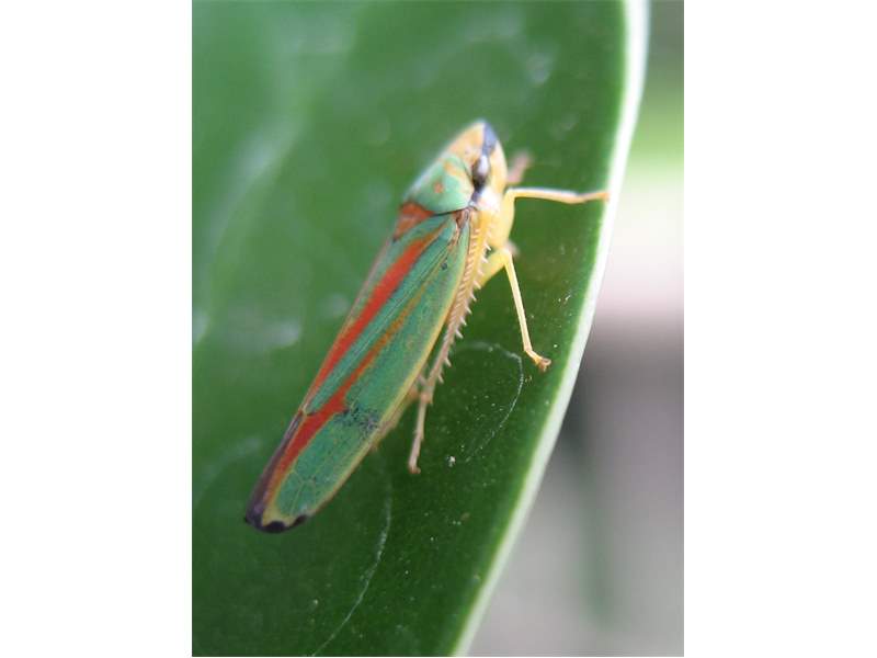 Rhododendronzikade (Graphocephala fennahi Young, 1977), an Rhododendron im Wohngrundstück, 01896 Lichtenberg, Juli 2018. (© Uwe Schäfer)( Bild vergrößern)
