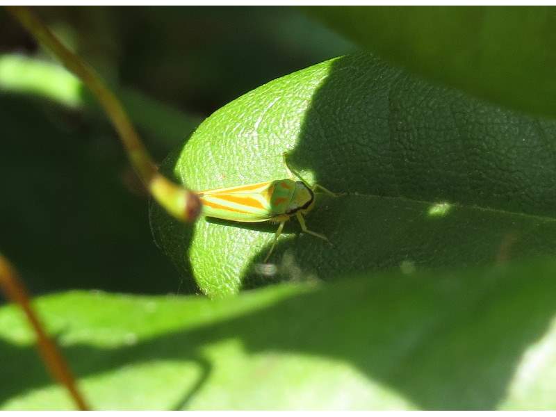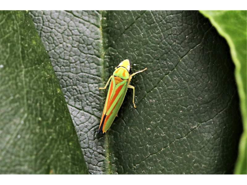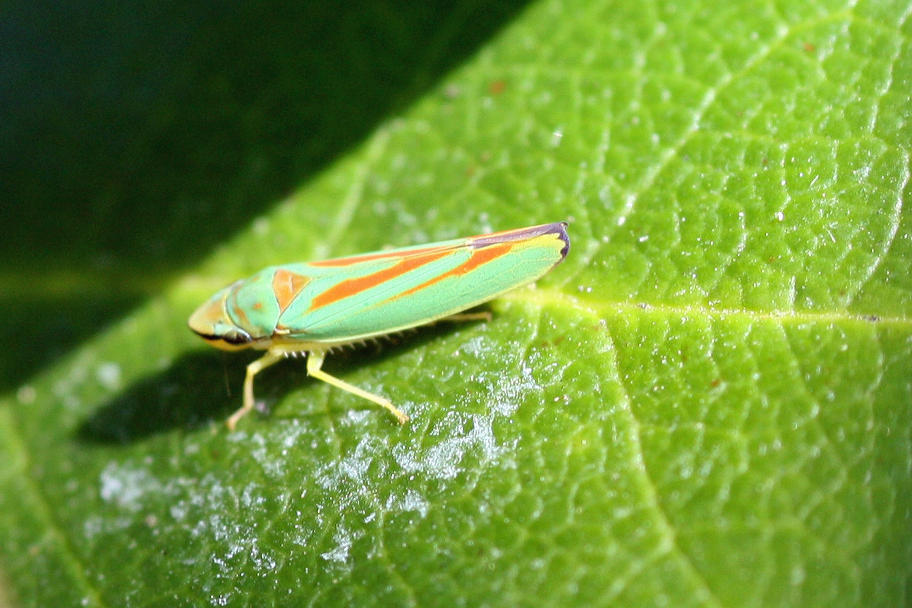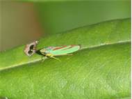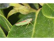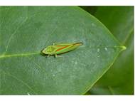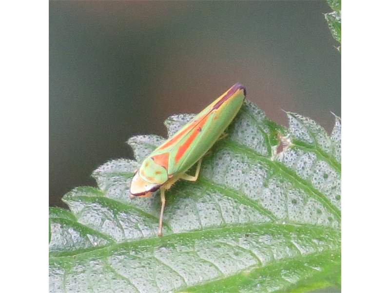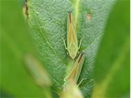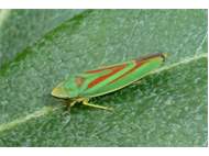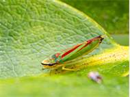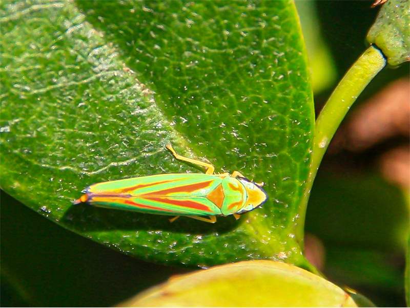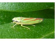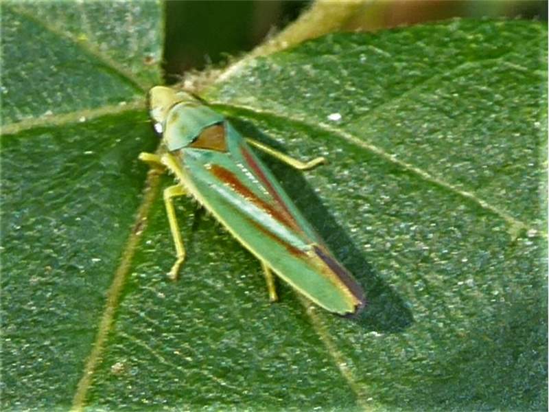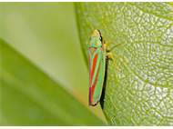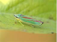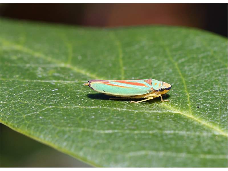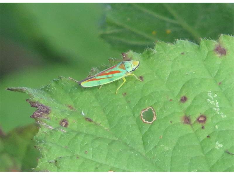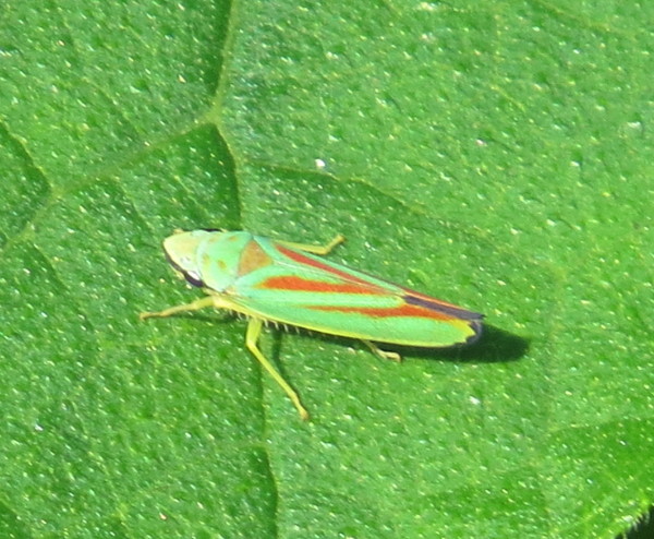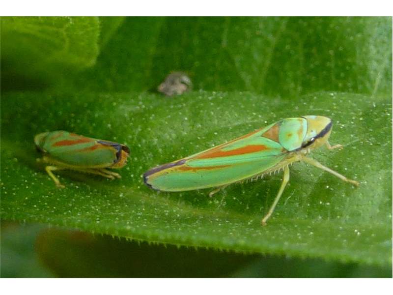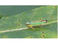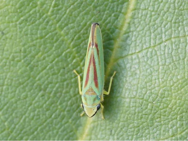 Rhododendronzikade (Graphocephala fennahi Young, 1977), an Rhododendron im Wohngrundstück, 01896 Lichtenberg, Juli 2018. (© Uwe Schäfer)( Bild vergrößern)