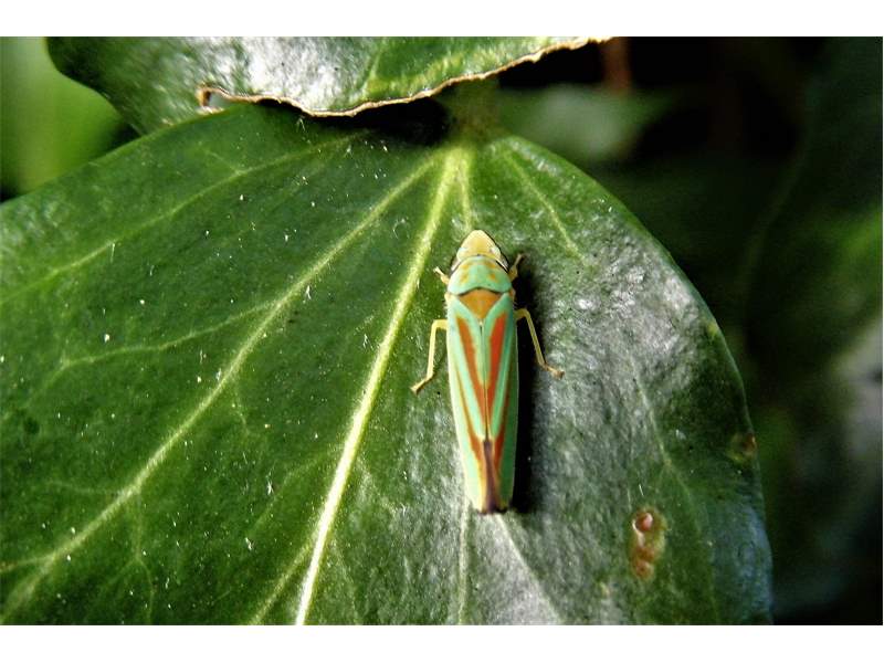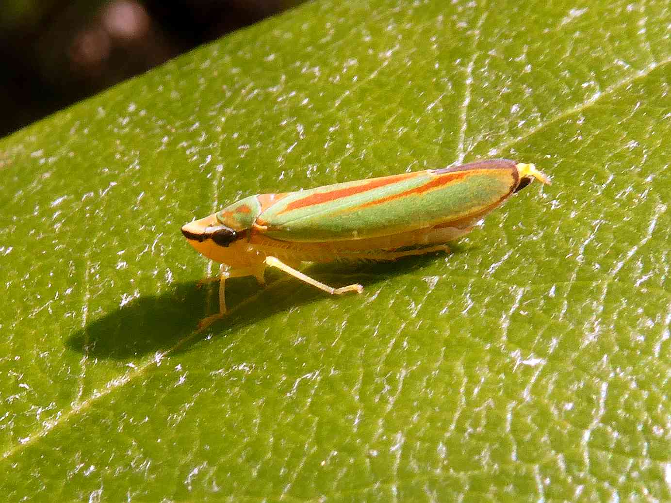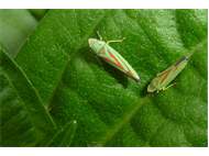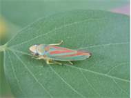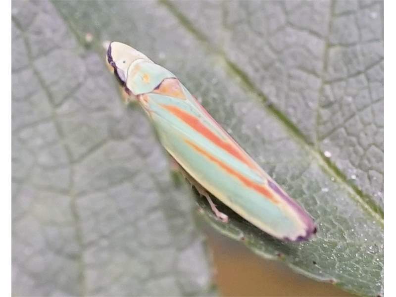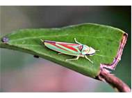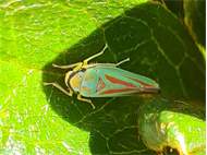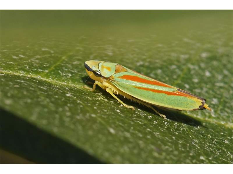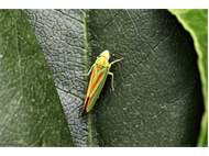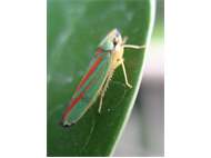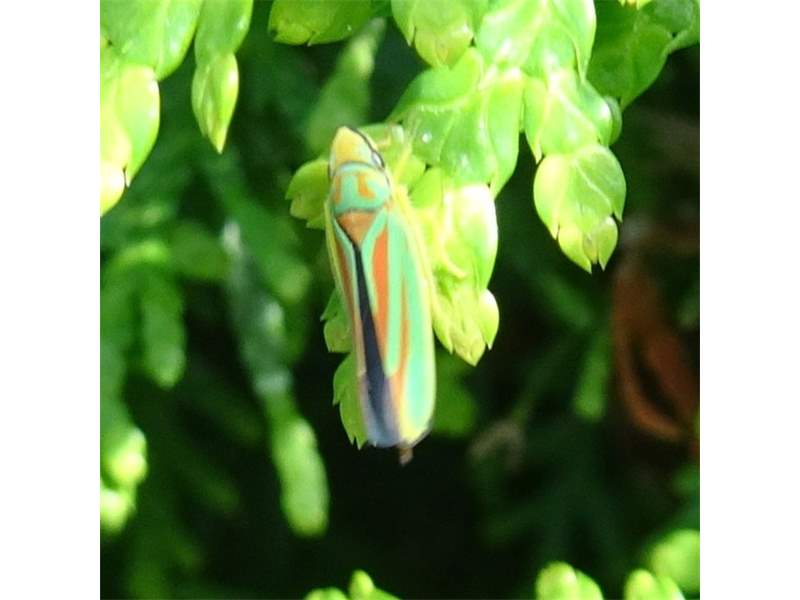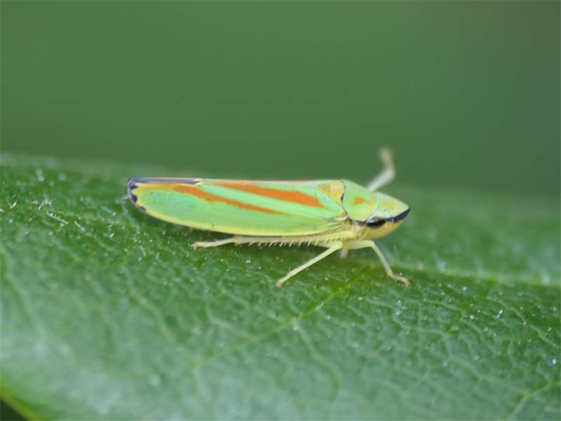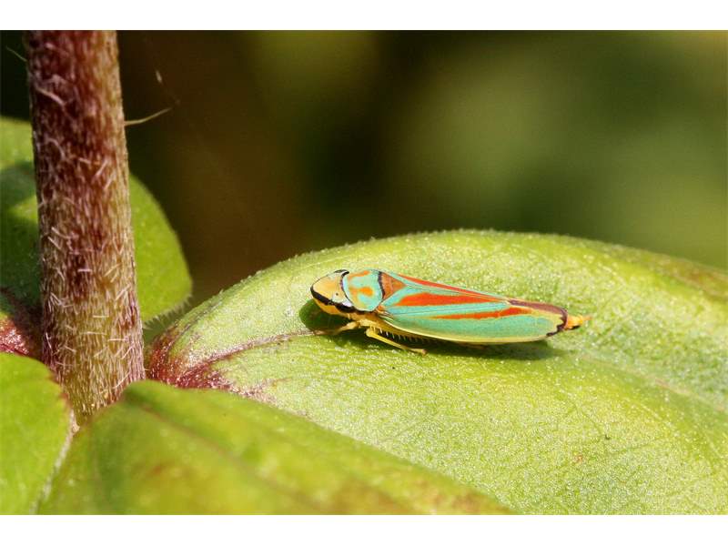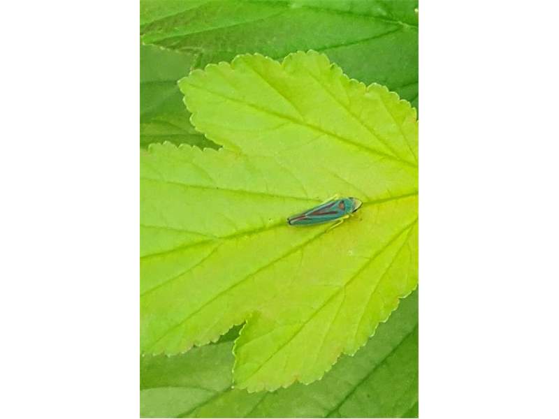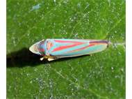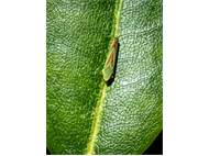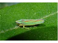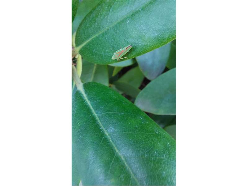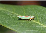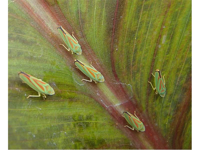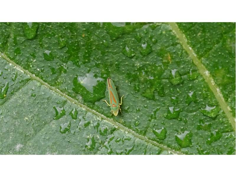 Rhododendronzikade (Graphocephala fennahi Young, 1977), an Rhododendron im Wohngrundstück, 01896 Lichtenberg, Juli 2018. (© Uwe Schäfer)( Bild vergrößern)