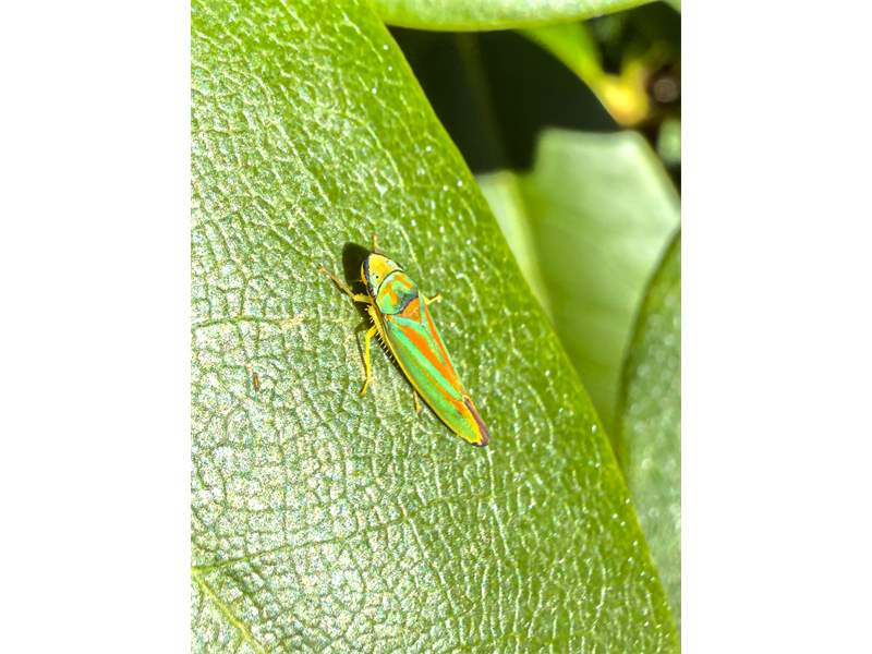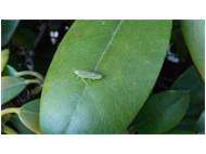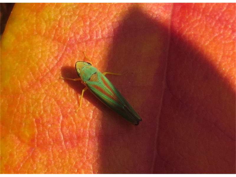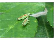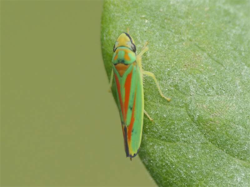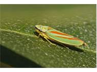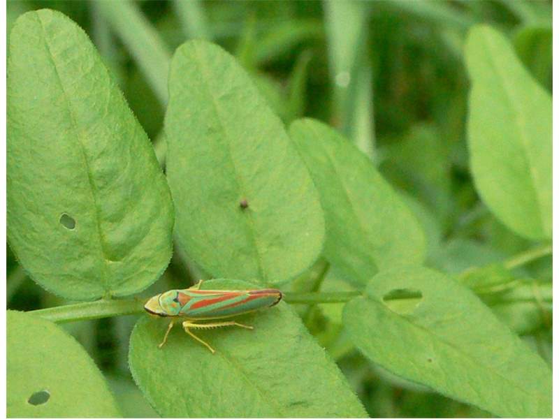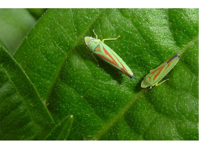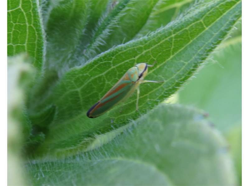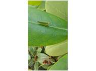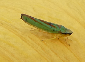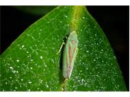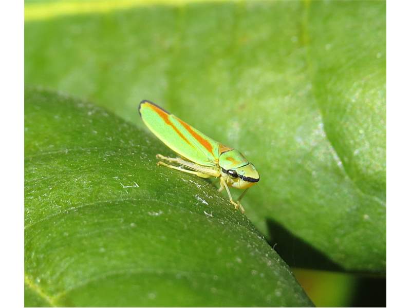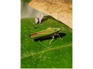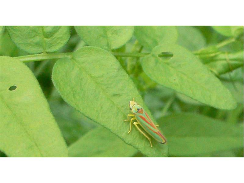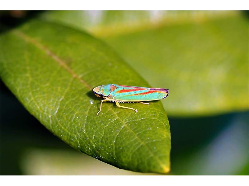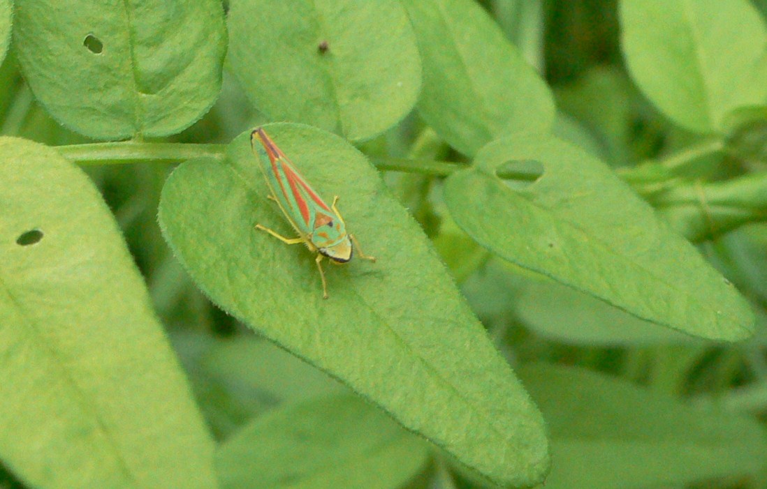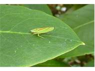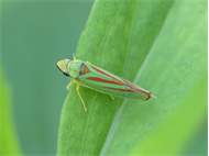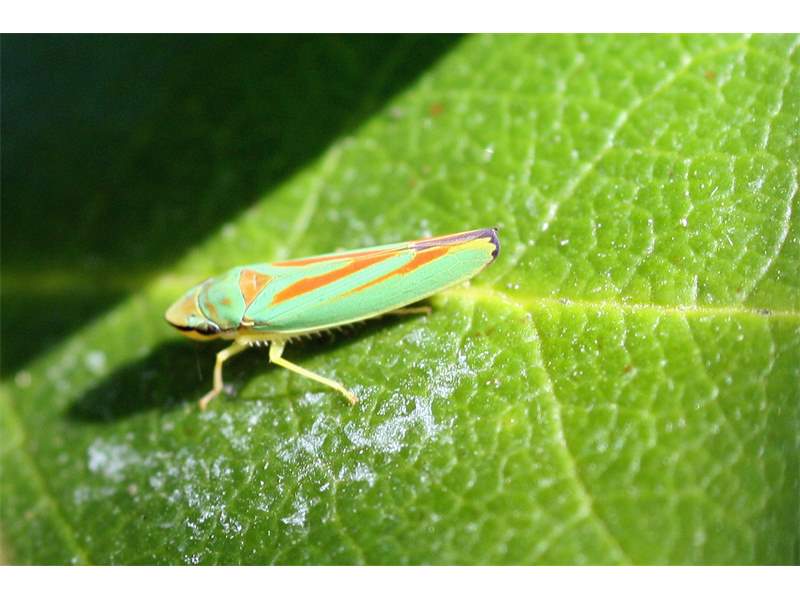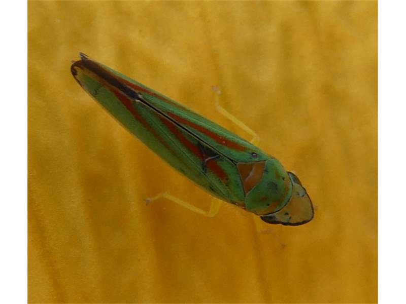 Rhododendronzikade (Graphocephala fennahi Young, 1977), an Rhododendron im Wohngrundstück, 01896 Lichtenberg, Juli 2018. (© Uwe Schäfer)( Bild vergrößern)