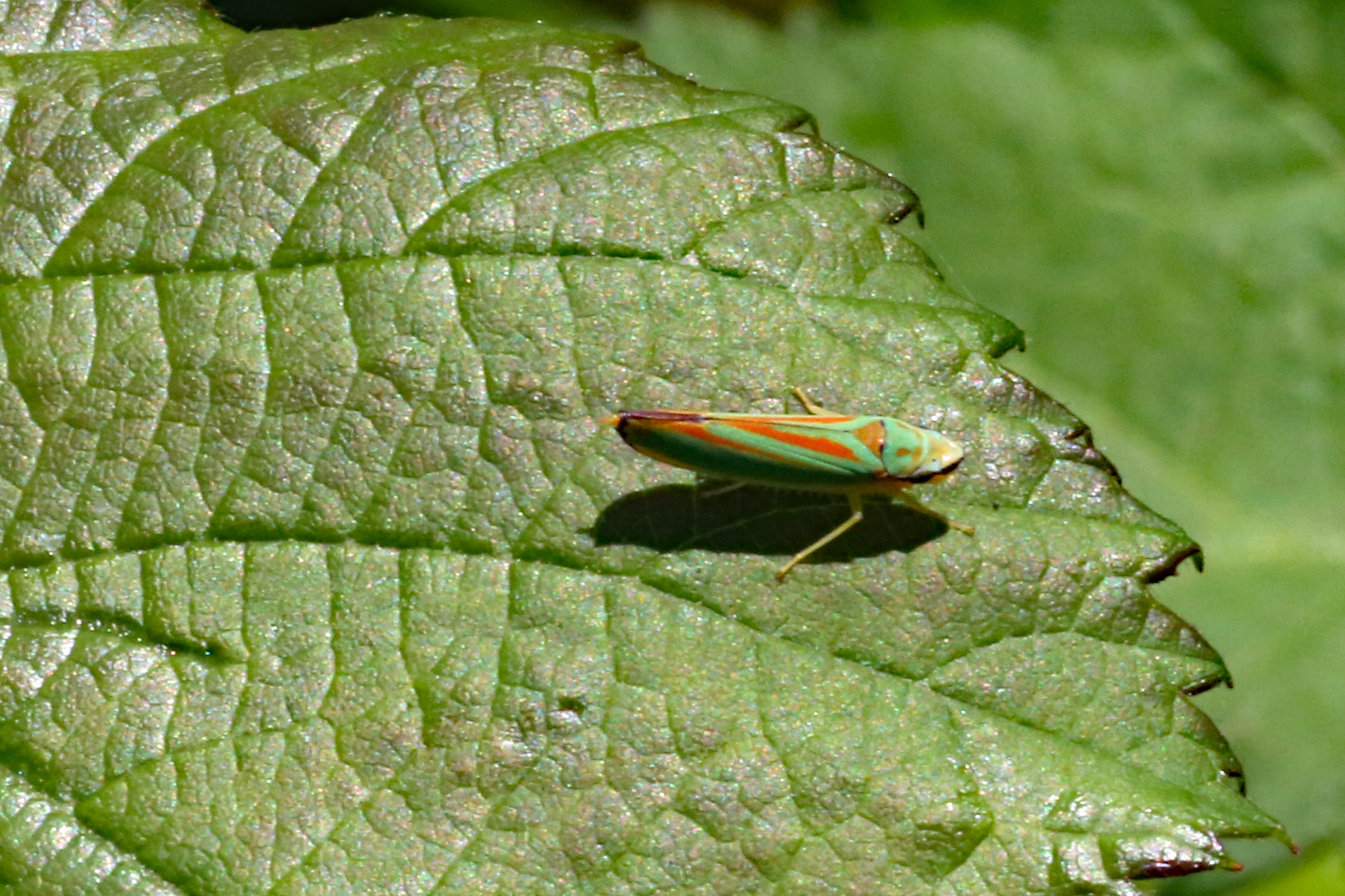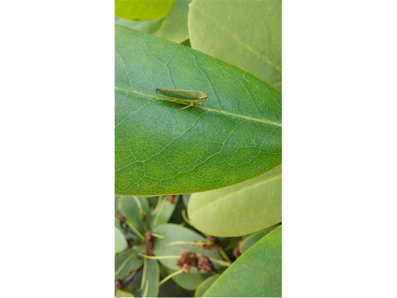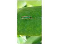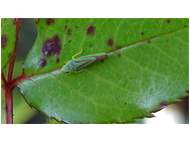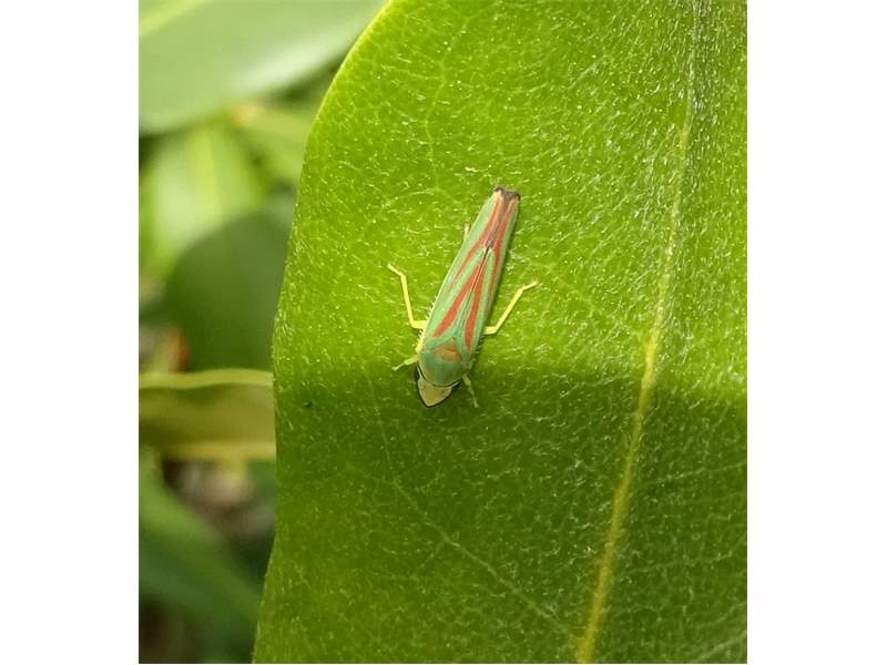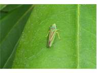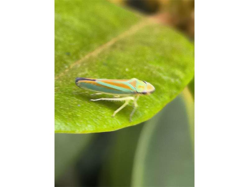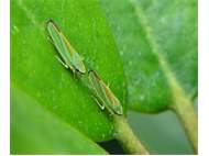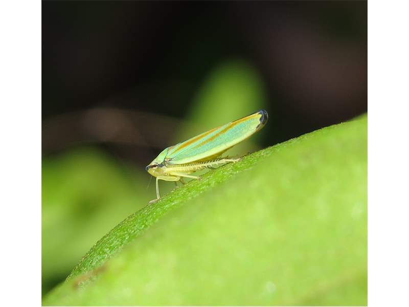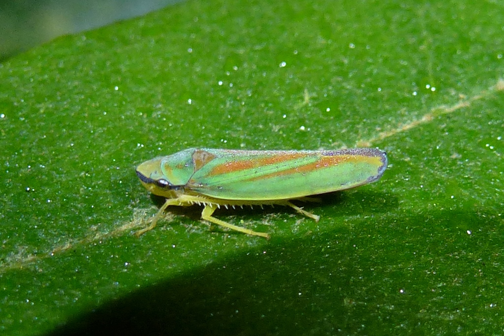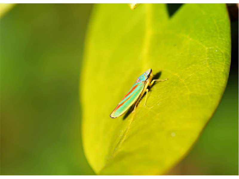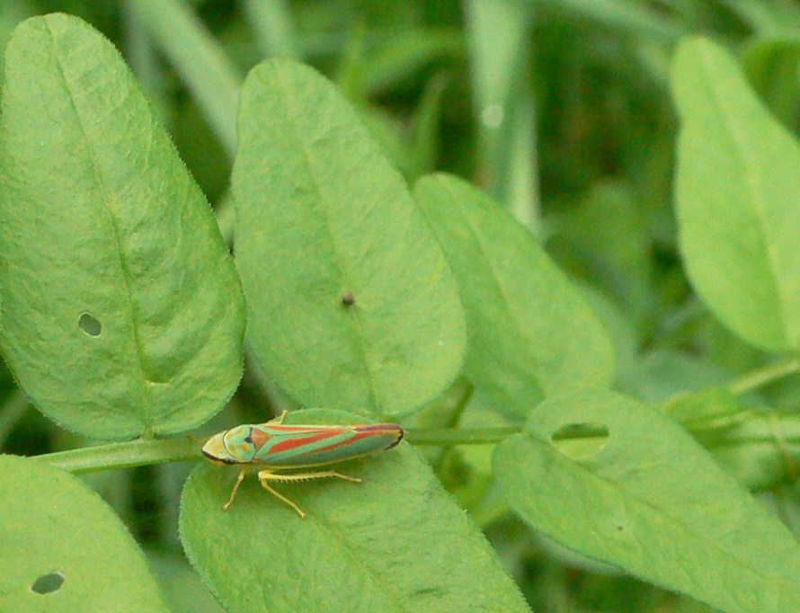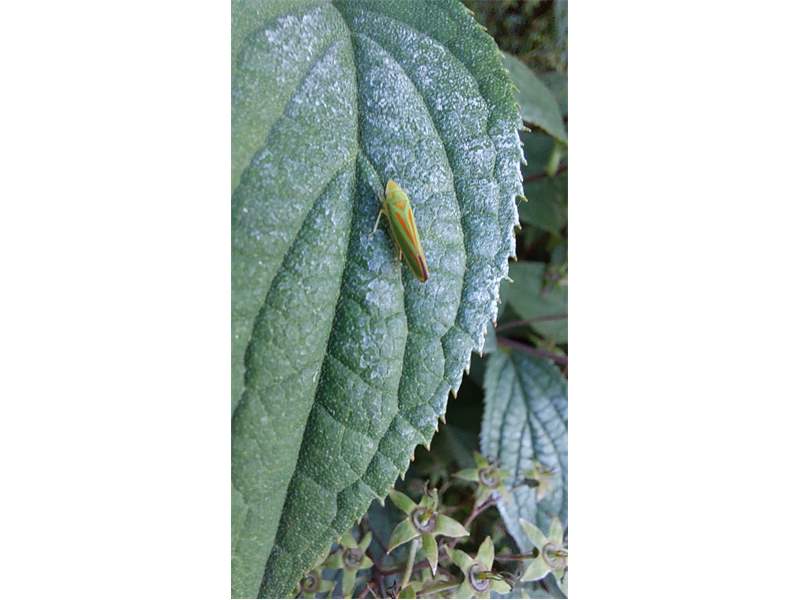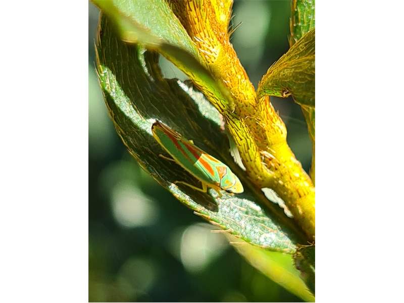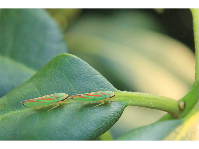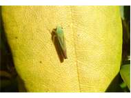 Rhododendronzikade (Graphocephala fennahi Young, 1977), an Rhododendron im Wohngrundstück, 01896 Lichtenberg, Juli 2018. (© Uwe Schäfer)( Bild vergrößern)