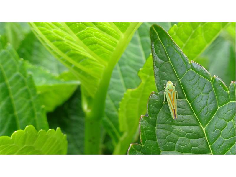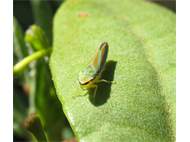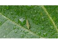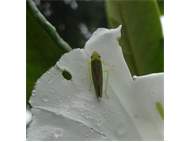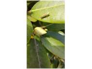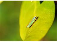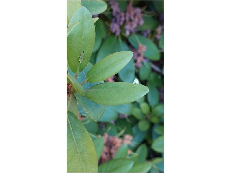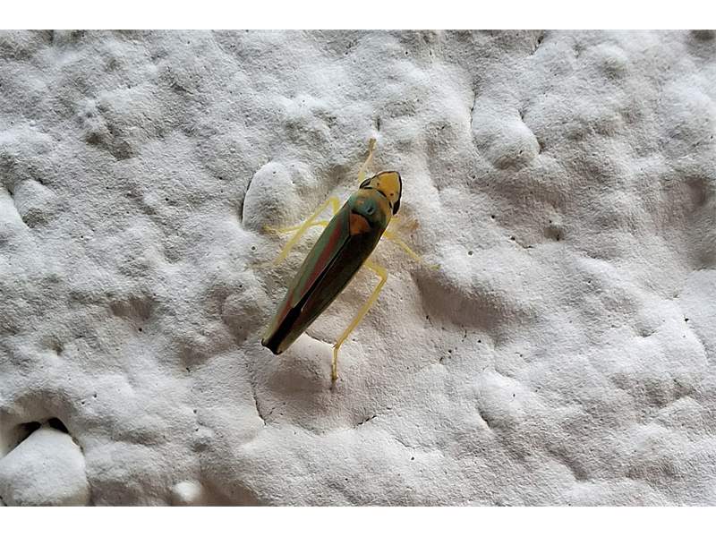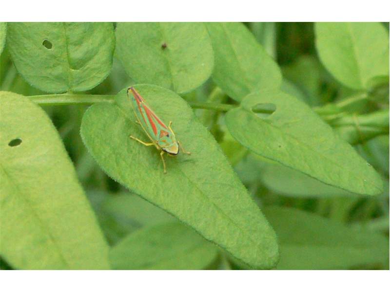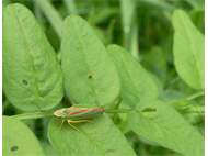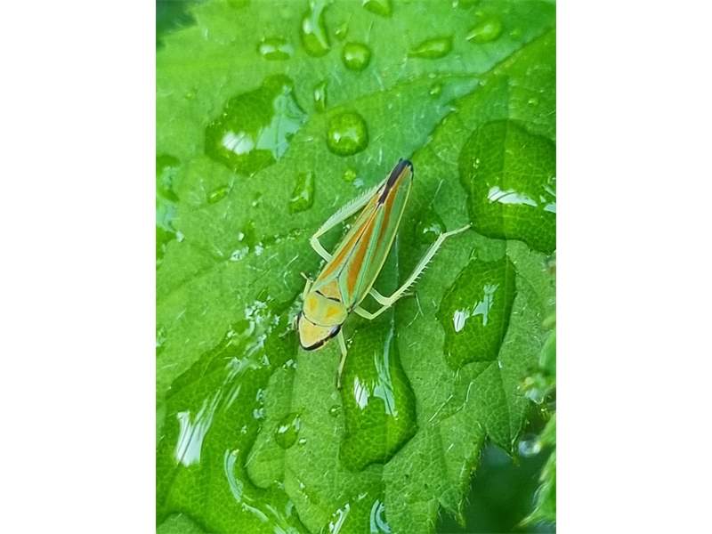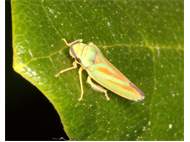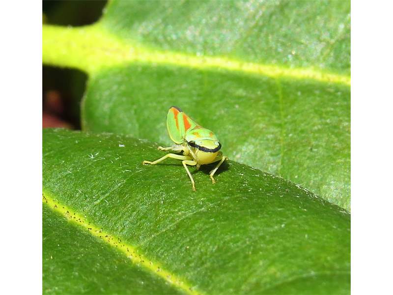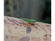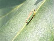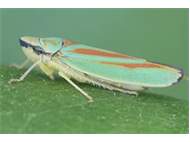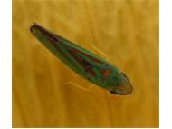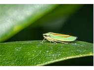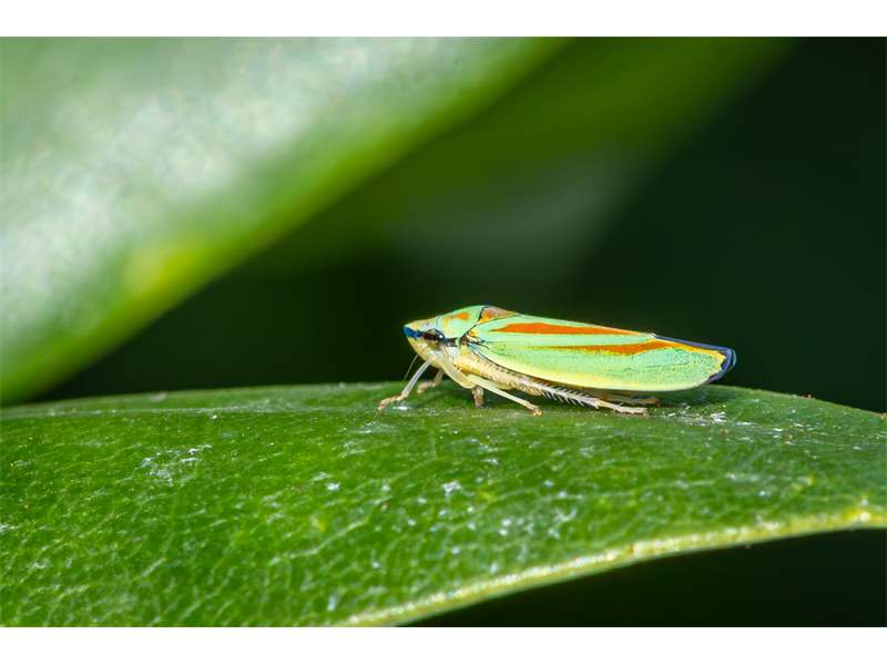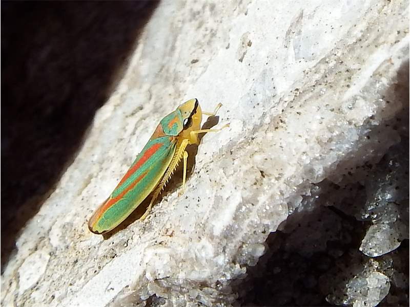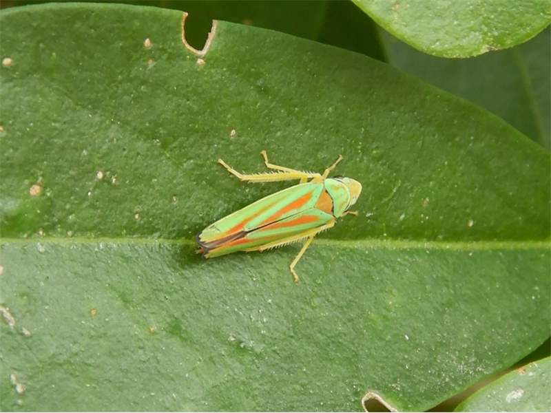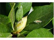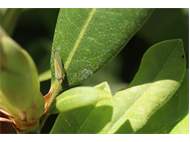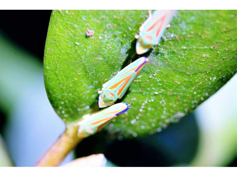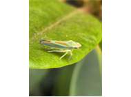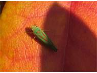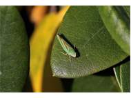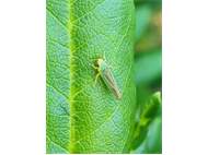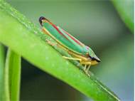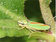 Rhododendronzikade (Graphocephala fennahi Young, 1977), an Rhododendron im Wohngrundstück, 01896 Lichtenberg, Juli 2018. (© Uwe Schäfer)( Bild vergrößern)