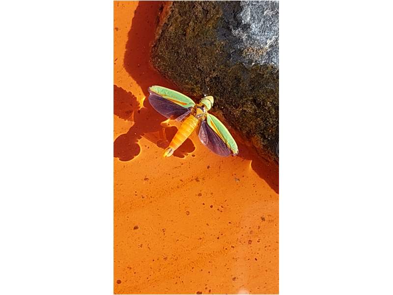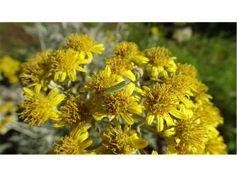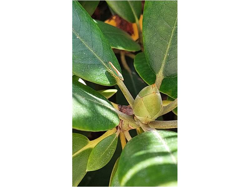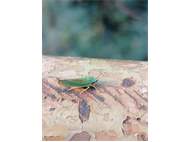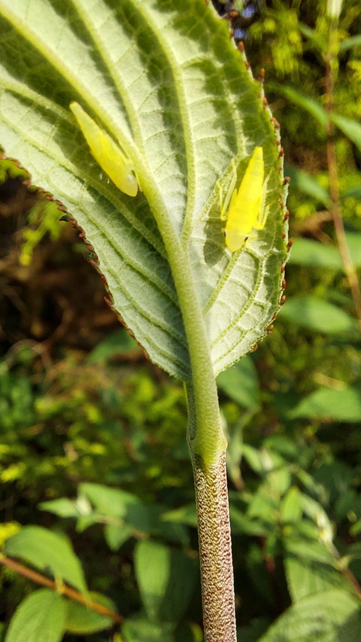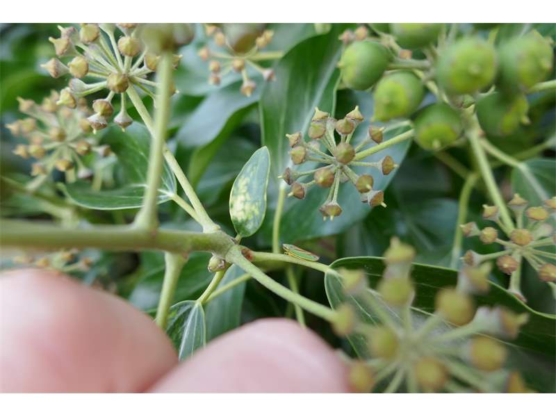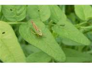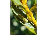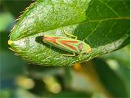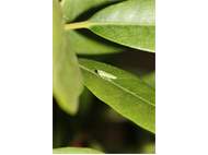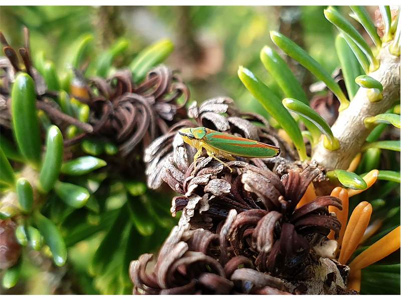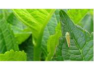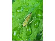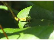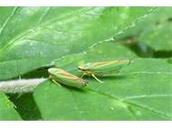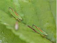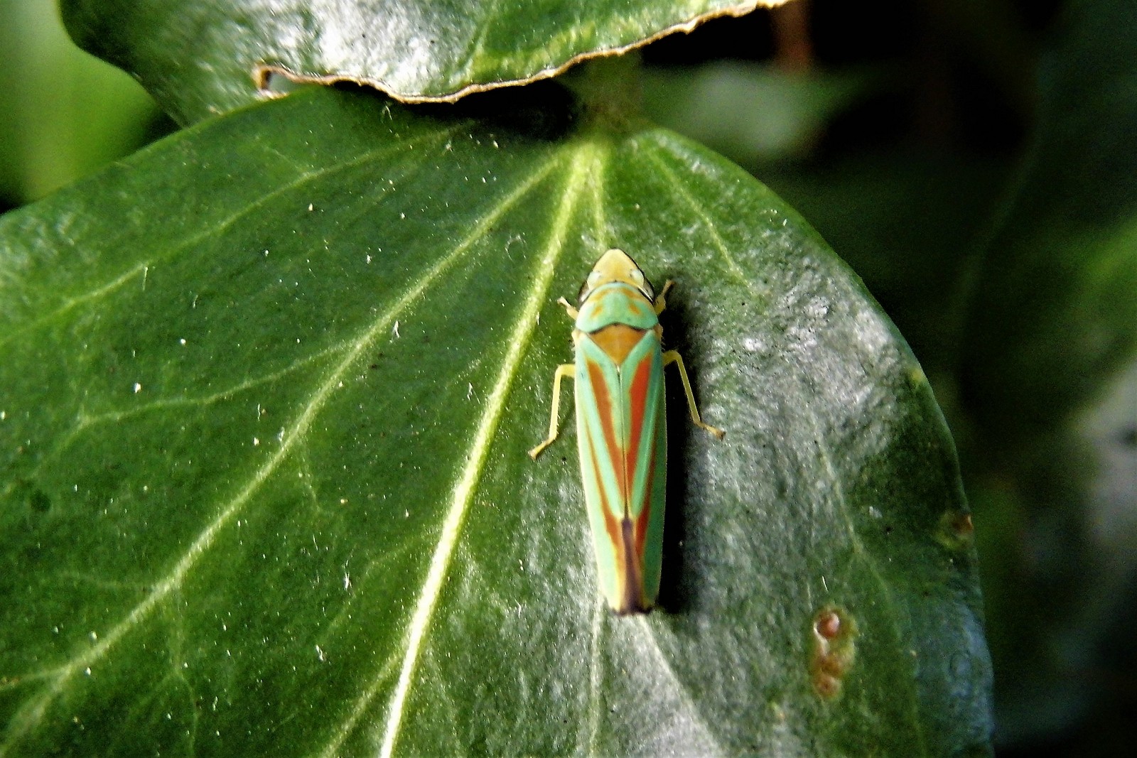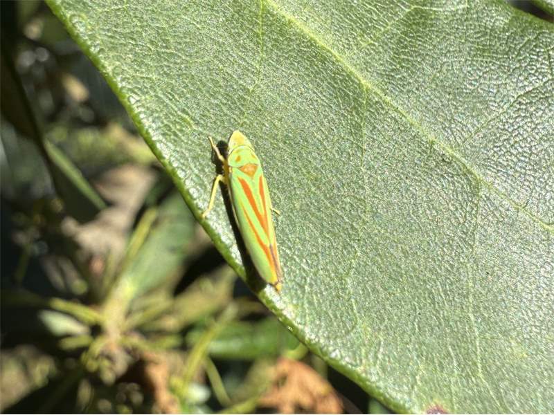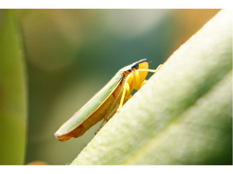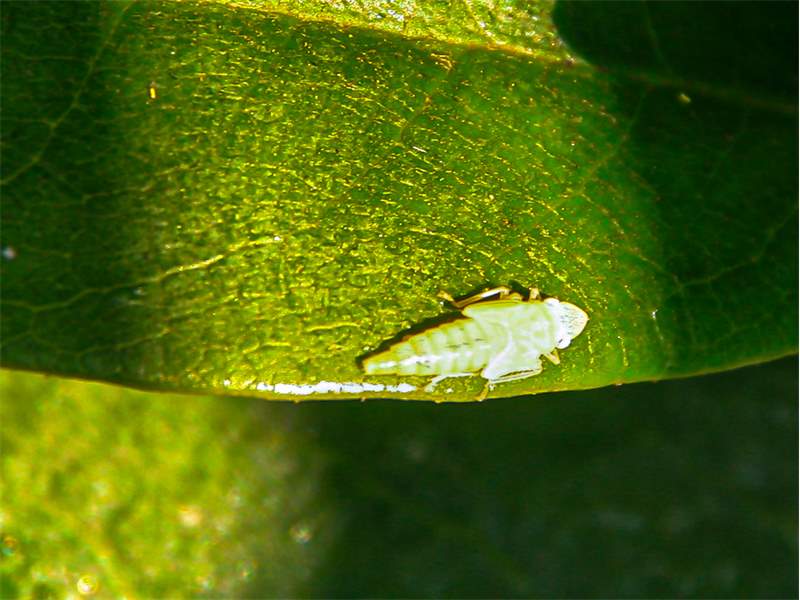 Rhododendronzikade (Graphocephala fennahi Young, 1977), an Rhododendron im Wohngrundstück, 01896 Lichtenberg, Juli 2018. (© Uwe Schäfer)( Bild vergrößern)