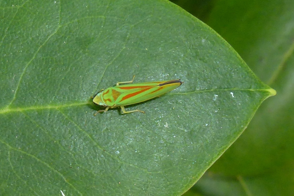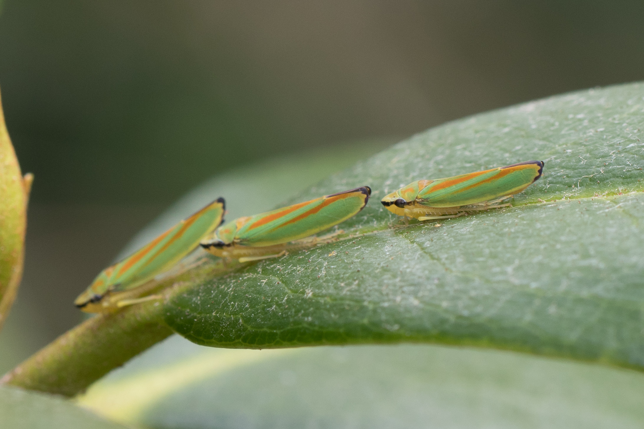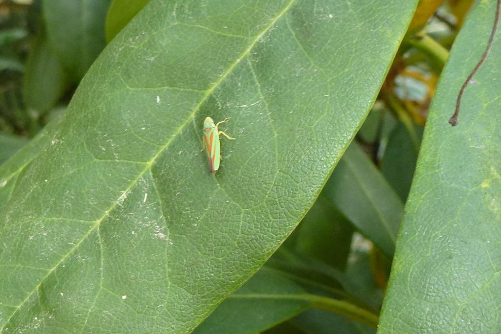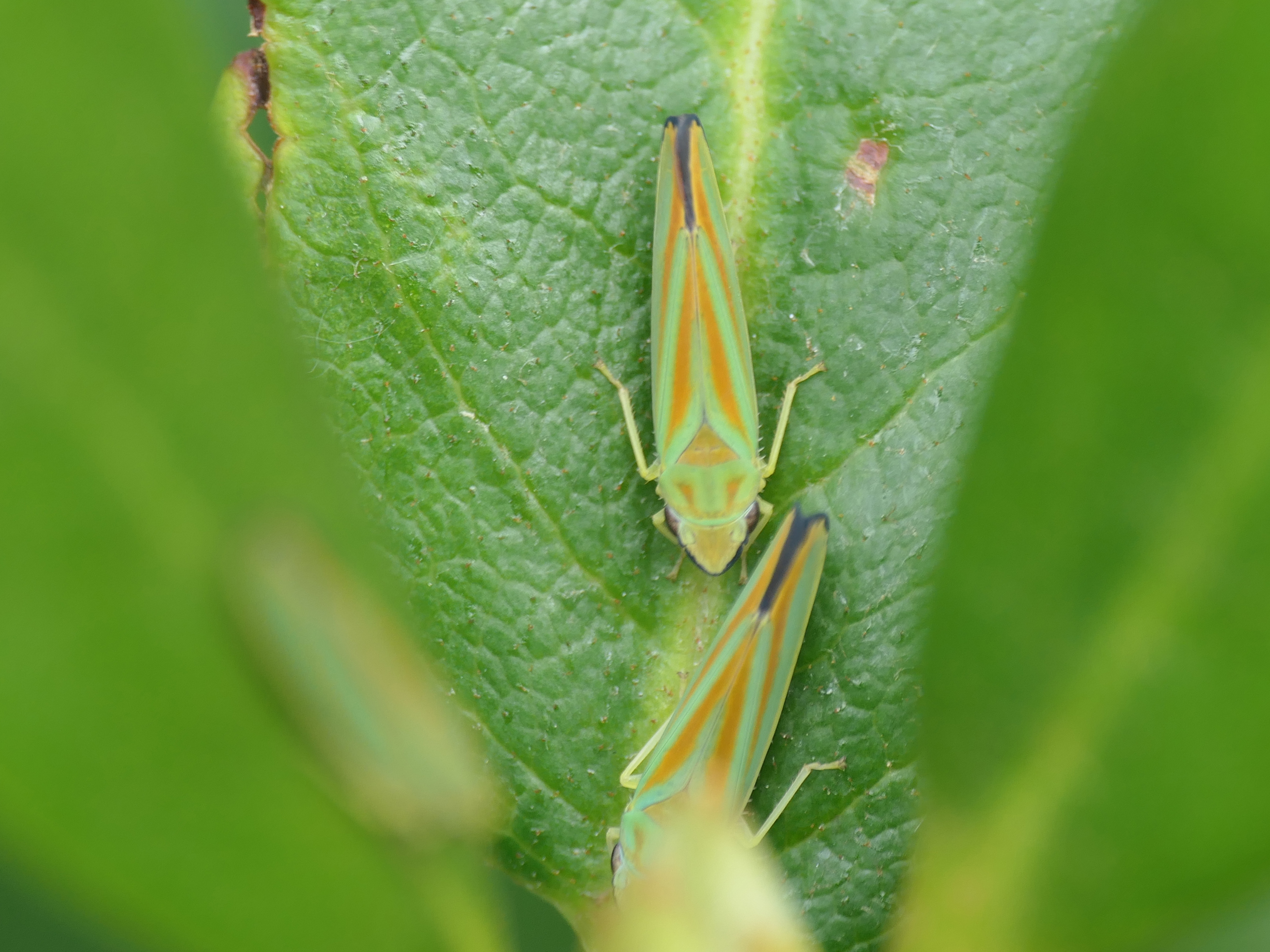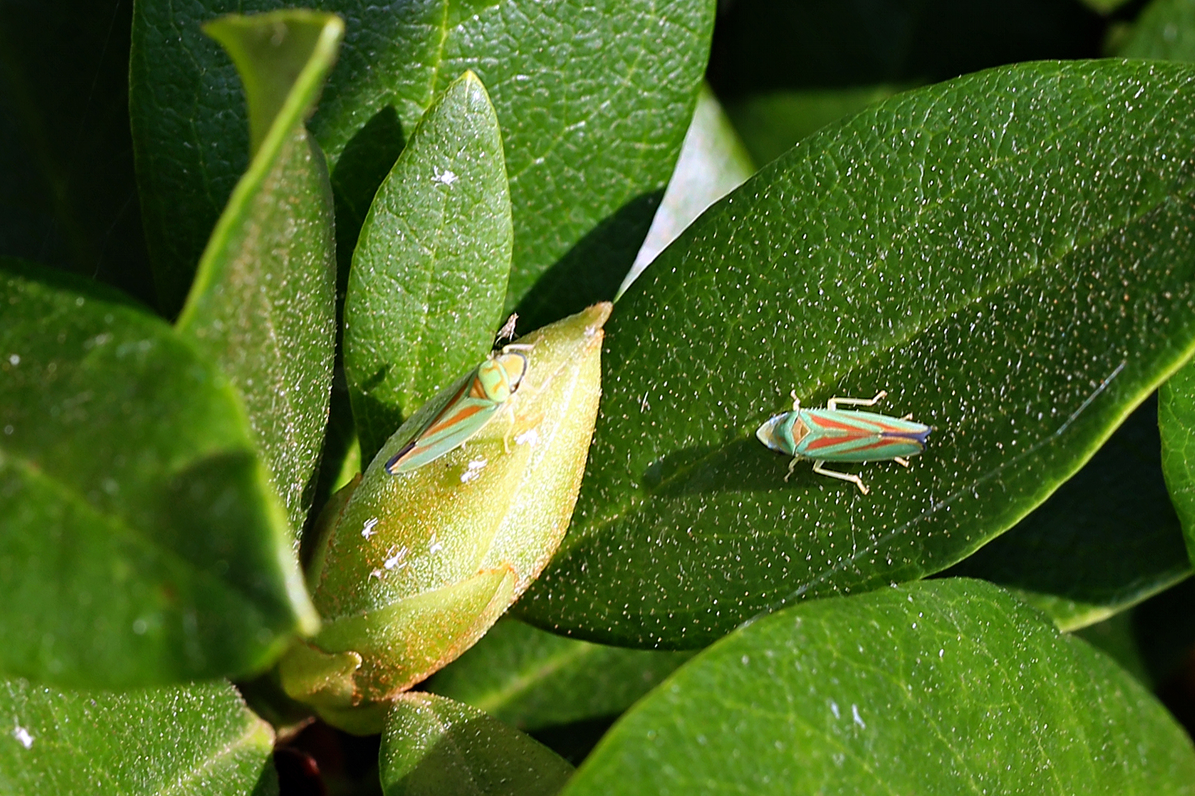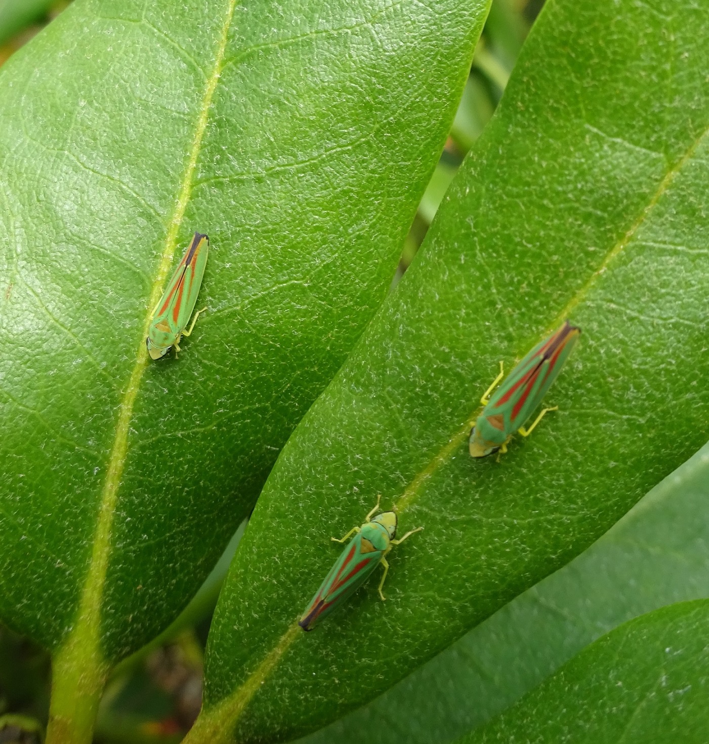 Rhododendronzikade (Graphocephala fennahi Young, 1977), an Rhododendron im Wohngrundstück, 01896 Lichtenberg, Juli 2018.