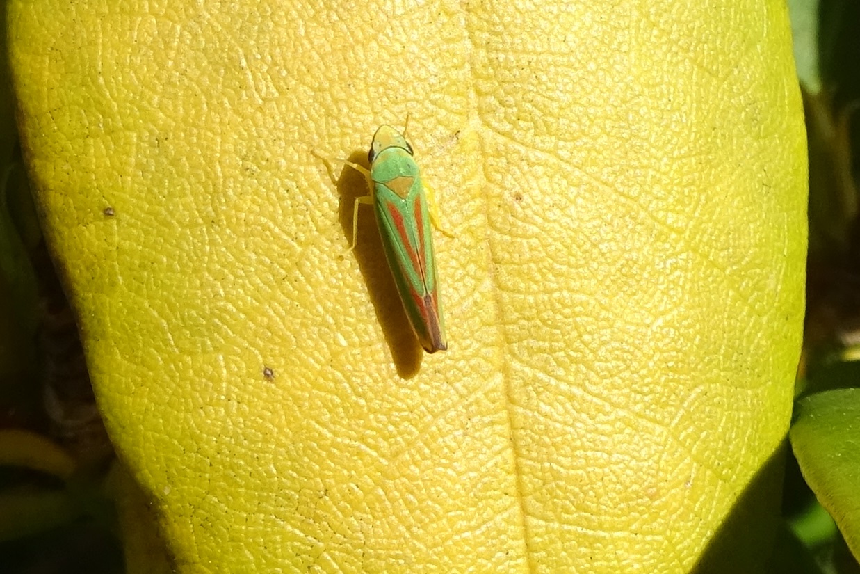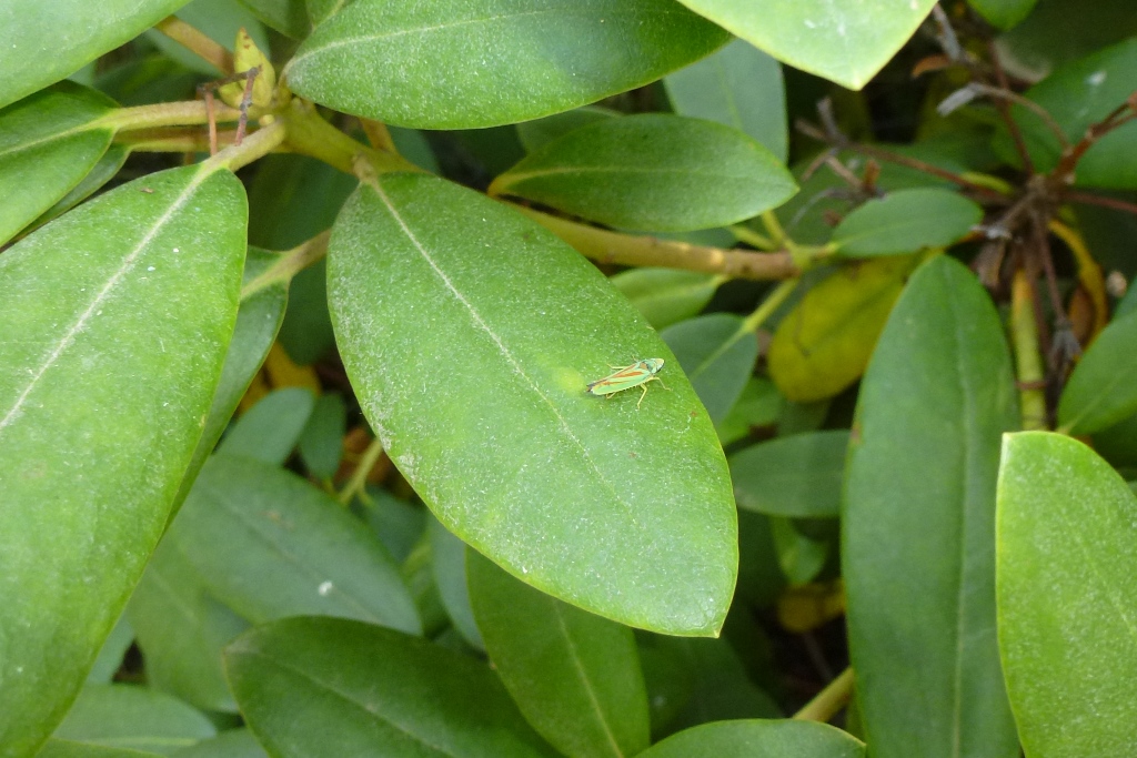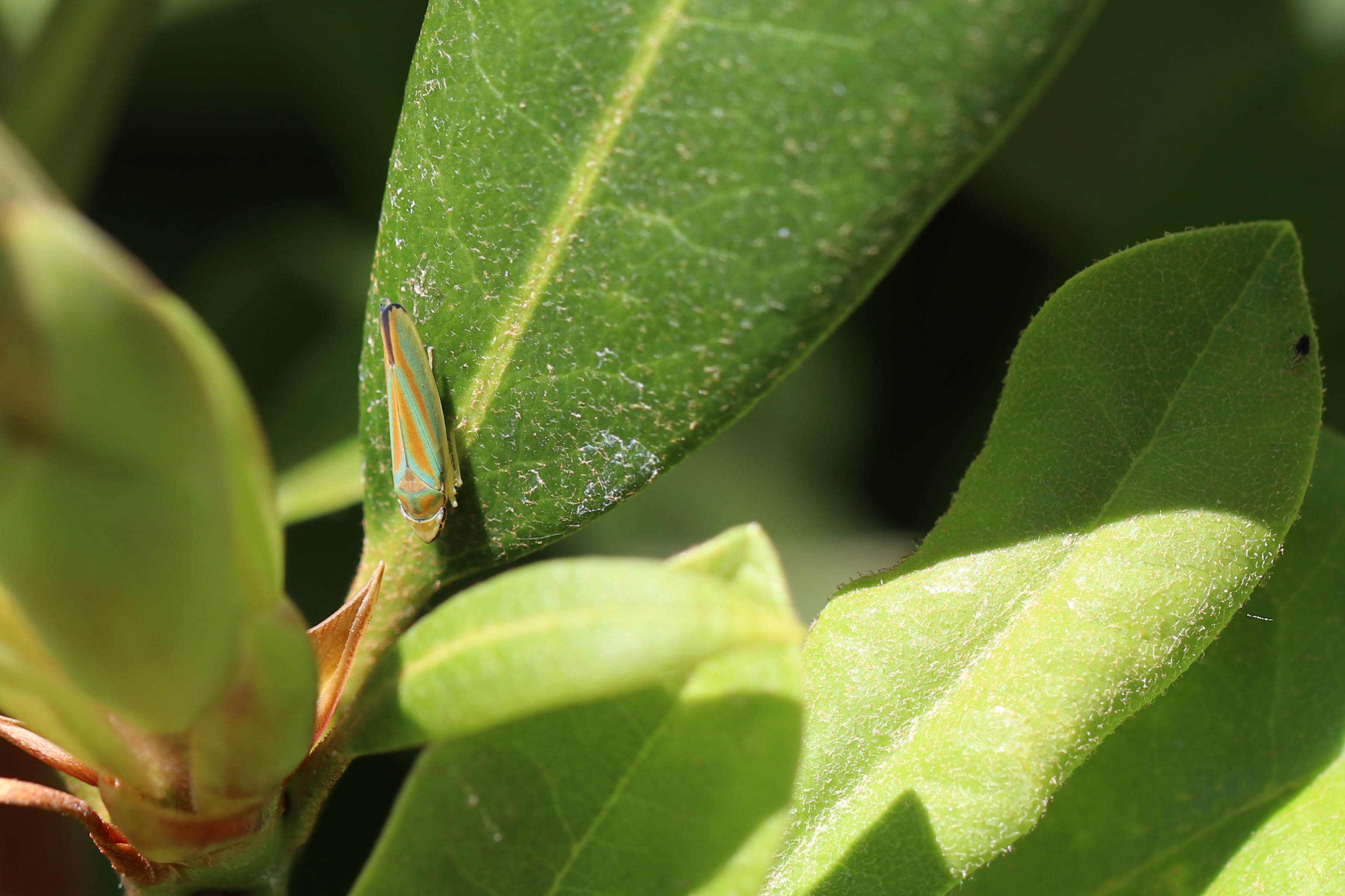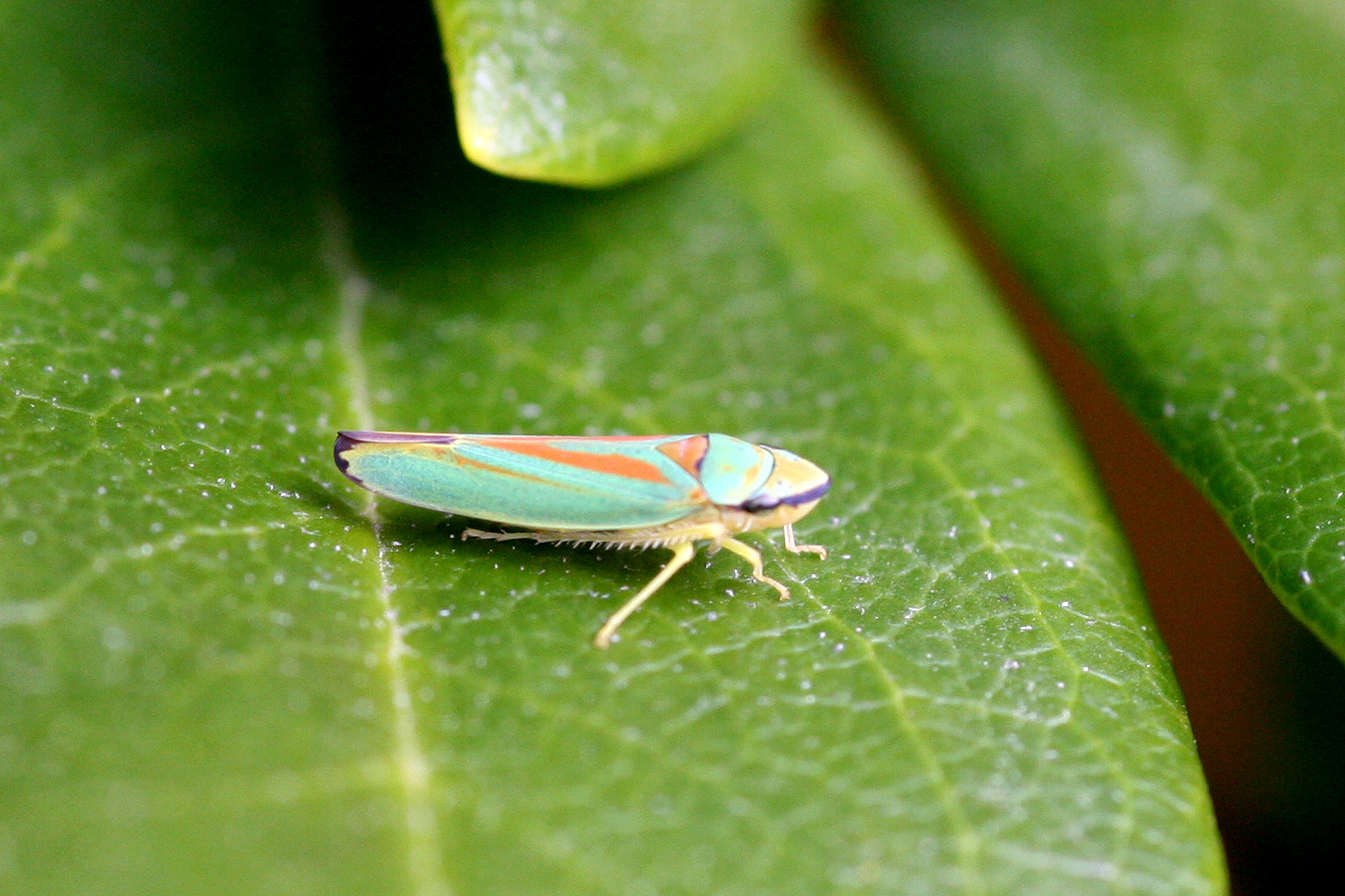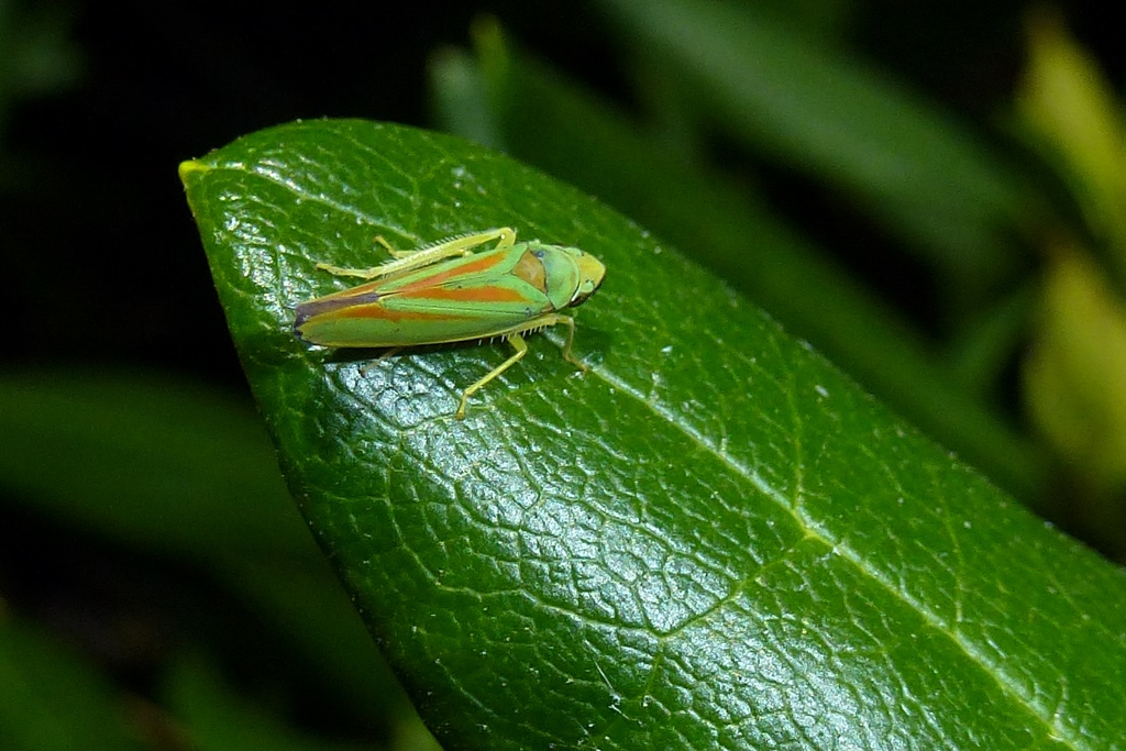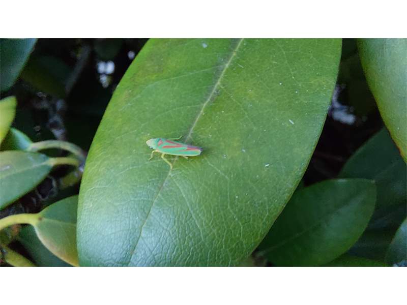 Rhododendronzikade (Graphocephala fennahi Young, 1977), an Rhododendron im Wohngrundstück, 01896 Lichtenberg, Juli 2018.