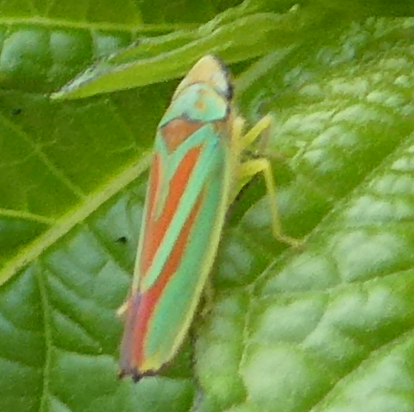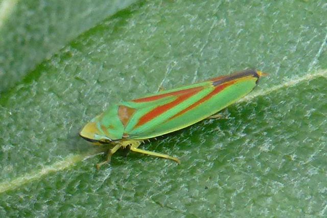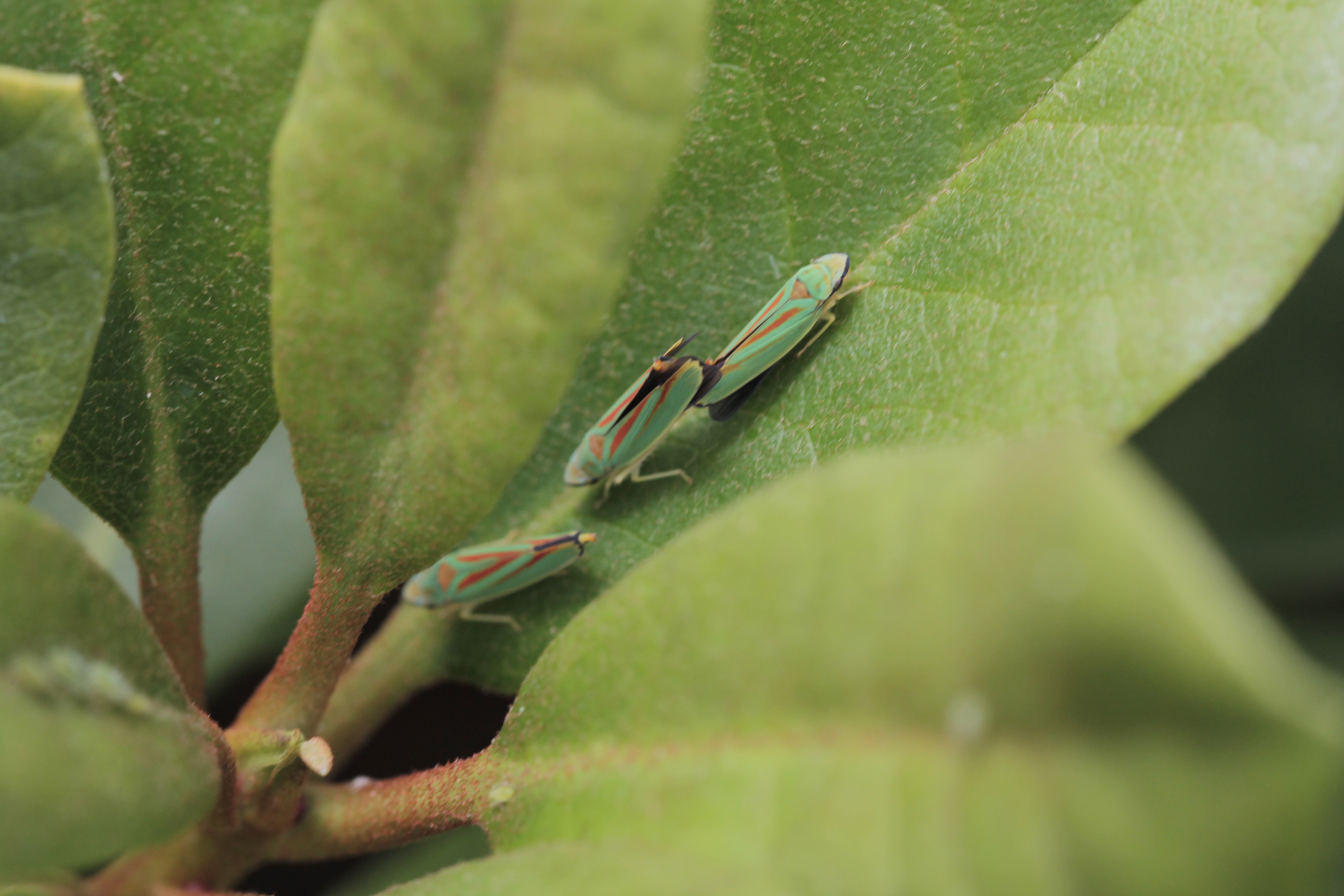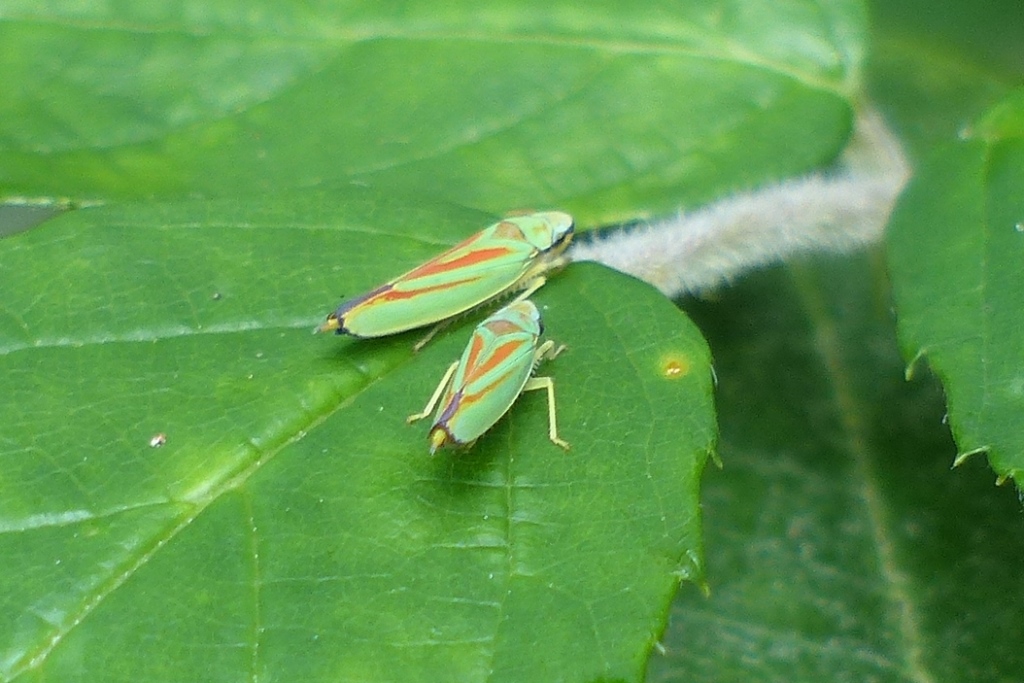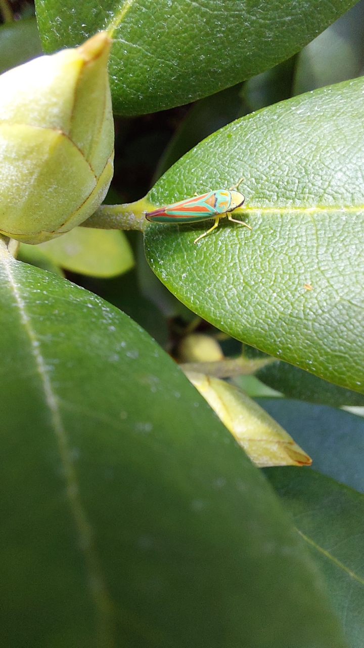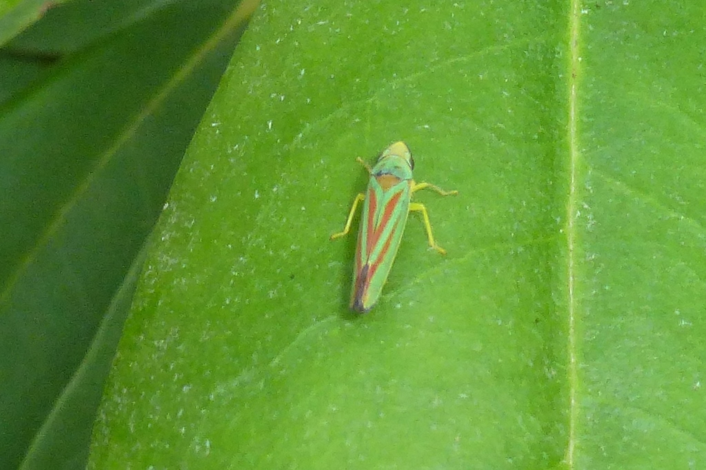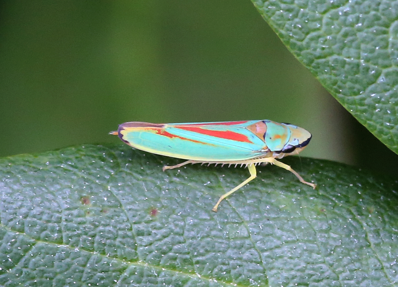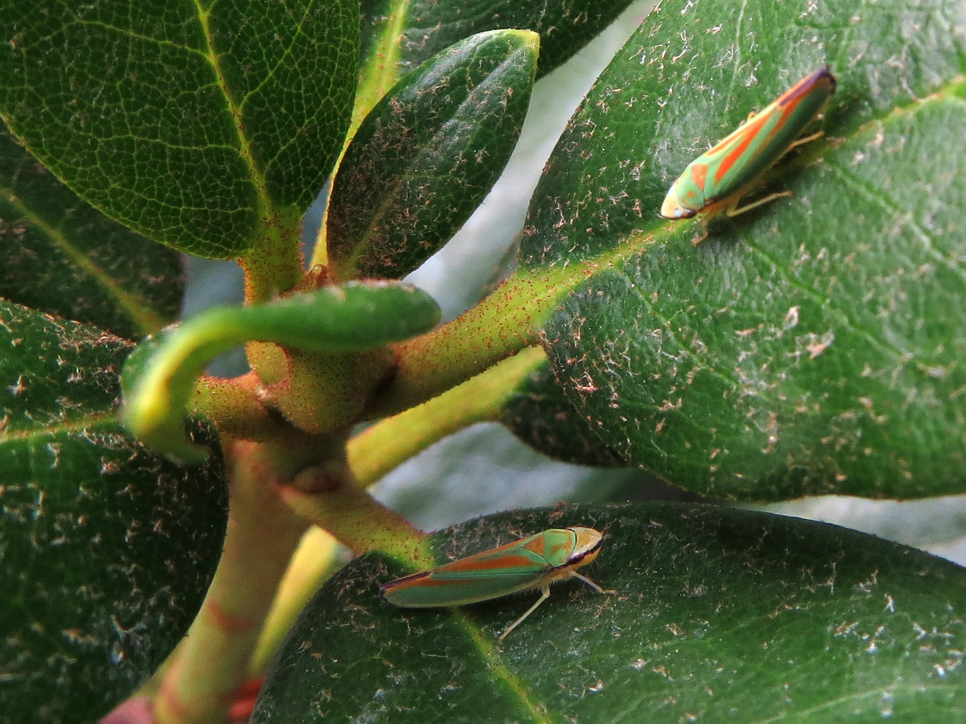 Rhododendronzikade (Graphocephala fennahi Young, 1977), an Rhododendron im Wohngrundstück, 01896 Lichtenberg, Juli 2018.