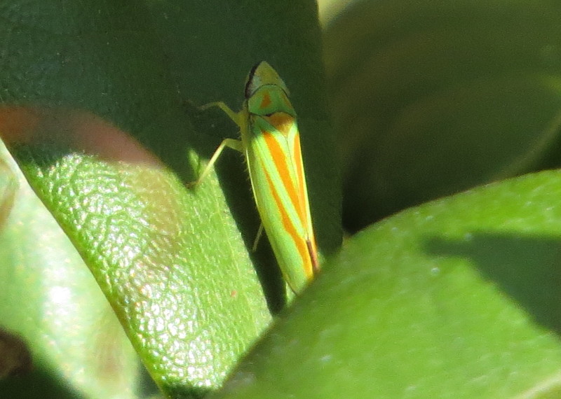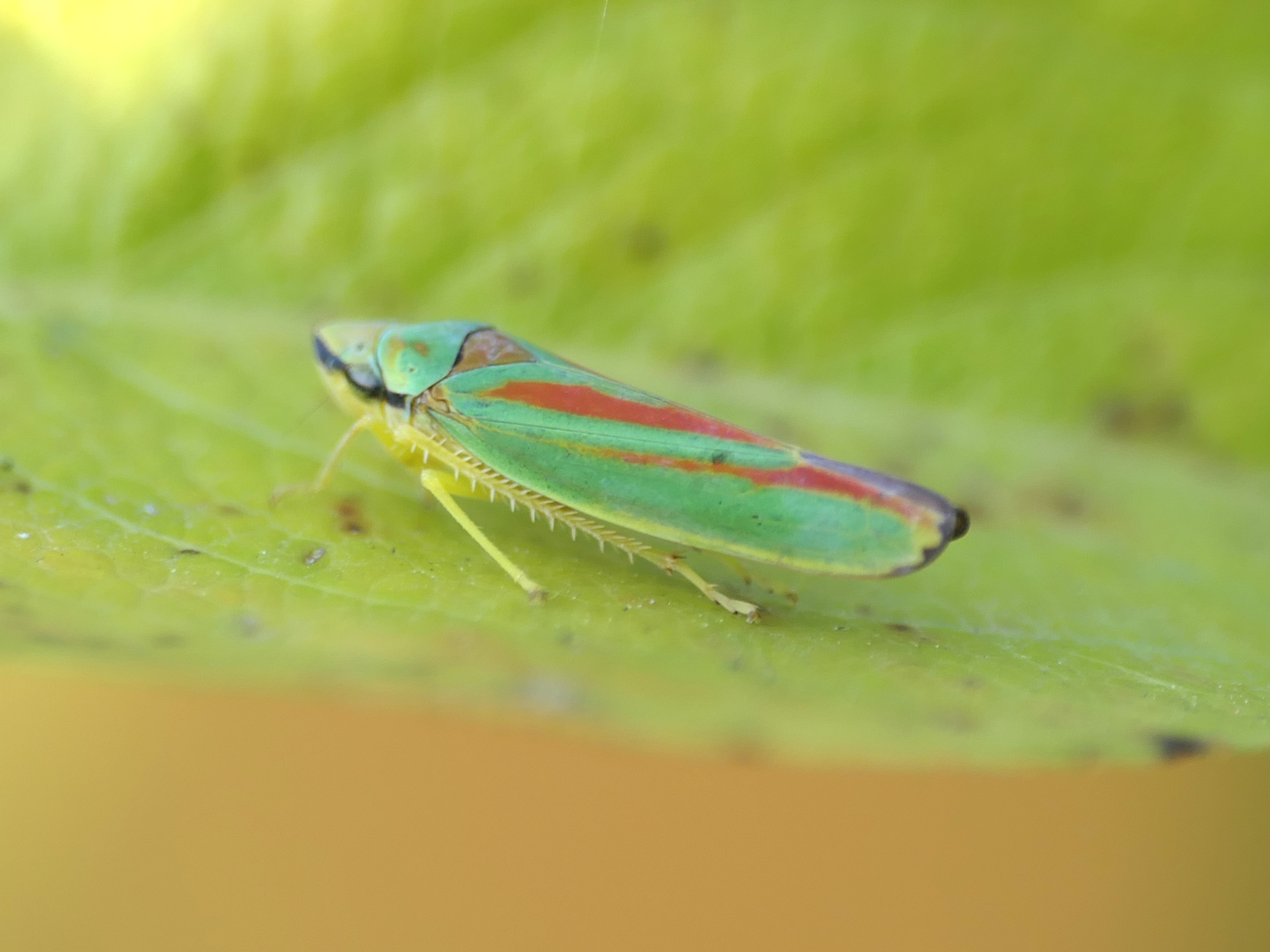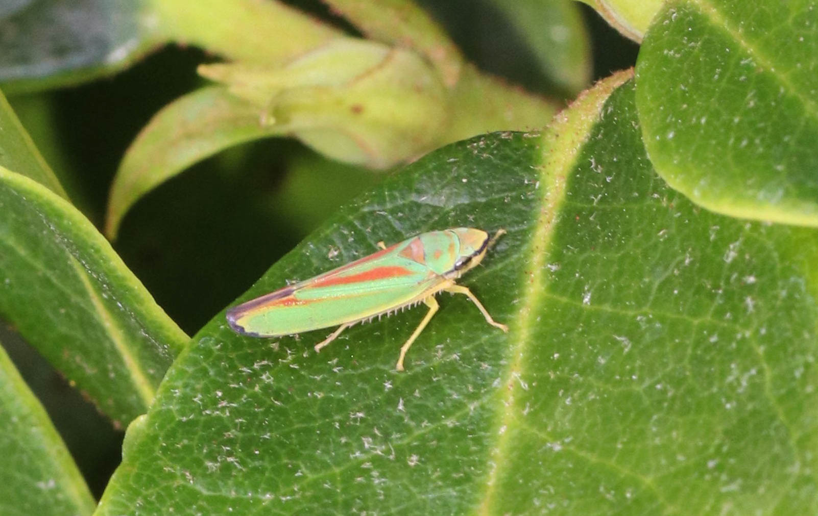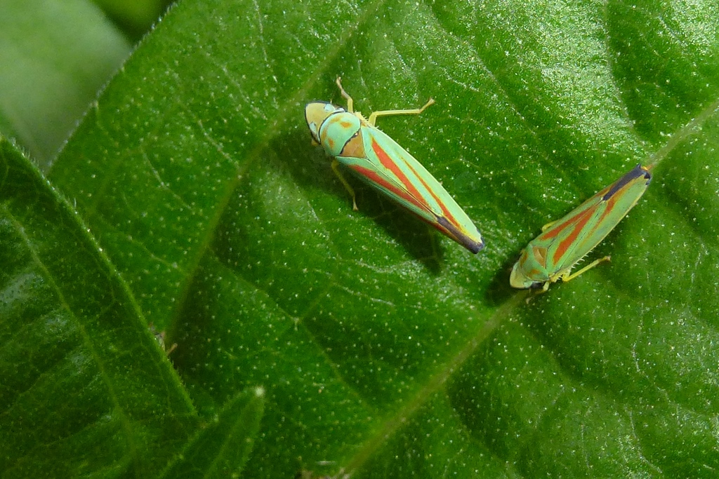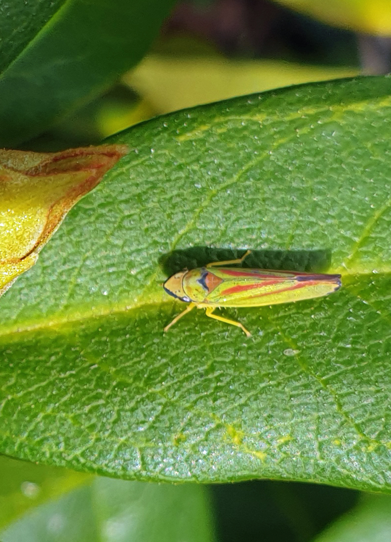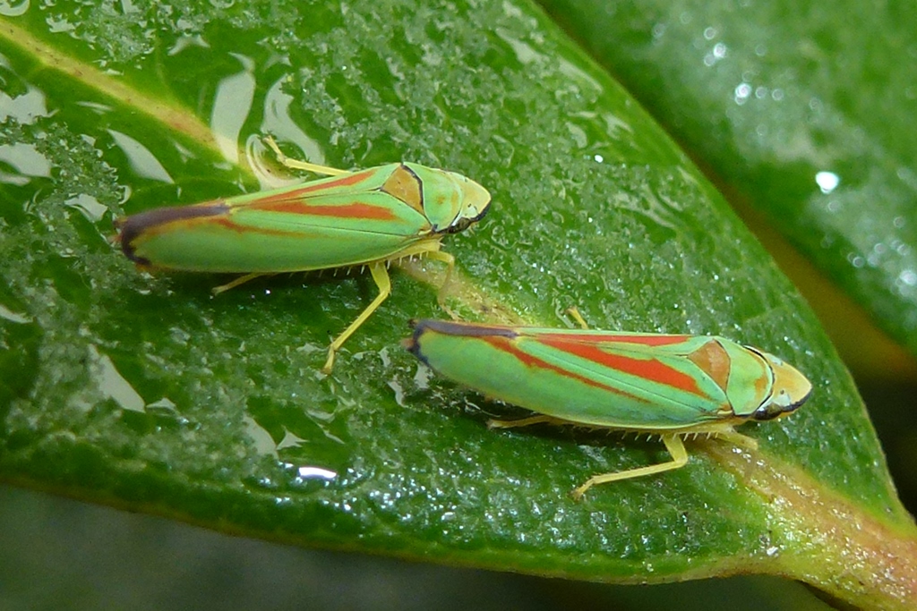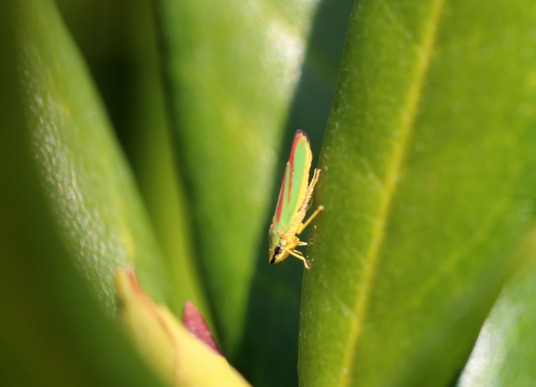 Rhododendronzikade (Graphocephala fennahi Young, 1977), an Rhododendron im Wohngrundstück, 01896 Lichtenberg, Juli 2018.