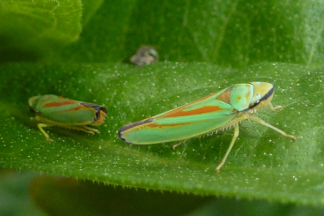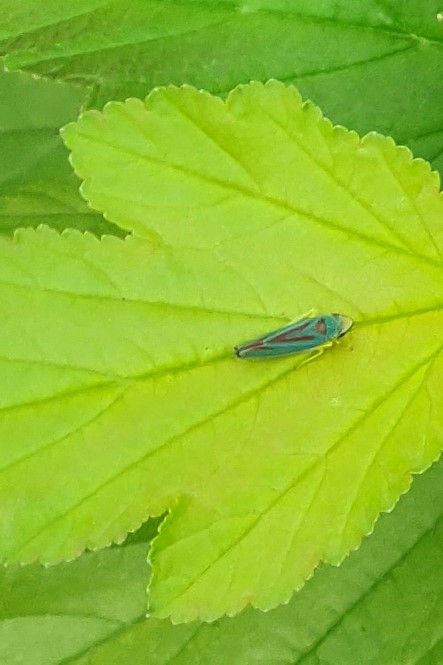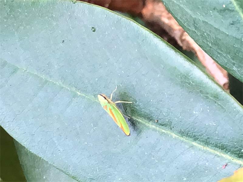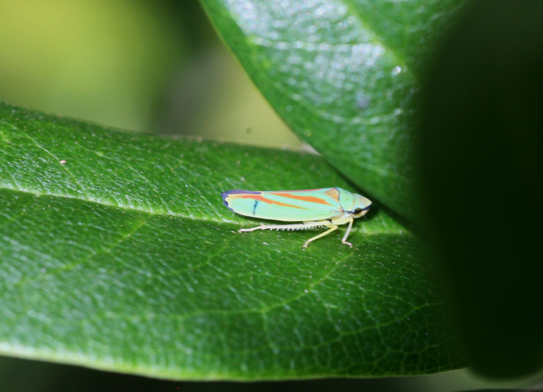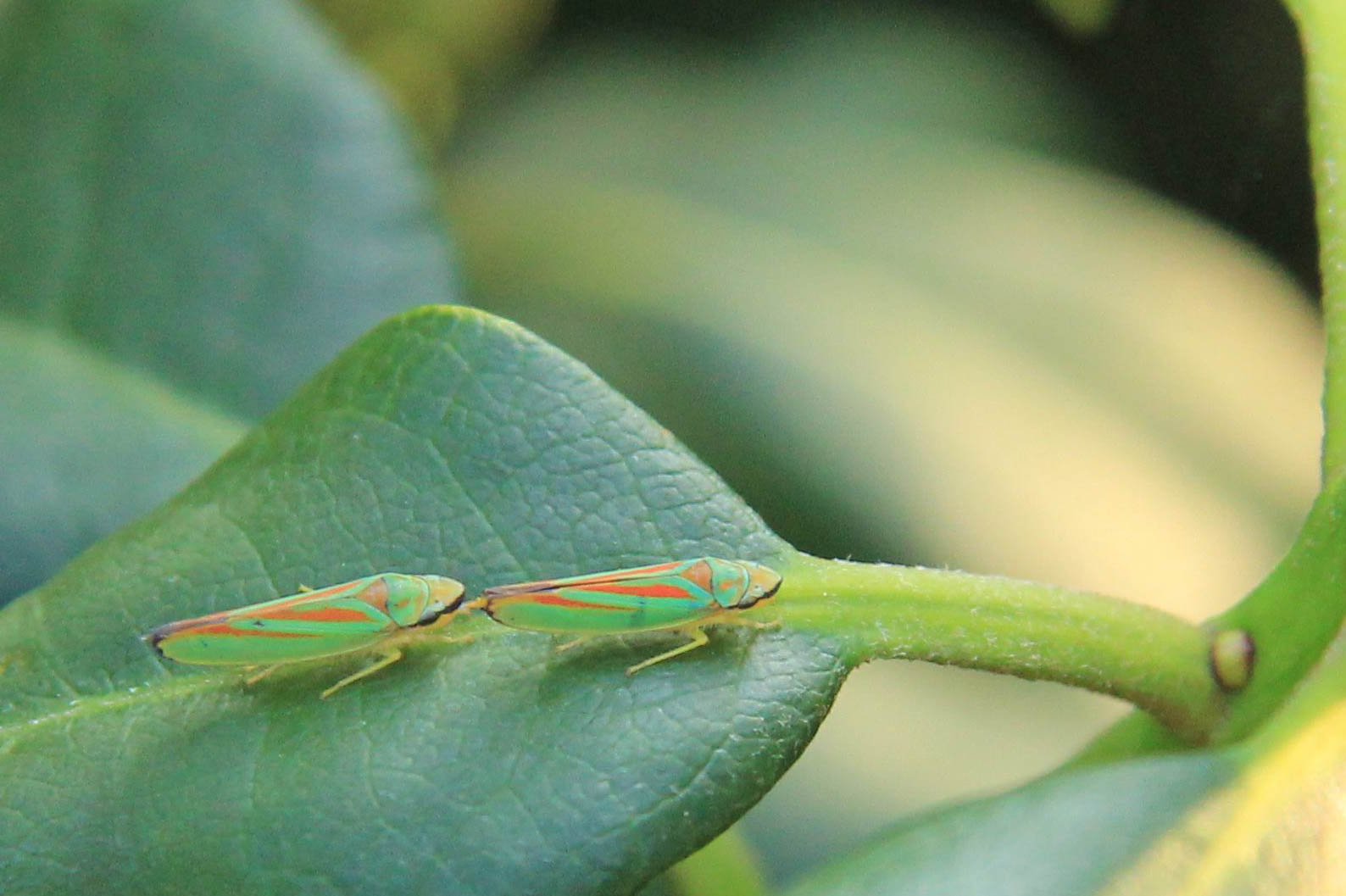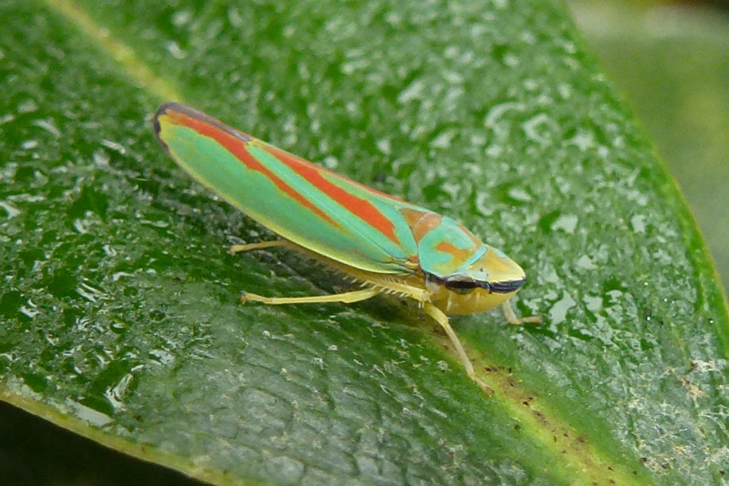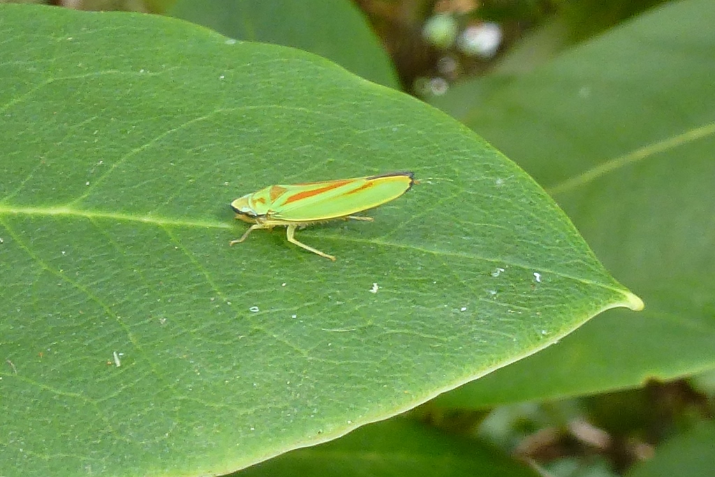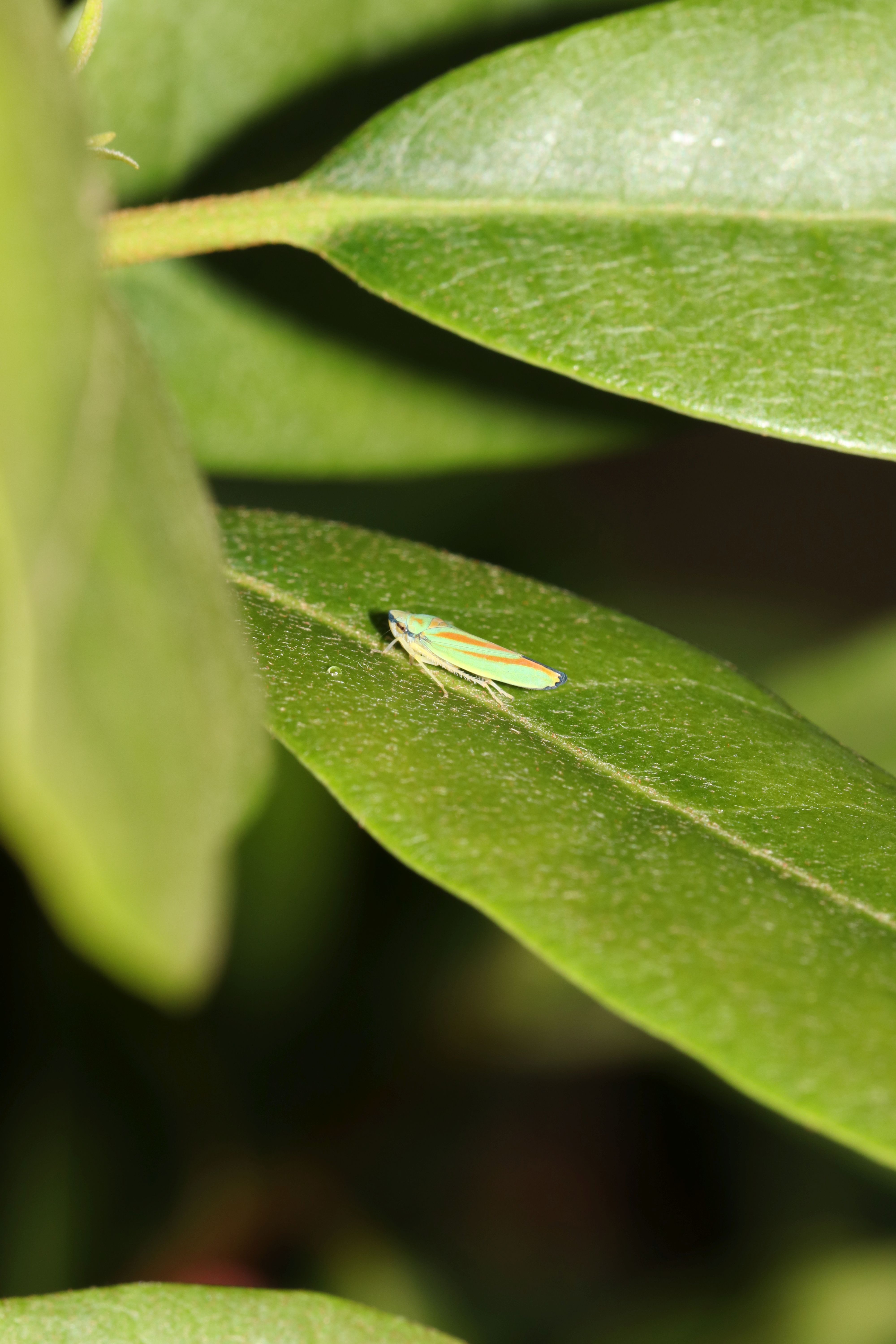 Rhododendronzikade (Graphocephala fennahi Young, 1977), an Rhododendron im Wohngrundstück, 01896 Lichtenberg, Juli 2018.
