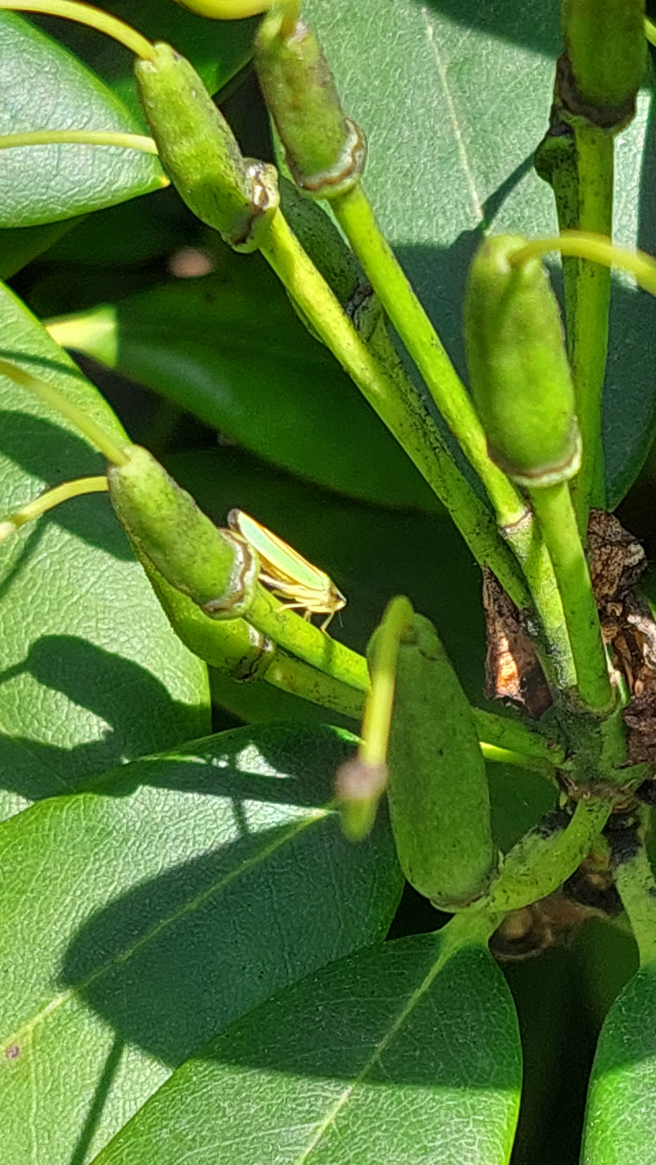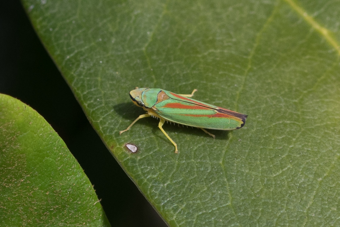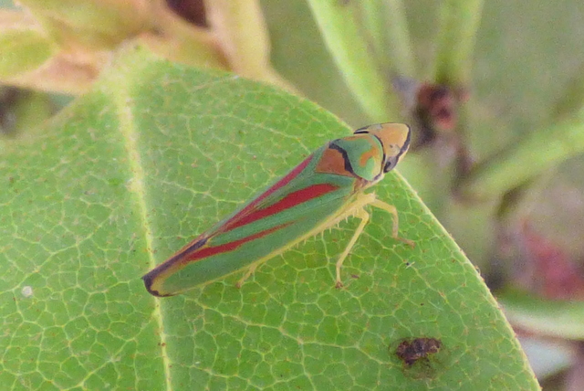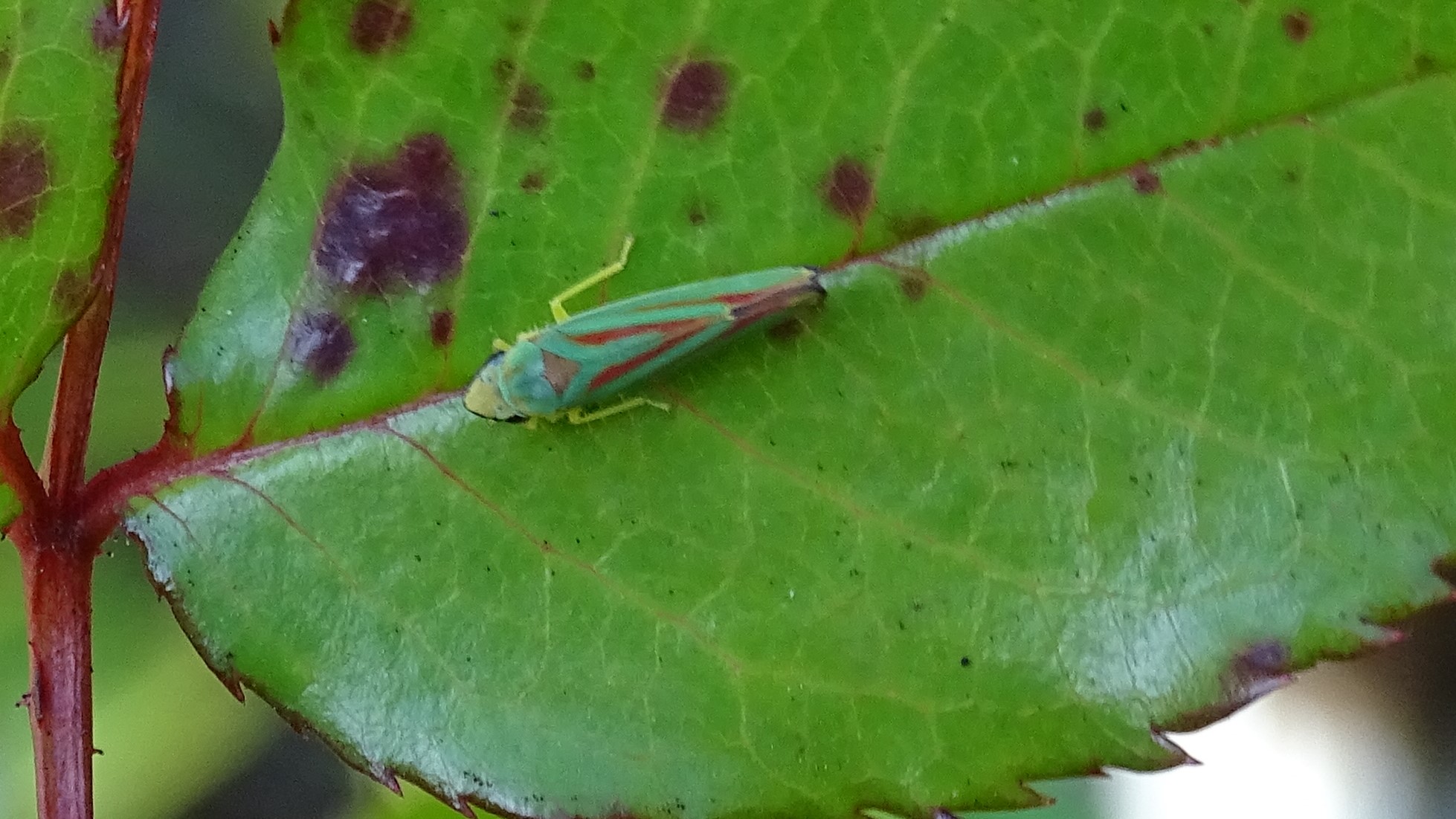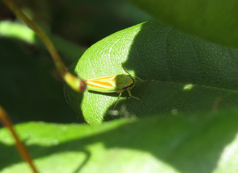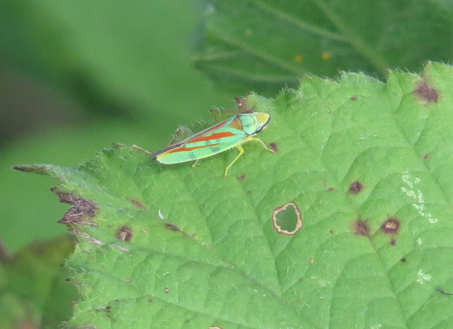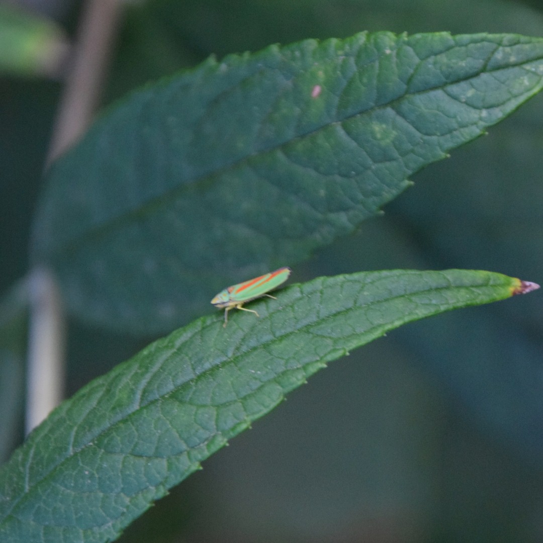 Rhododendronzikade (Graphocephala fennahi Young, 1977), an Rhododendron im Wohngrundstück, 01896 Lichtenberg, Juli 2018.