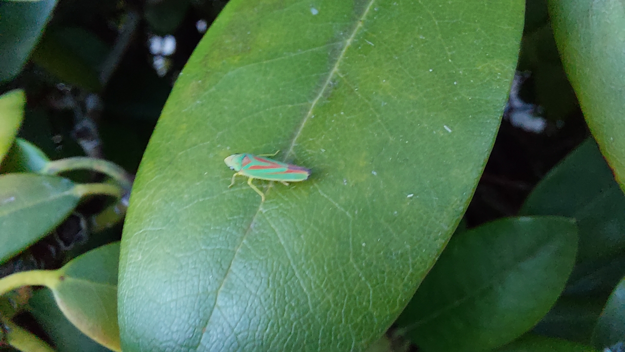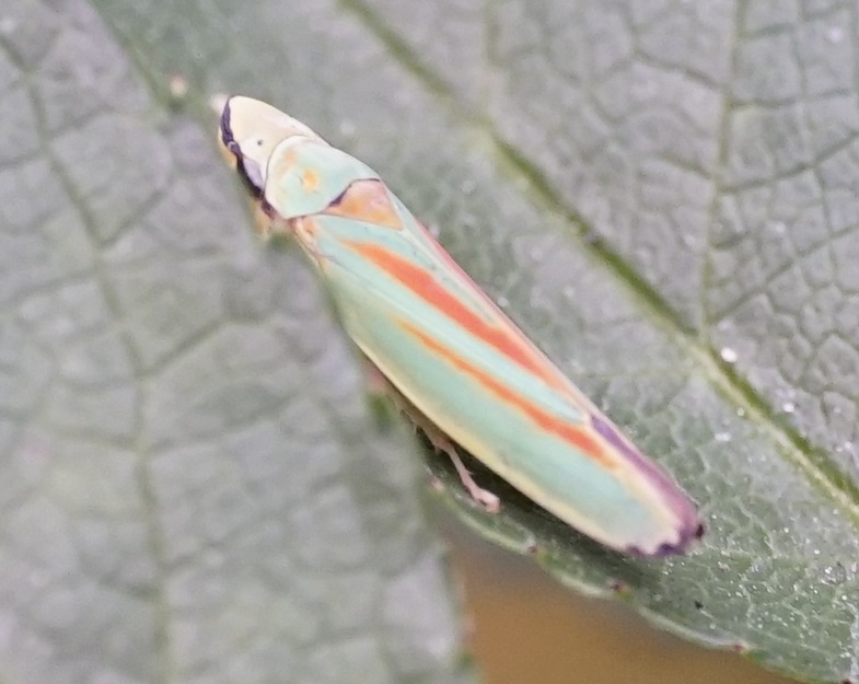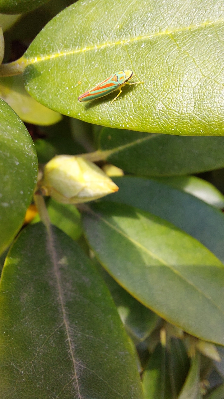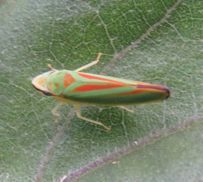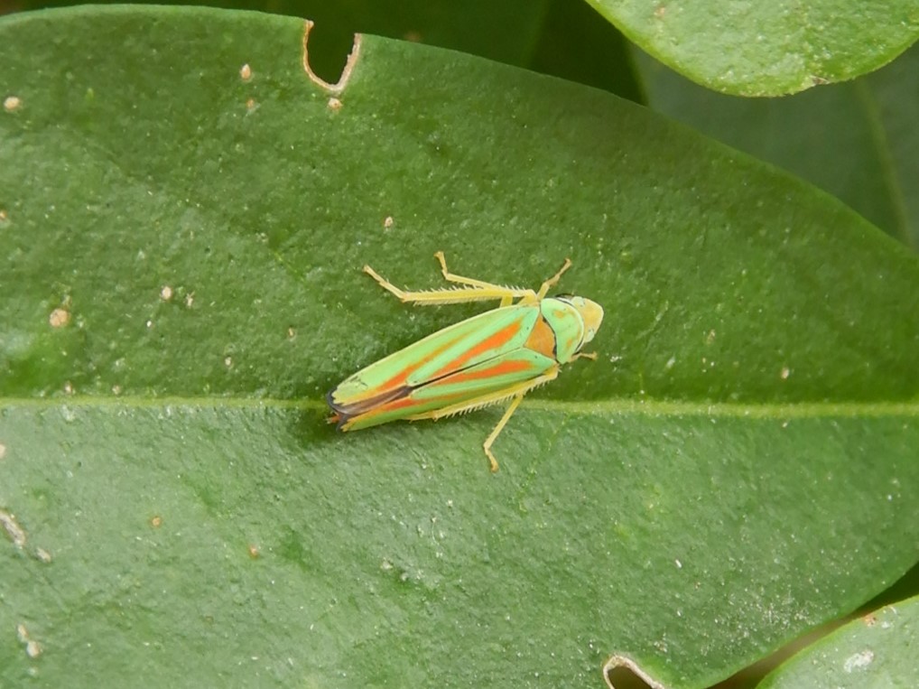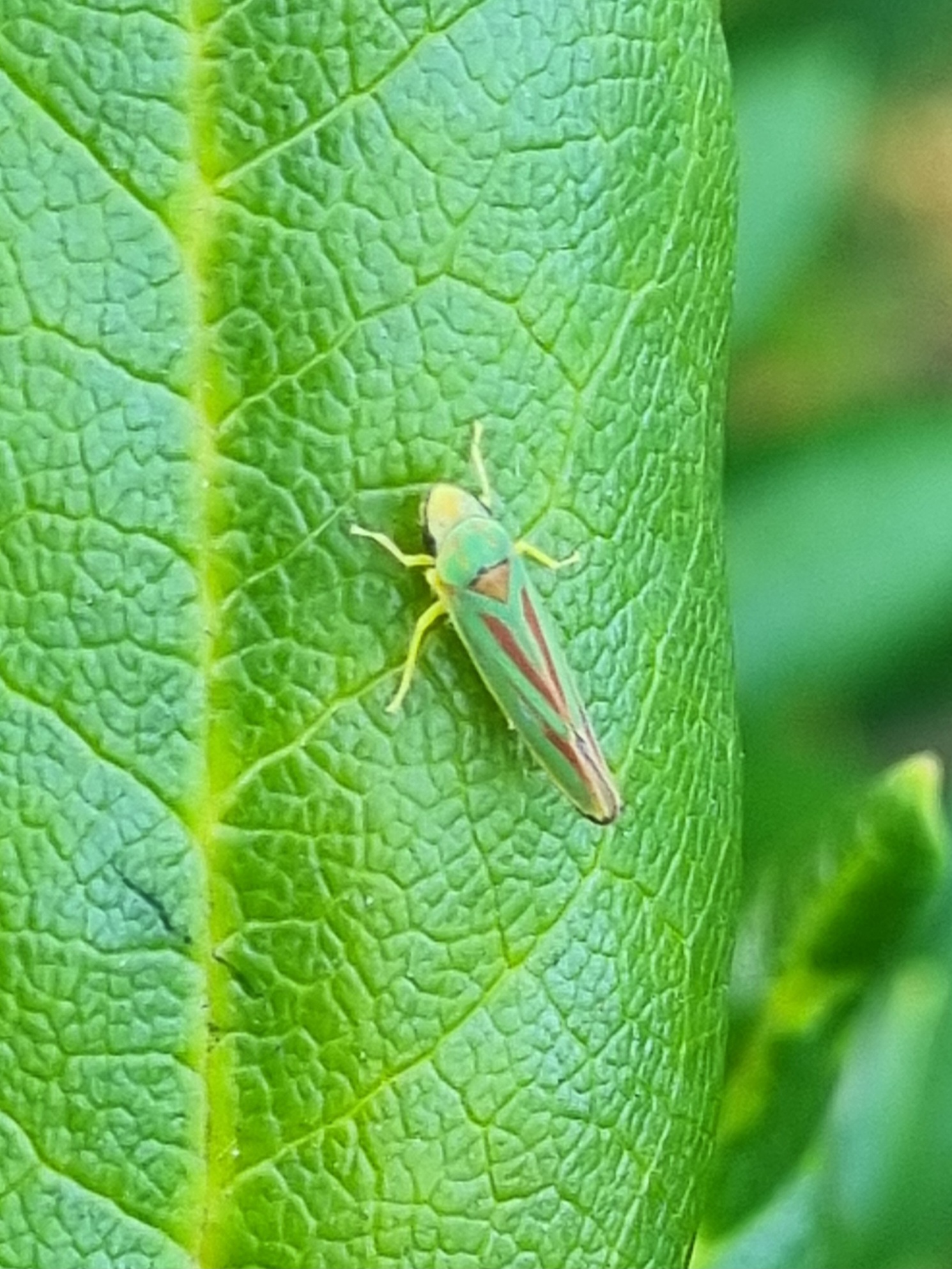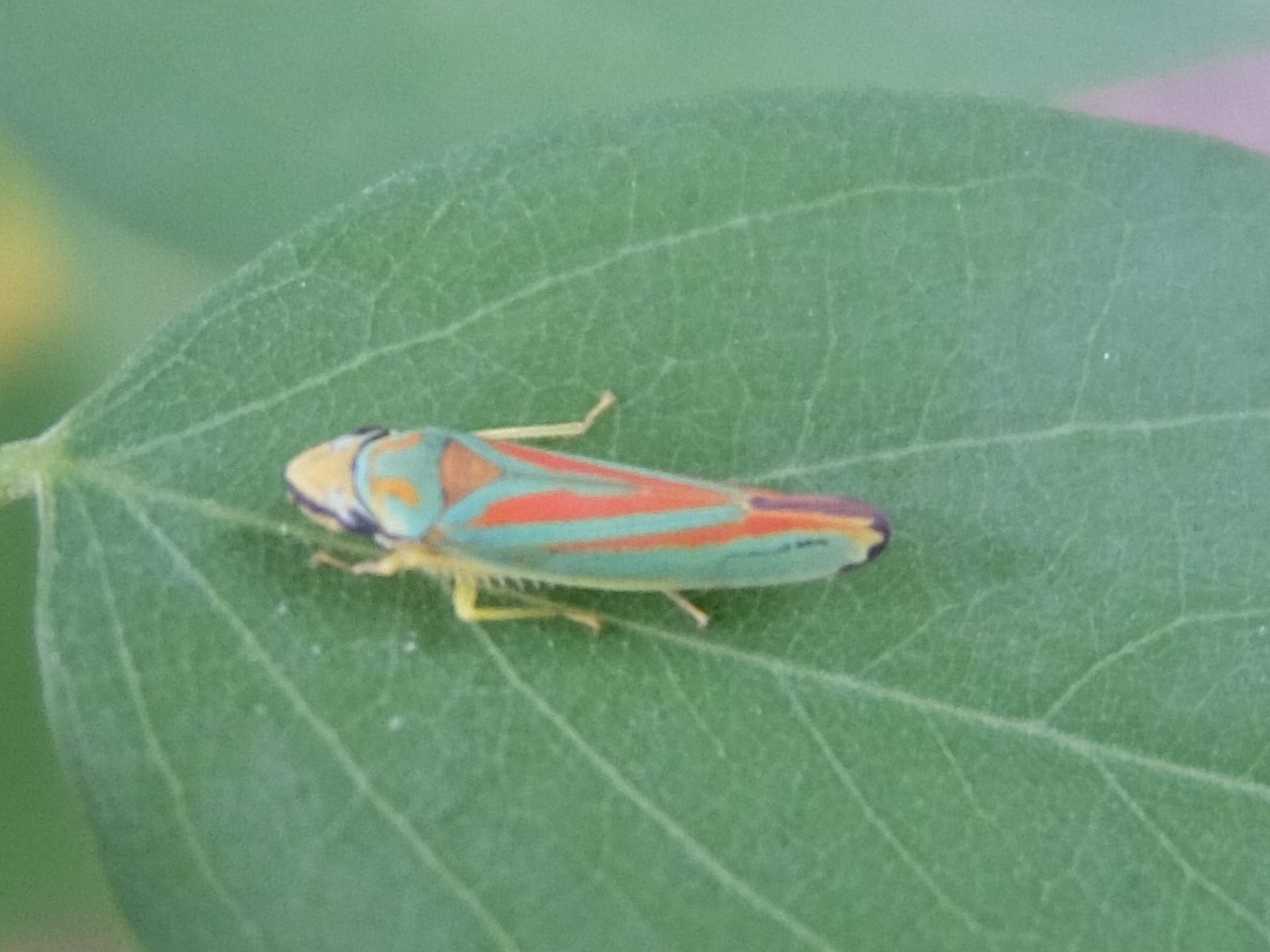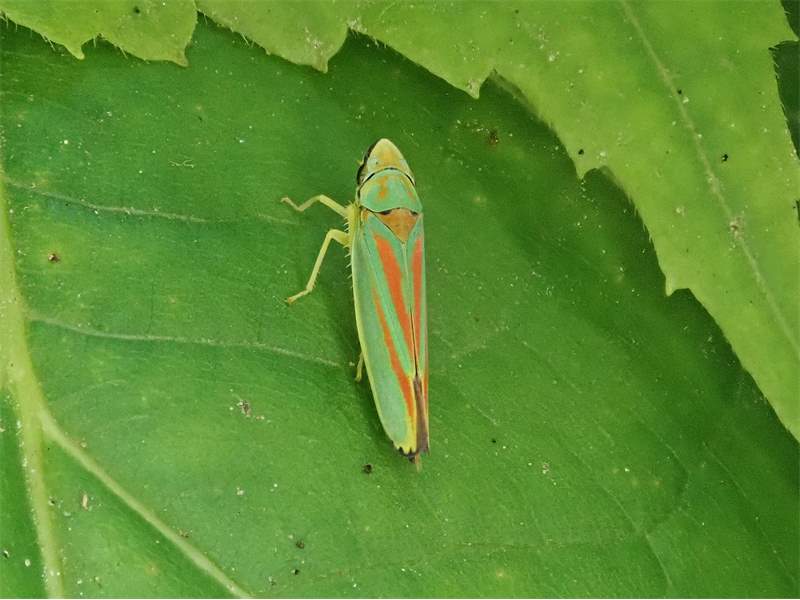 Rhododendronzikade (Graphocephala fennahi Young, 1977), an Rhododendron im Wohngrundstück, 01896 Lichtenberg, Juli 2018.