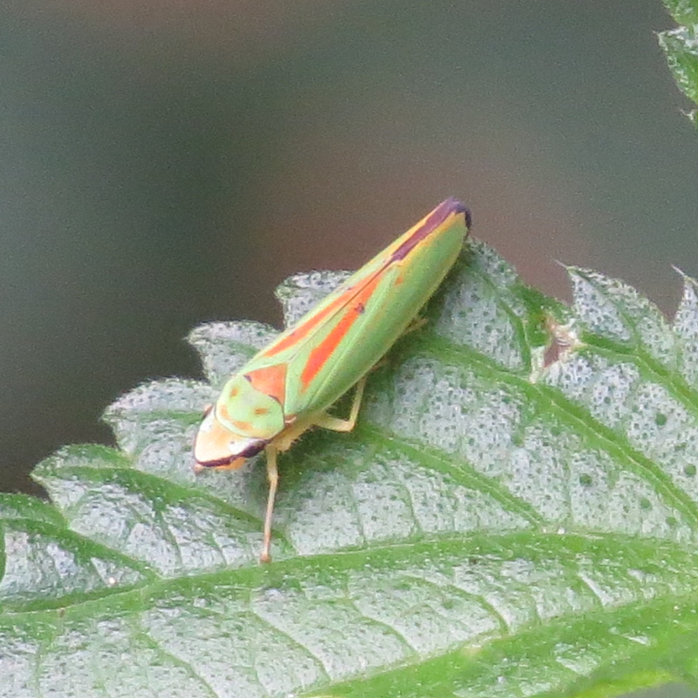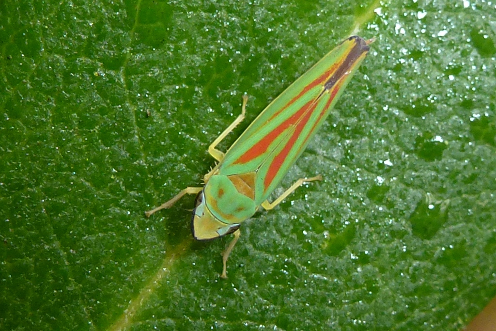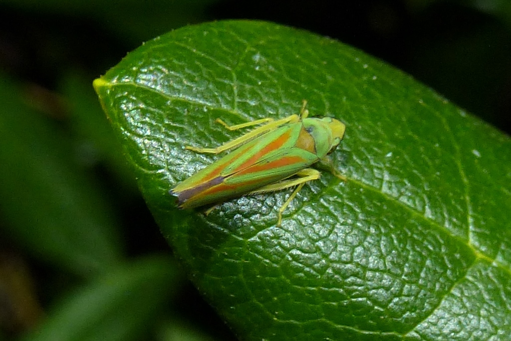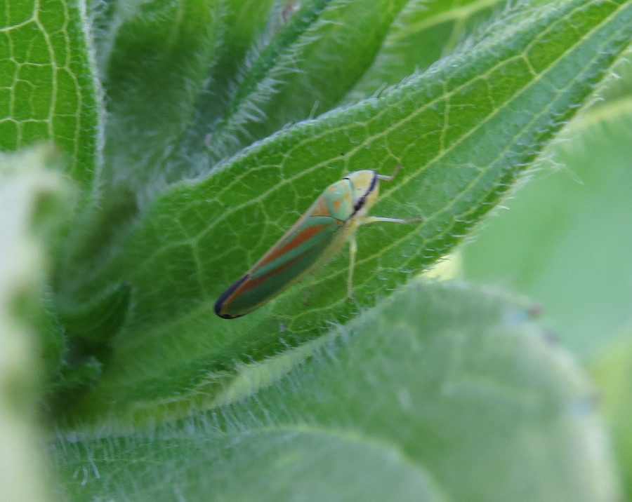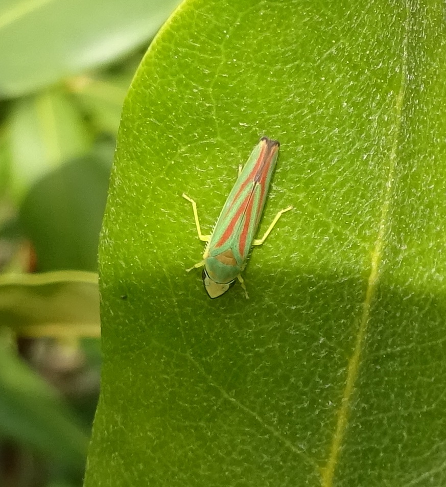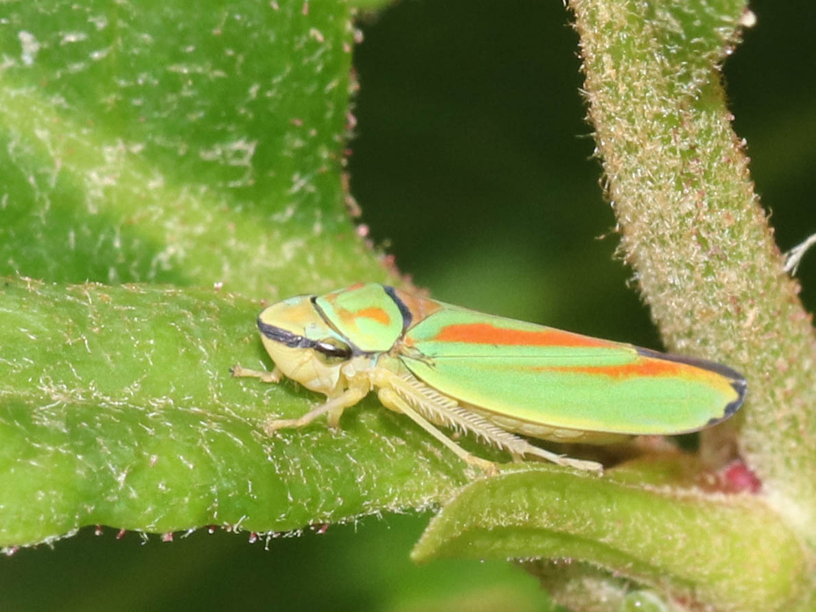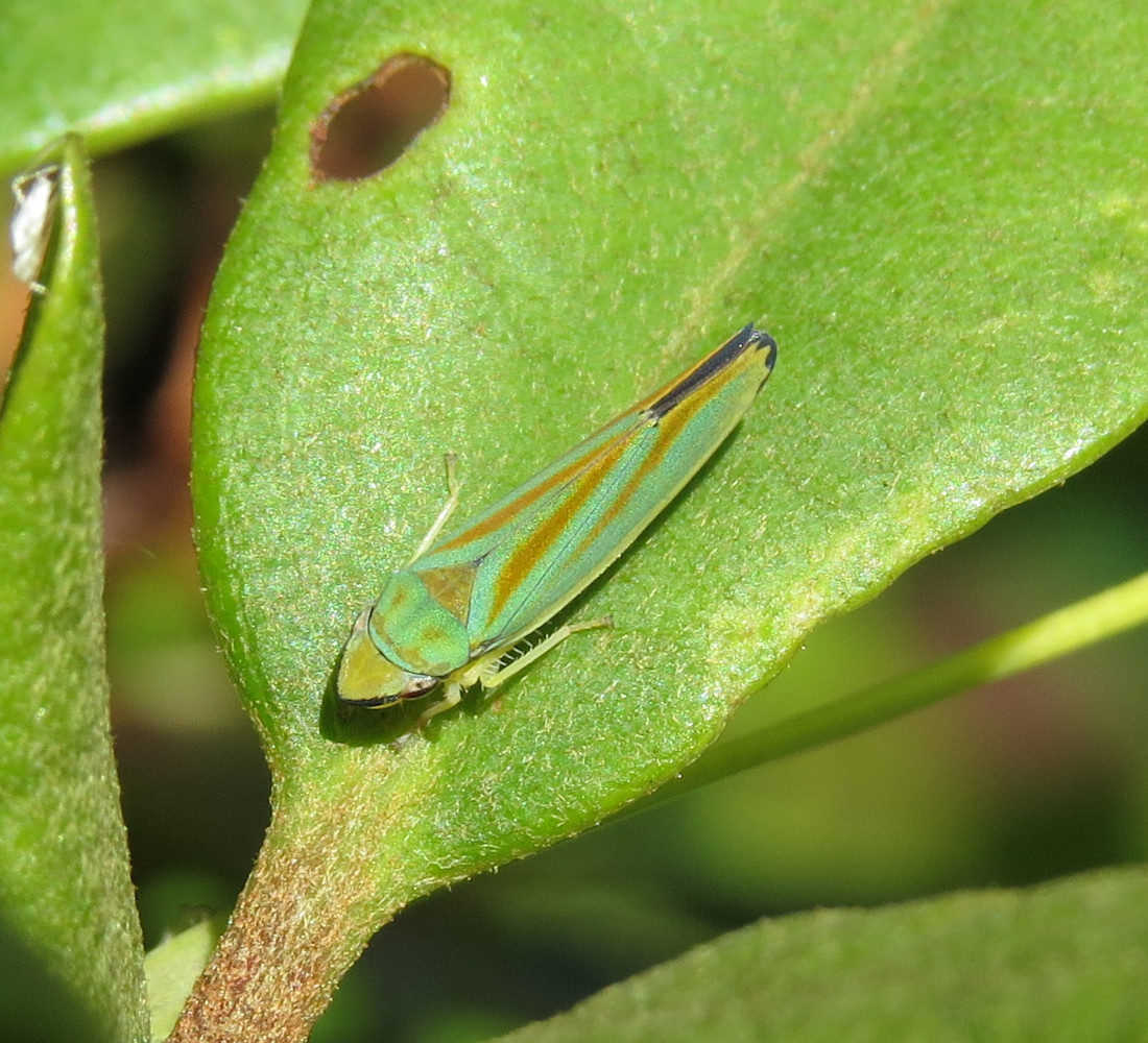 Rhododendronzikade (Graphocephala fennahi Young, 1977), an Rhododendron im Wohngrundstück, 01896 Lichtenberg, Juli 2018.