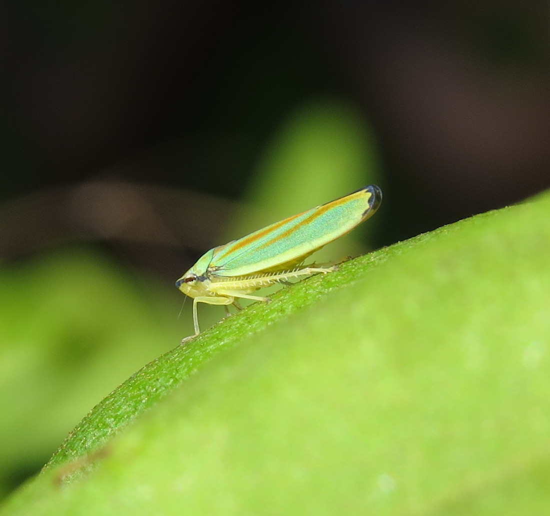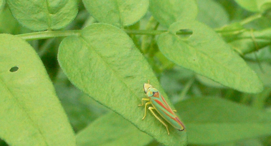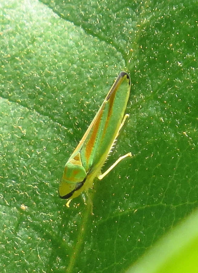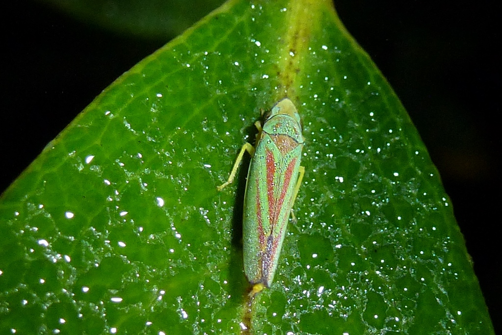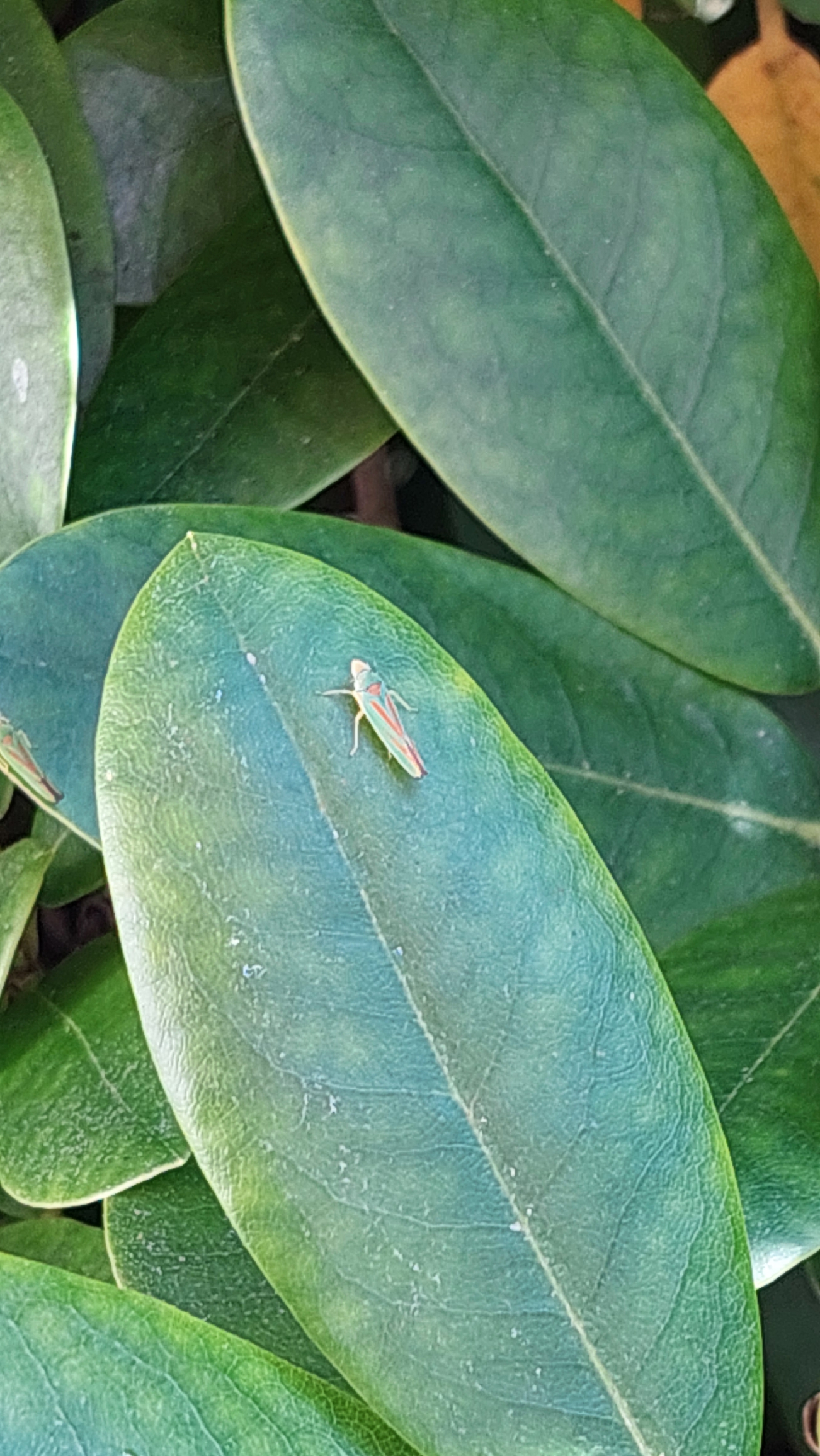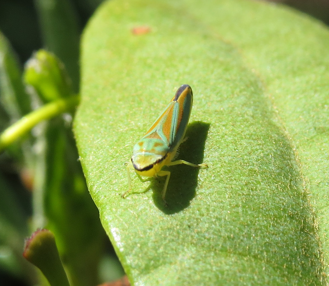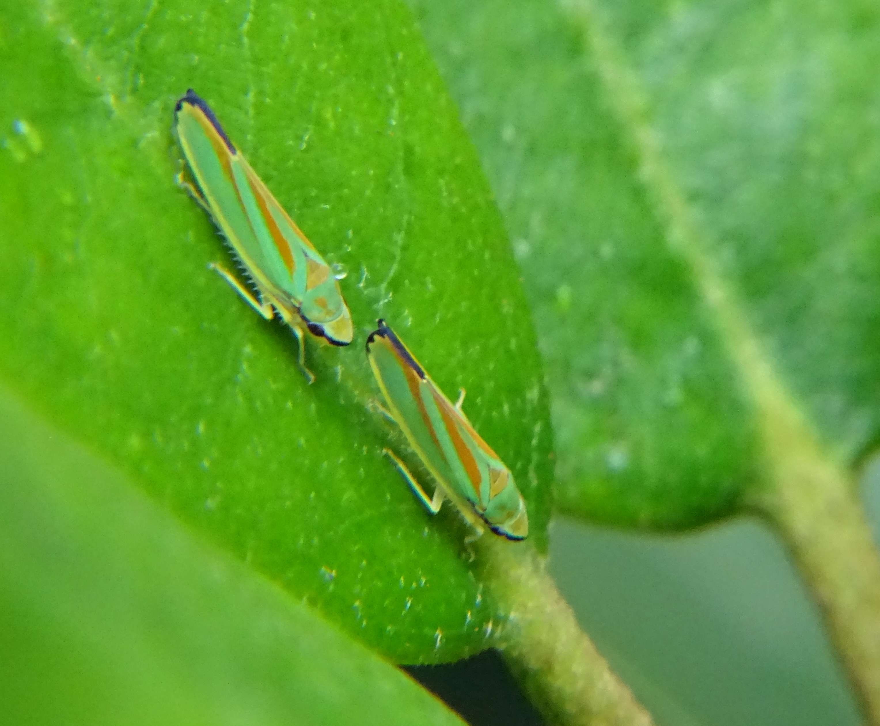 Rhododendronzikade (Graphocephala fennahi Young, 1977), an Rhododendron im Wohngrundstück, 01896 Lichtenberg, Juli 2018.