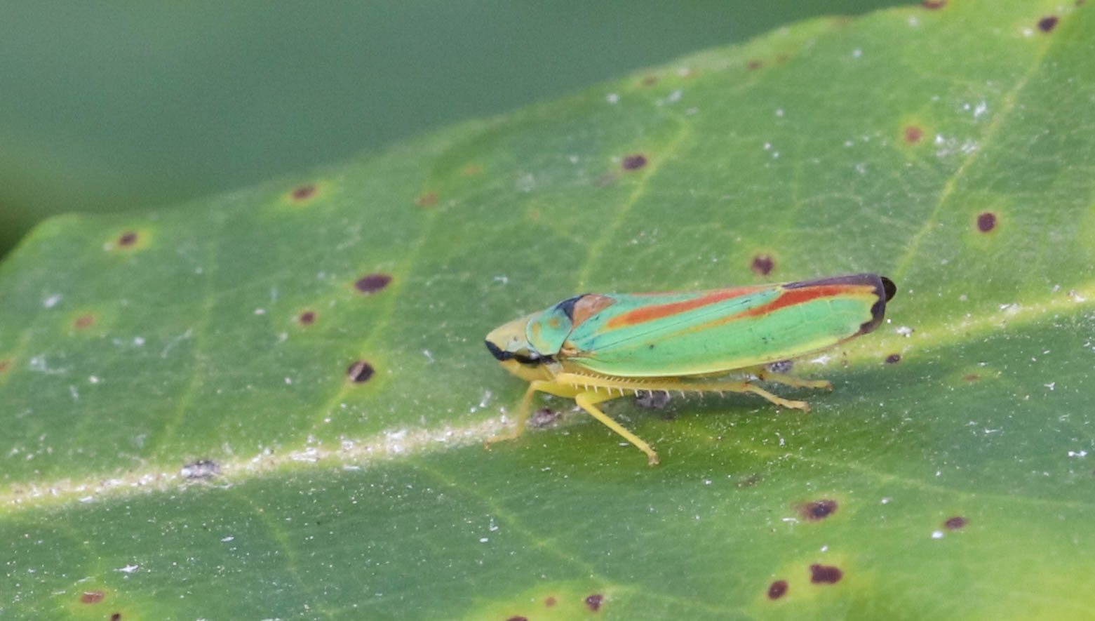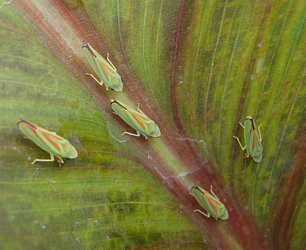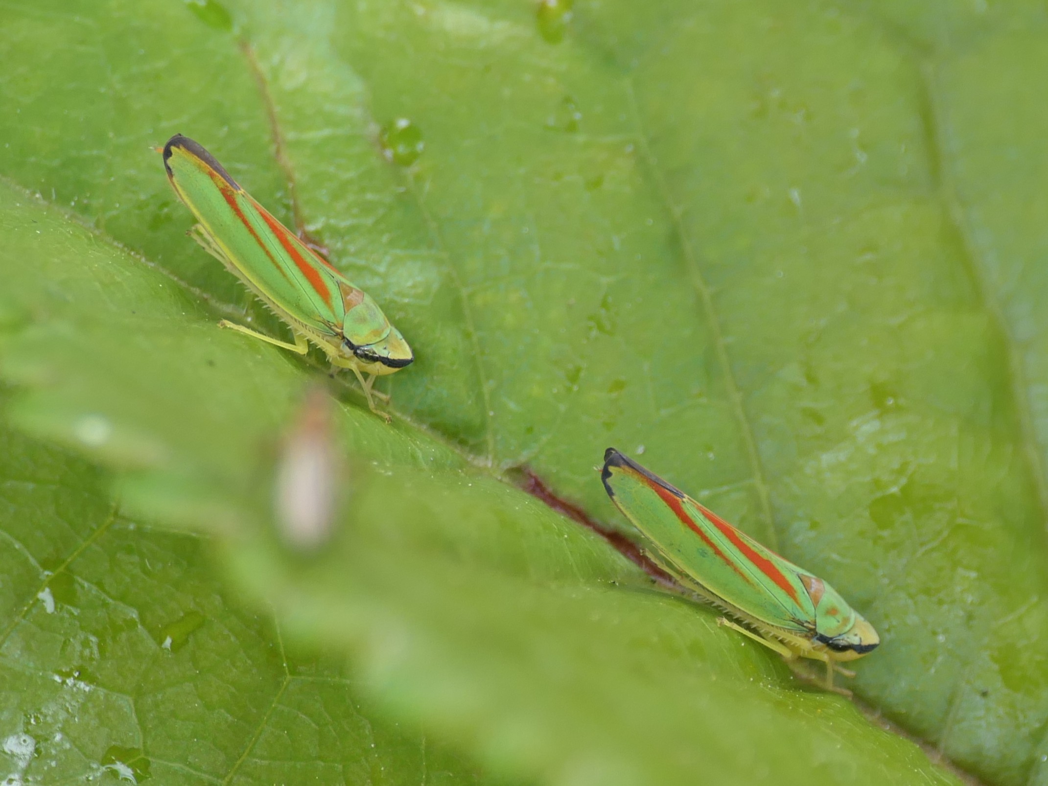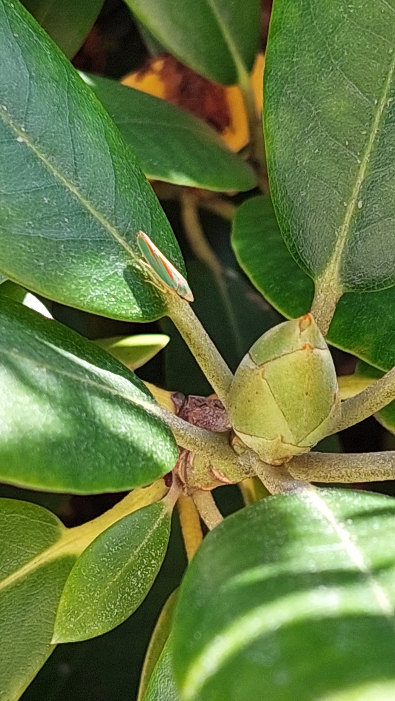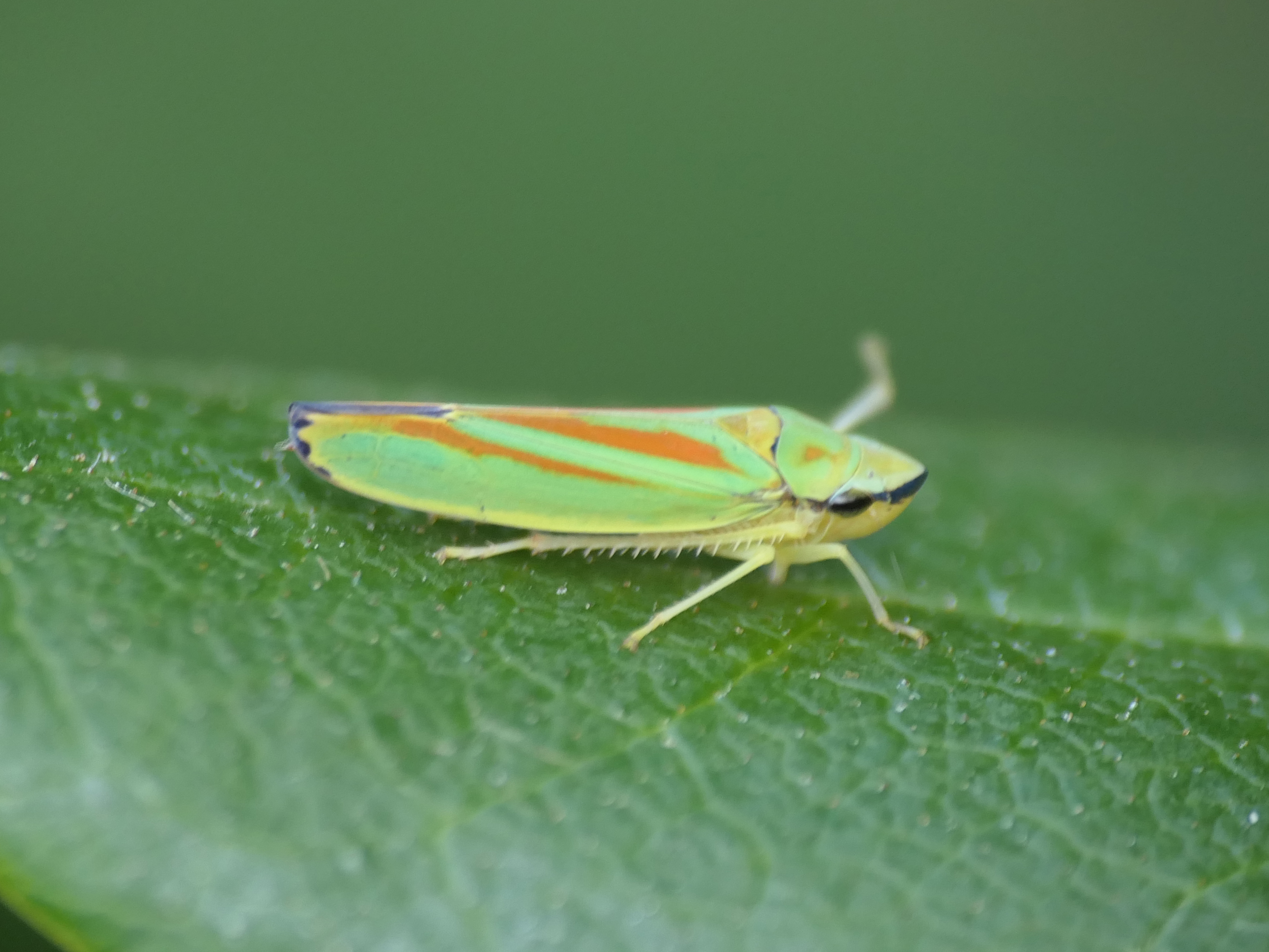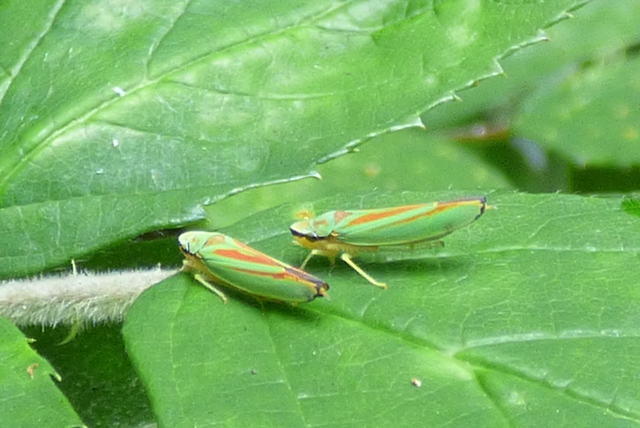 Rhododendronzikade (Graphocephala fennahi Young, 1977), an Rhododendron im Wohngrundstück, 01896 Lichtenberg, Juli 2018.