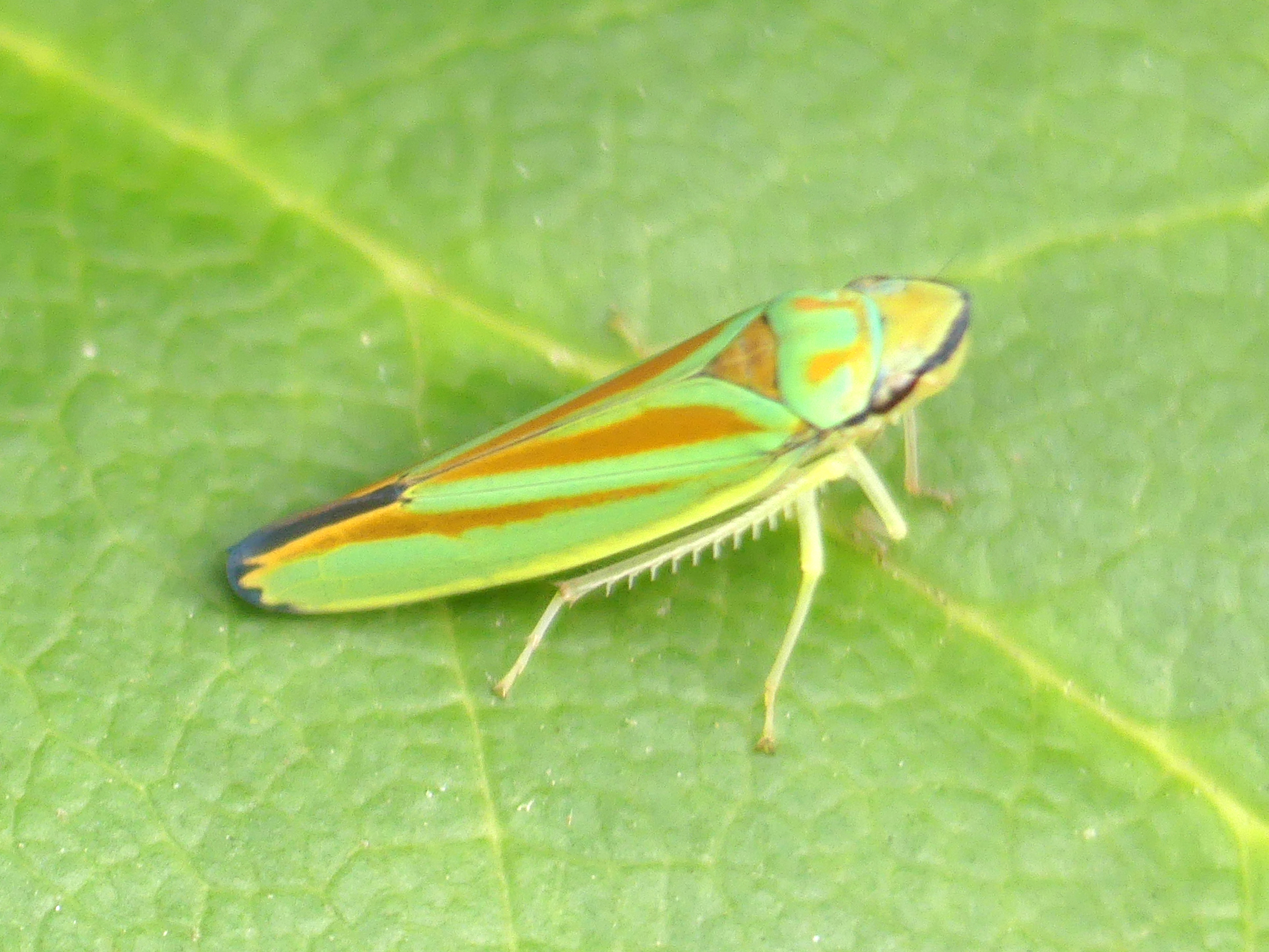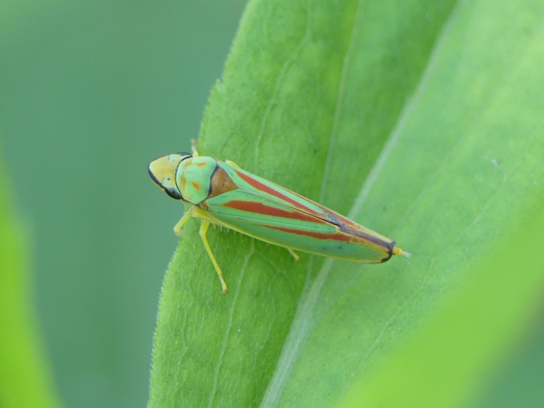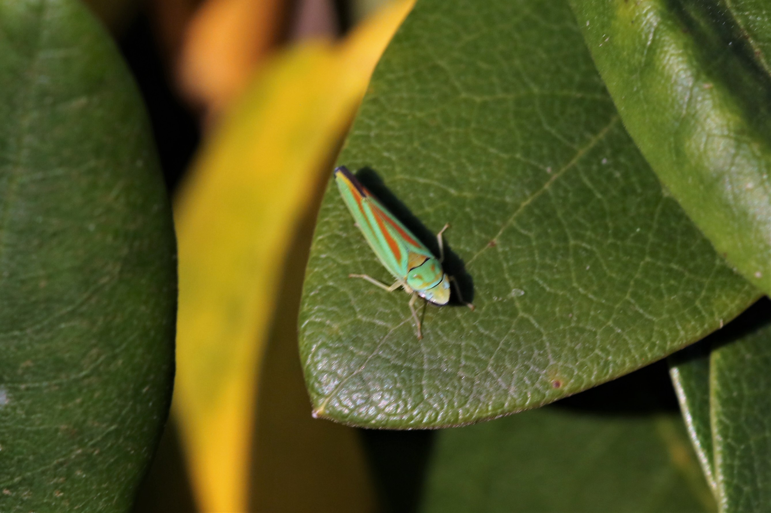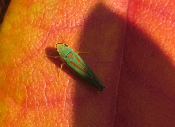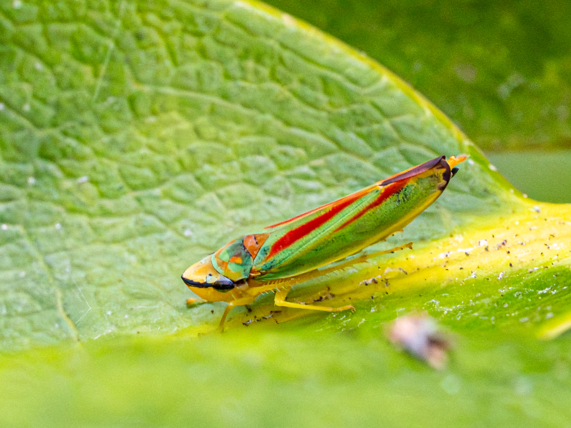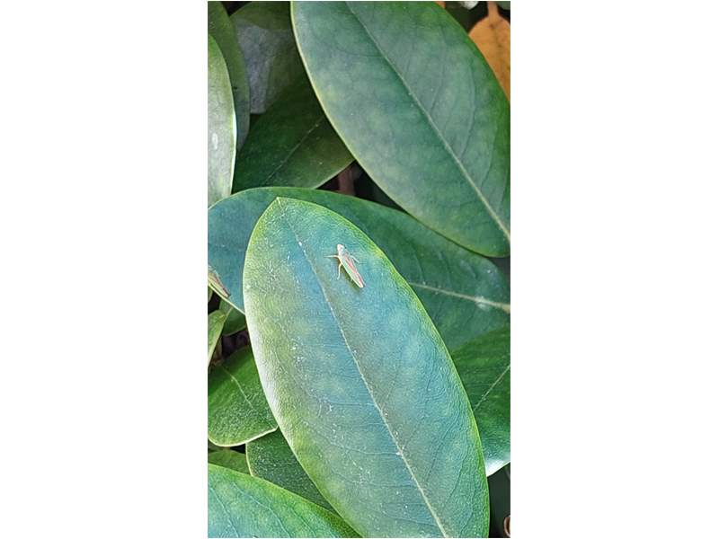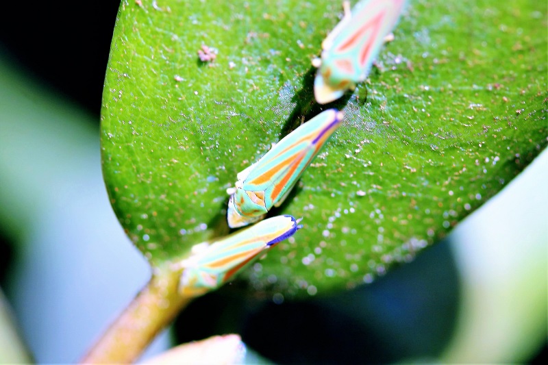 Rhododendronzikade (Graphocephala fennahi Young, 1977), an Rhododendron im Wohngrundstück, 01896 Lichtenberg, Juli 2018.