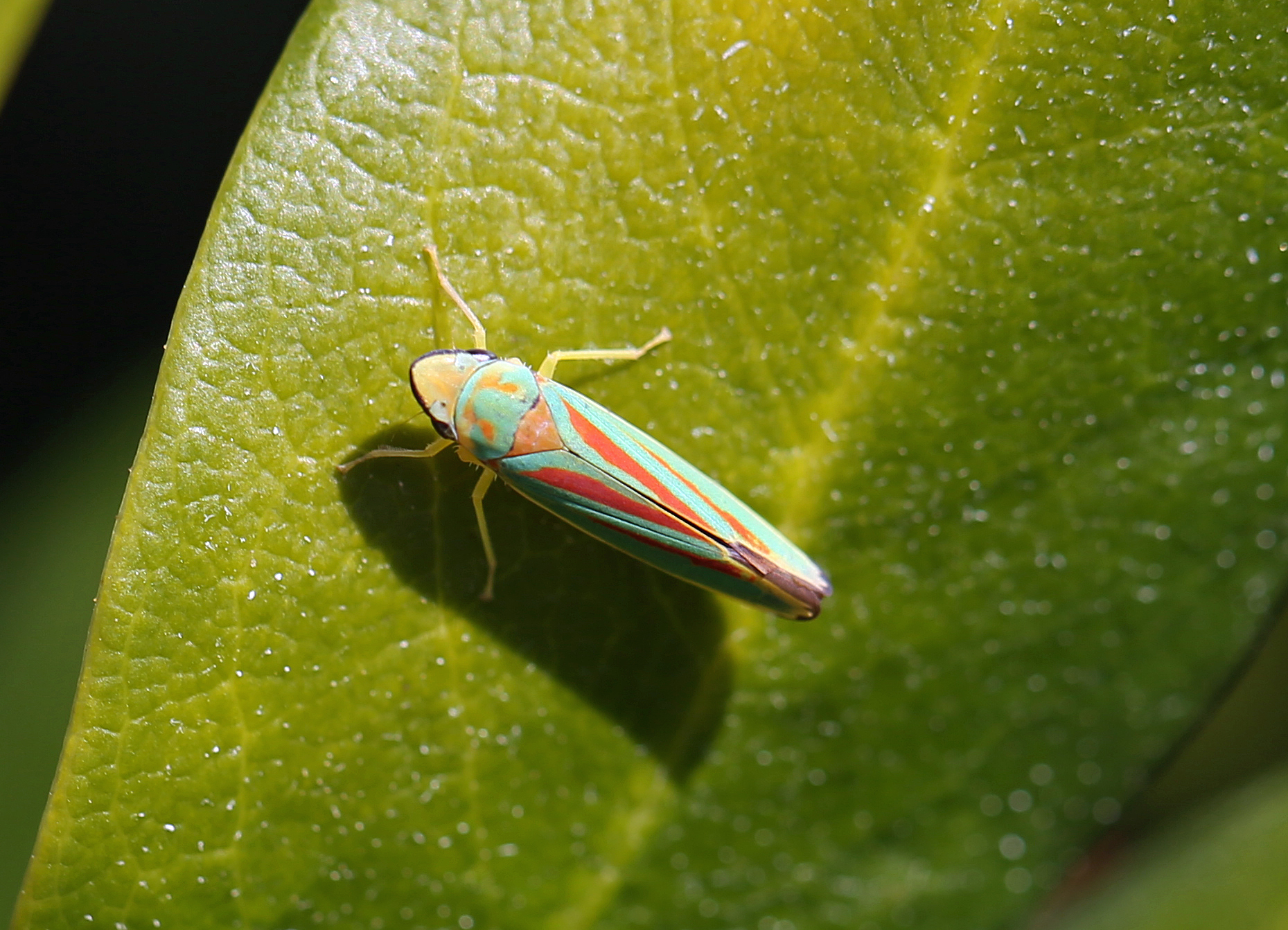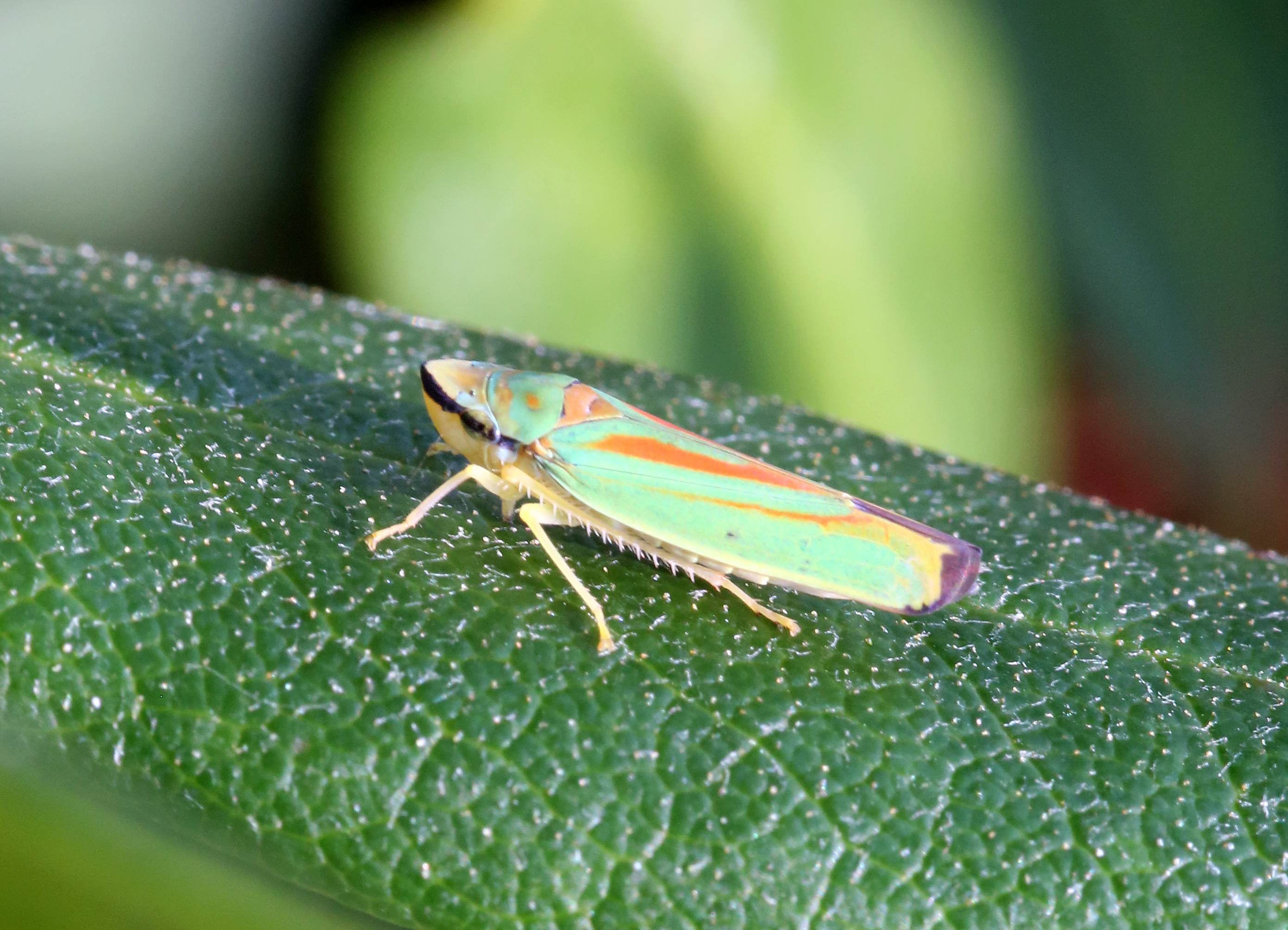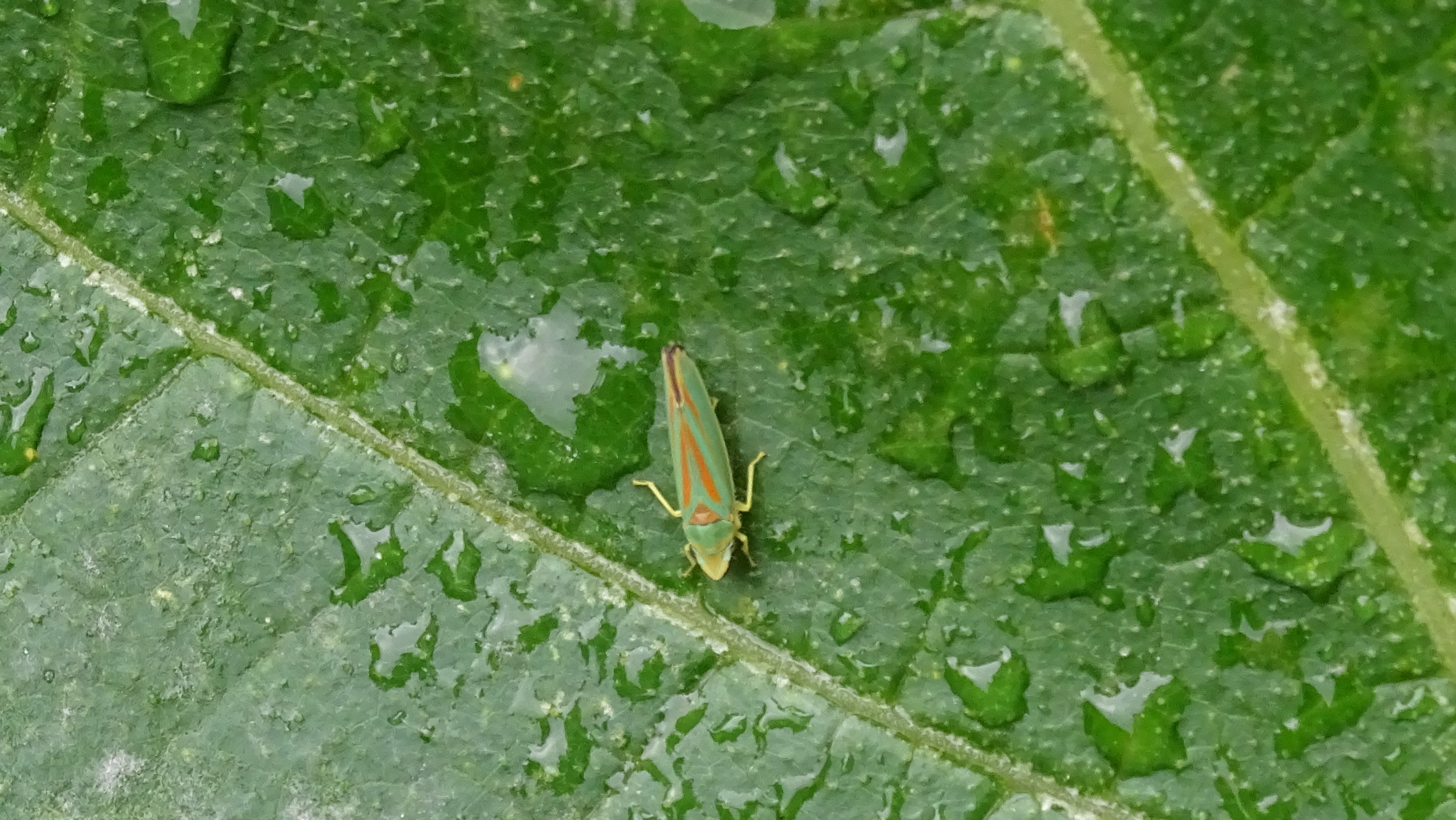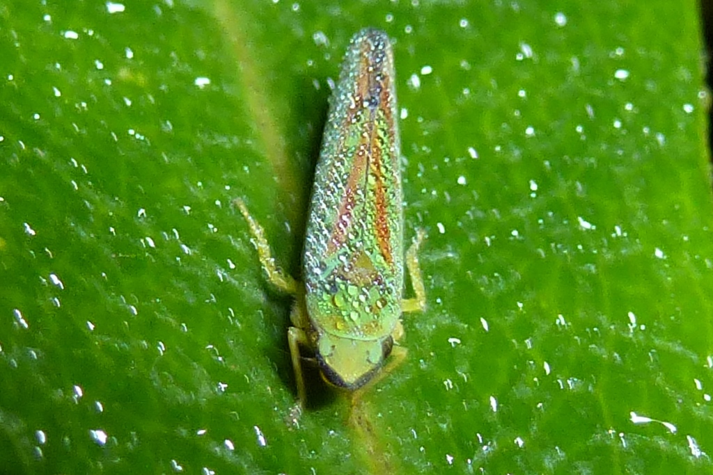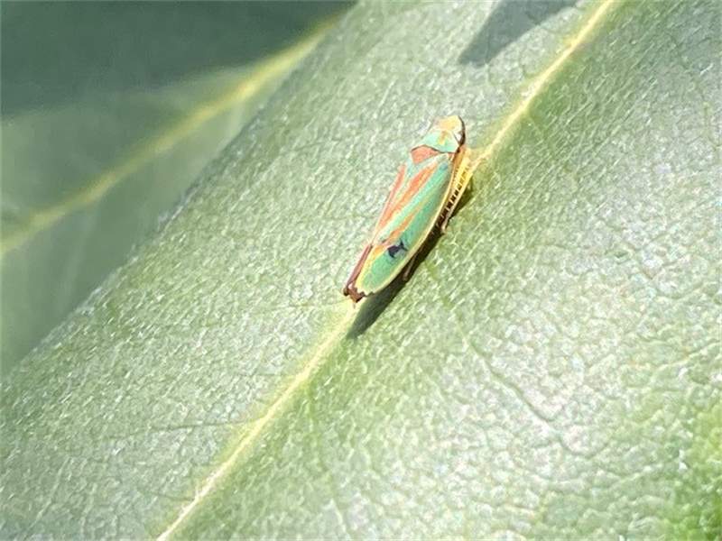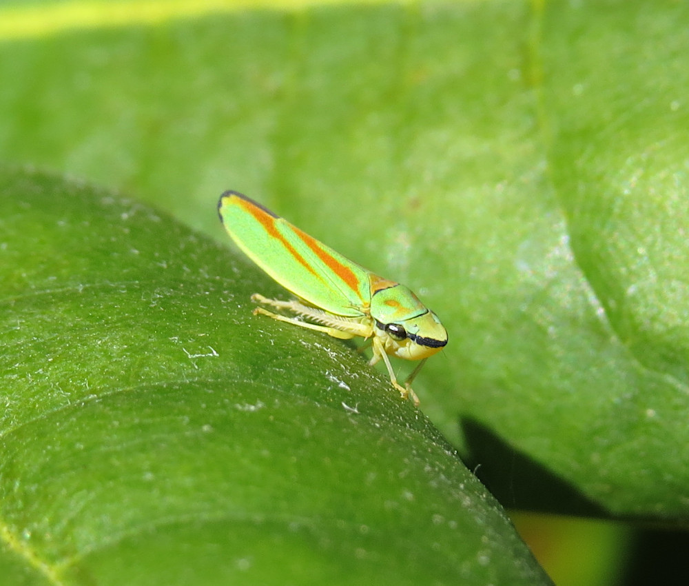 Rhododendronzikade (Graphocephala fennahi Young, 1977), an Rhododendron im Wohngrundstück, 01896 Lichtenberg, Juli 2018.