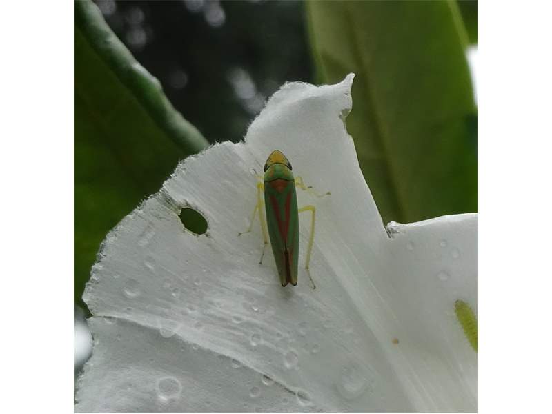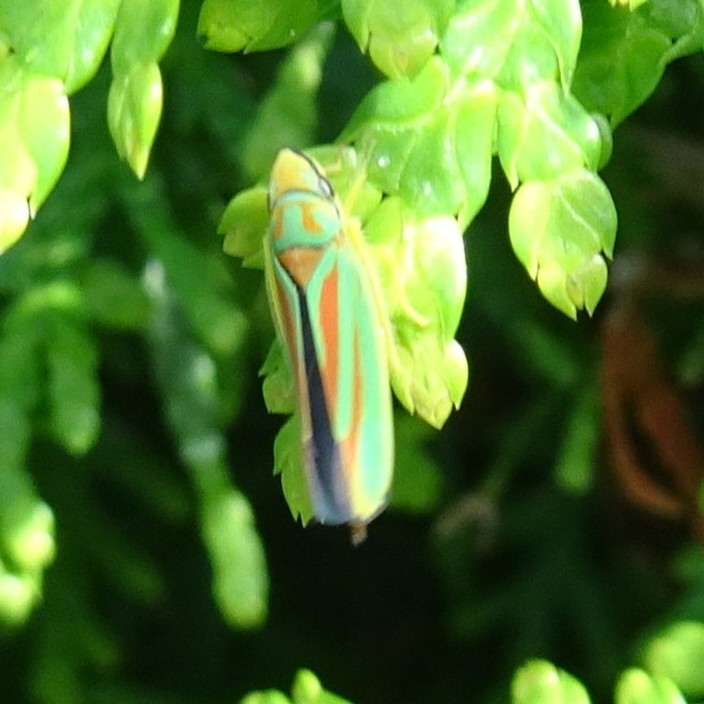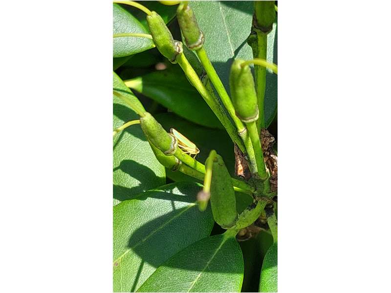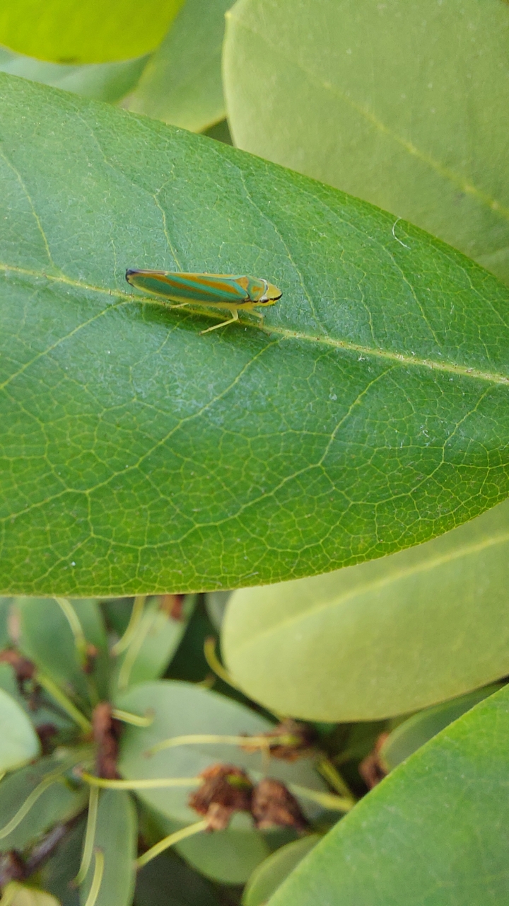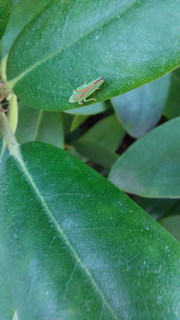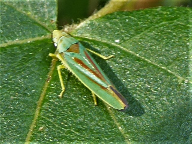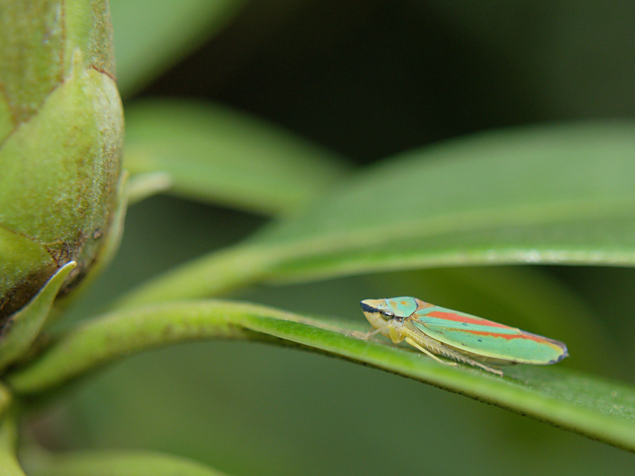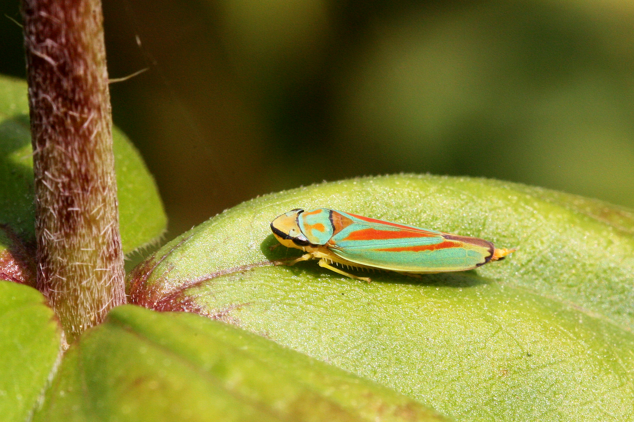 Rhododendronzikade (Graphocephala fennahi Young, 1977), an Rhododendron im Wohngrundstück, 01896 Lichtenberg, Juli 2018.