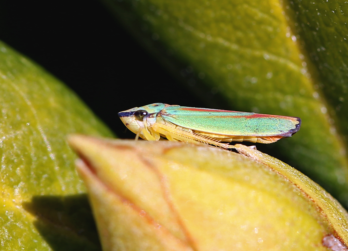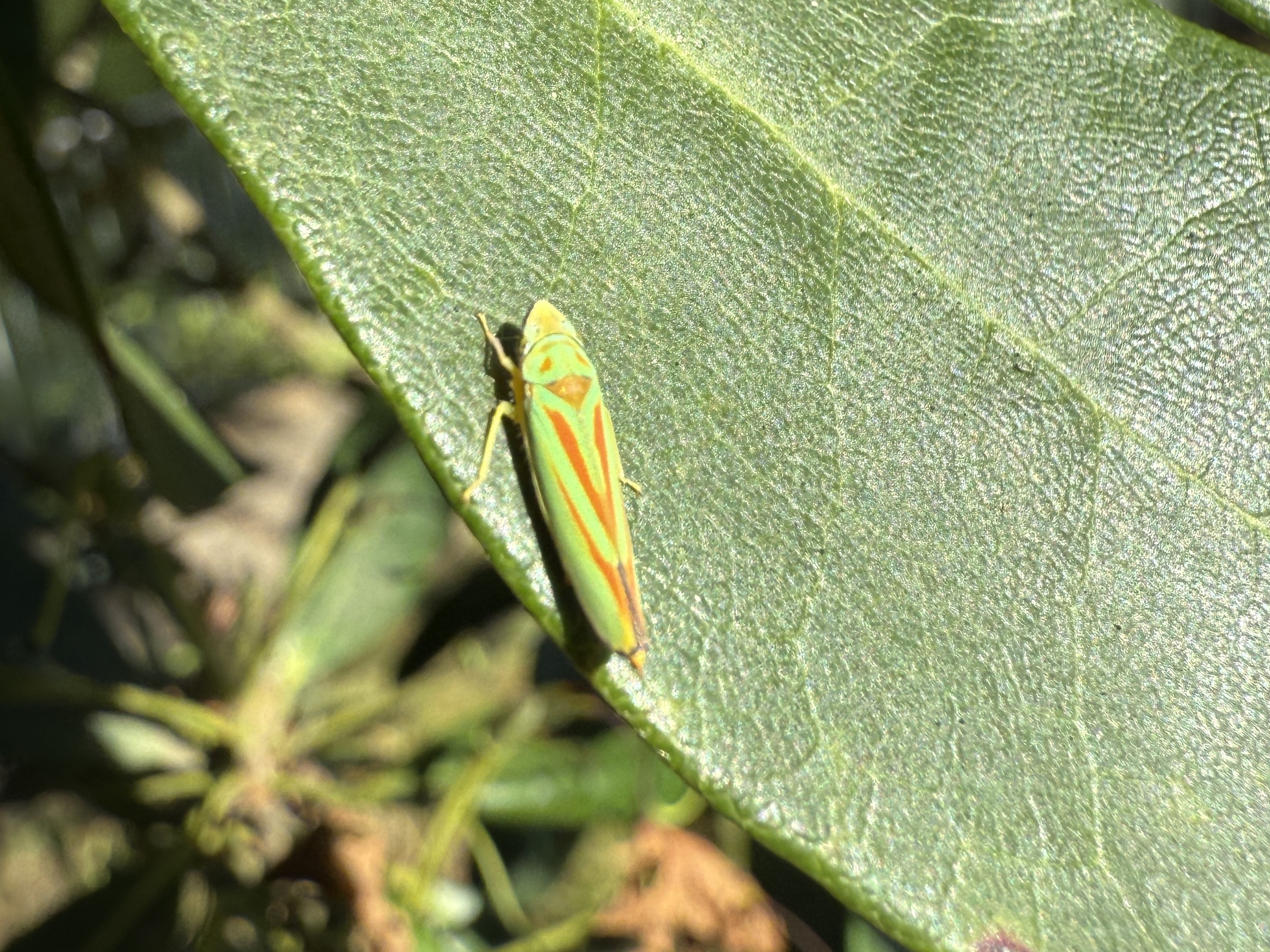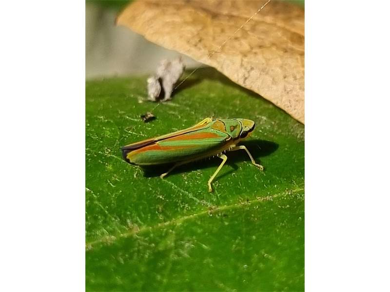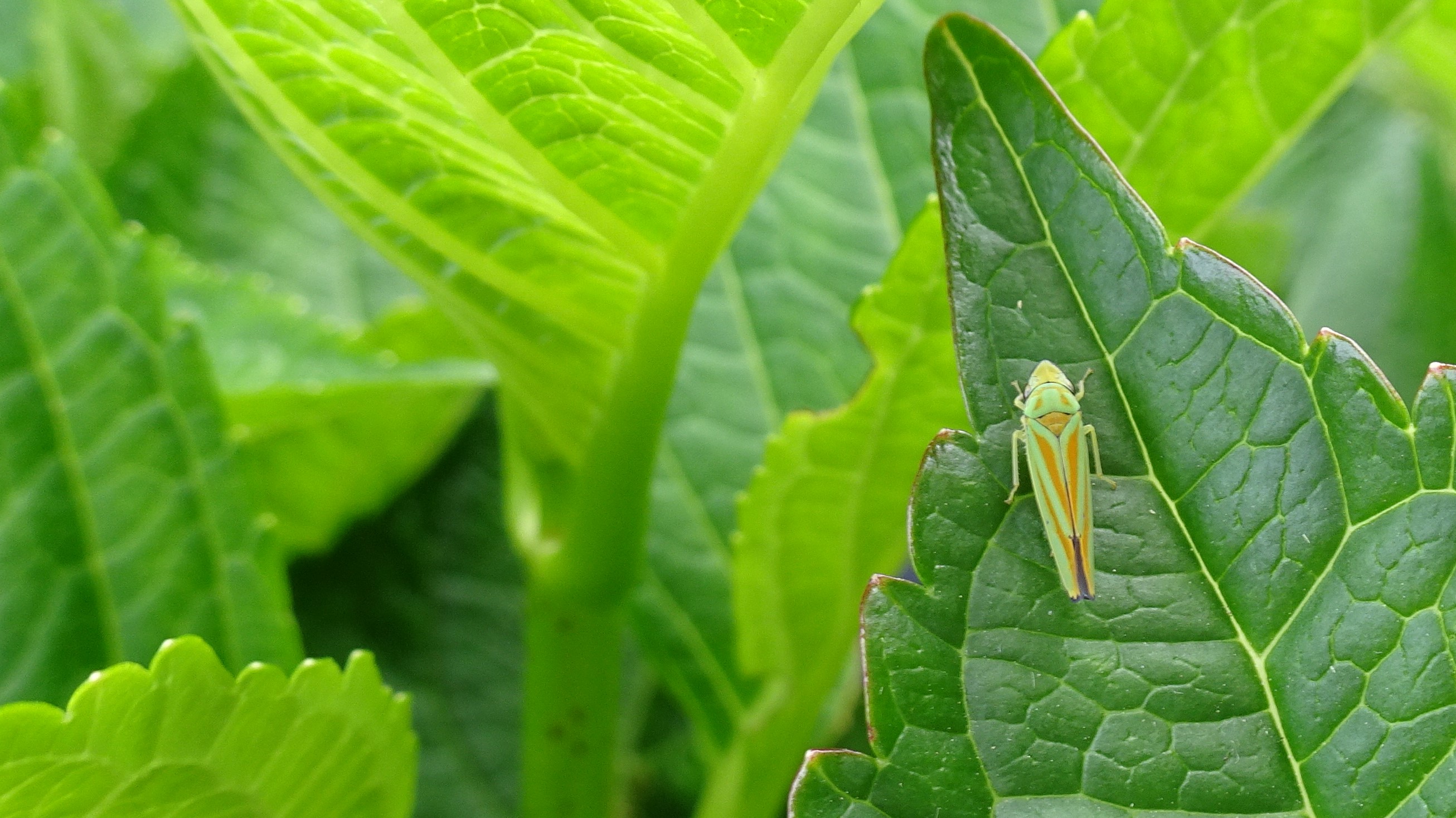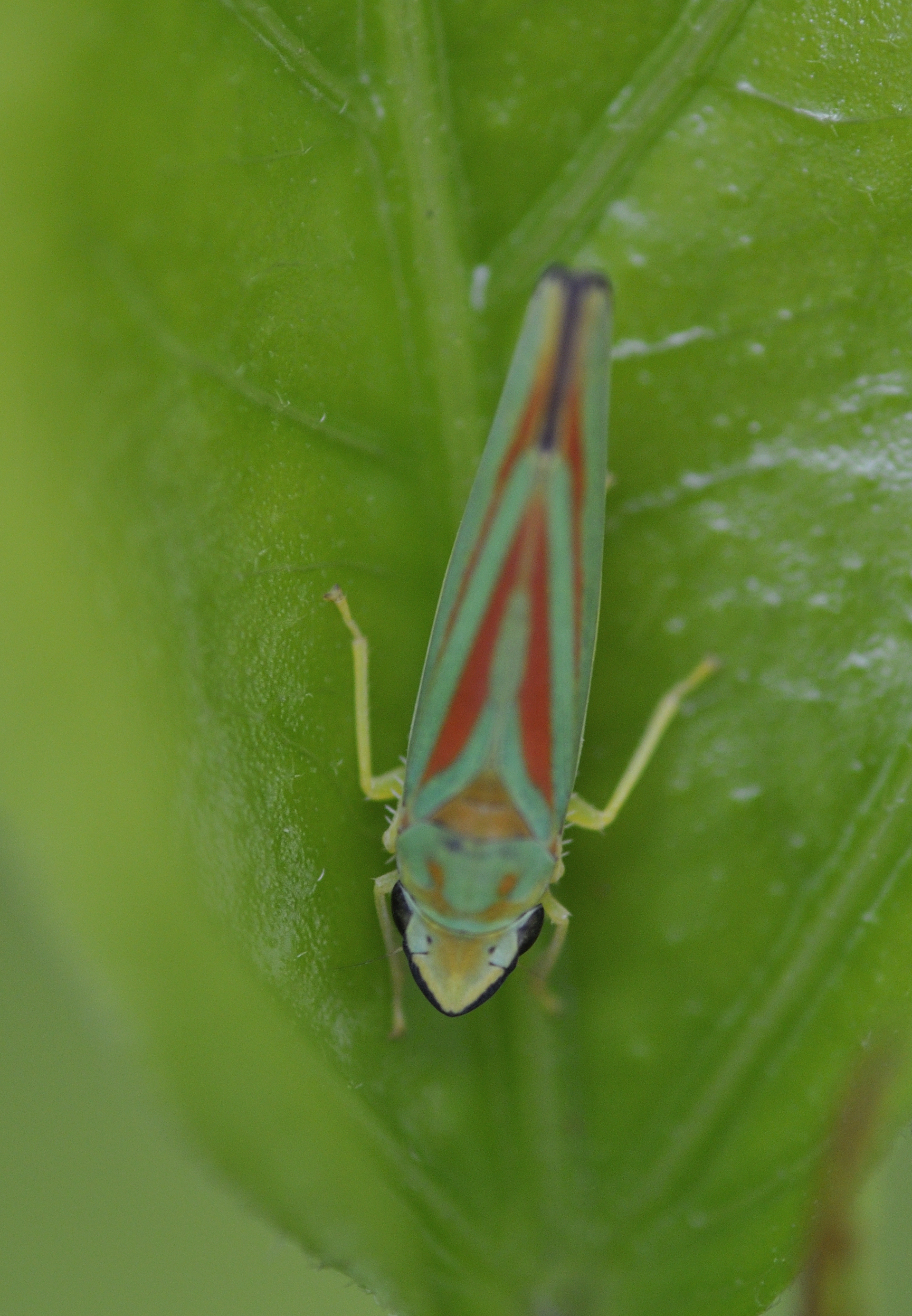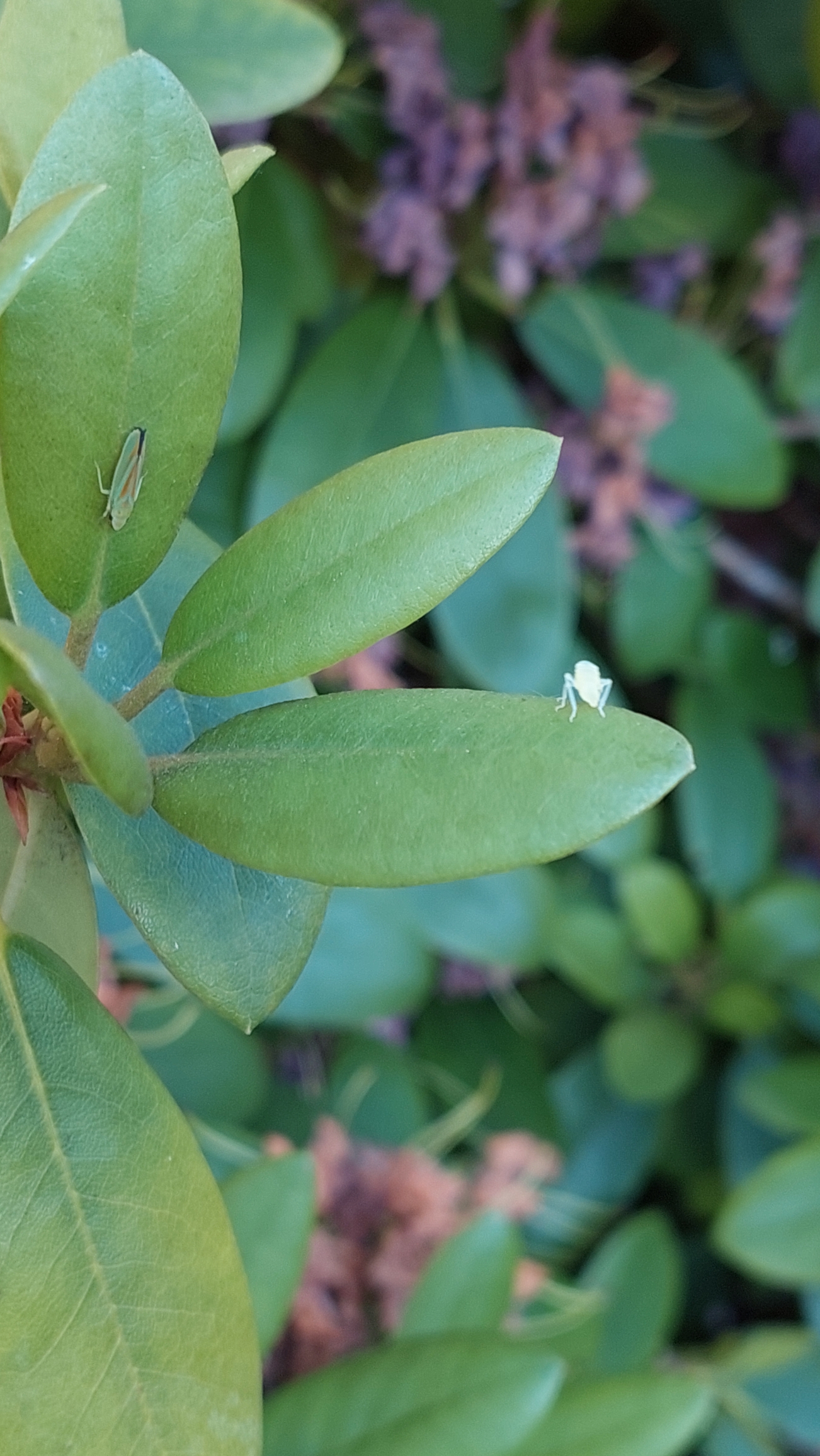 Rhododendronzikade (Graphocephala fennahi Young, 1977), an Rhododendron im Wohngrundstück, 01896 Lichtenberg, Juli 2018.