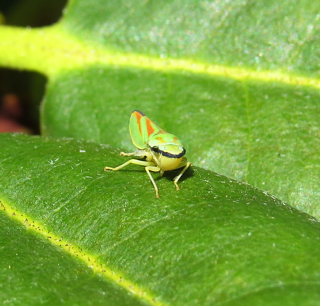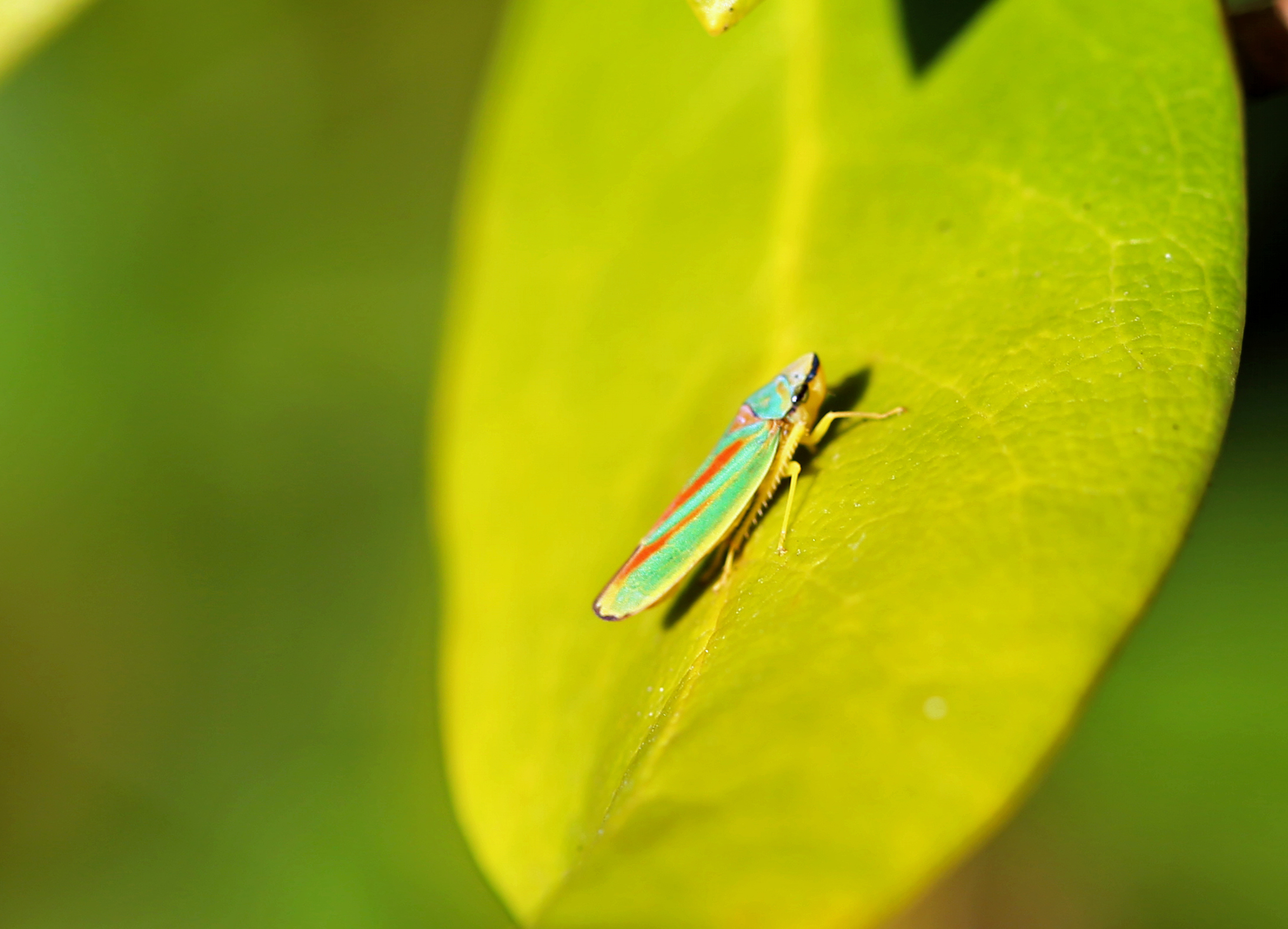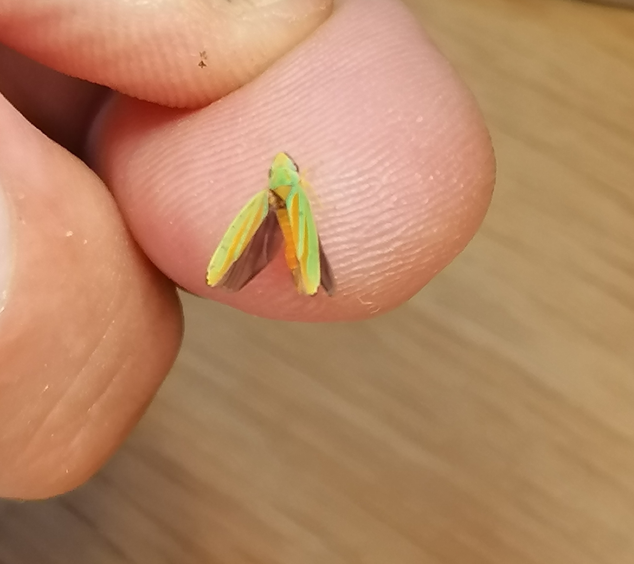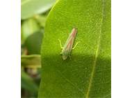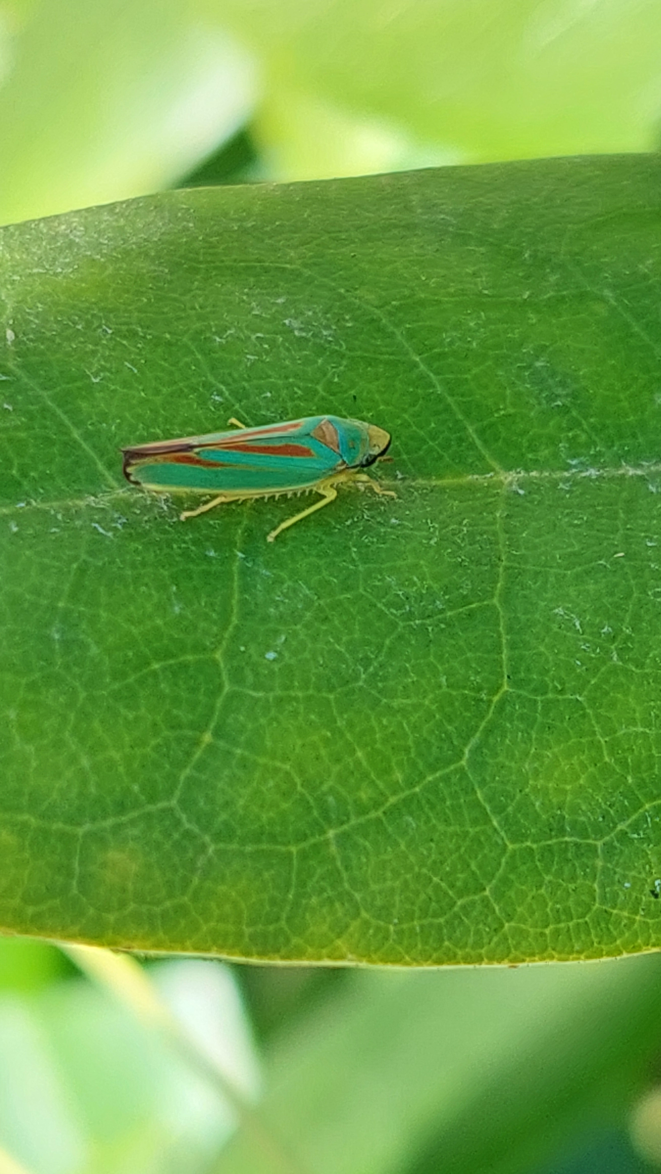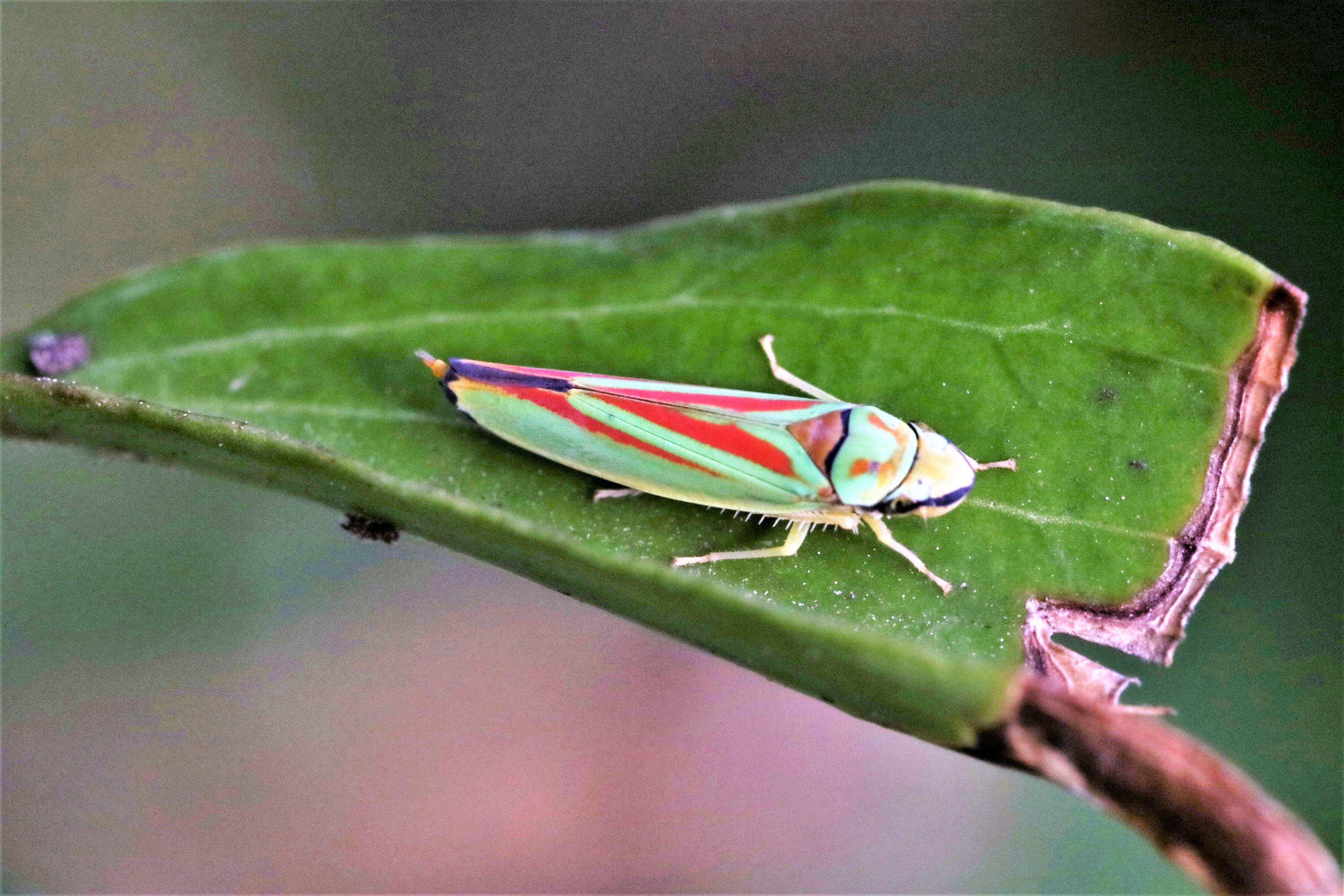 Rhododendronzikade (Graphocephala fennahi Young, 1977), an Rhododendron im Wohngrundstück, 01896 Lichtenberg, Juli 2018.