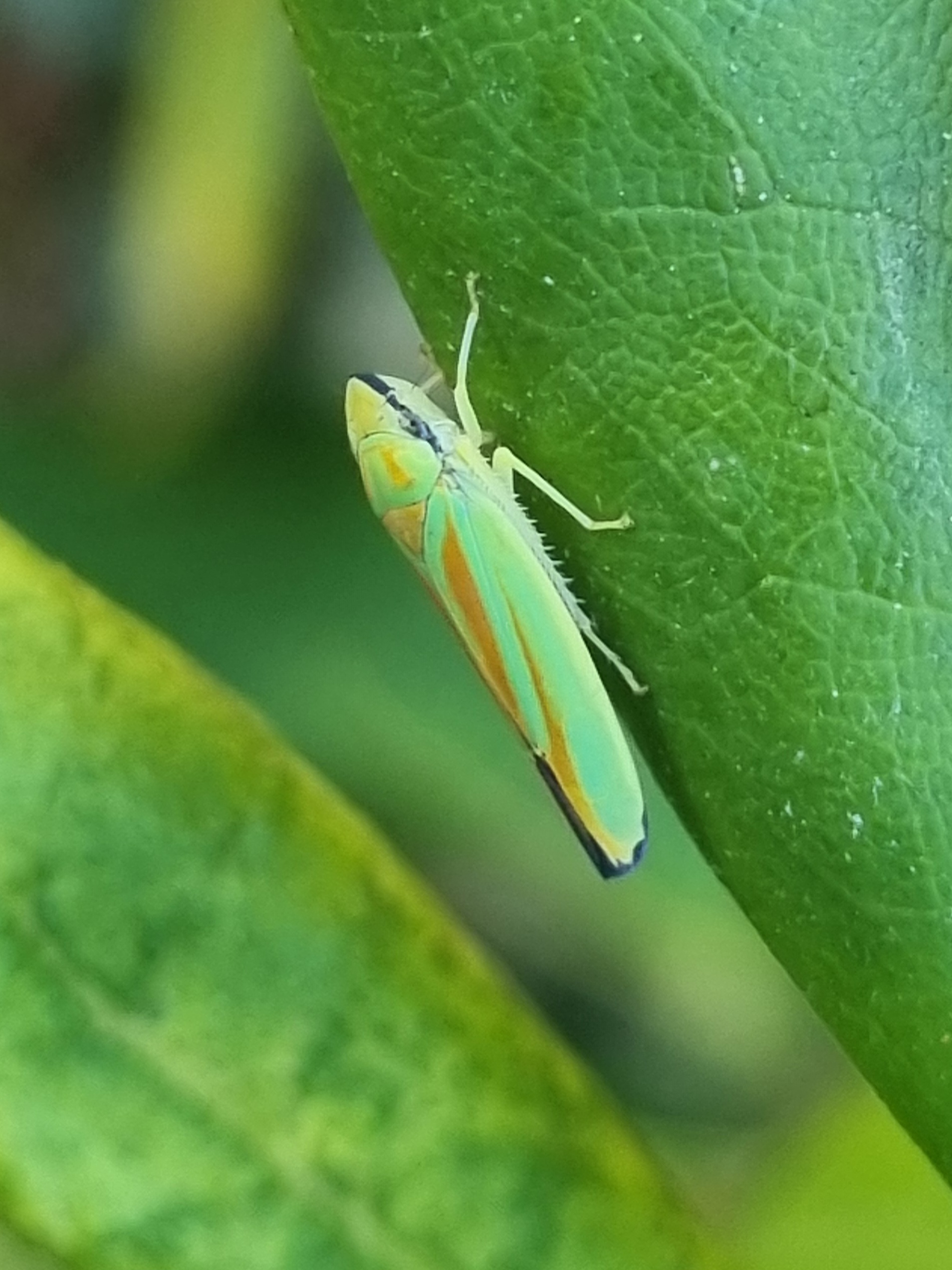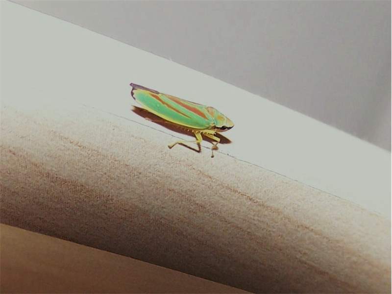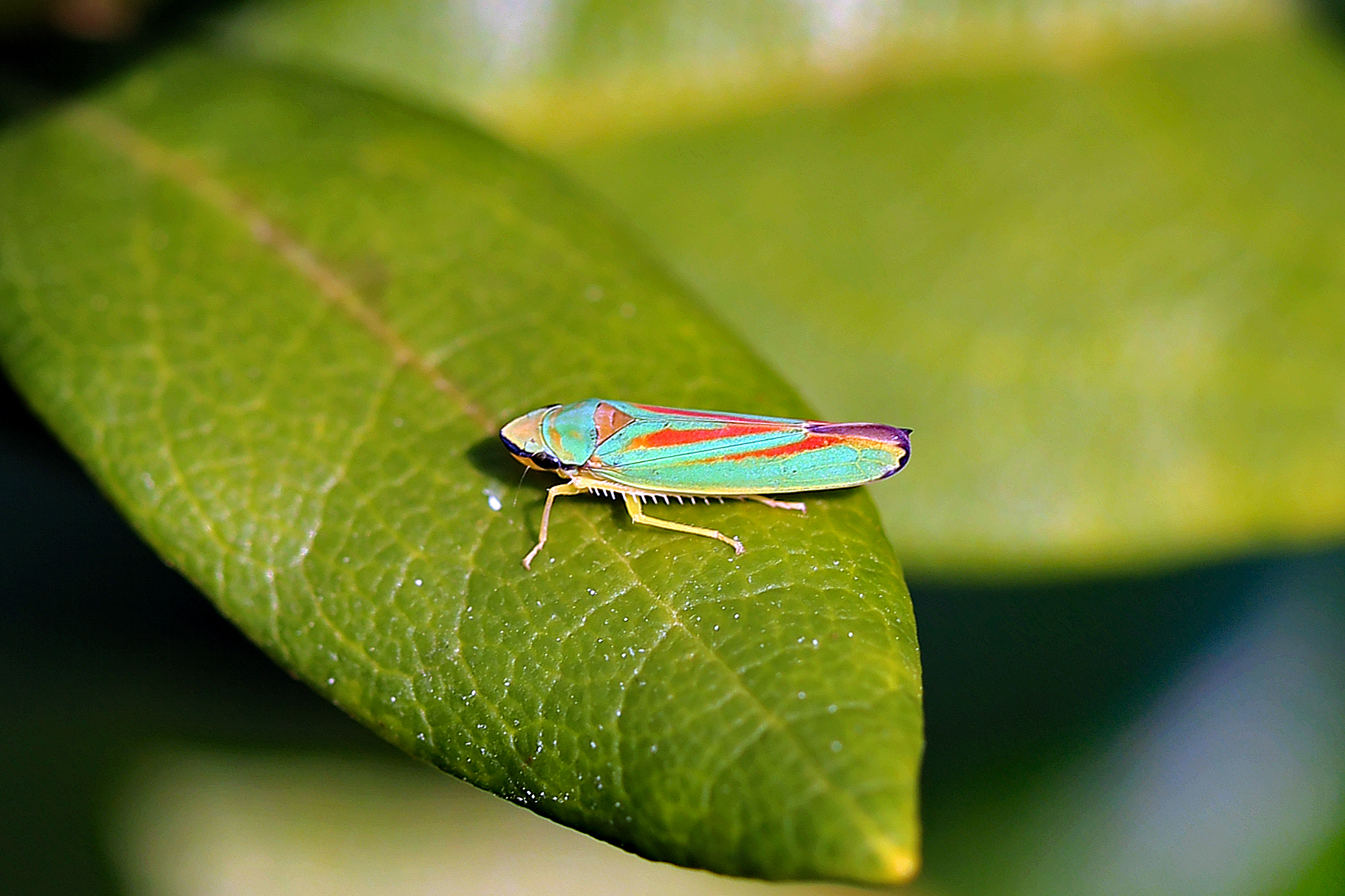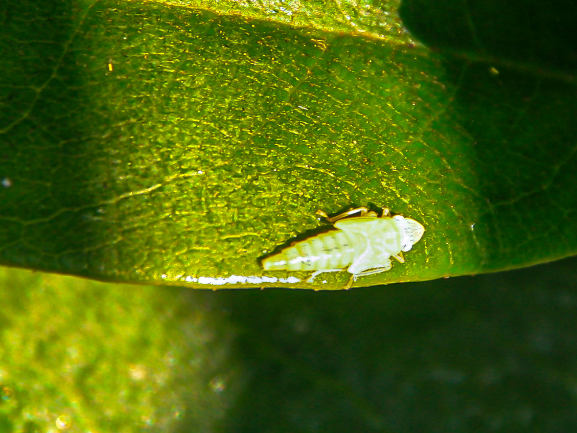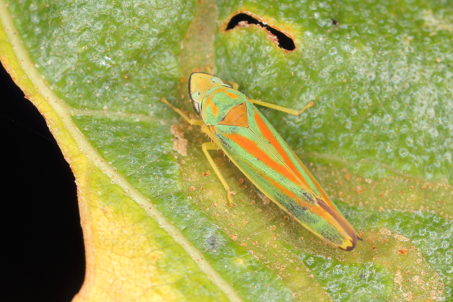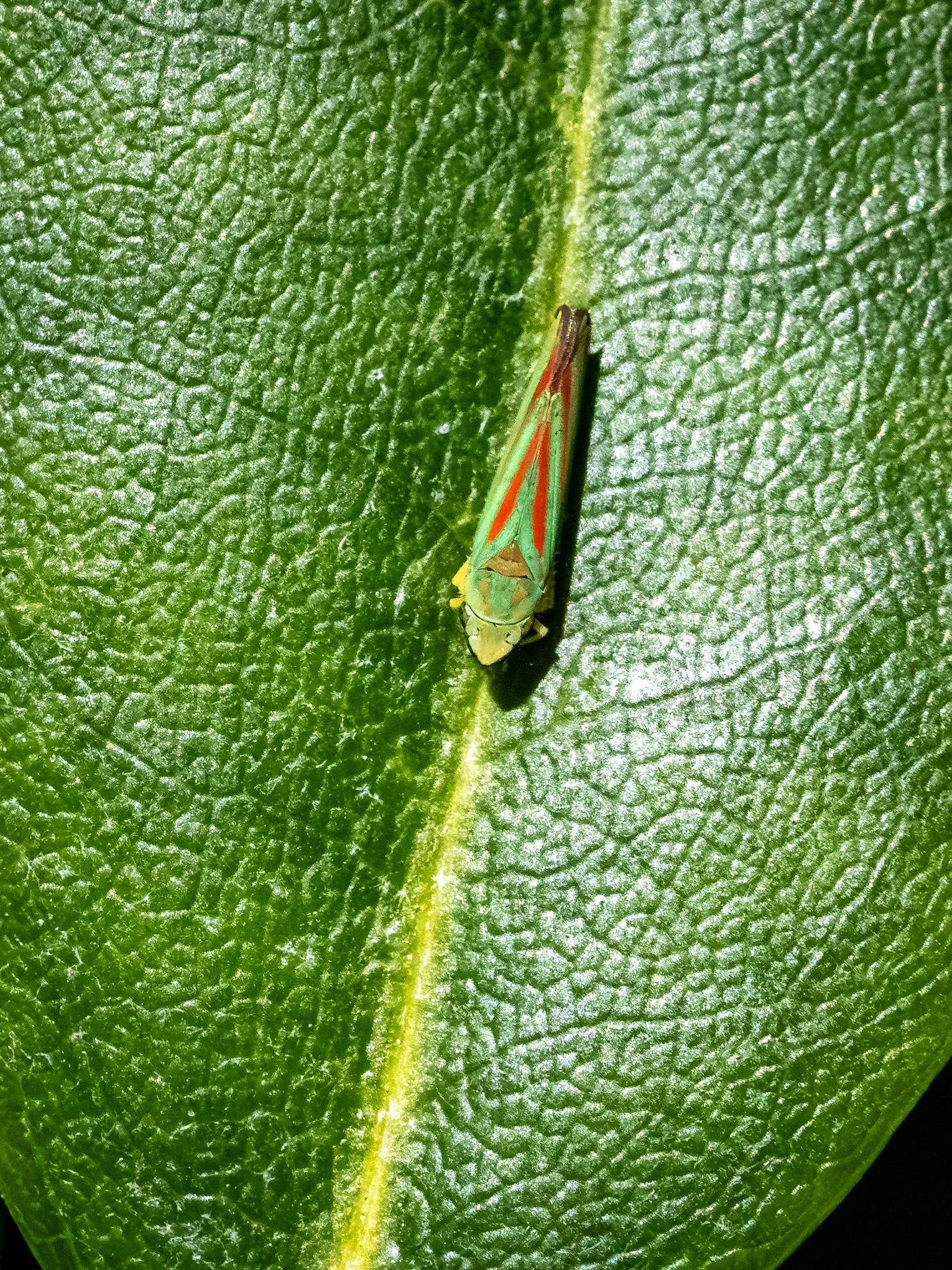 Rhododendronzikade (Graphocephala fennahi Young, 1977), an Rhododendron im Wohngrundstück, 01896 Lichtenberg, Juli 2018.