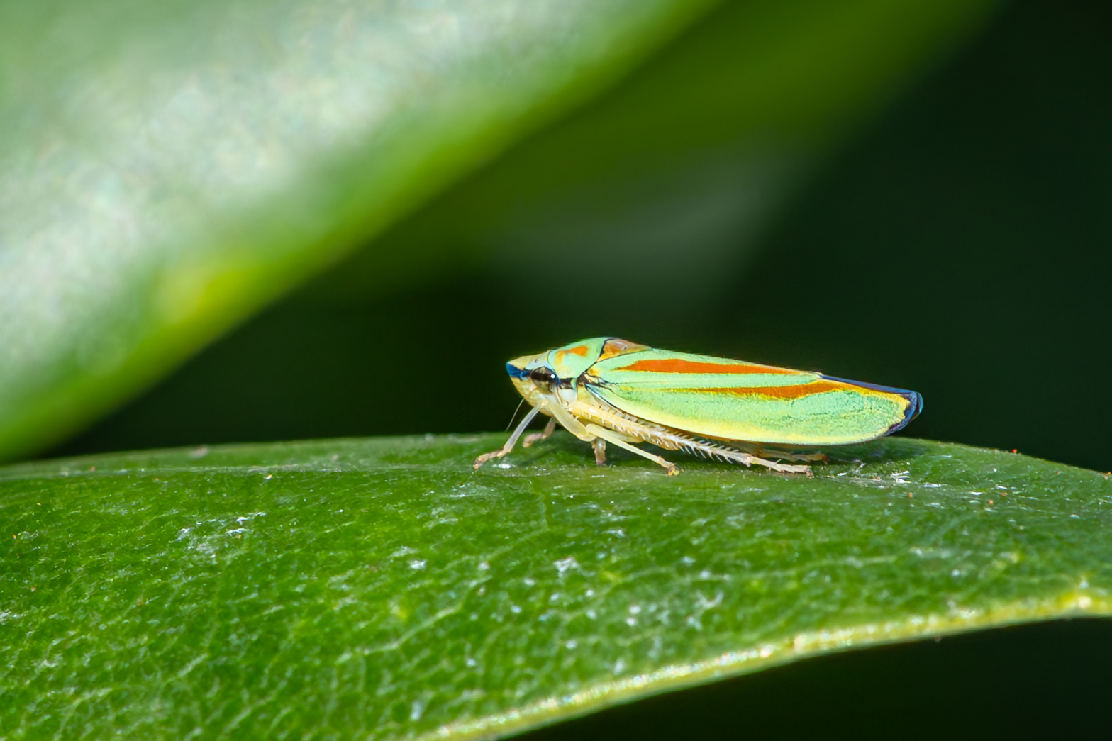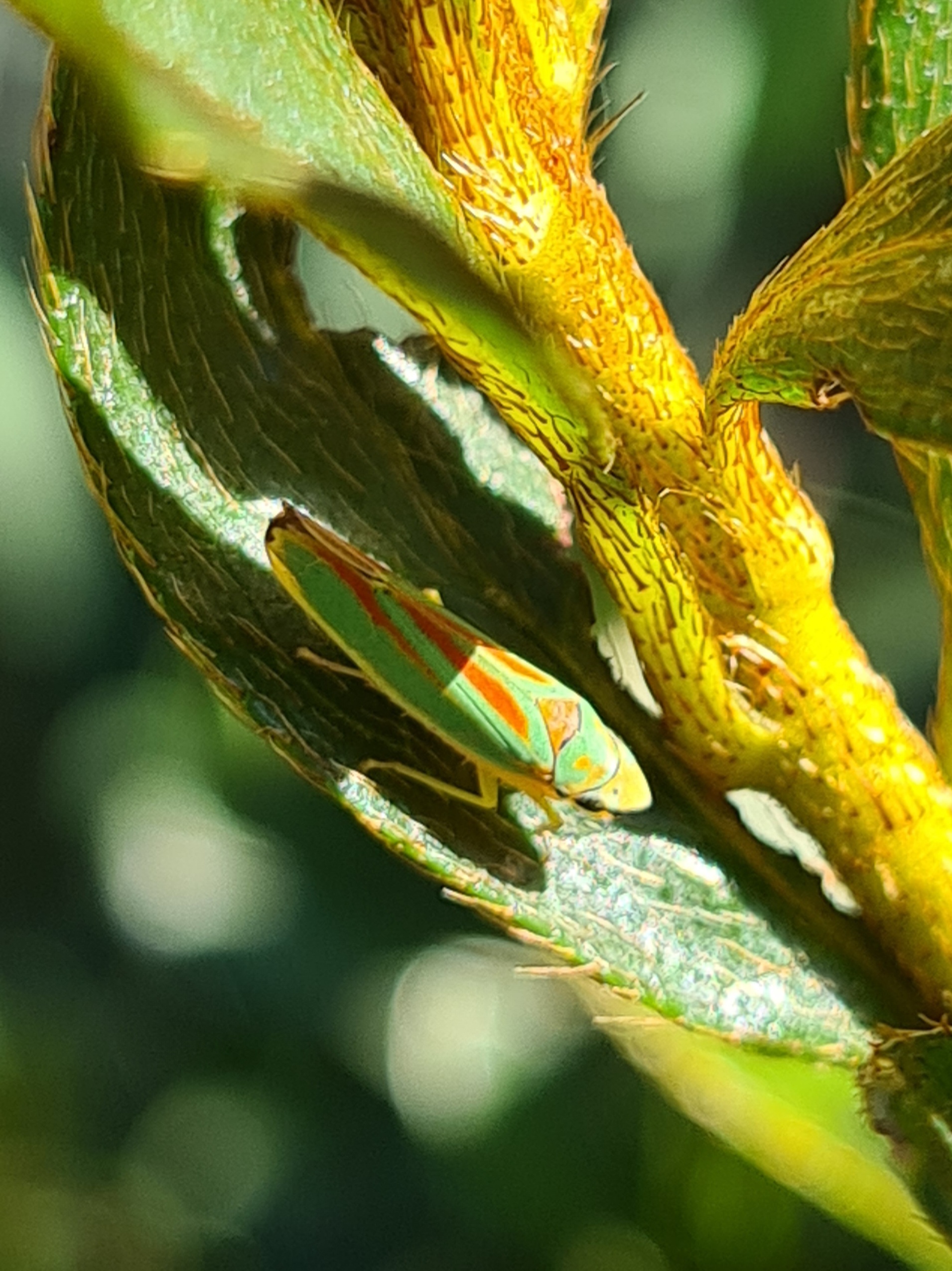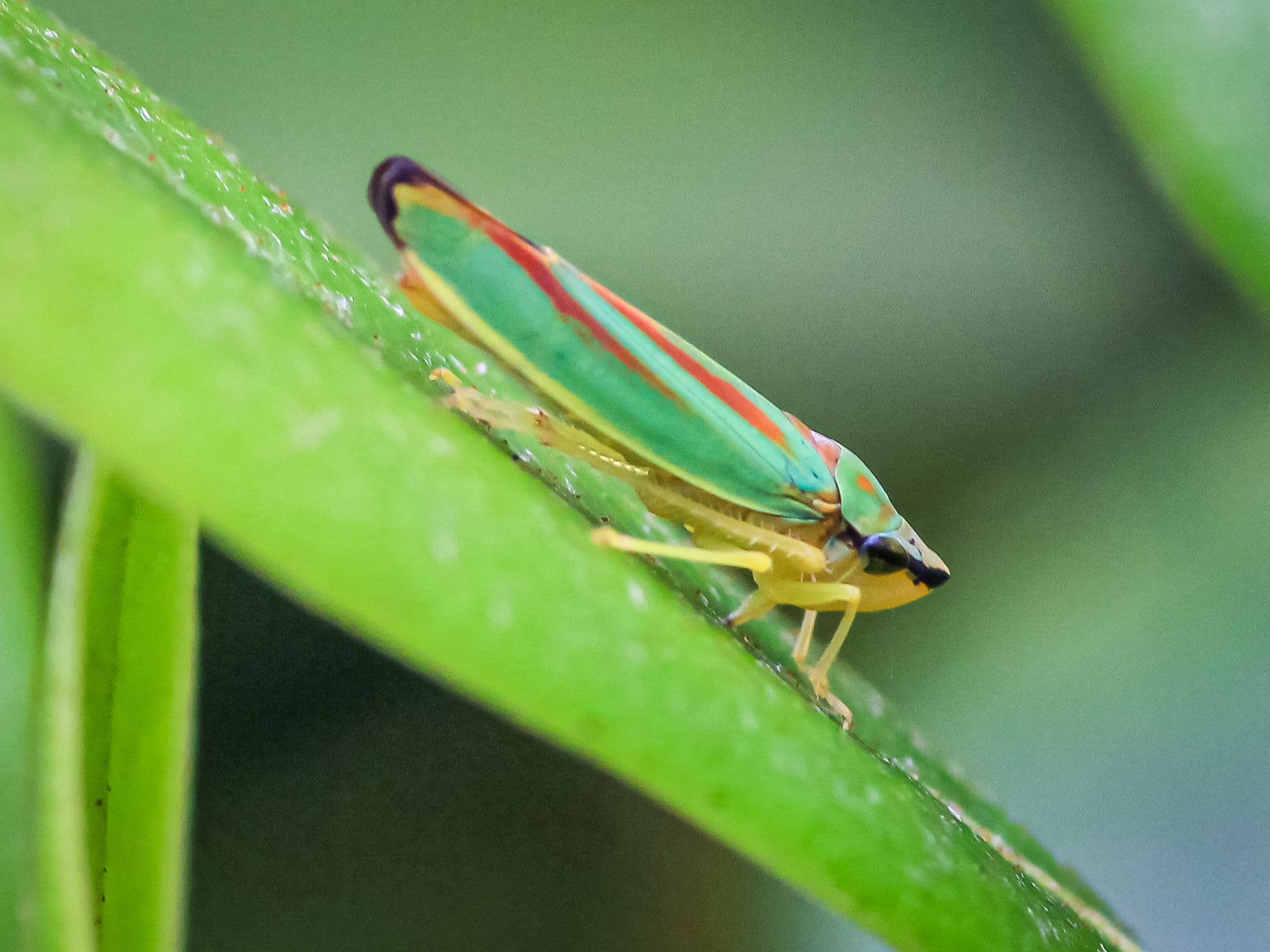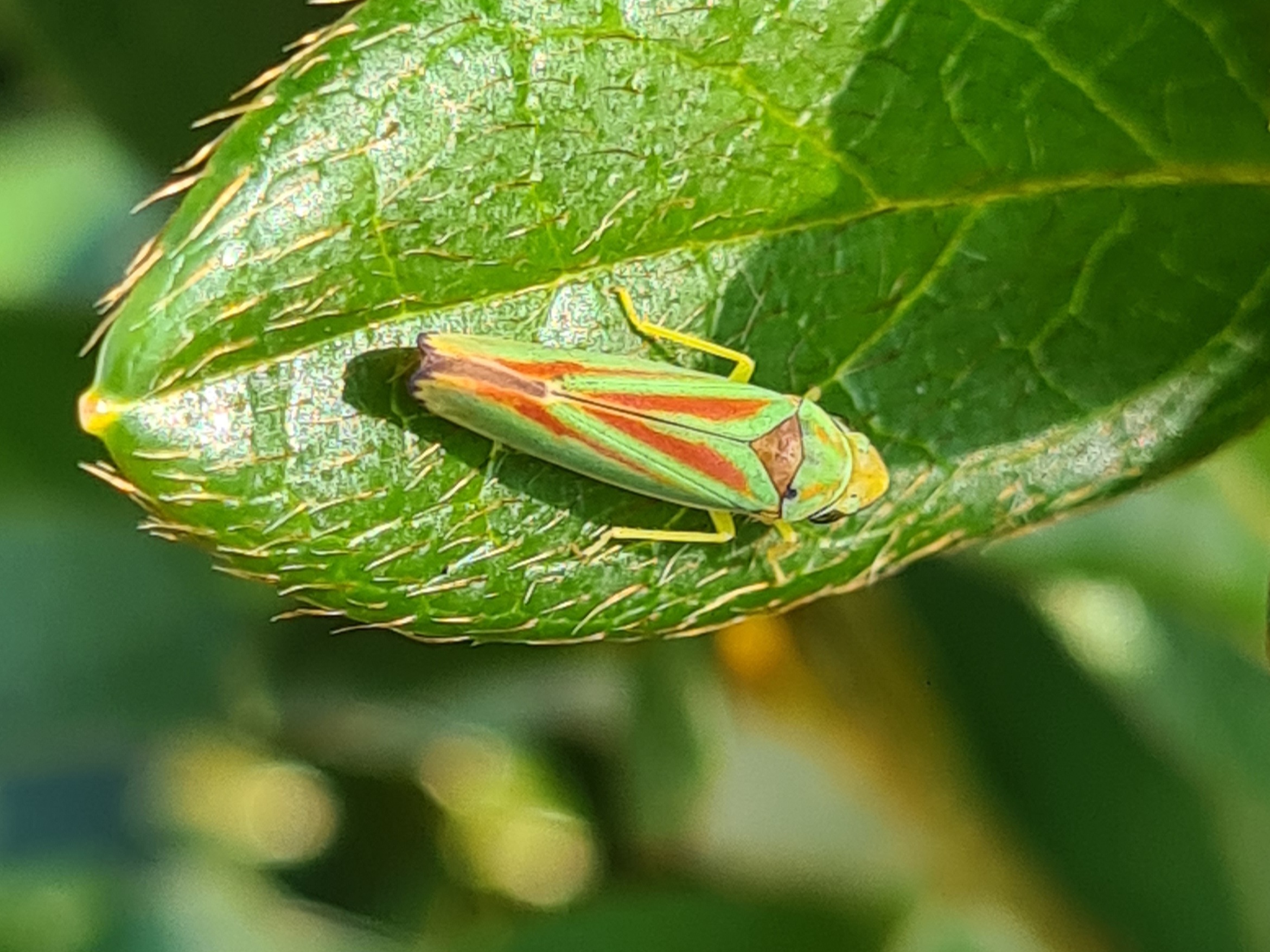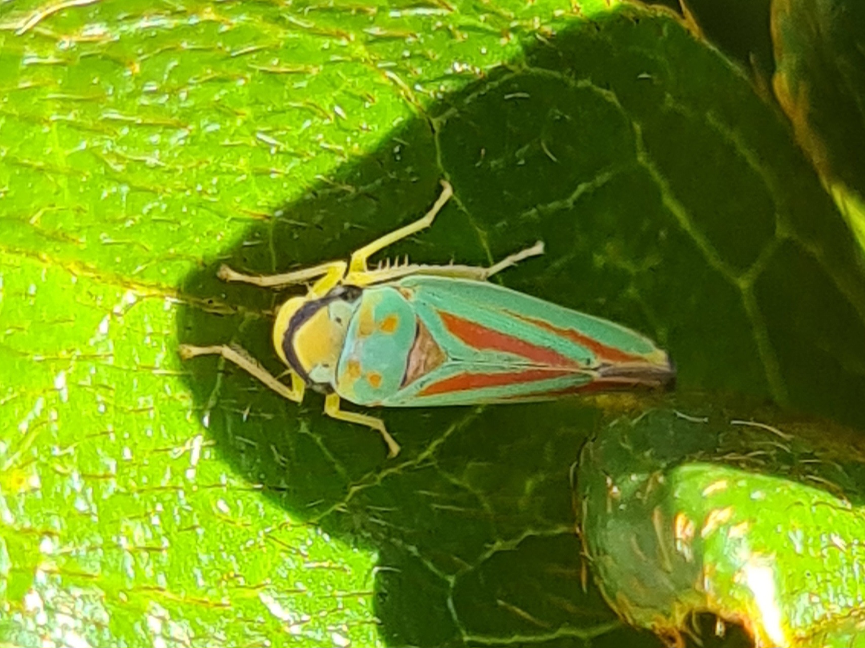 Rhododendronzikade (Graphocephala fennahi Young, 1977), an Rhododendron im Wohngrundstück, 01896 Lichtenberg, Juli 2018.