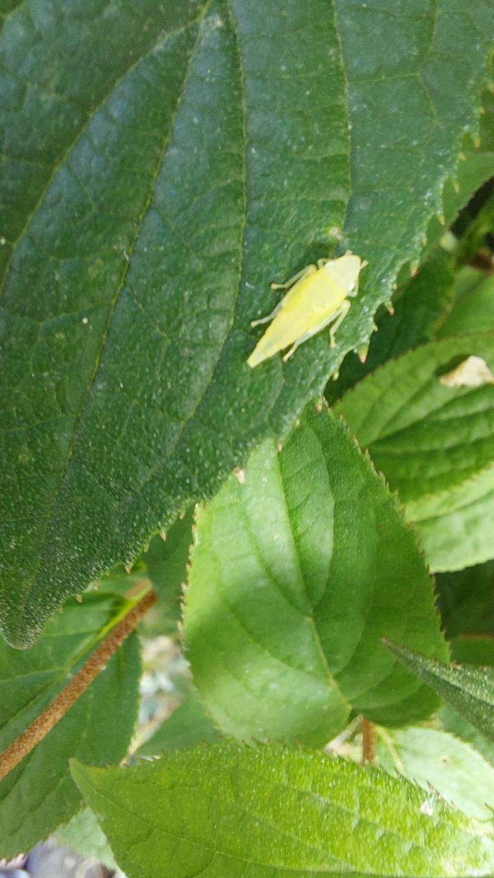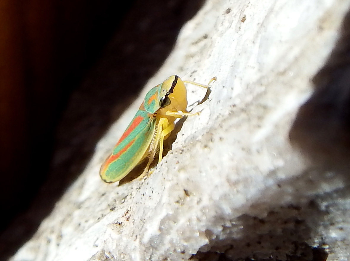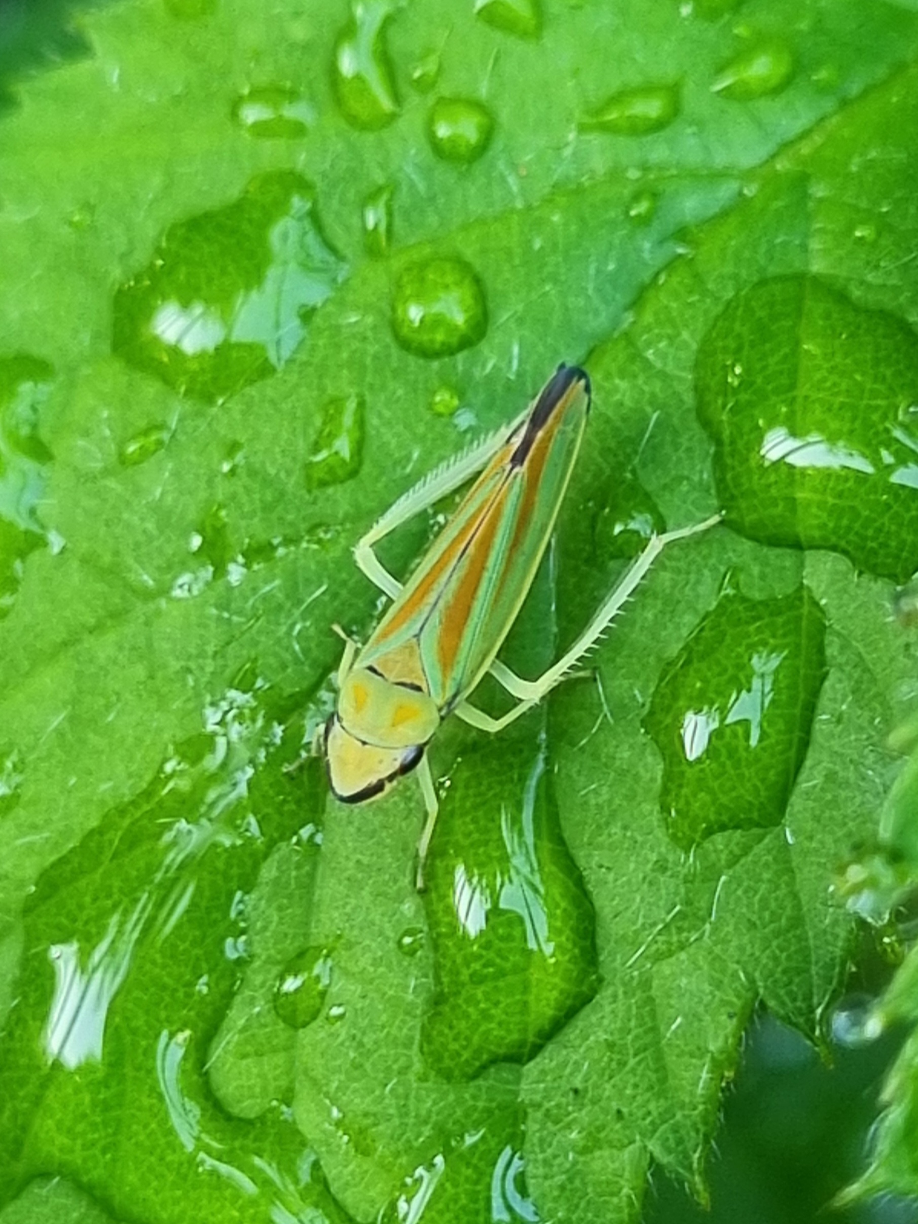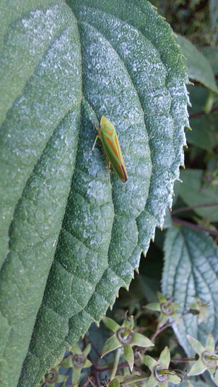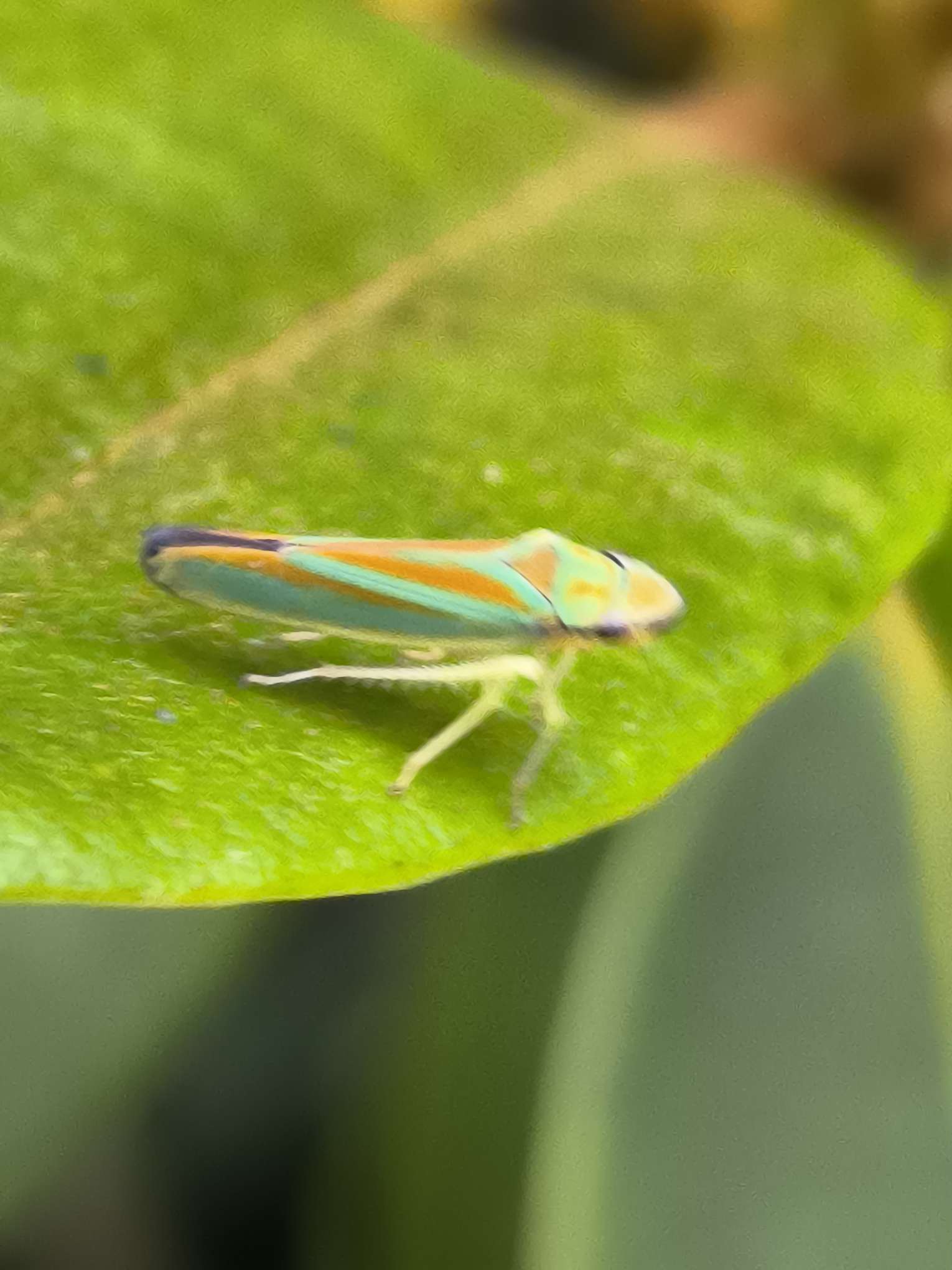 Rhododendronzikade (Graphocephala fennahi Young, 1977), an Rhododendron im Wohngrundstück, 01896 Lichtenberg, Juli 2018.