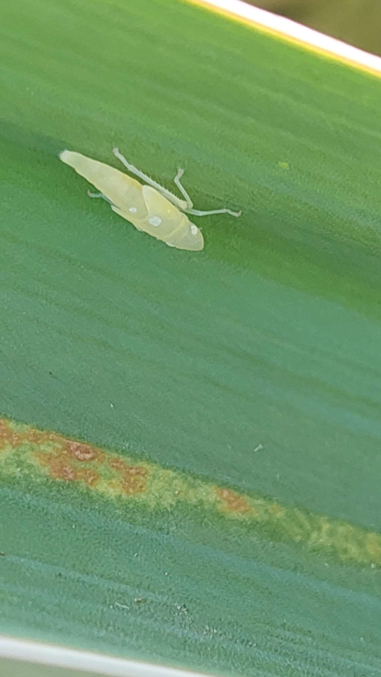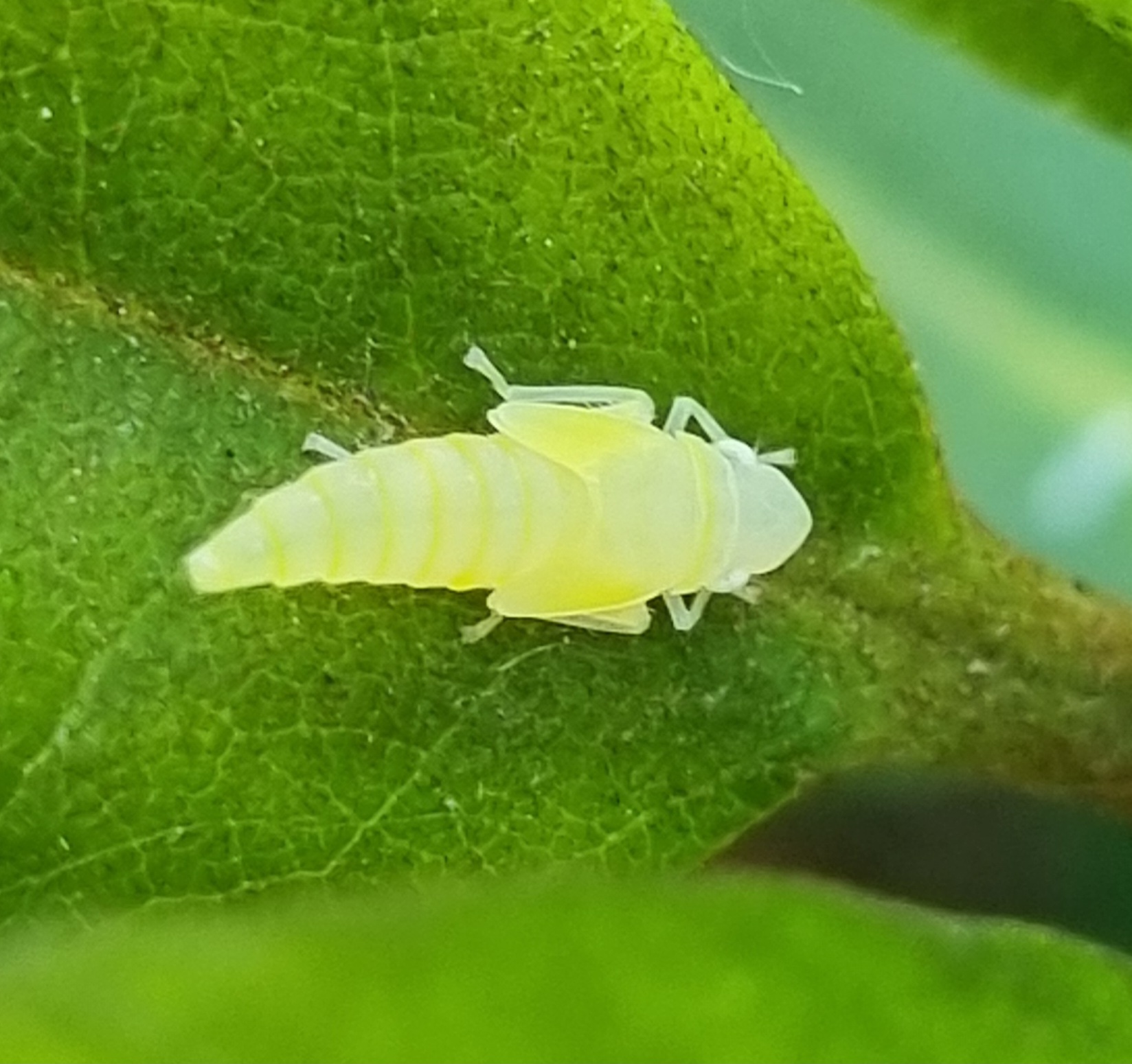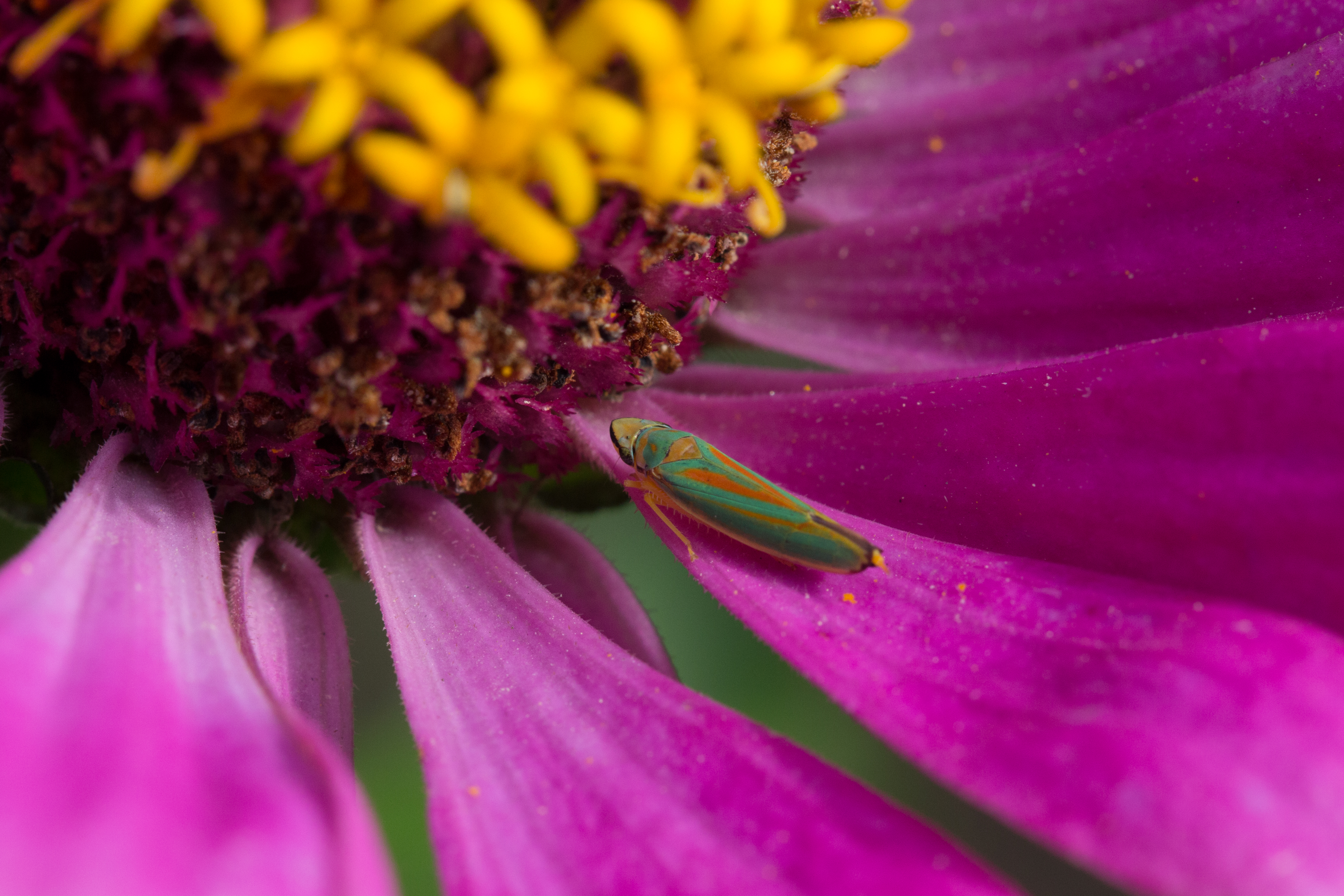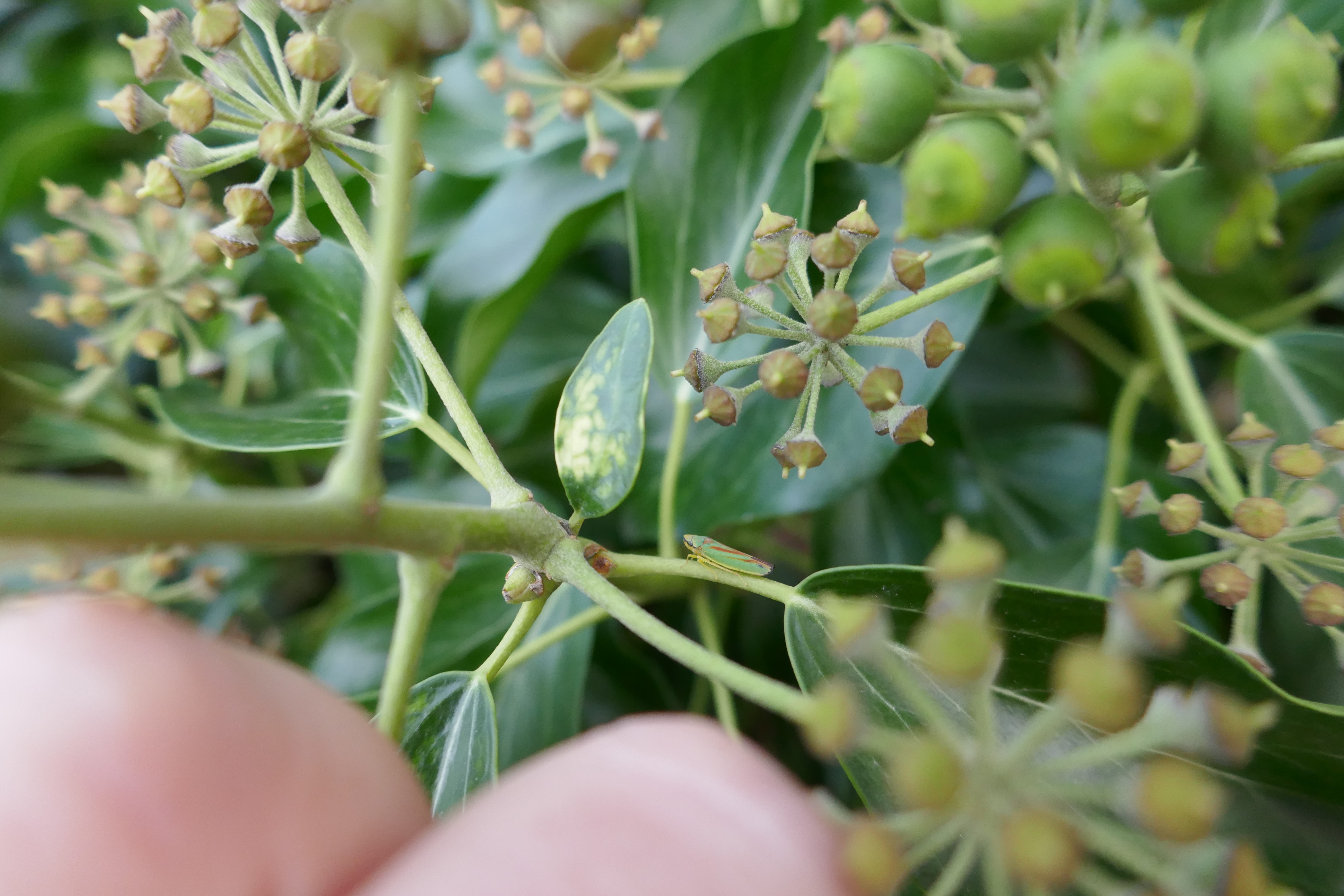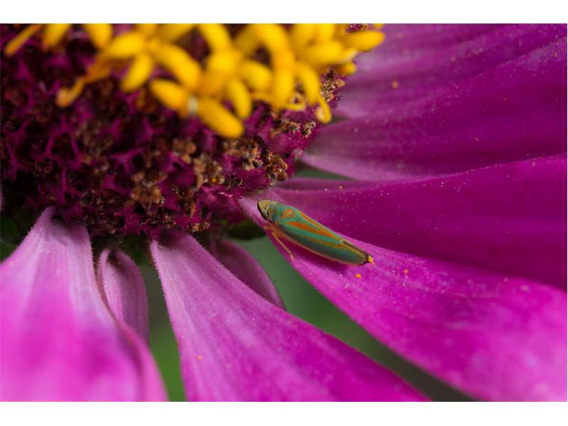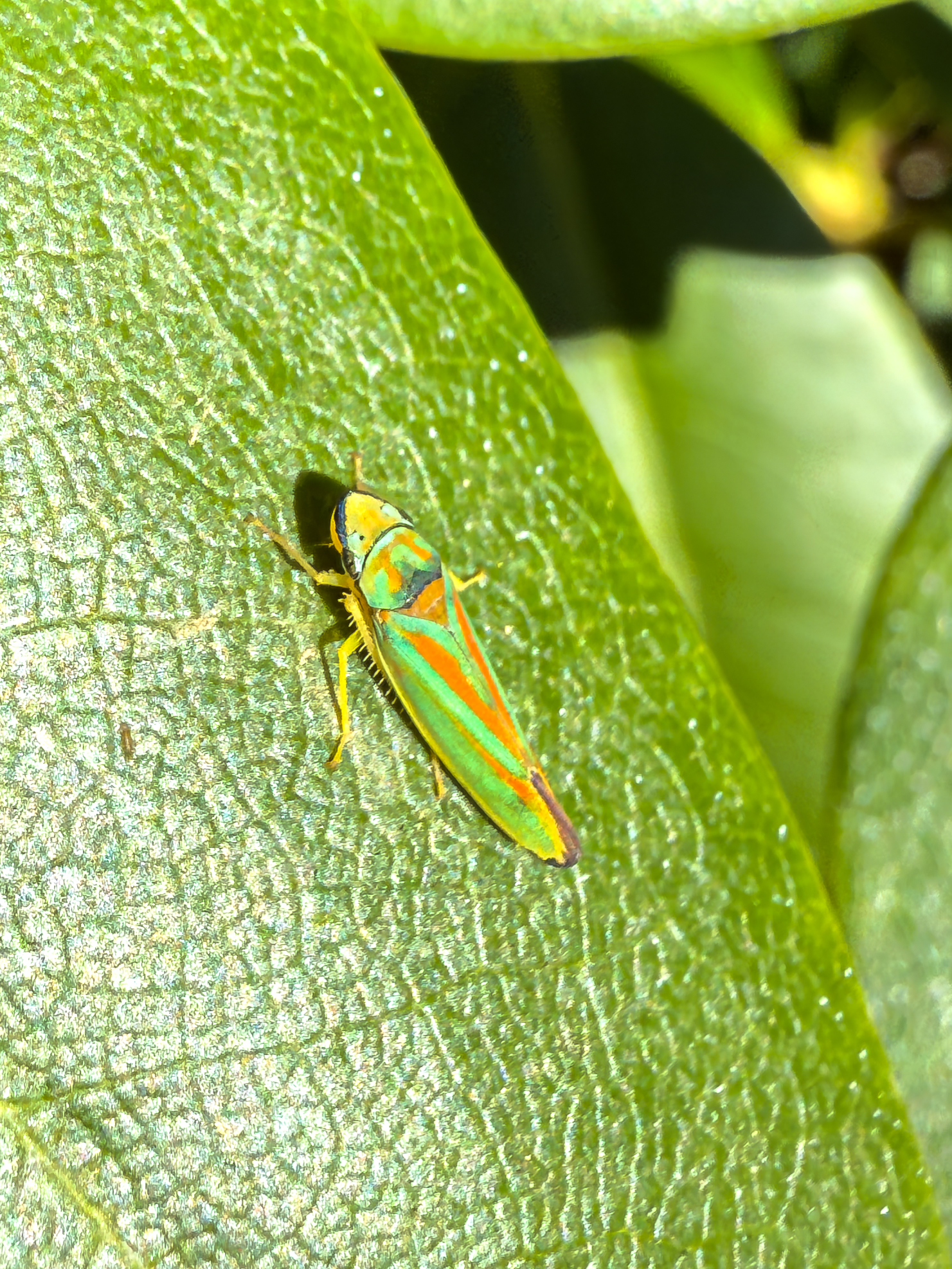 Rhododendronzikade (Graphocephala fennahi Young, 1977), an Rhododendron im Wohngrundstück, 01896 Lichtenberg, Juli 2018.