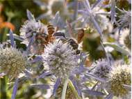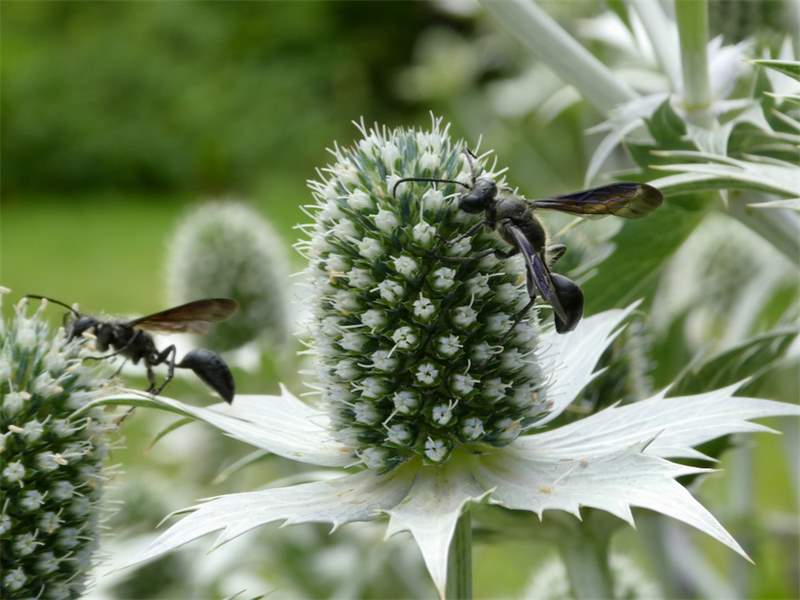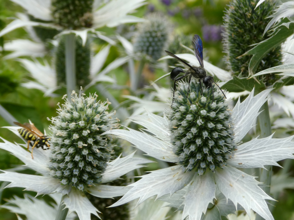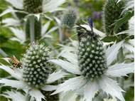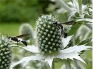 auf Blüten von Eryngium giganteum im Garten in Altrachau, Dresden, Juni 2024