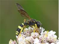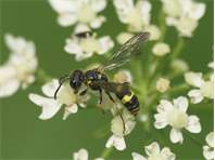 Abdomen: Segmente stark eingeschnürt; erstes Segment knotenförmig; unregelmäßig gelb gebändert: Tergit II basal gelb, Tergit III gelb mit großem schwarzen Fleck in der Mitte; Tergit IV meist weniger gelb als Tergit V.