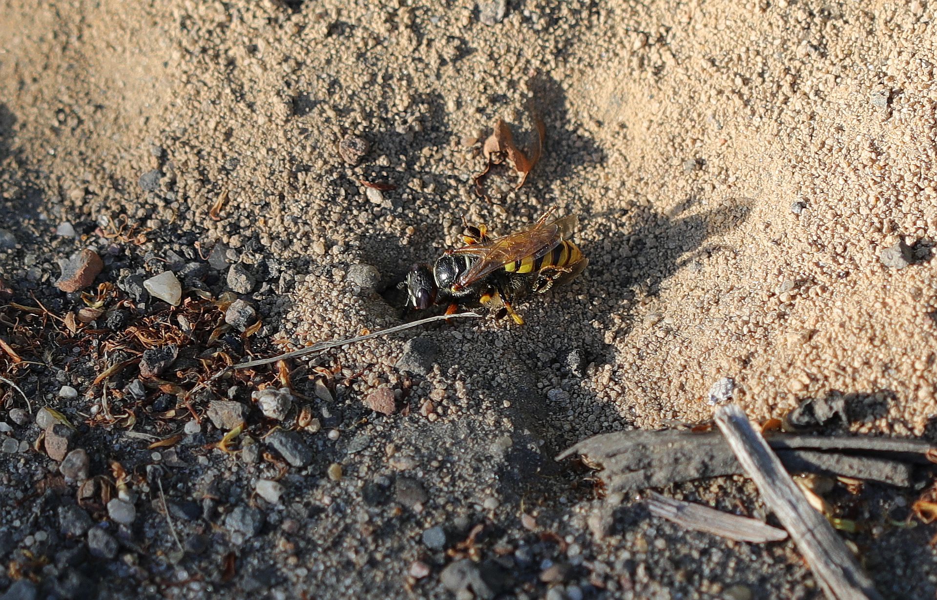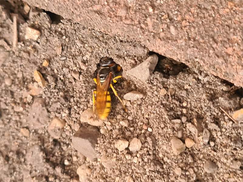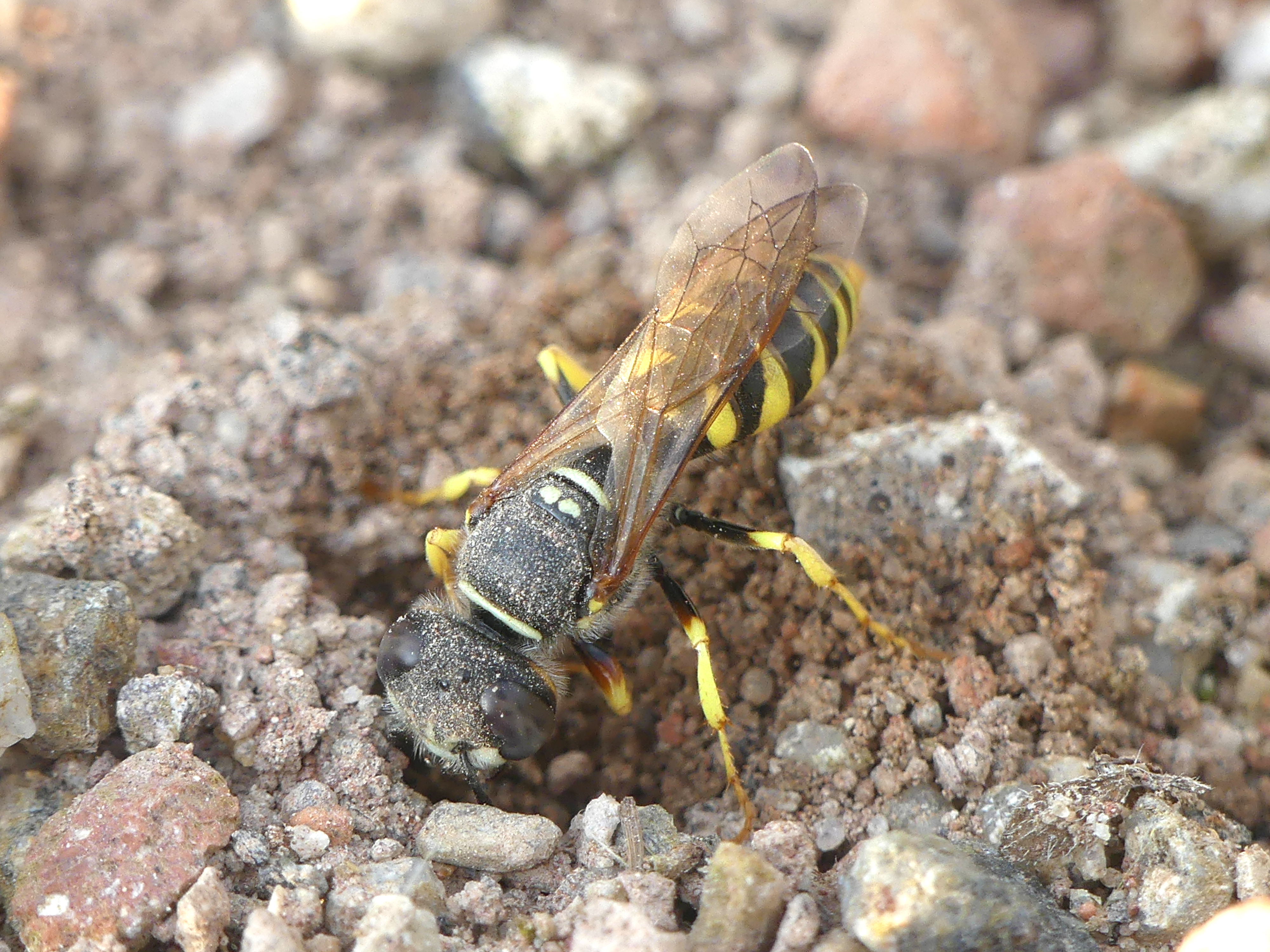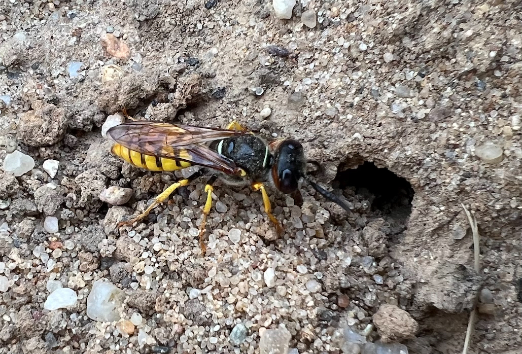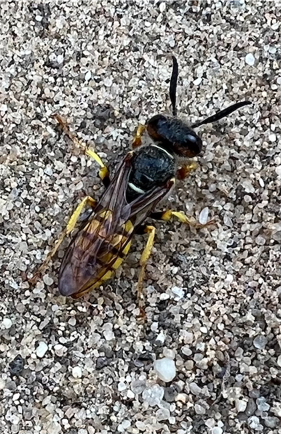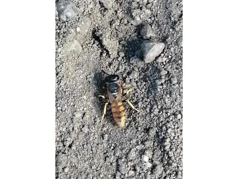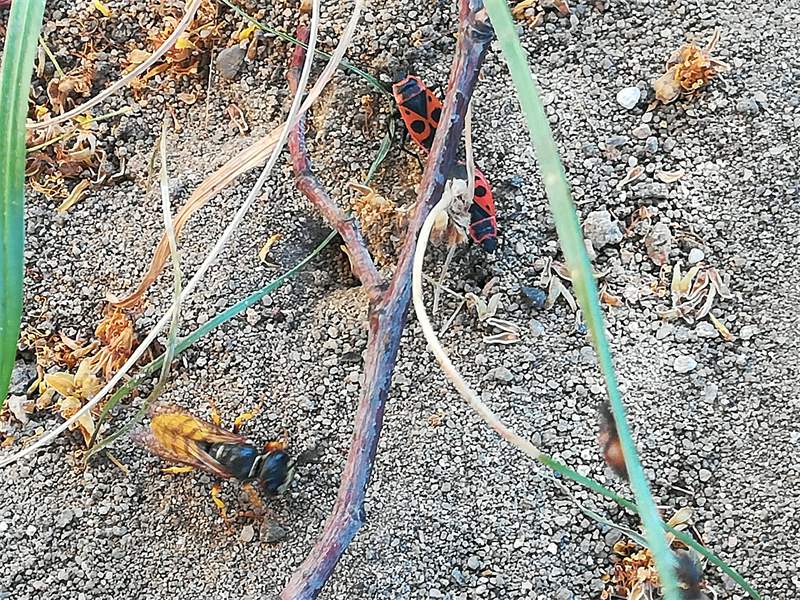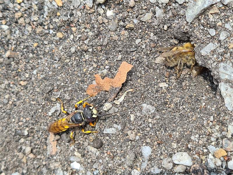 Bienenwolf, Weibchen beim Nestbau auf einem Gehweg, daneben liegt eine tote Honigbiene, Leipzig, Ortsteil Reudnitz-Thonberg, Juli 2009