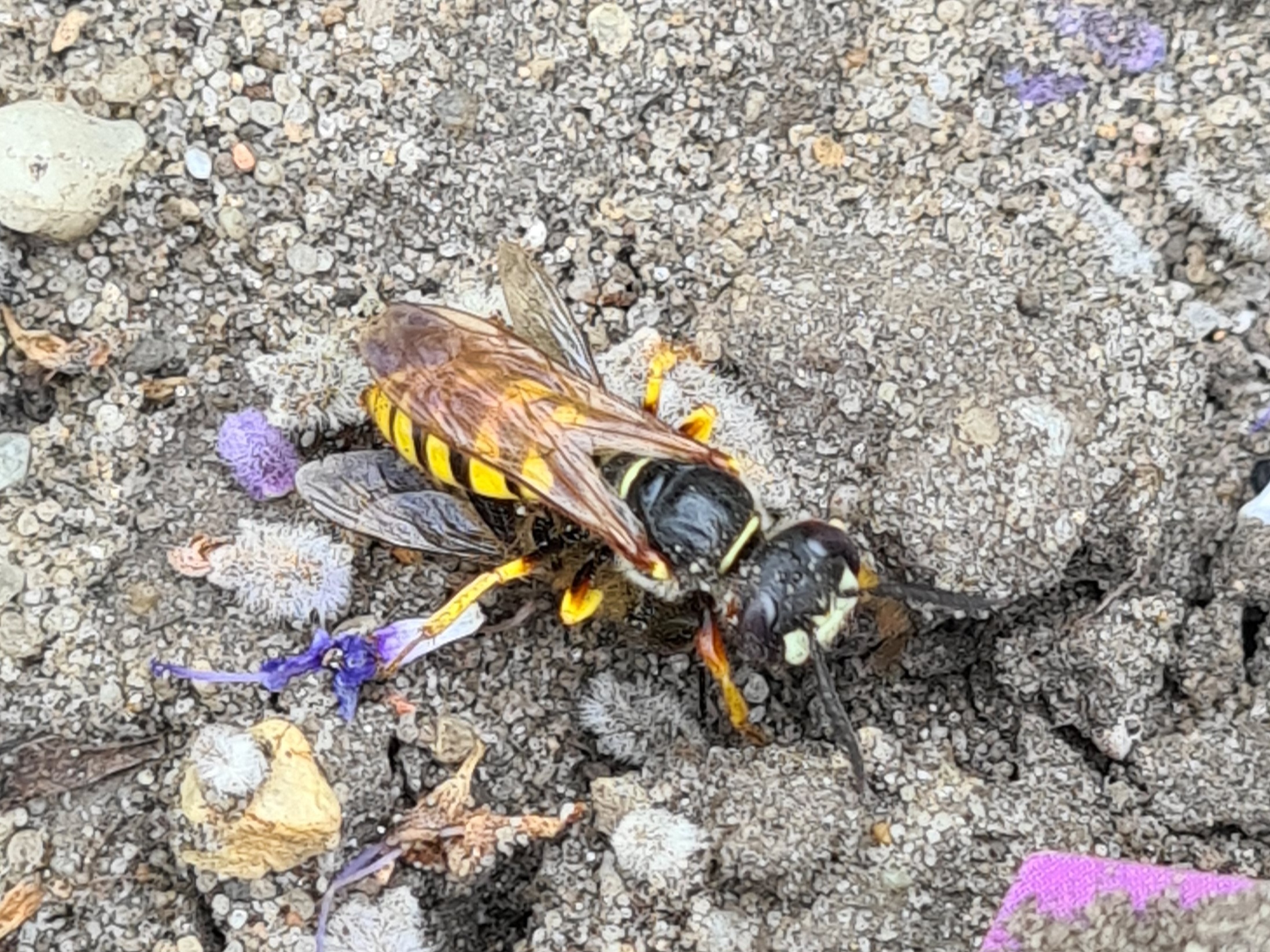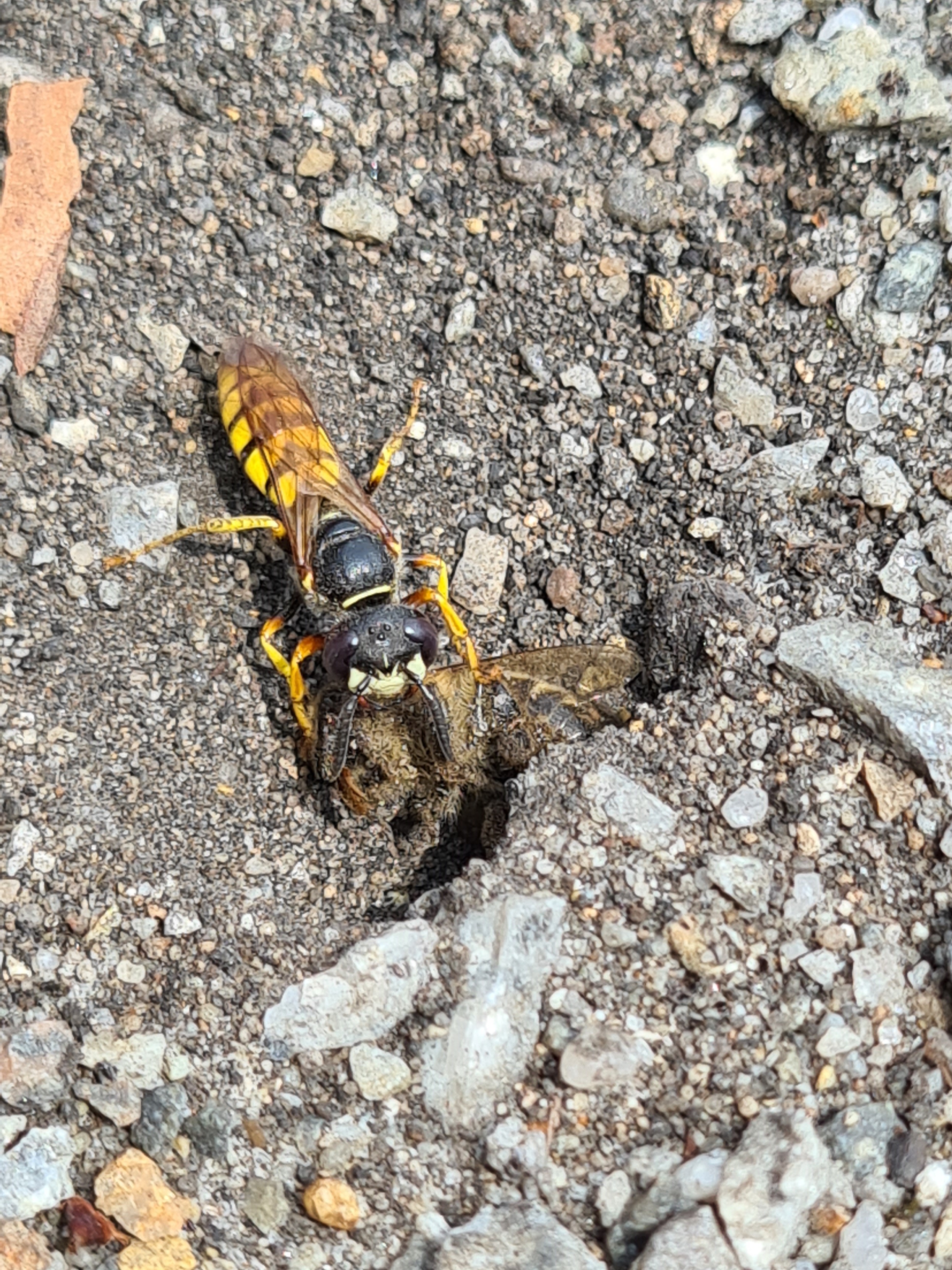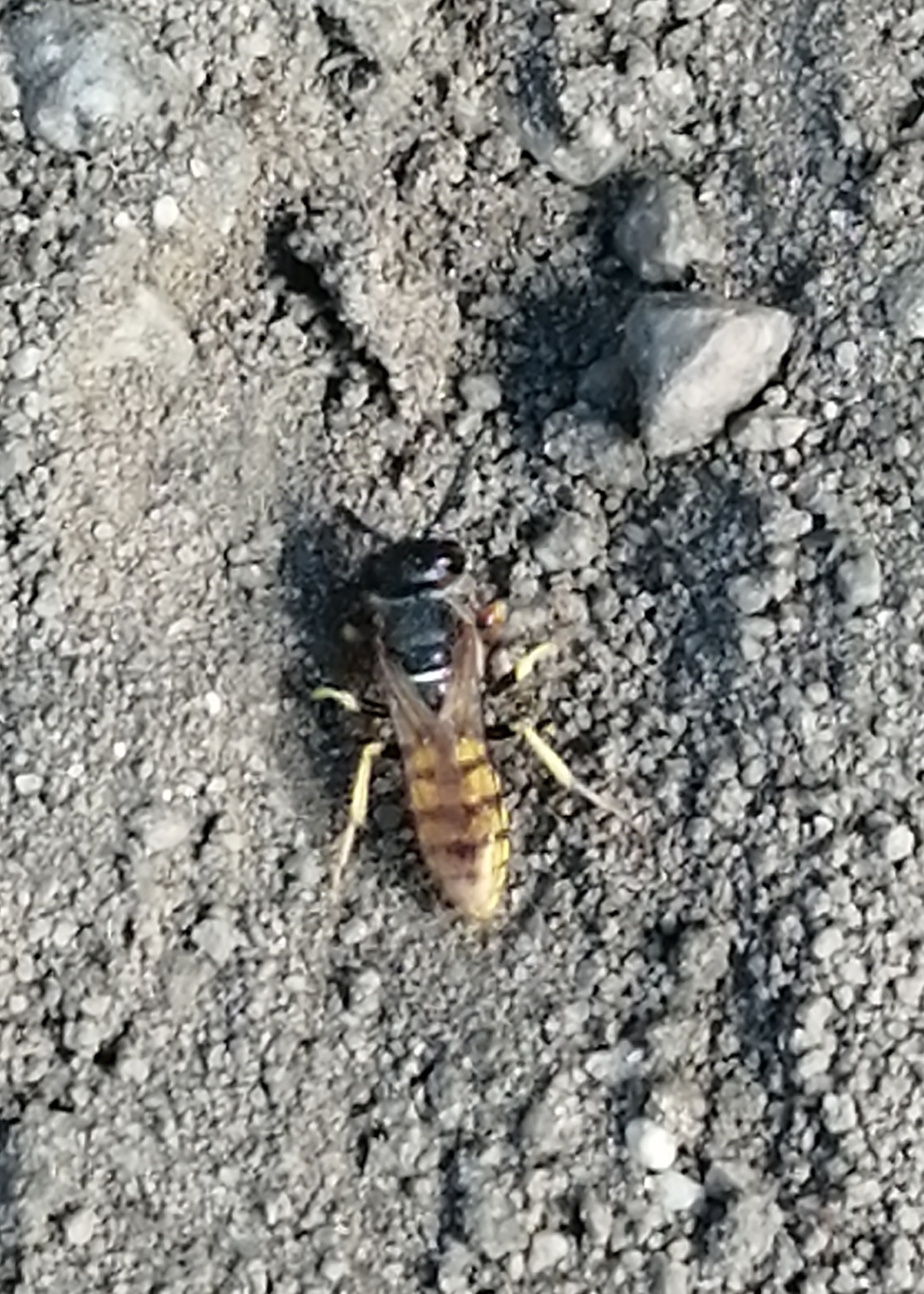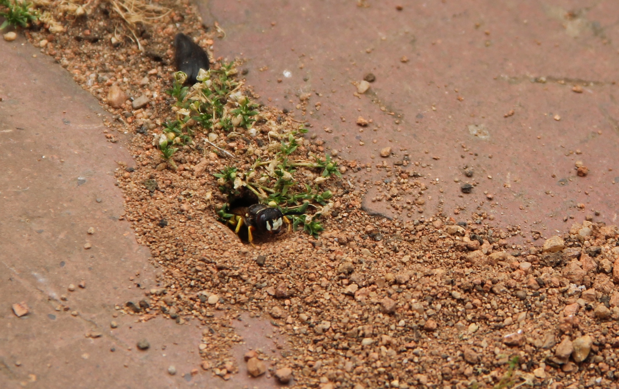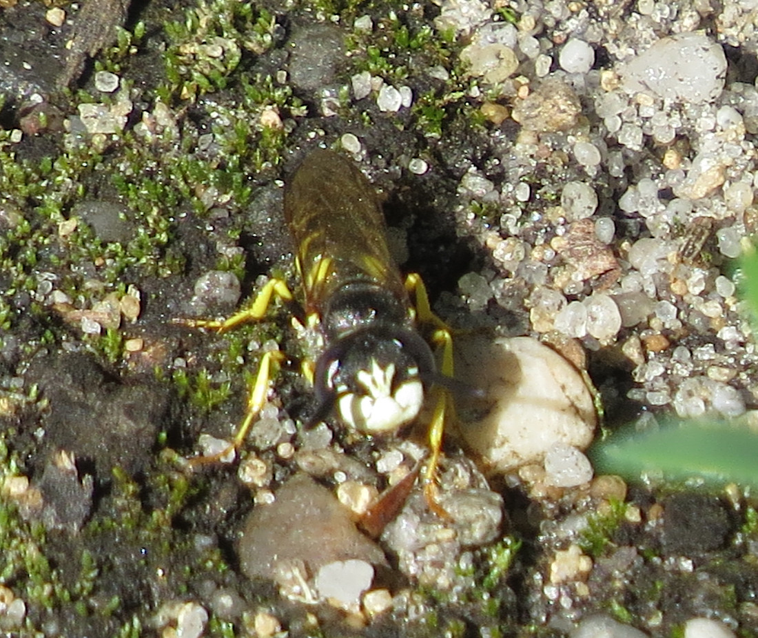 Bienenwolf, Weibchen beim Nestbau auf einem Gehweg, daneben liegt eine tote Honigbiene, Leipzig, Ortsteil Reudnitz-Thonberg, Juli 2009