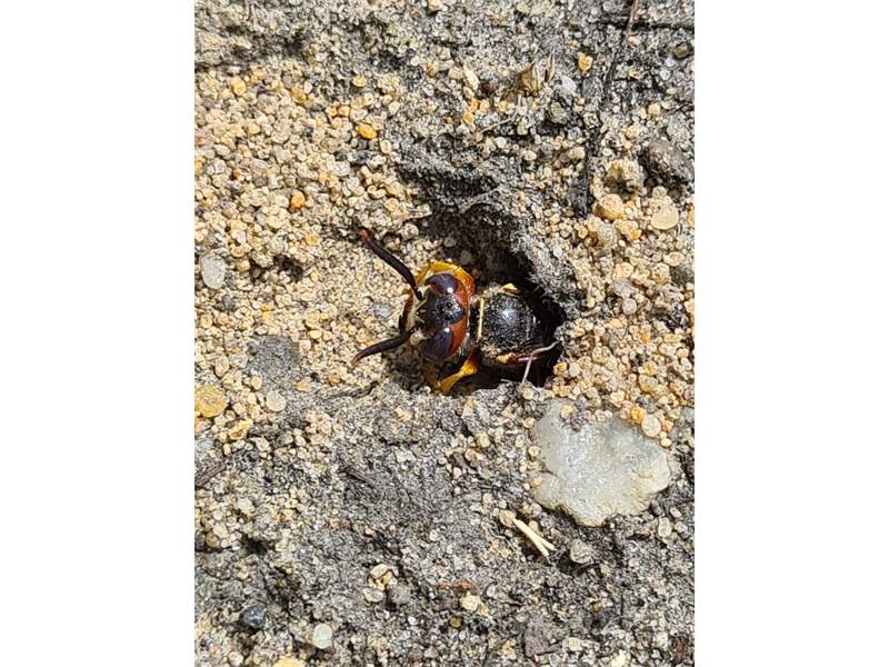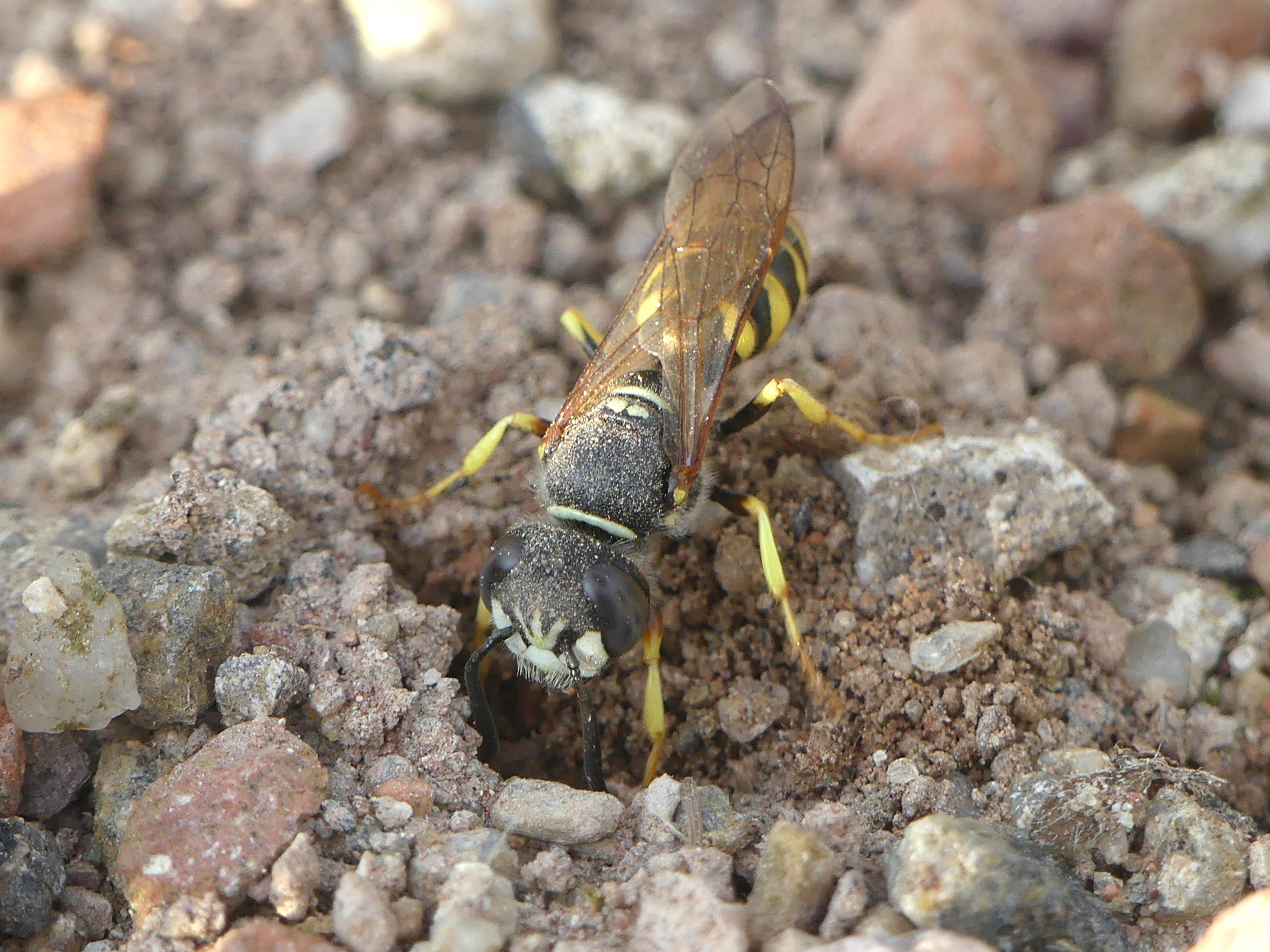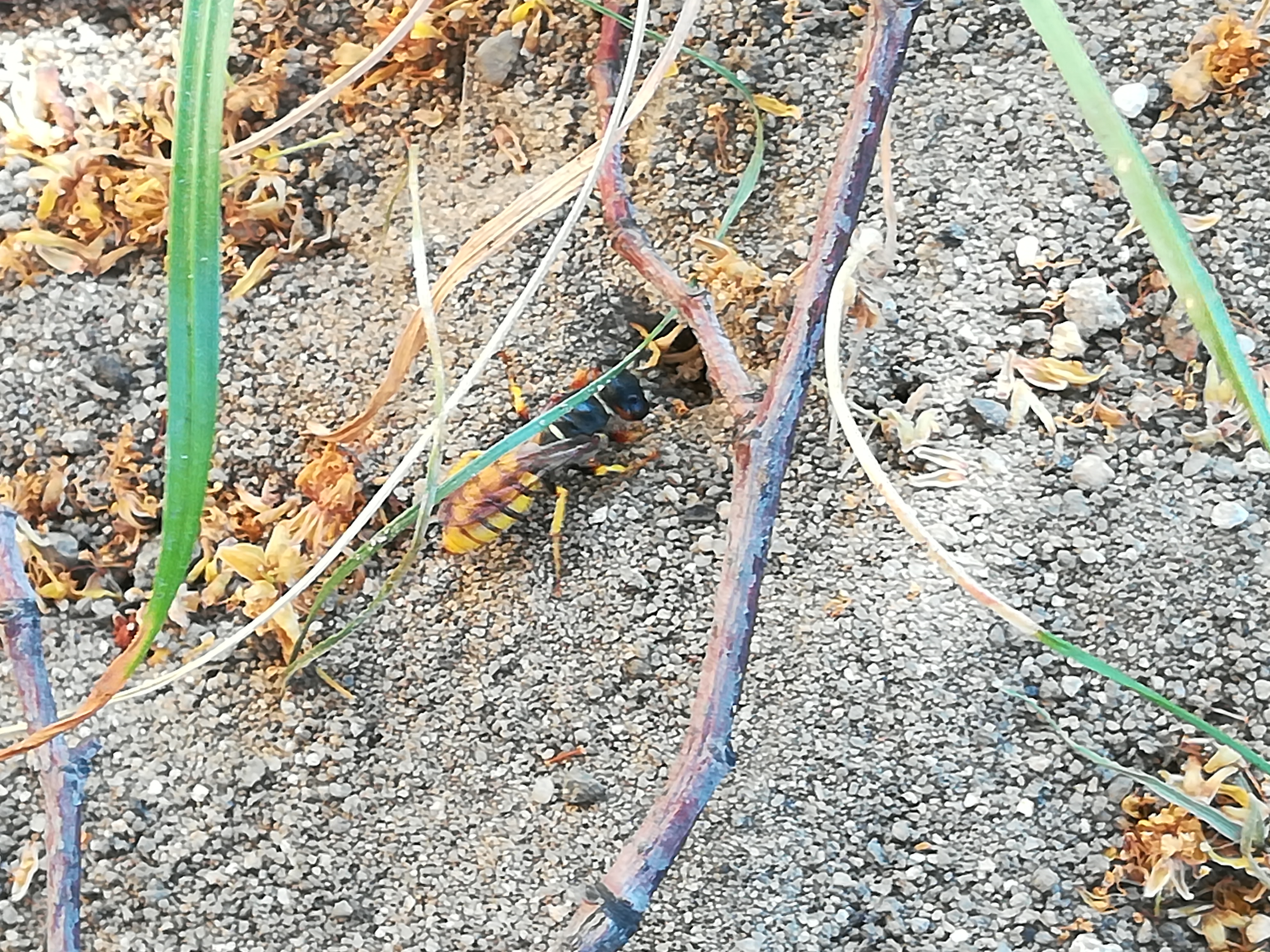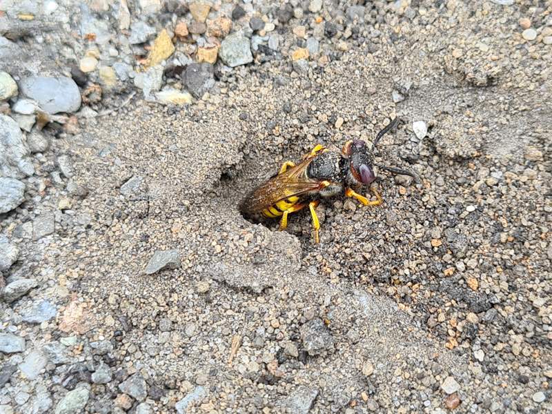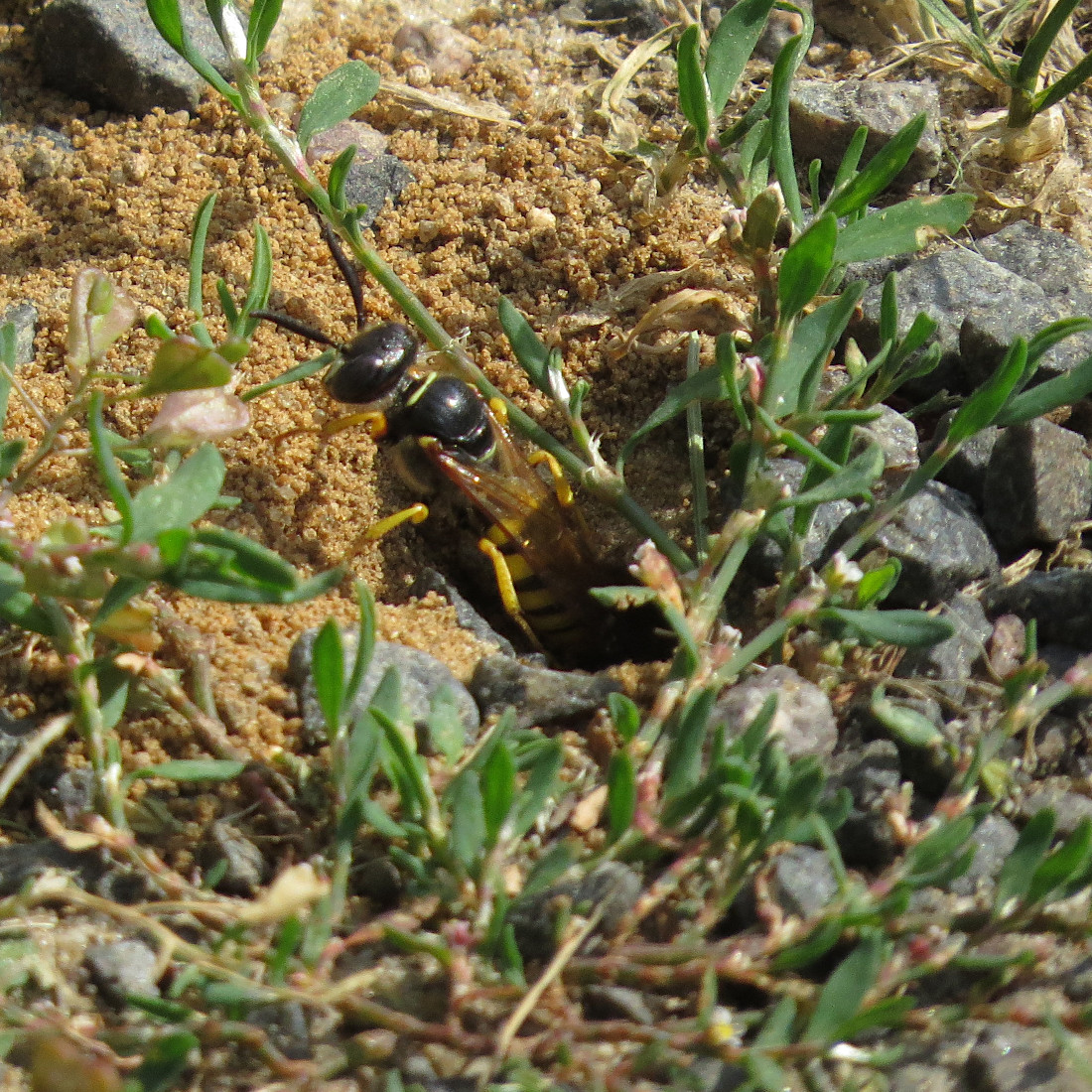Bienenwolf, Weibchen beim Nestbau auf einem Gehweg, daneben liegt eine tote Honigbiene, Leipzig, Ortsteil Reudnitz-Thonberg, Juli 2009