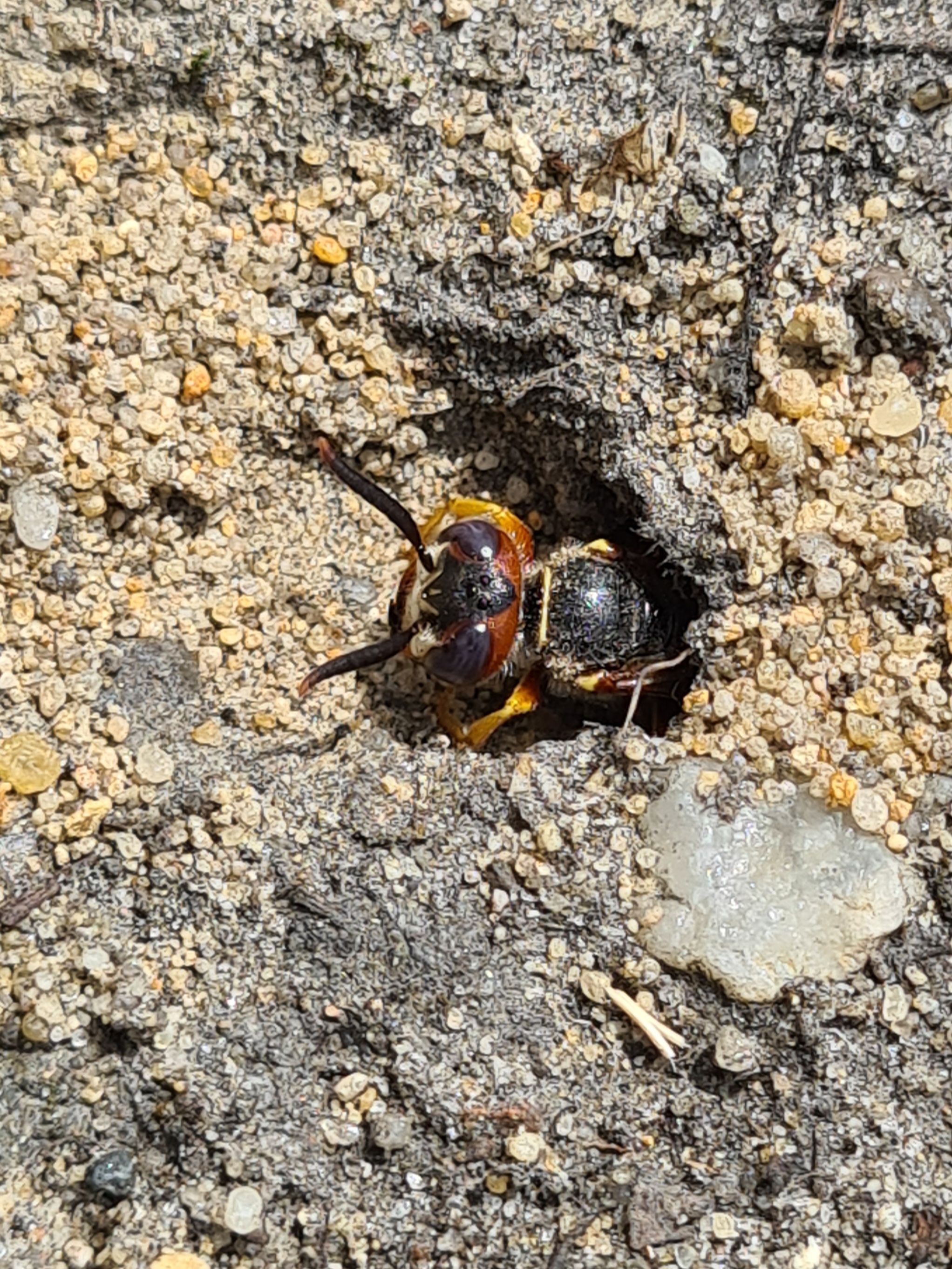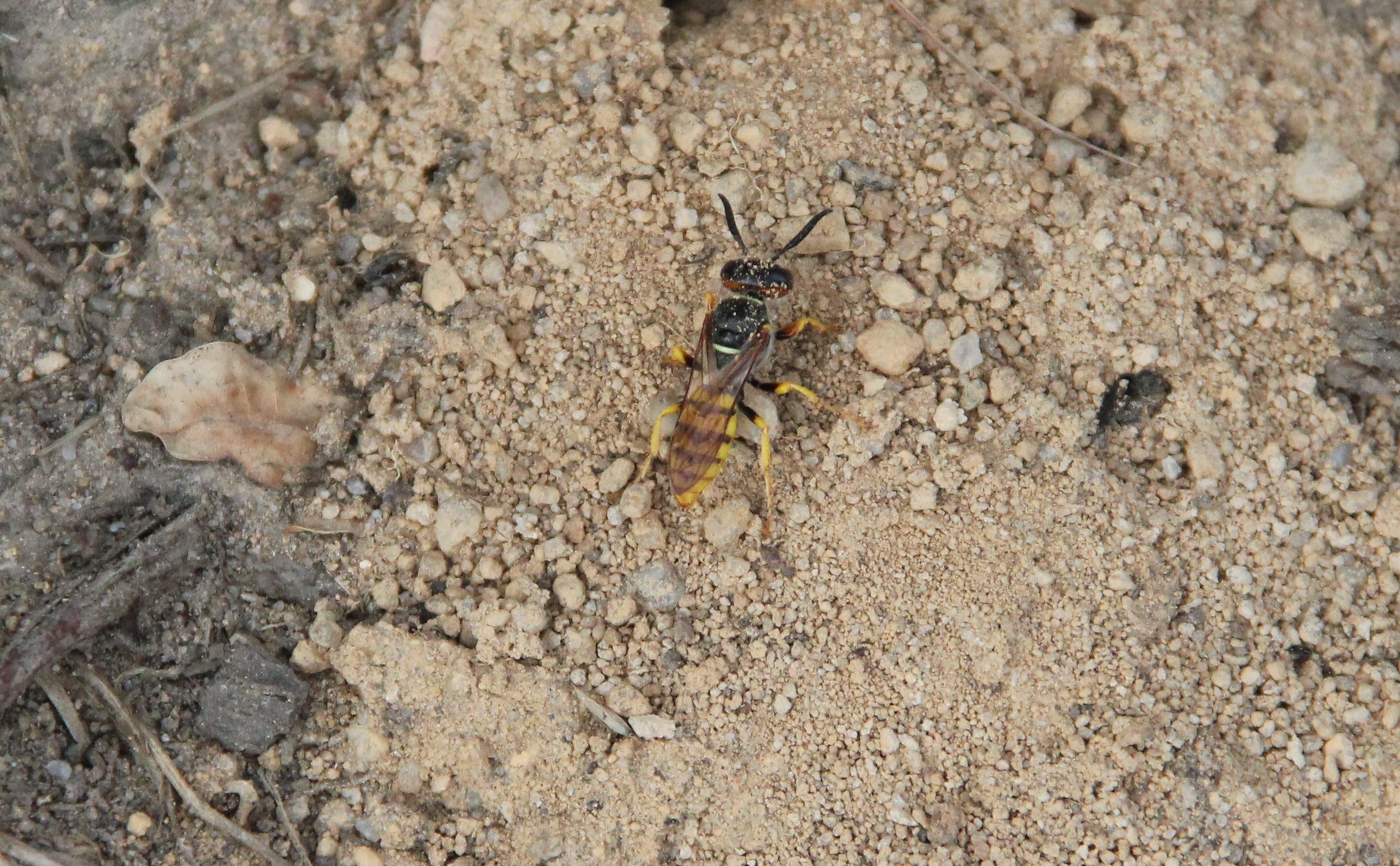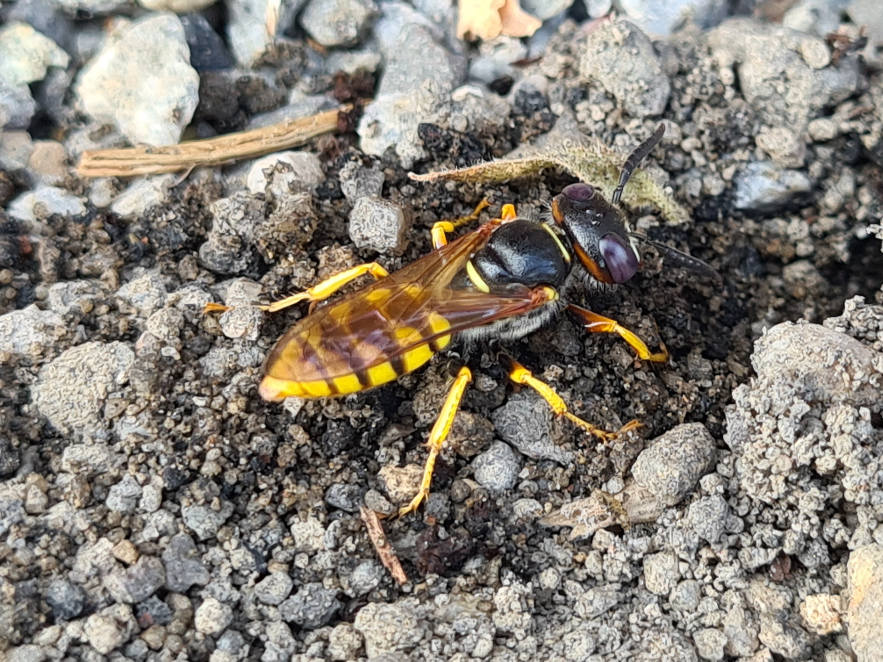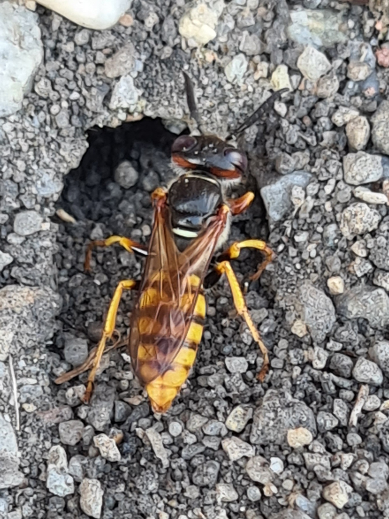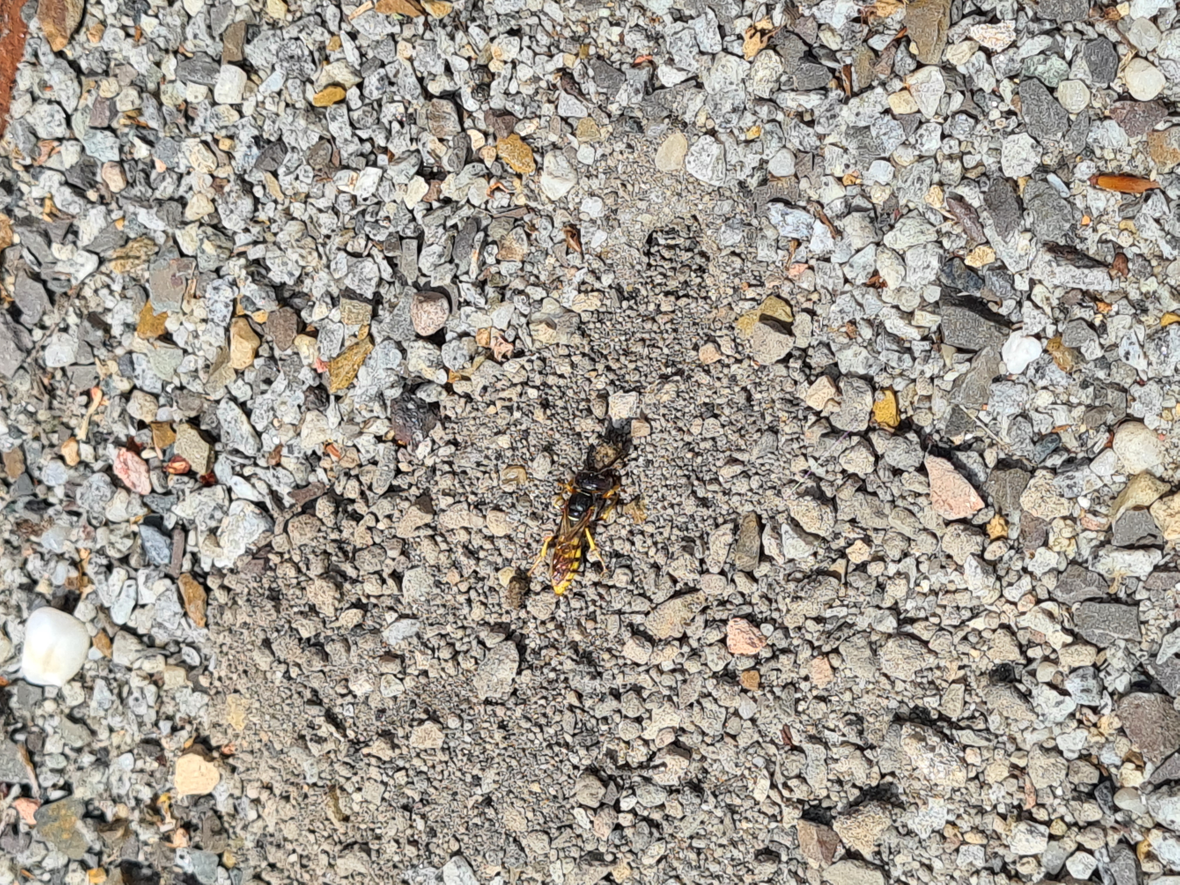 Bienenwolf, Weibchen beim Nestbau auf einem Gehweg, daneben liegt eine tote Honigbiene, Leipzig, Ortsteil Reudnitz-Thonberg, Juli 2009