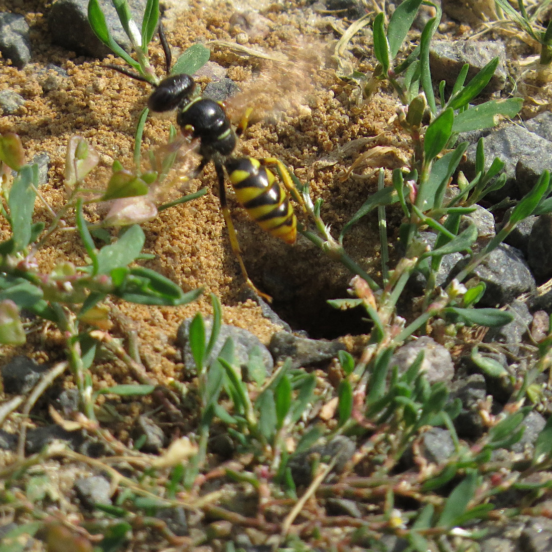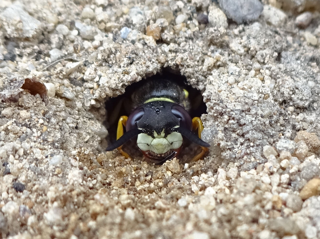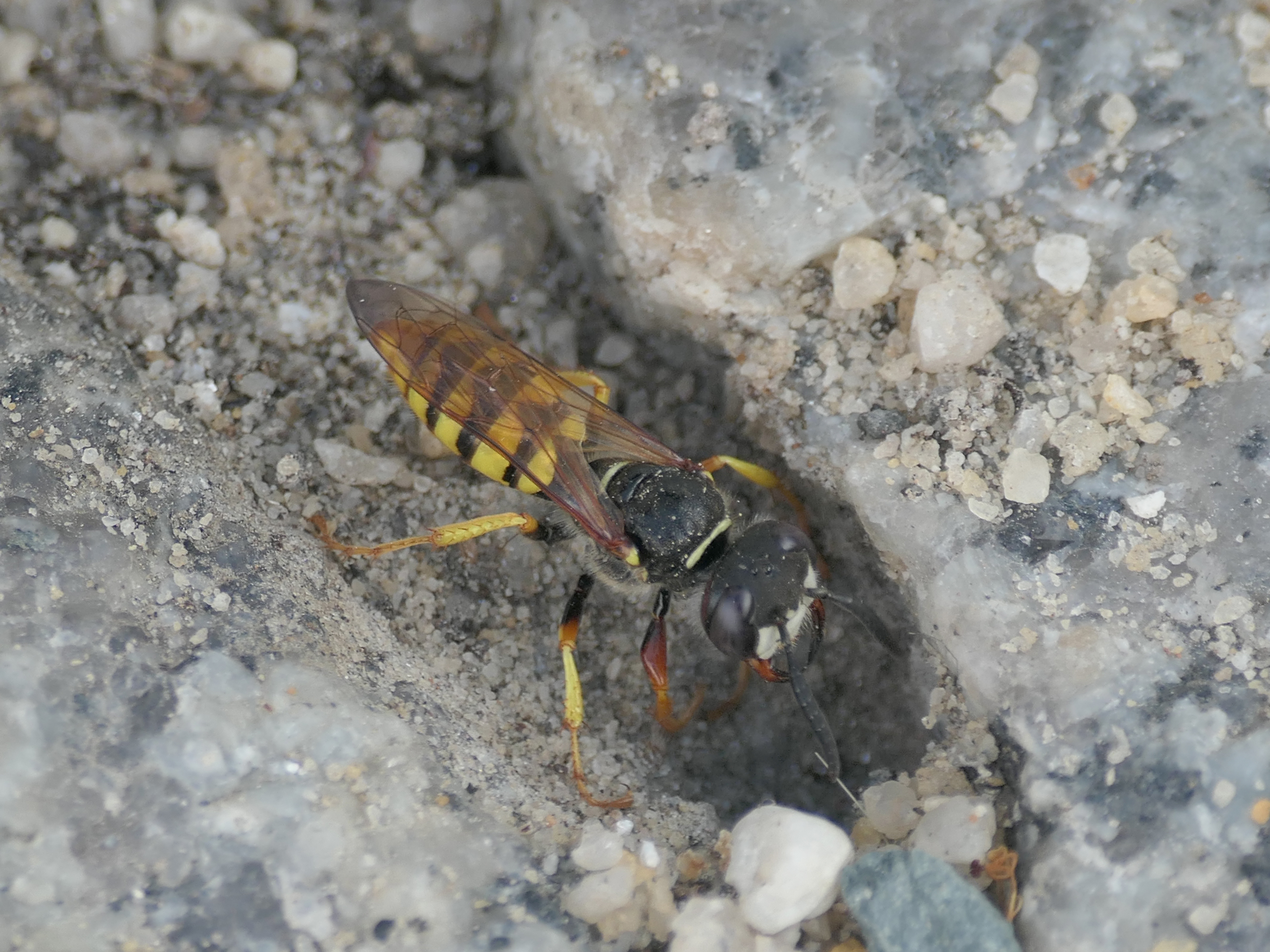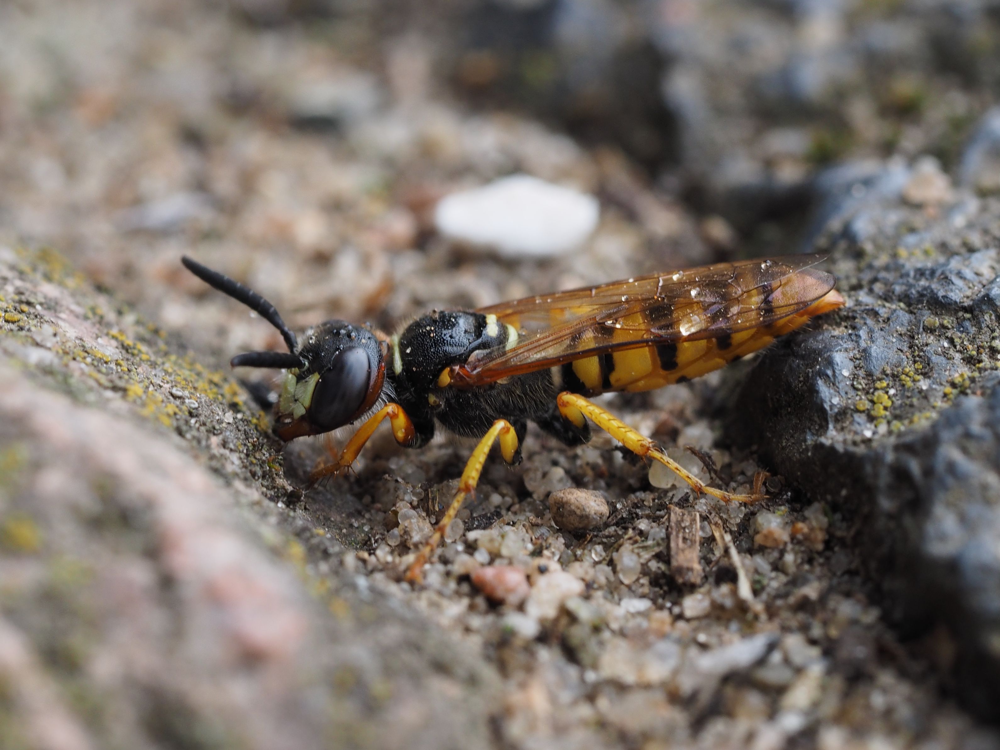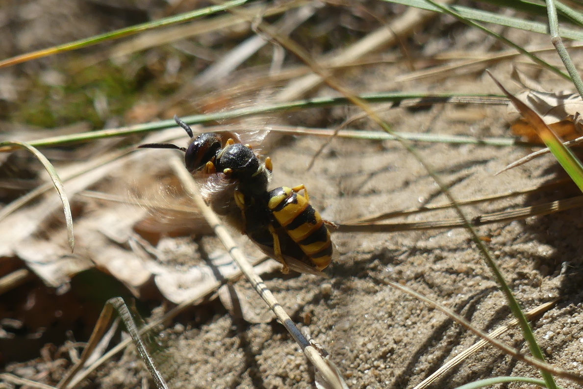 Bienenwolf, Weibchen beim Nestbau auf einem Gehweg, daneben liegt eine tote Honigbiene, Leipzig, Ortsteil Reudnitz-Thonberg, Juli 2009