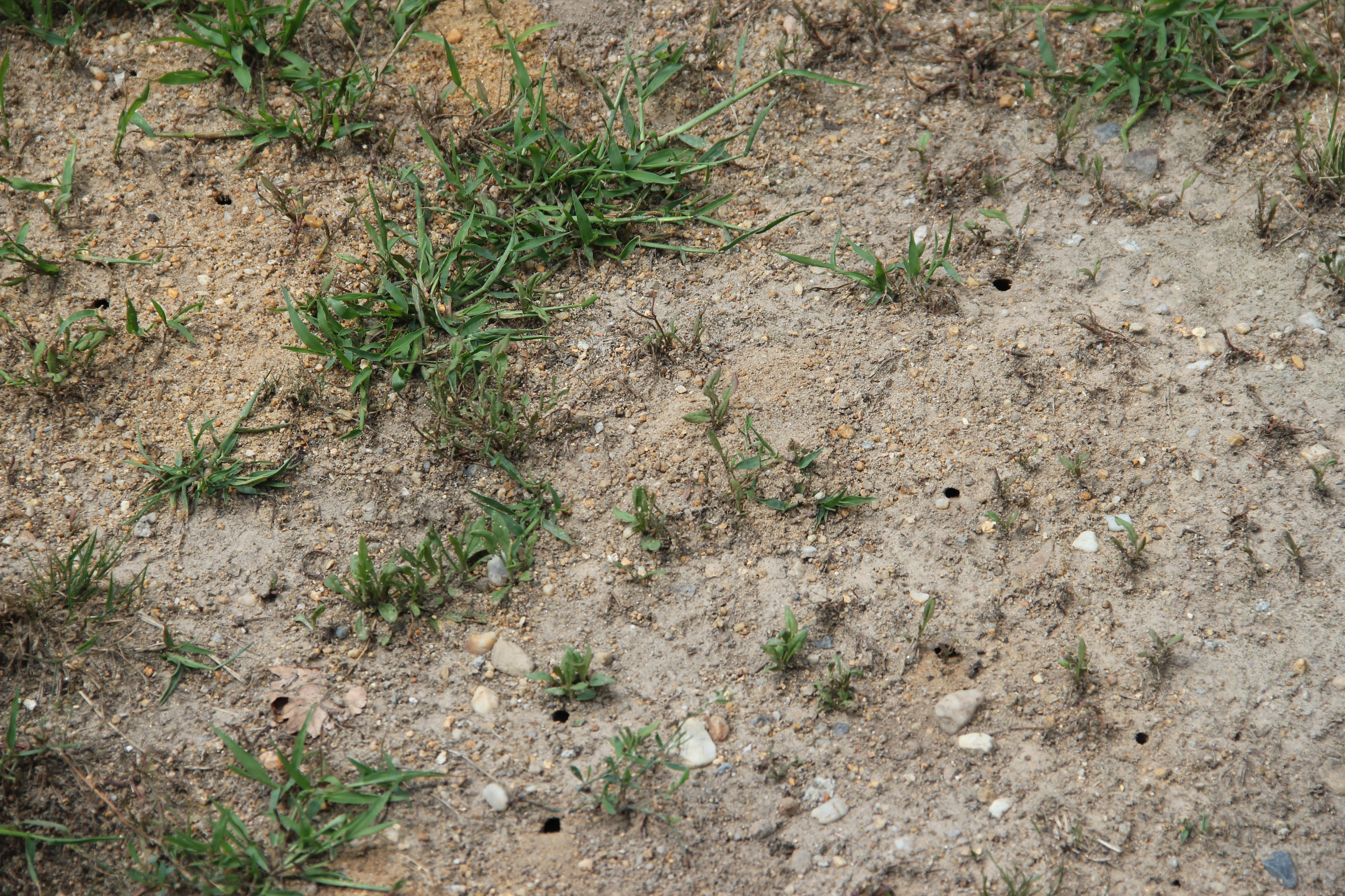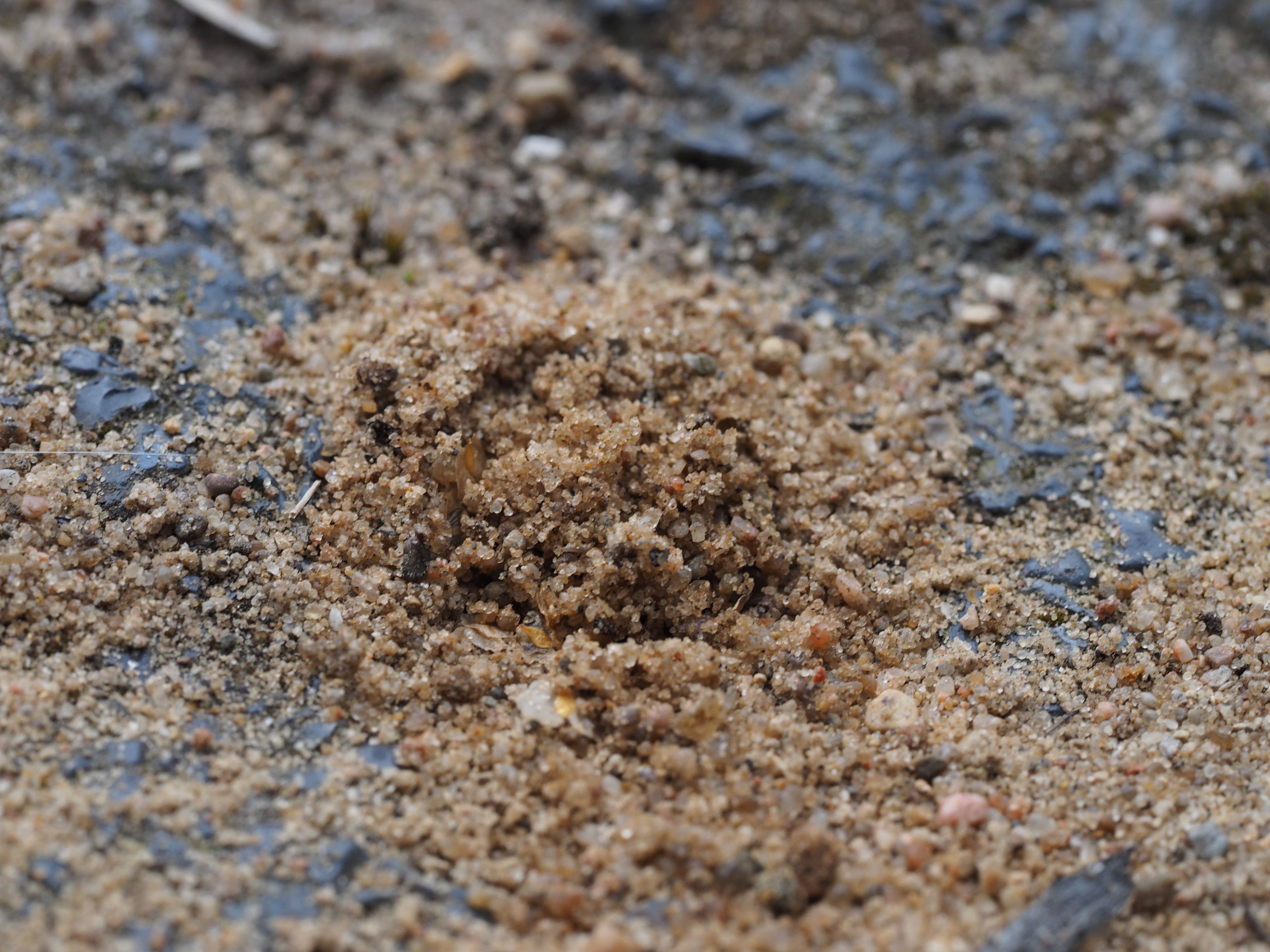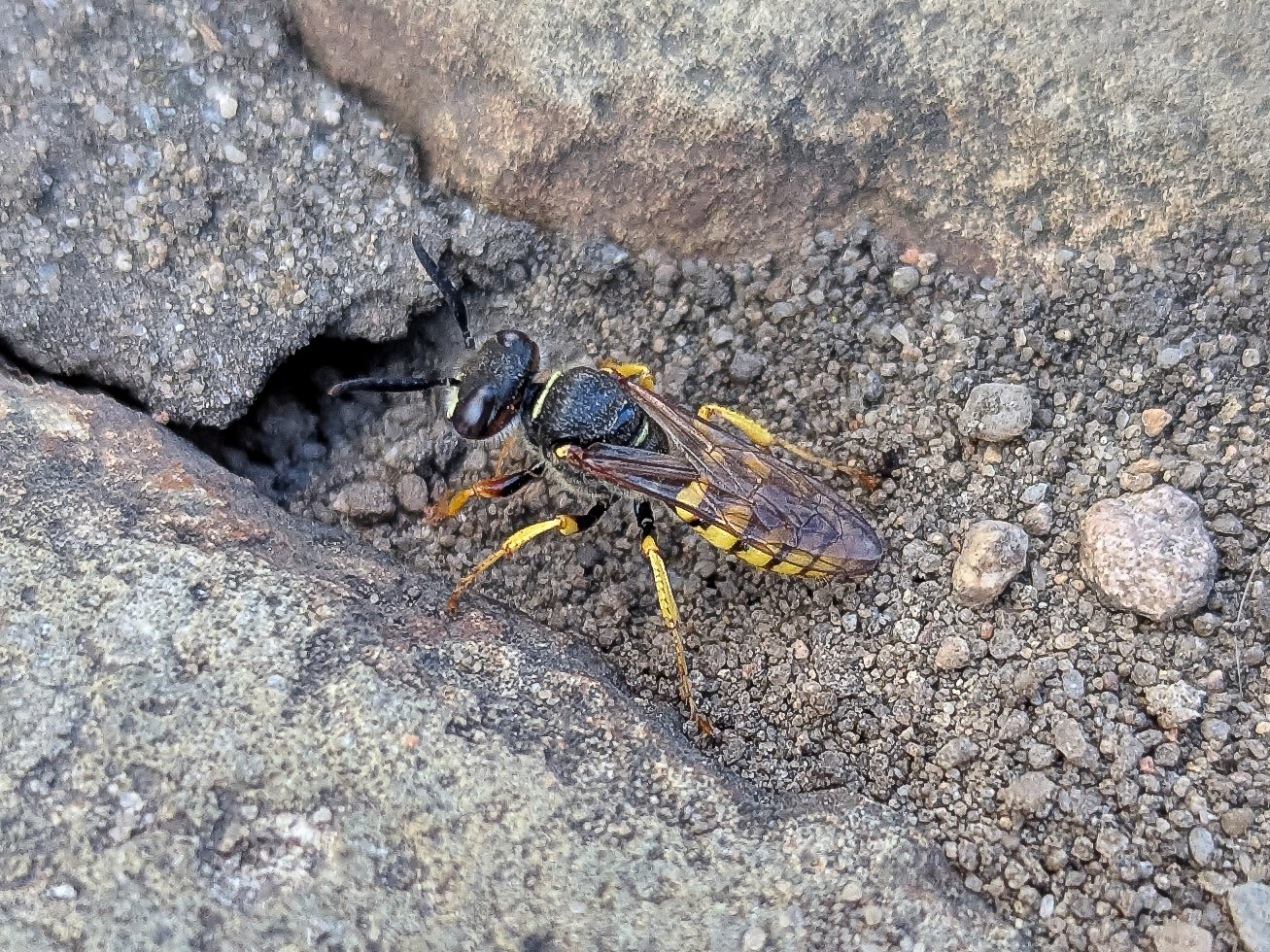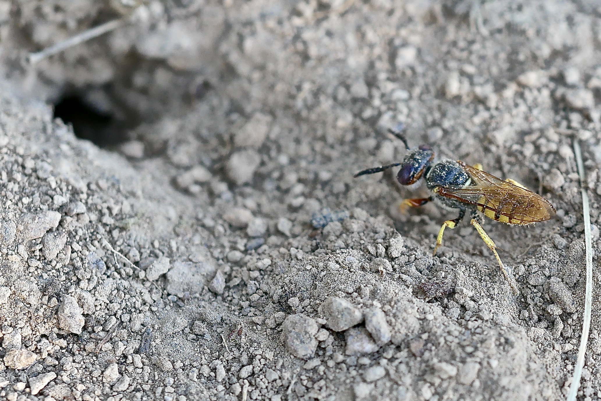 Bienenwolf, Weibchen beim Nestbau auf einem Gehweg, daneben liegt eine tote Honigbiene, Leipzig, Ortsteil Reudnitz-Thonberg, Juli 2009