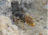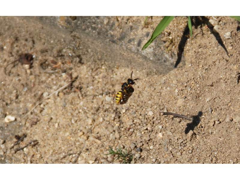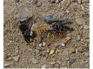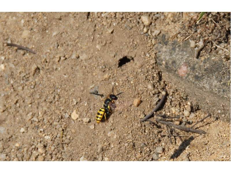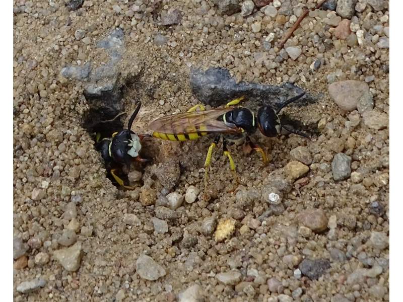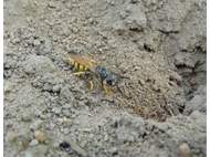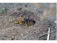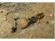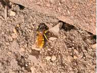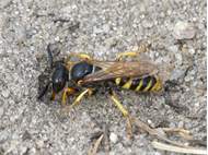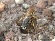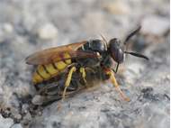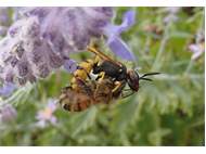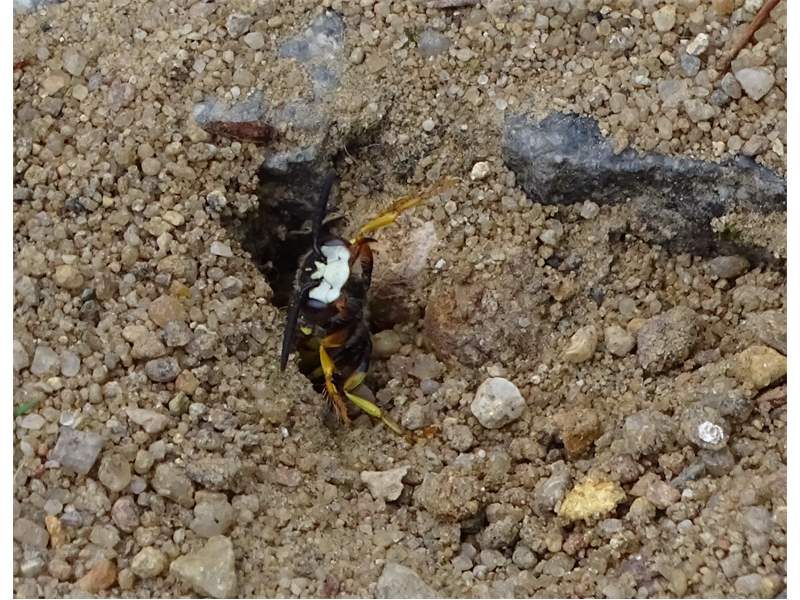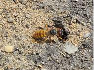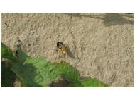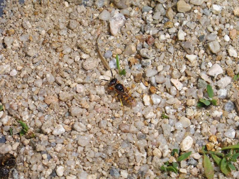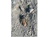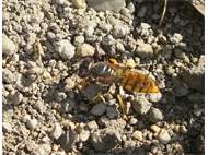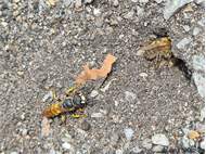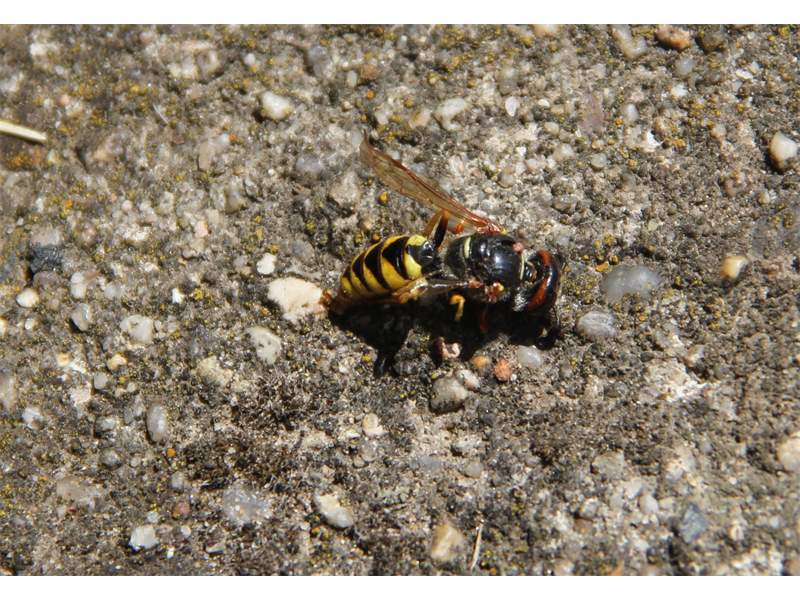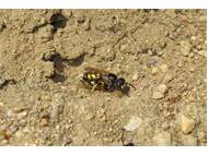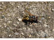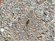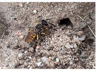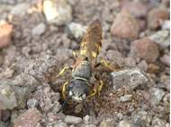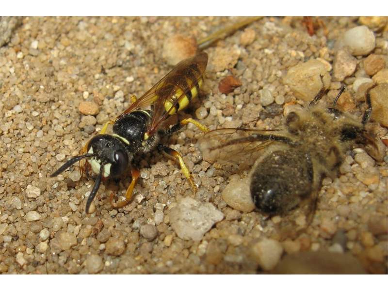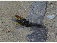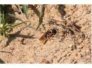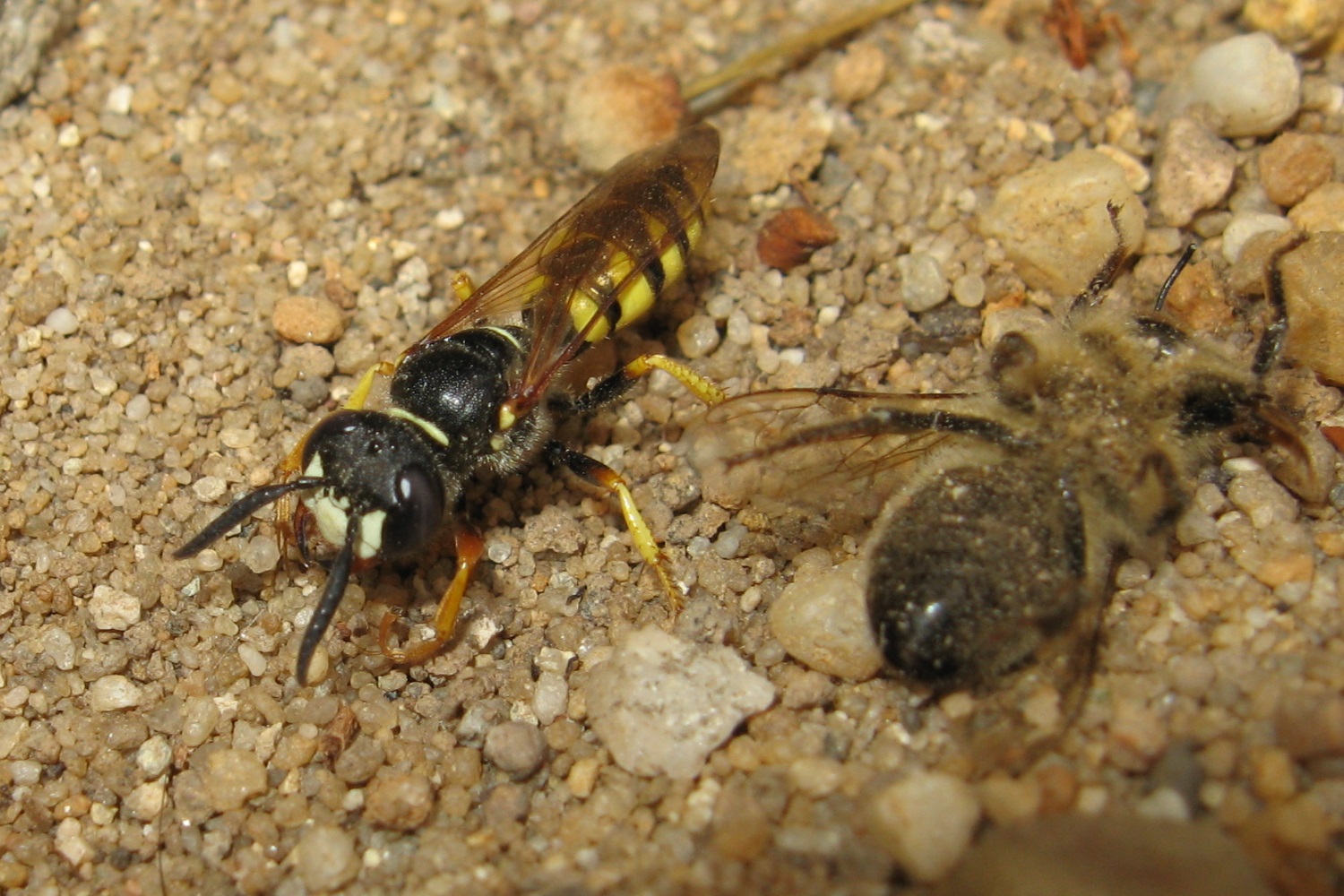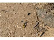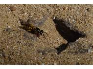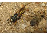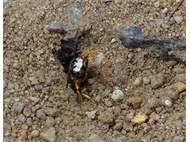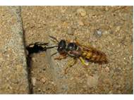 Bienenwolf, Weibchen beim Nestbau auf einem Gehweg, daneben liegt eine tote Honigbiene, Leipzig, Ortsteil Reudnitz-Thonberg, Juli 2009 (© Victor Weiler)( Bild vergrößern)