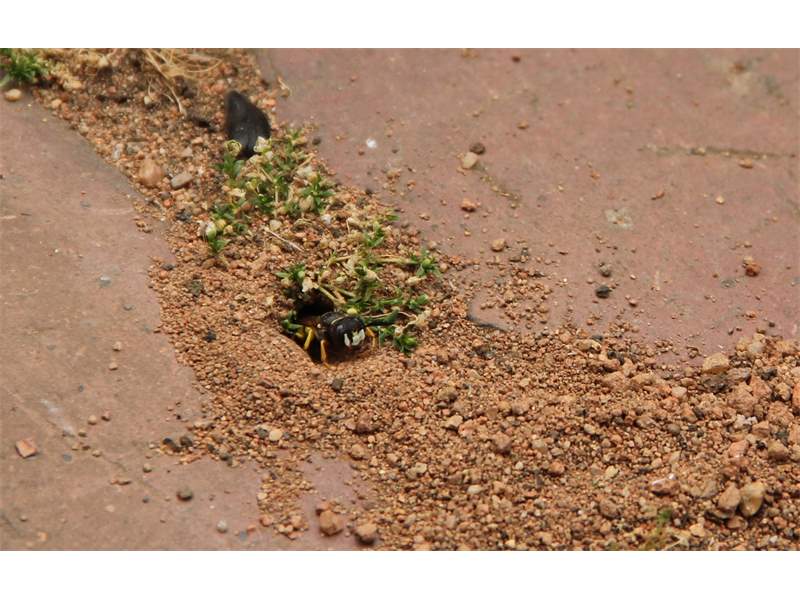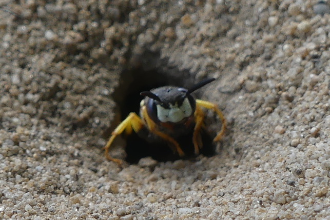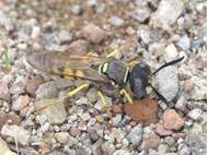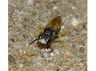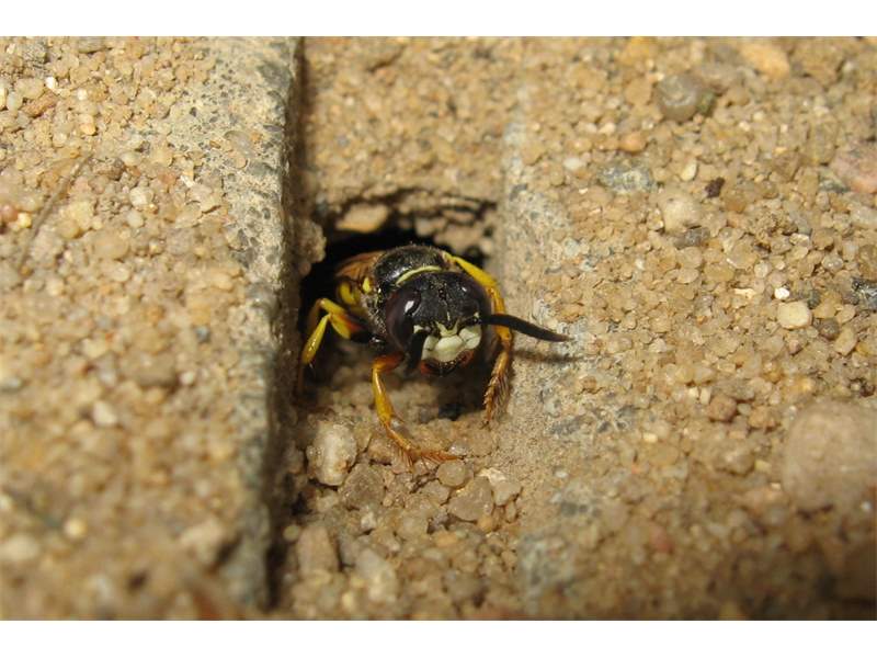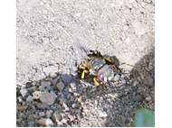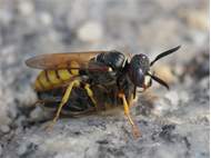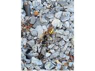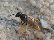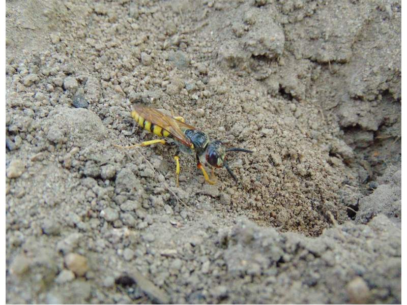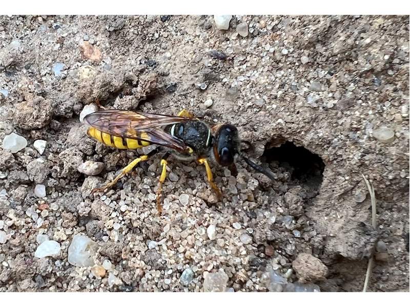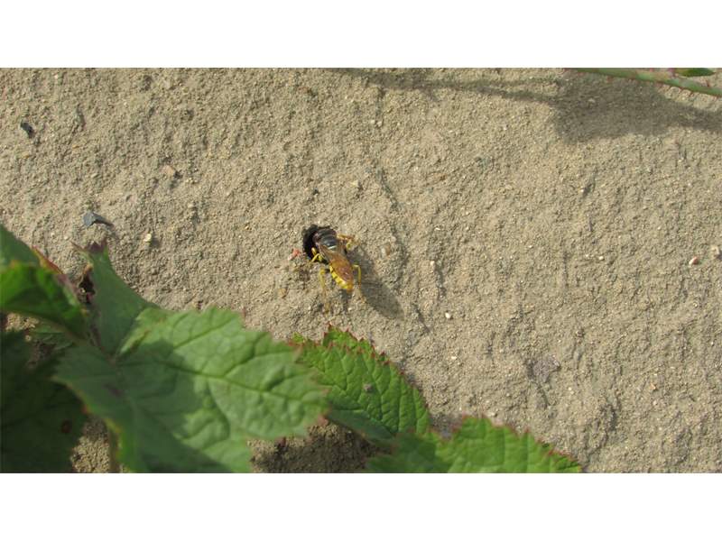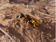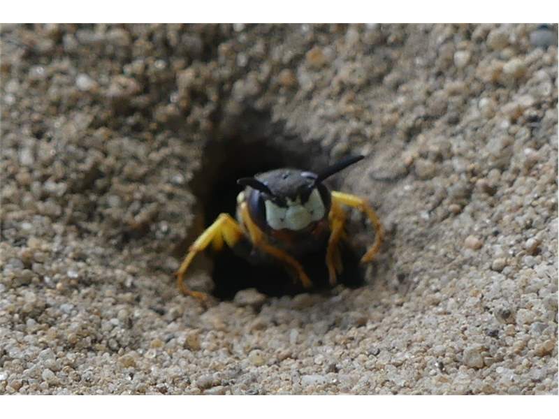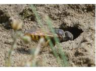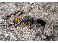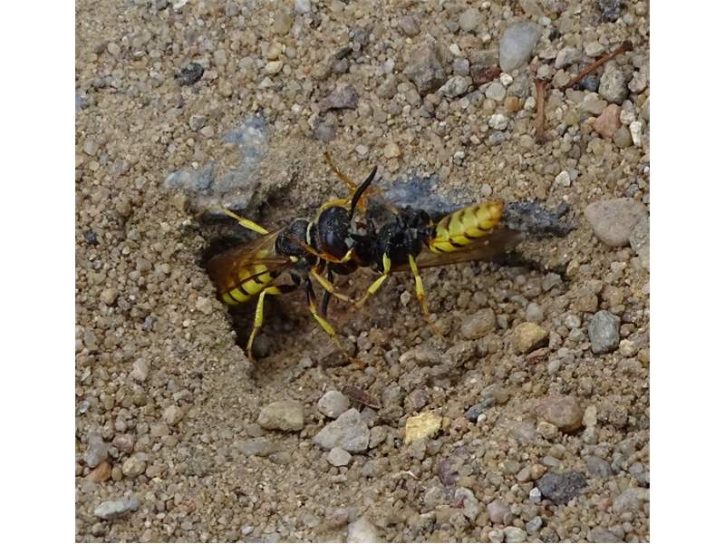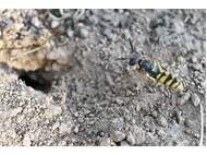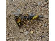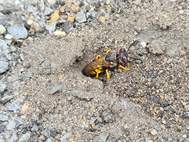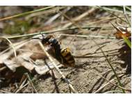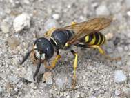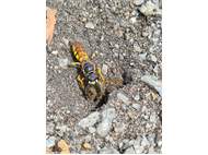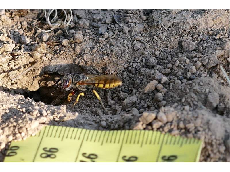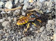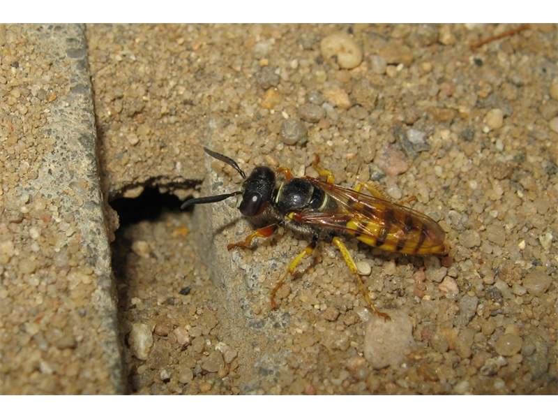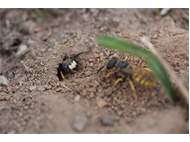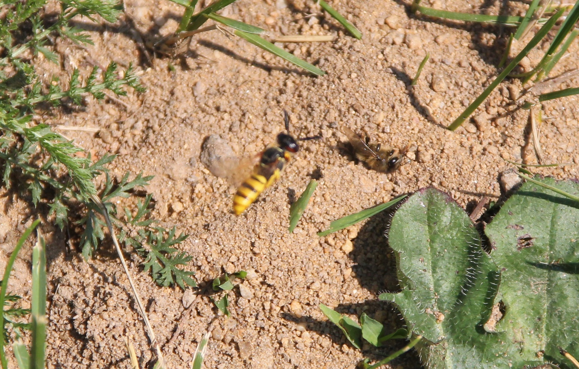 Bienenwolf, Weibchen beim Nestbau auf einem Gehweg, daneben liegt eine tote Honigbiene, Leipzig, Ortsteil Reudnitz-Thonberg, Juli 2009 (© Victor Weiler)( Bild vergrößern)
