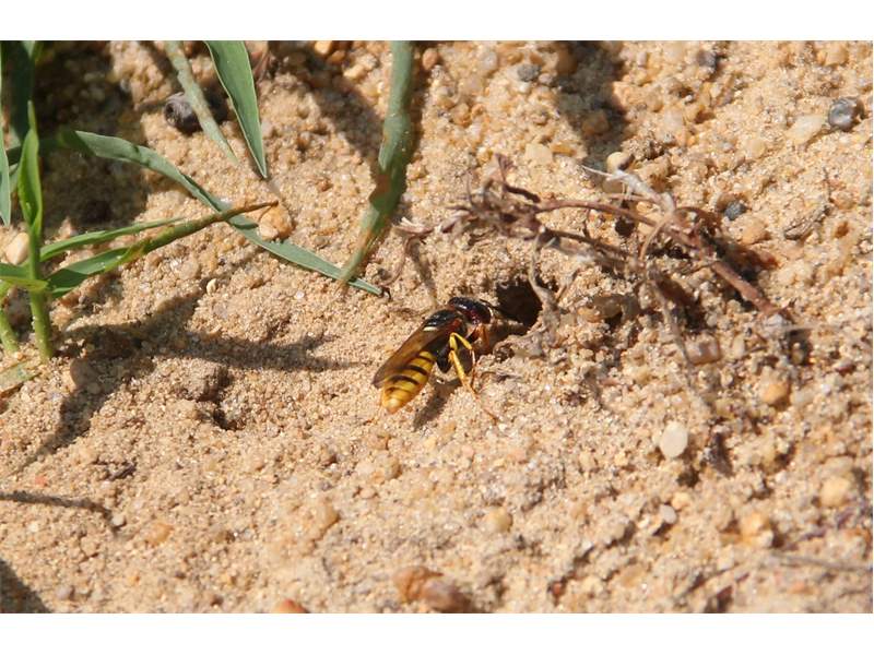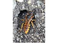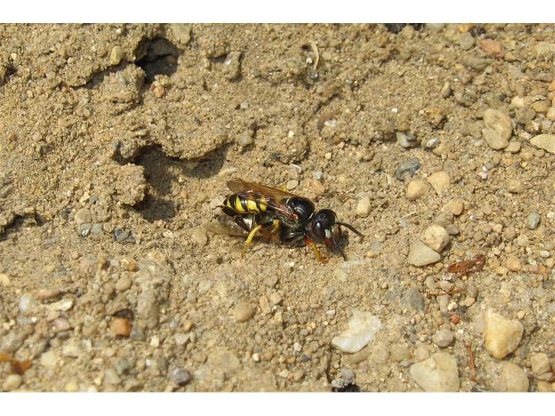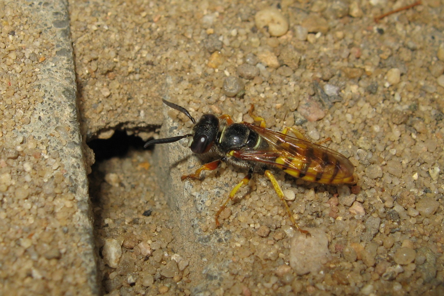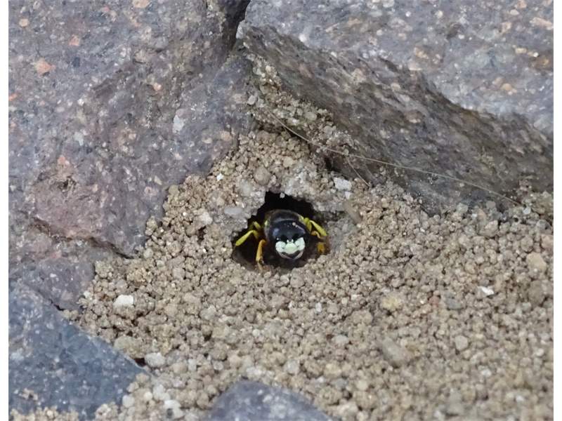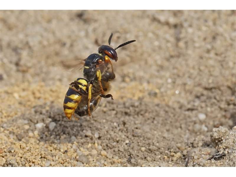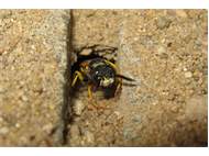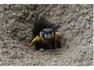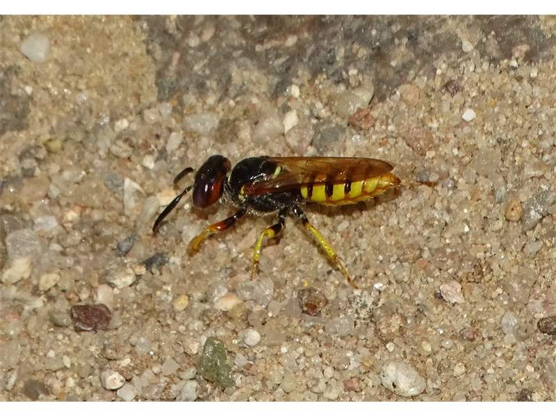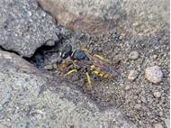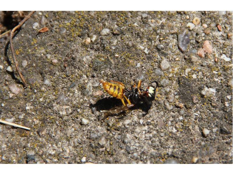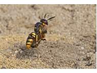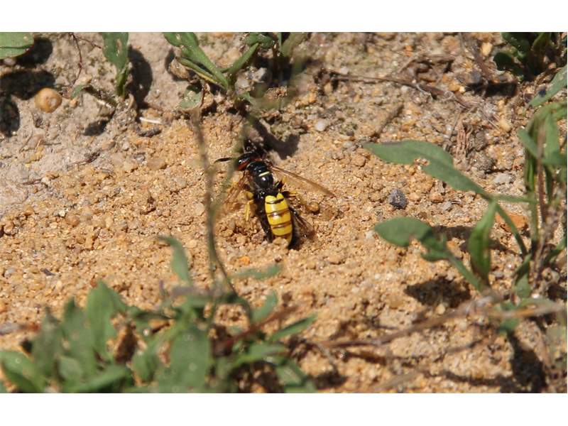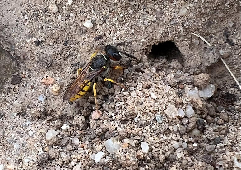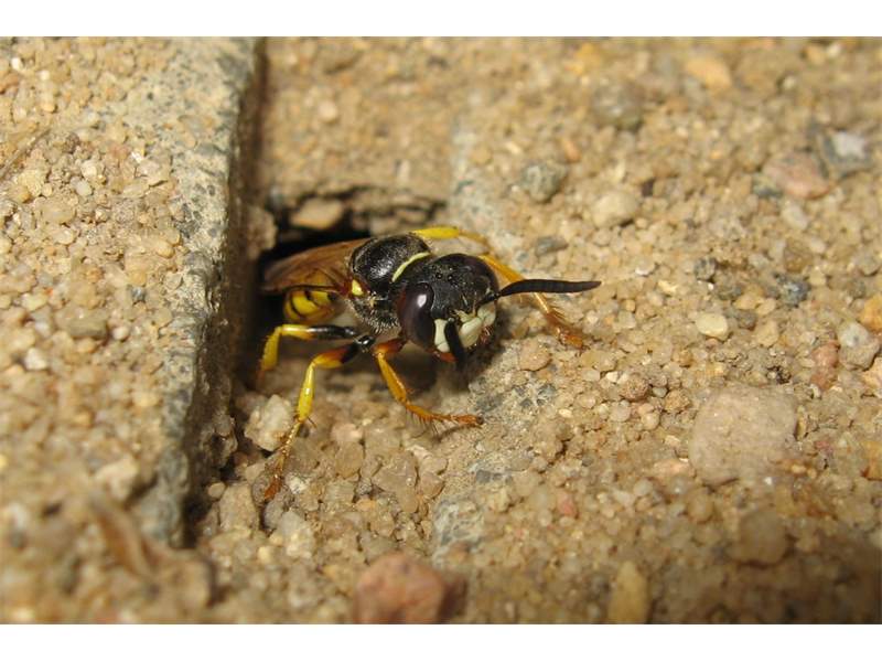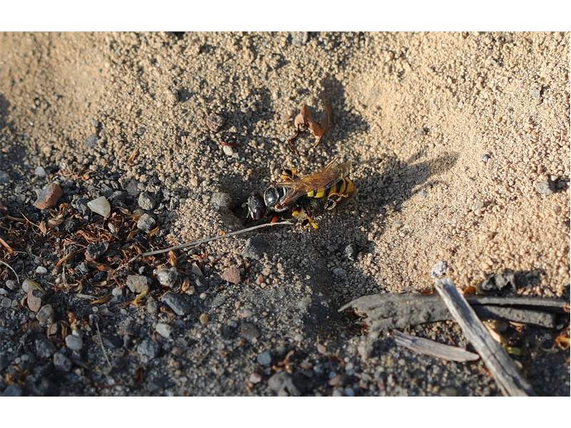 Bienenwolf, Weibchen beim Nestbau auf einem Gehweg, daneben liegt eine tote Honigbiene, Leipzig, Ortsteil Reudnitz-Thonberg, Juli 2009 (© Victor Weiler)( Bild vergrößern)