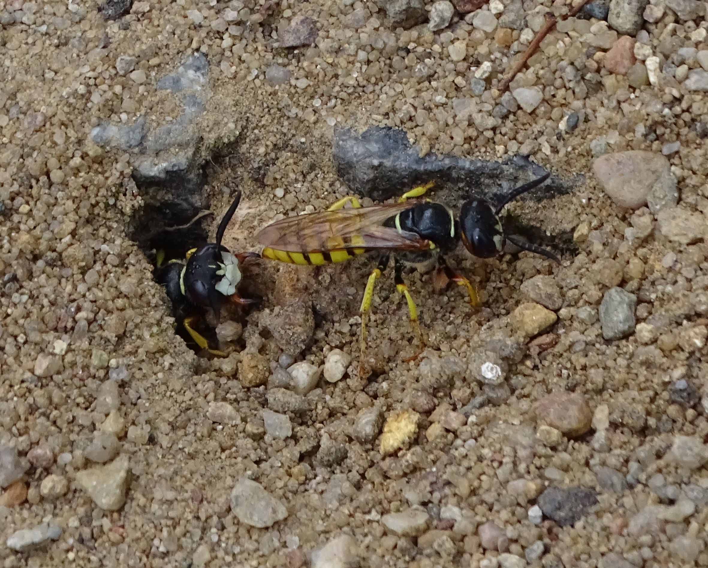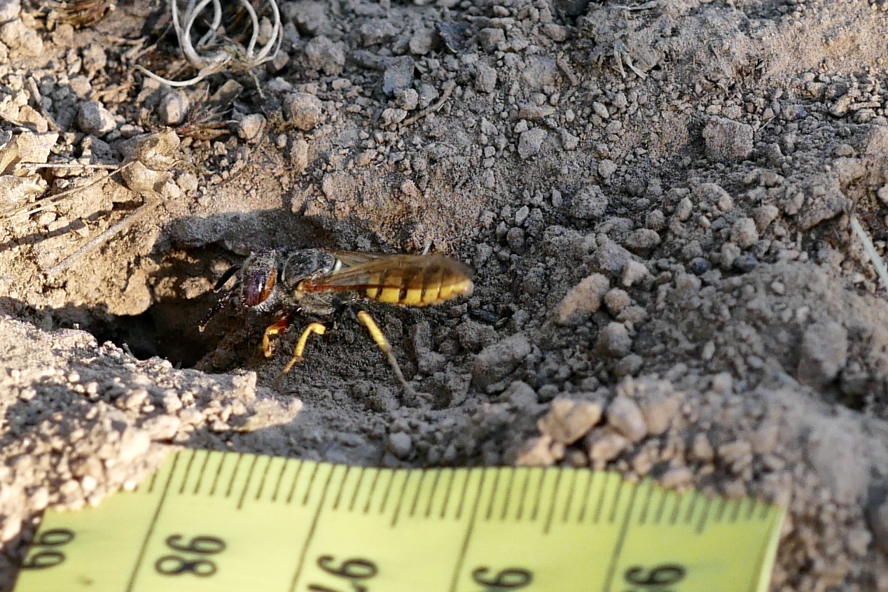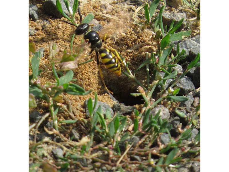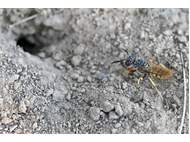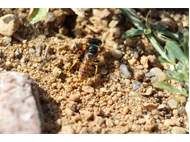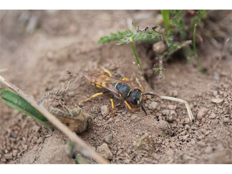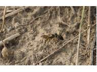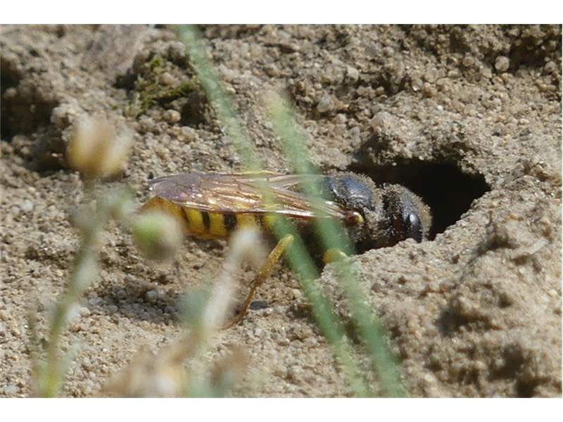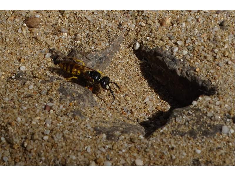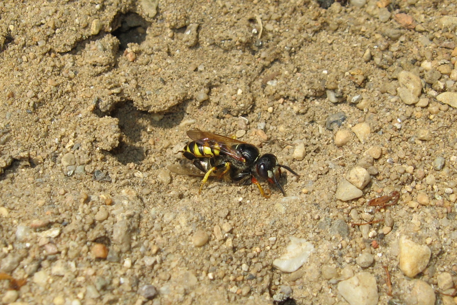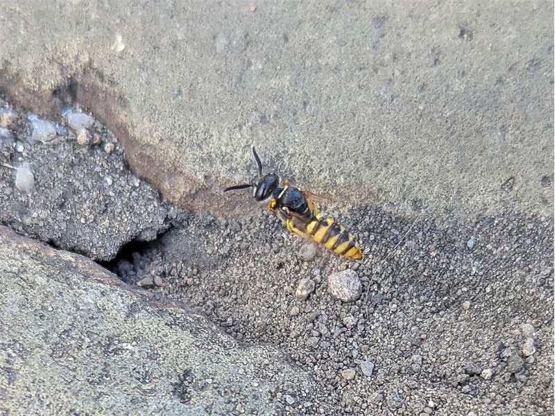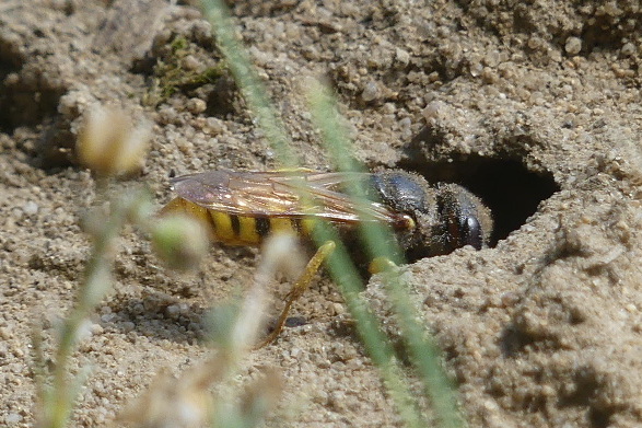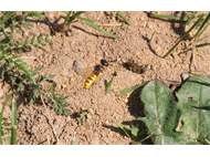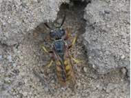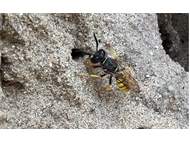 Bienenwolf, Weibchen beim Nestbau auf einem Gehweg, daneben liegt eine tote Honigbiene, Leipzig, Ortsteil Reudnitz-Thonberg, Juli 2009 (© Victor Weiler)( Bild vergrößern)