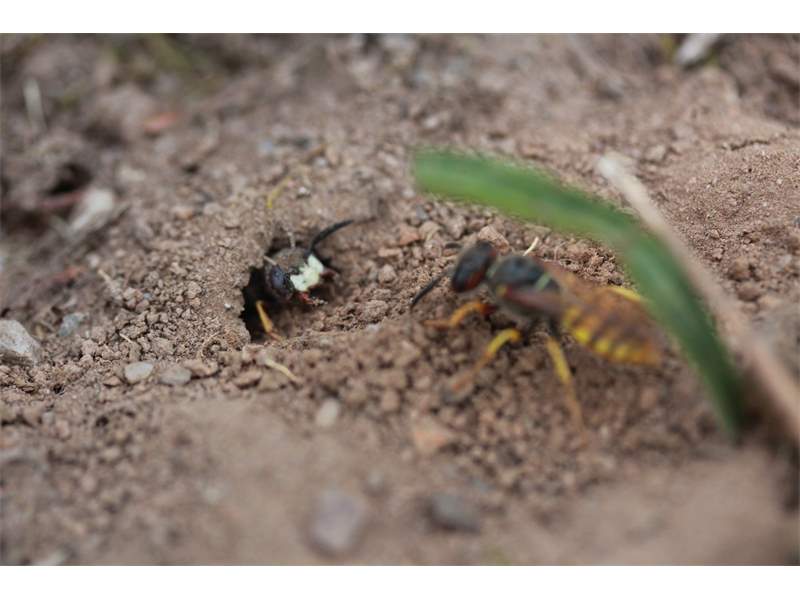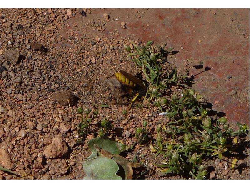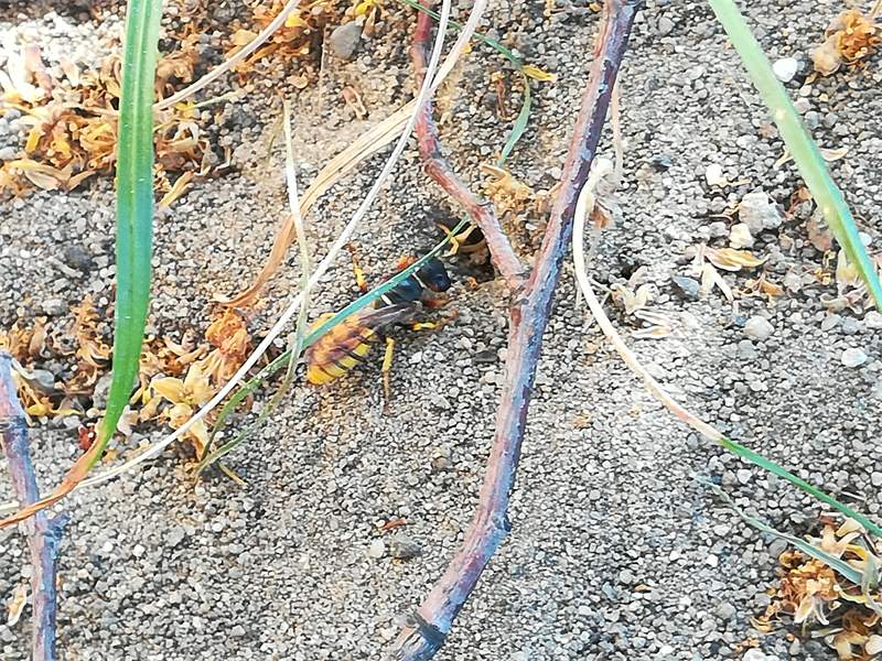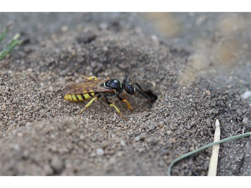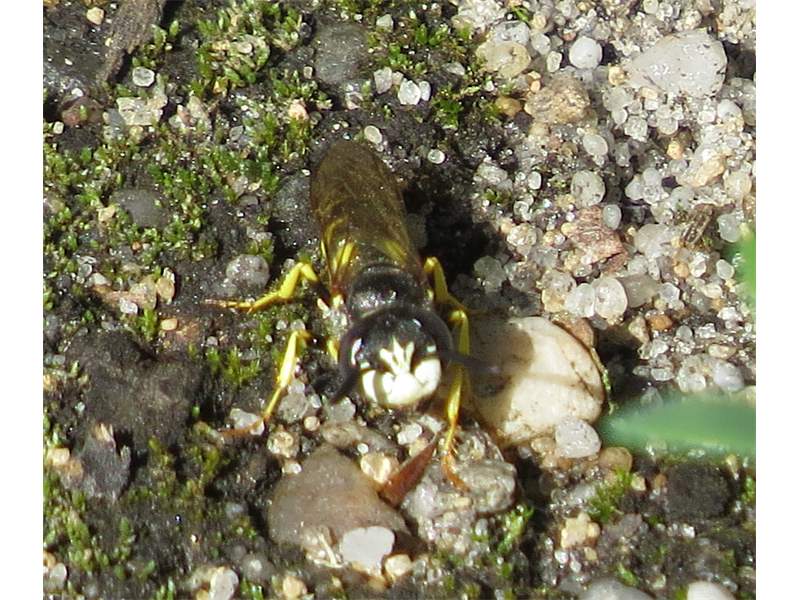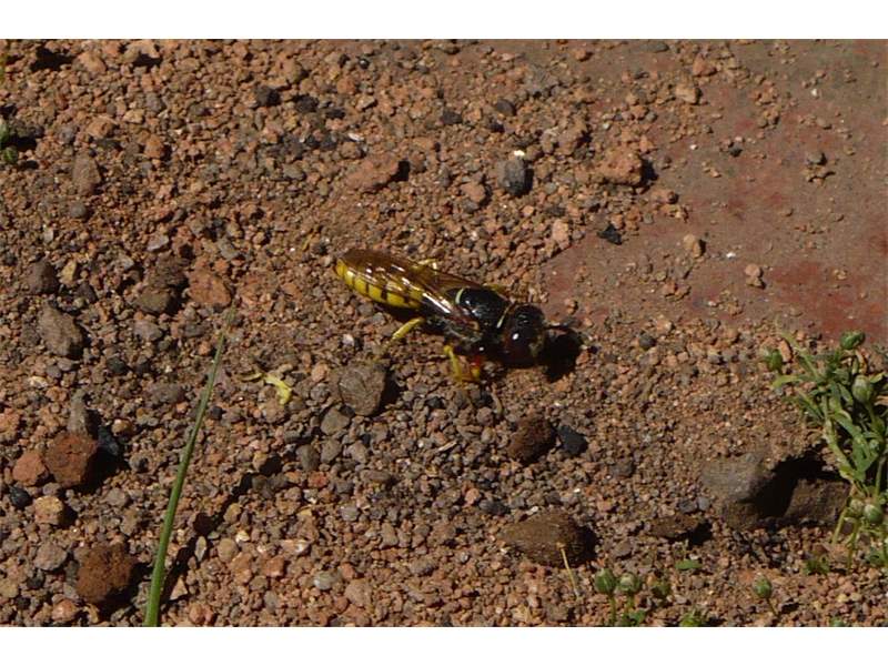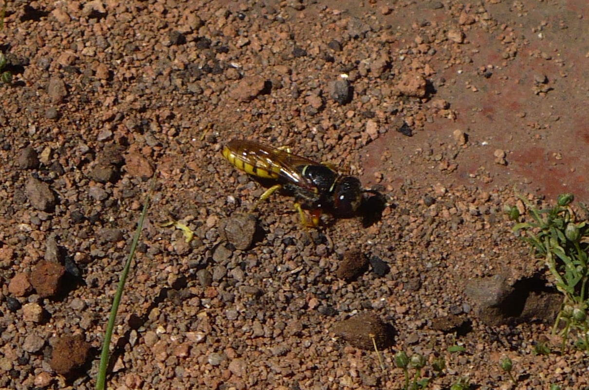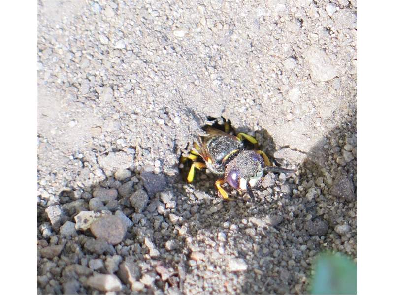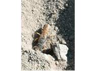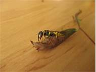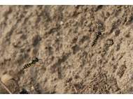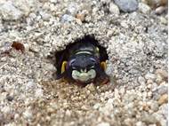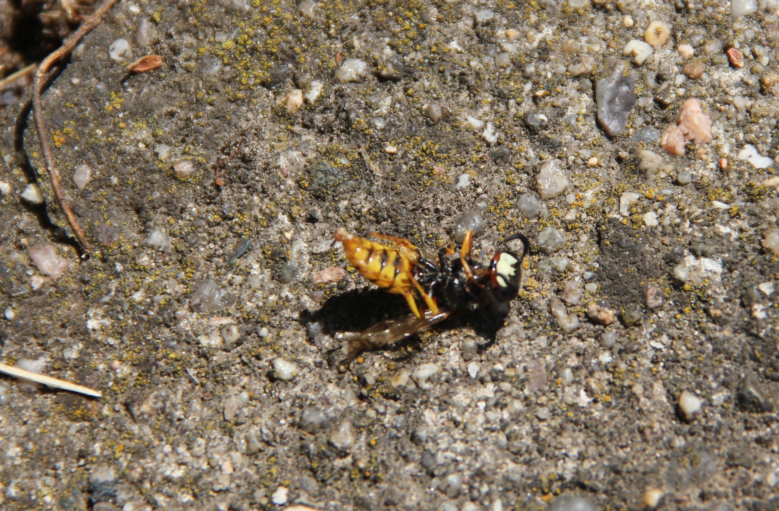 Bienenwolf, Weibchen beim Nestbau auf einem Gehweg, daneben liegt eine tote Honigbiene, Leipzig, Ortsteil Reudnitz-Thonberg, Juli 2009 (© Victor Weiler)( Bild vergrößern)