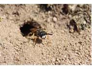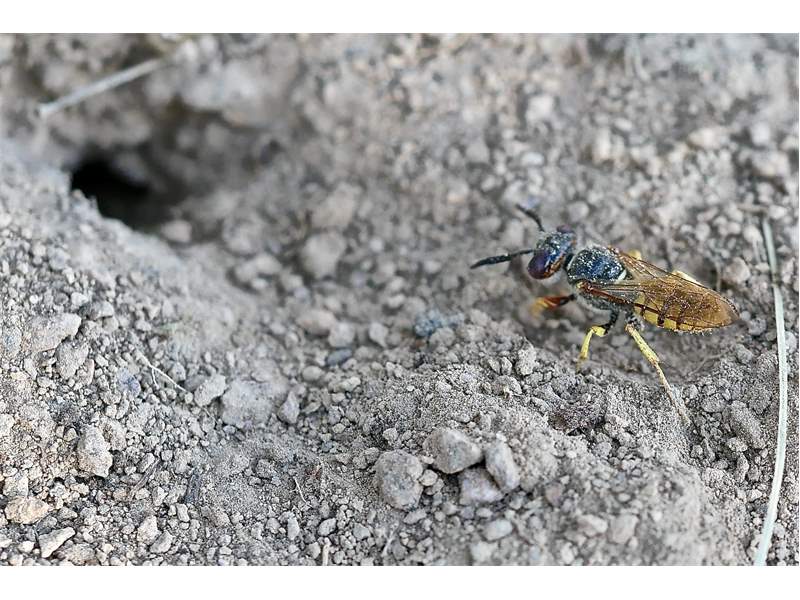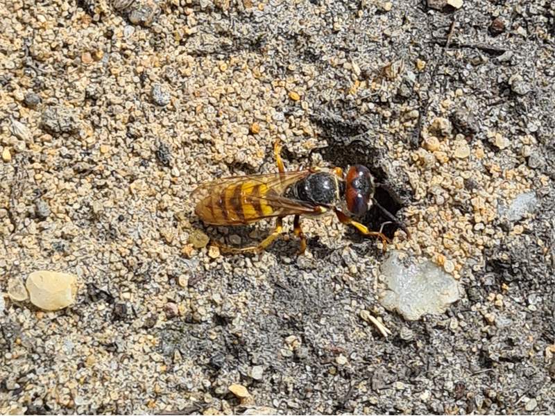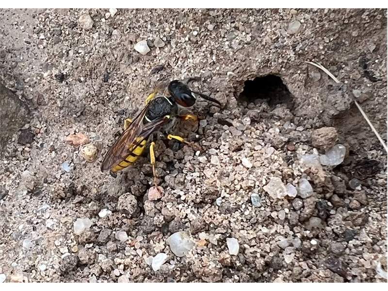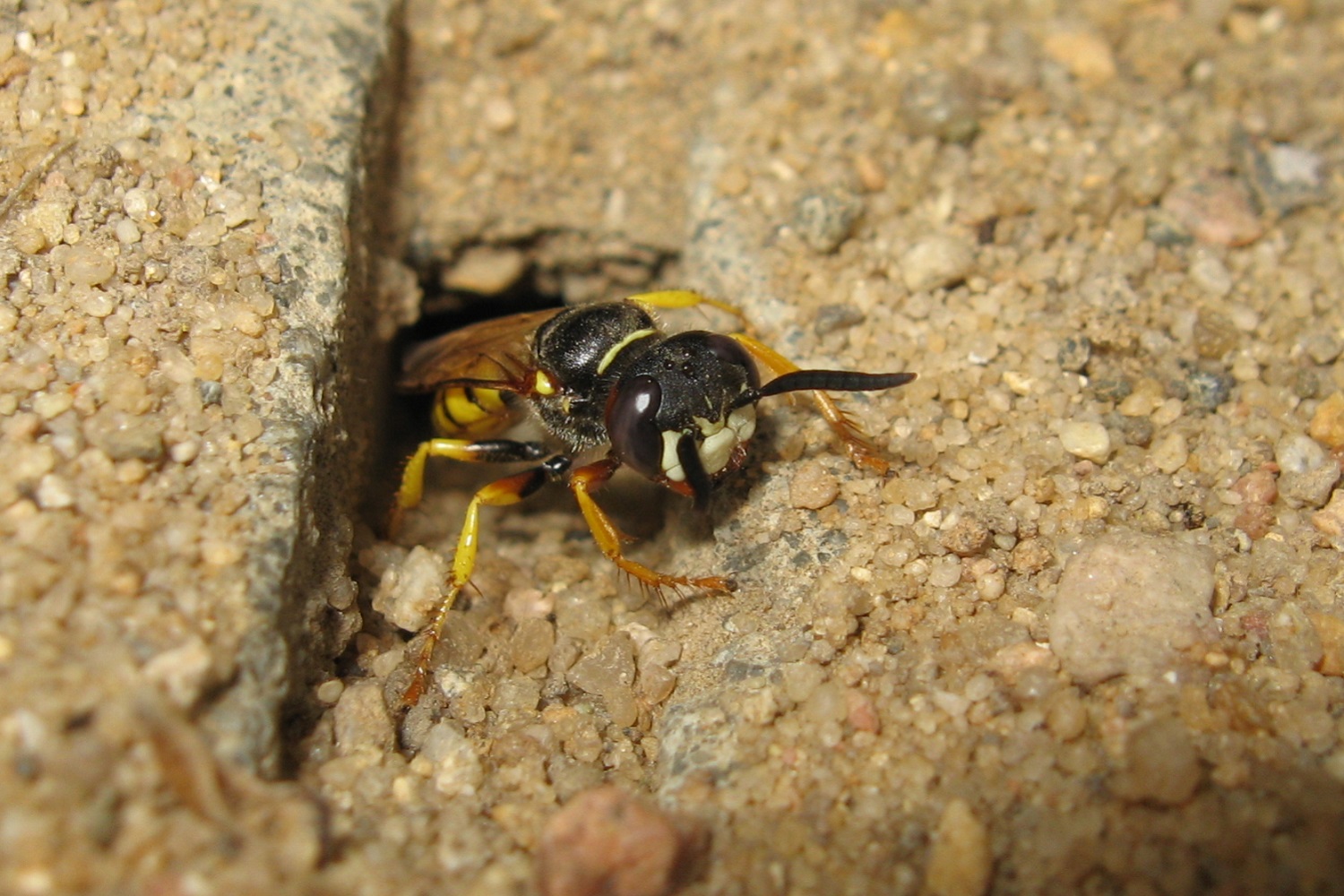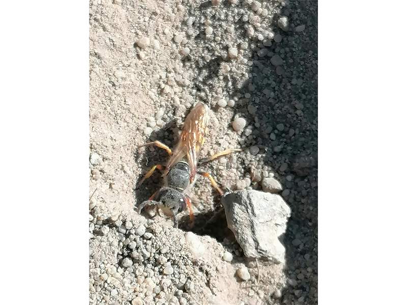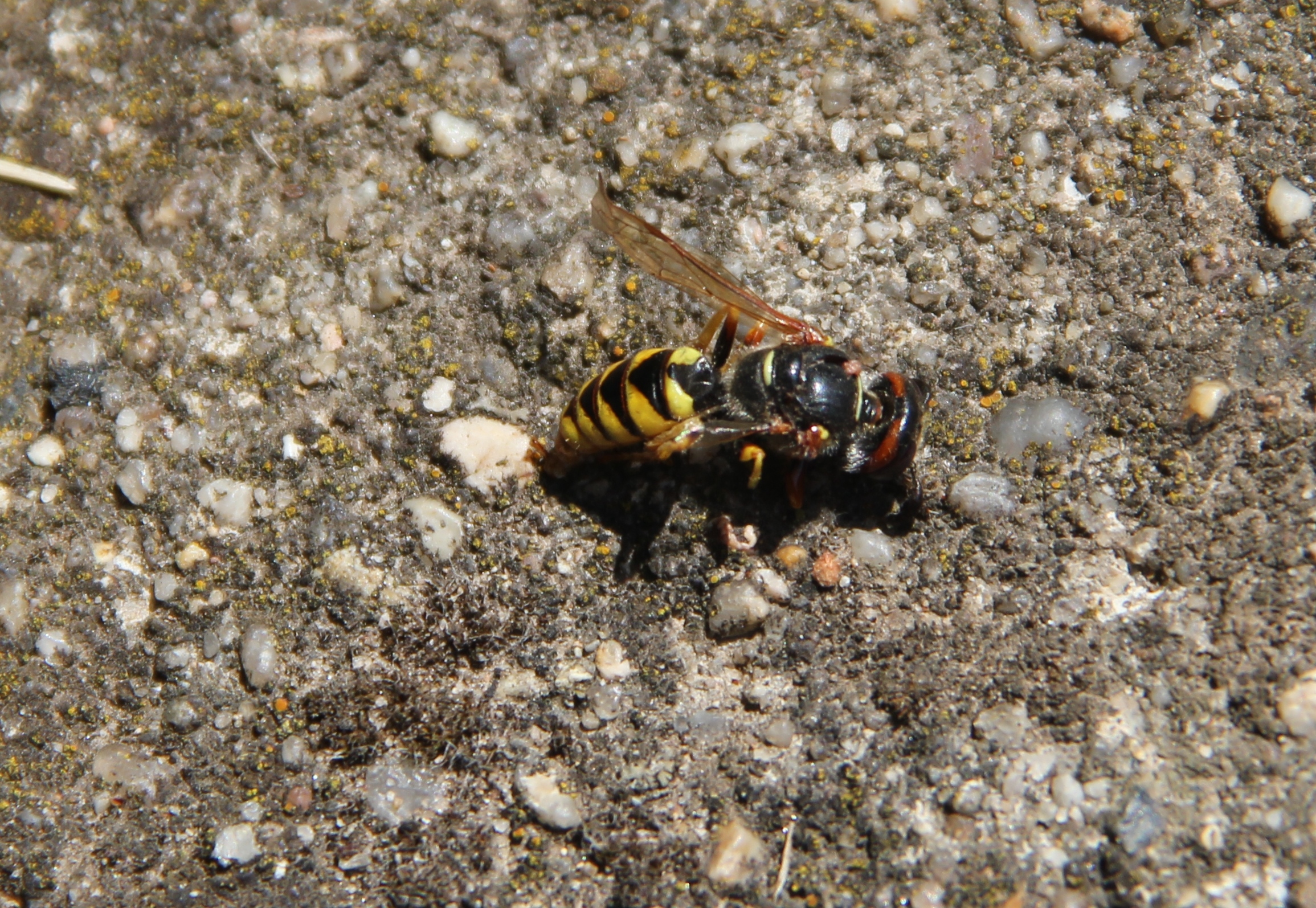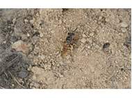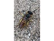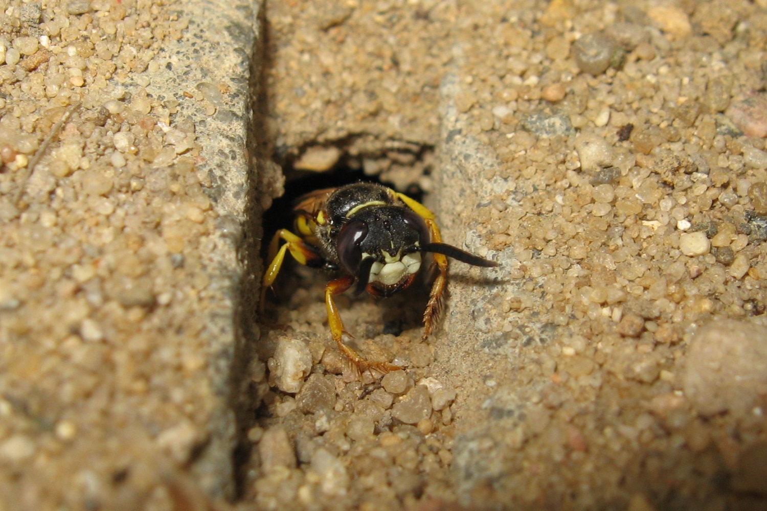 Bienenwolf, Weibchen beim Nestbau auf einem Gehweg, daneben liegt eine tote Honigbiene, Leipzig, Ortsteil Reudnitz-Thonberg, Juli 2009 (© Victor Weiler)( Bild vergrößern)