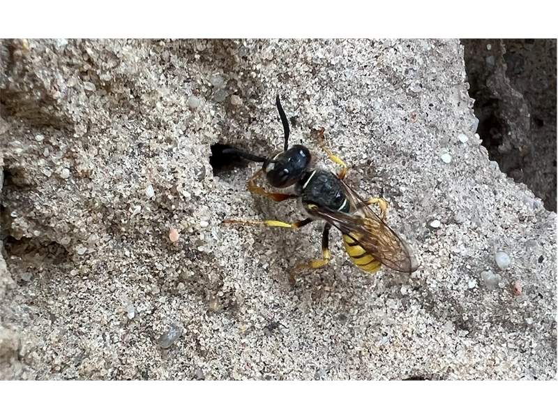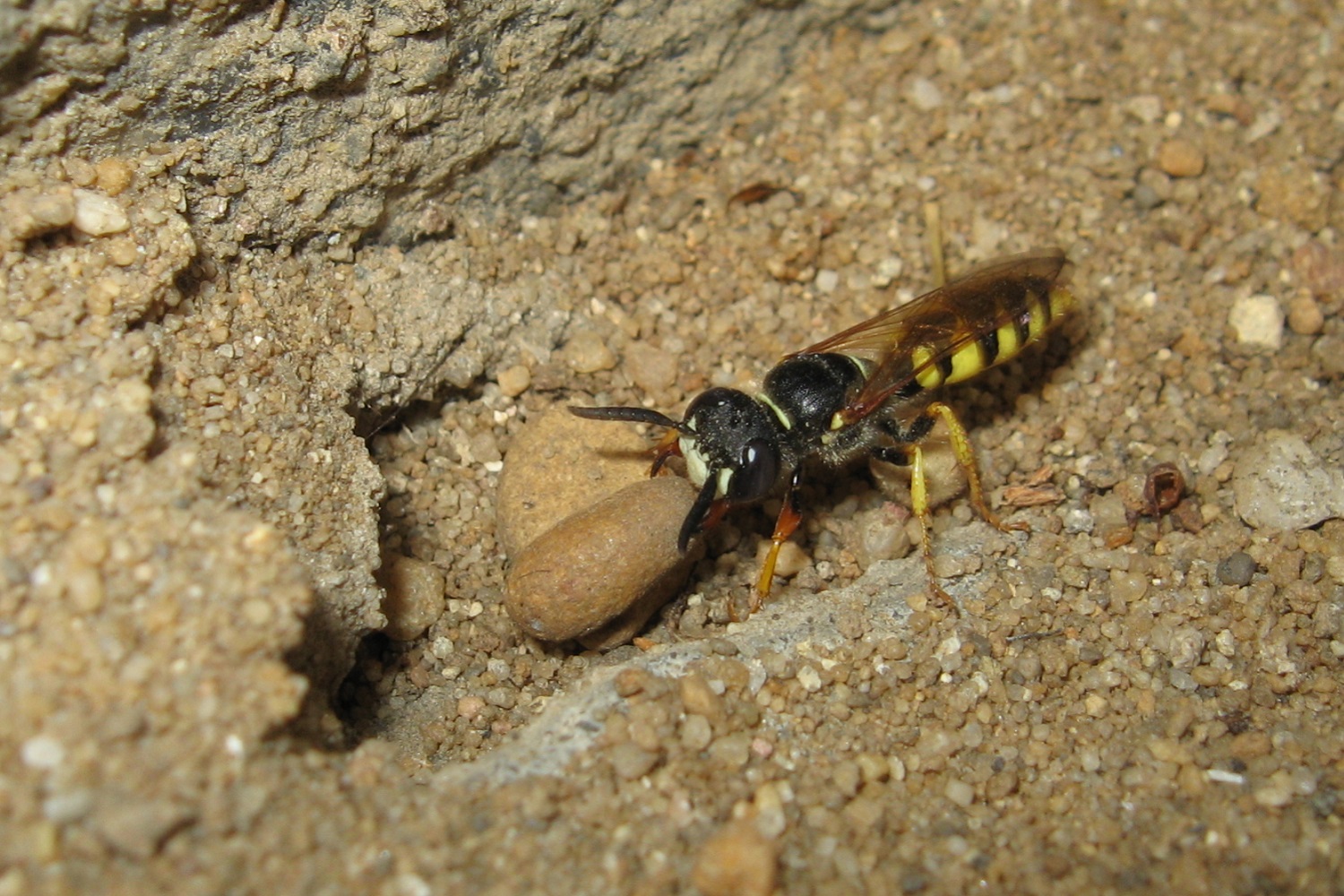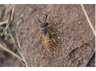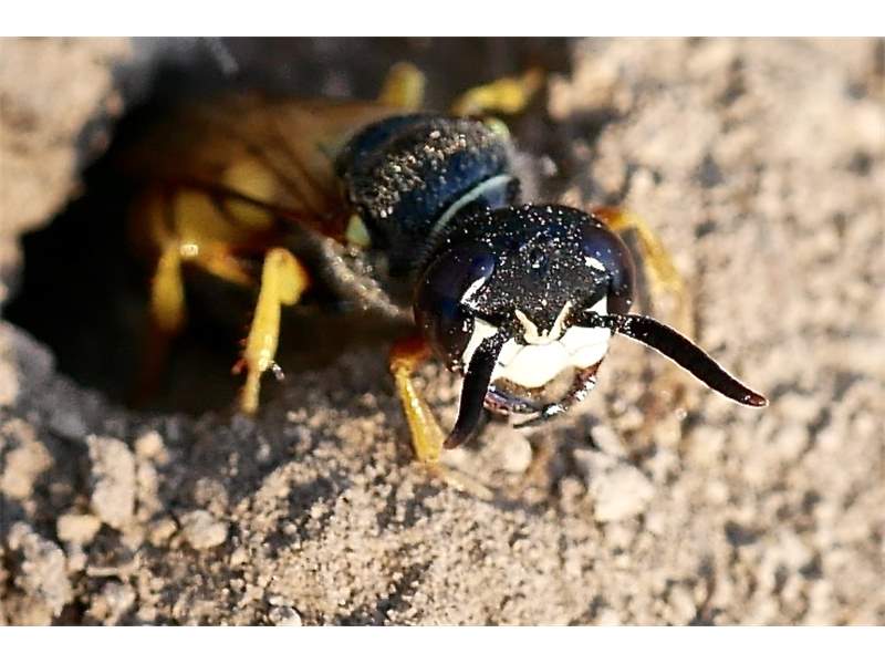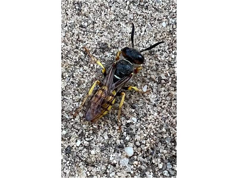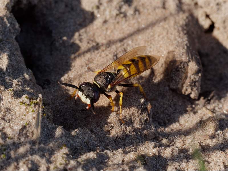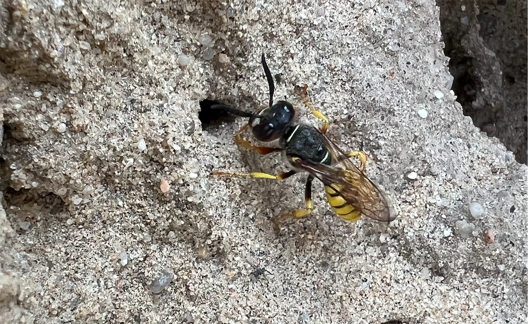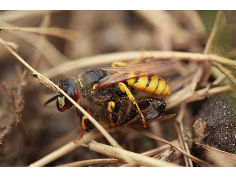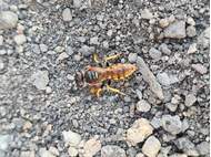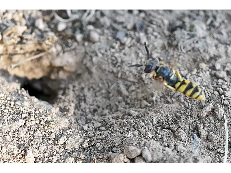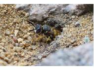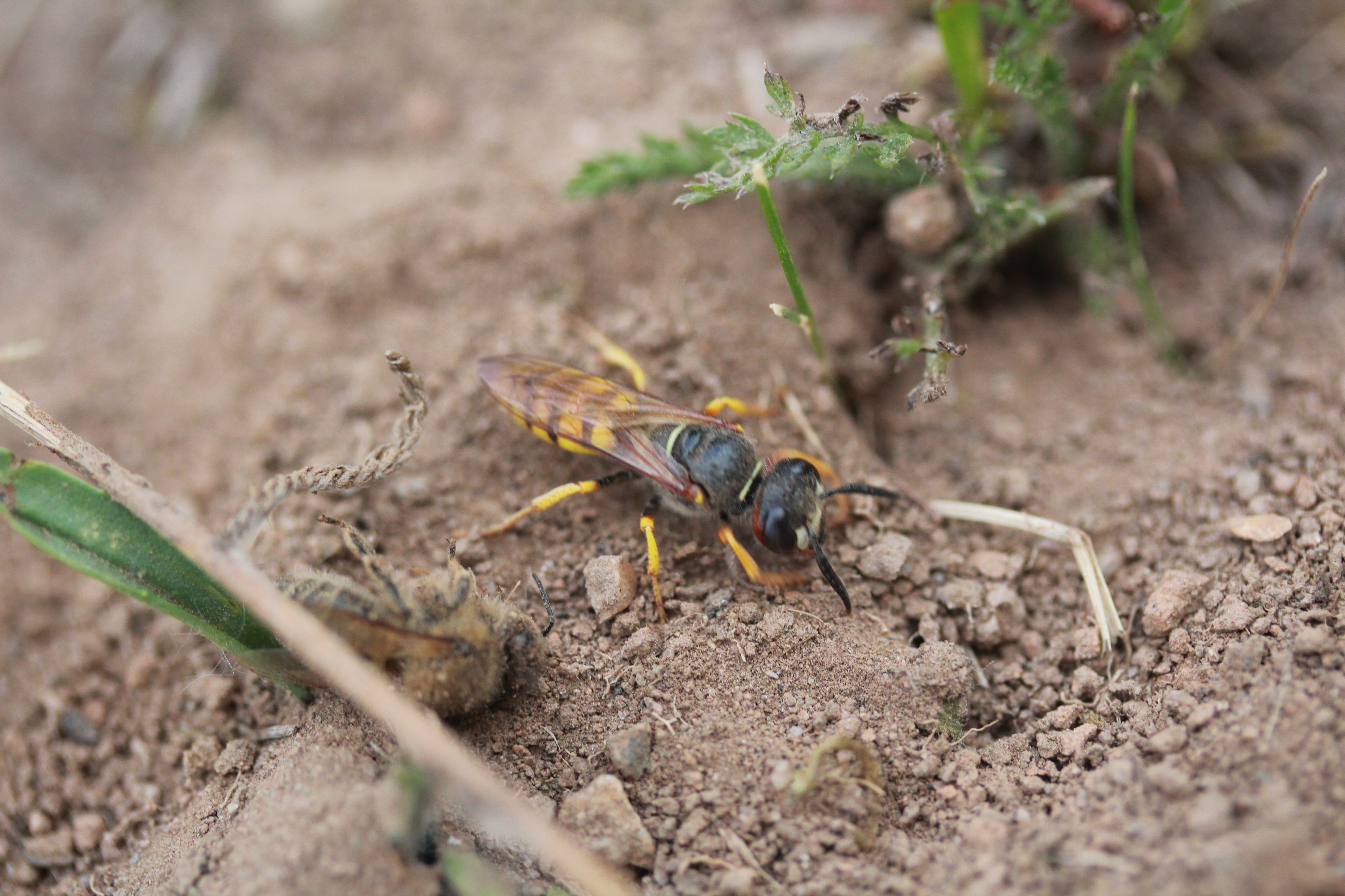 Bienenwolf, Weibchen beim Nestbau auf einem Gehweg, daneben liegt eine tote Honigbiene, Leipzig, Ortsteil Reudnitz-Thonberg, Juli 2009 (© Victor Weiler)( Bild vergrößern)