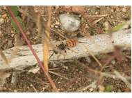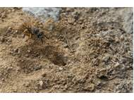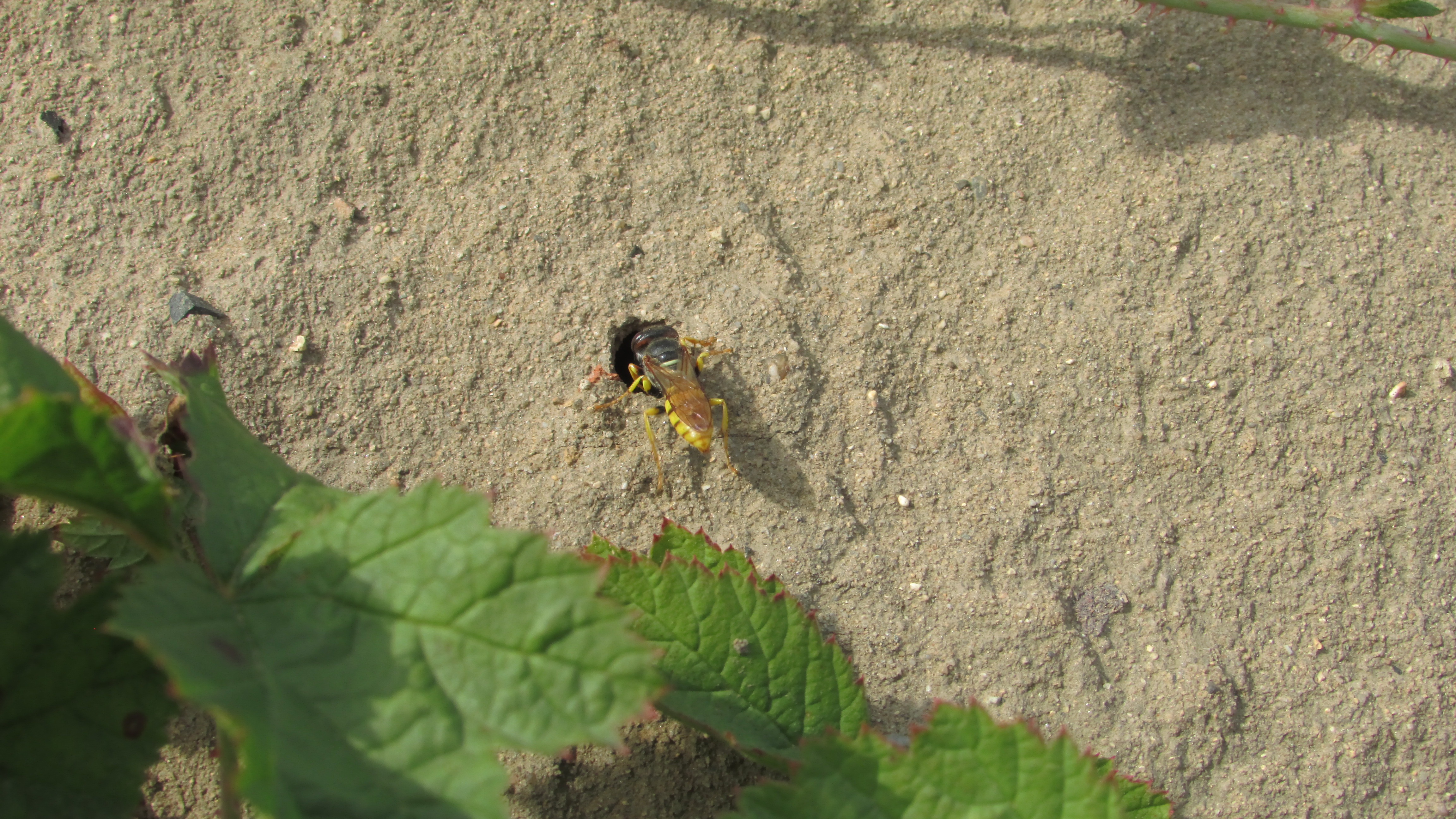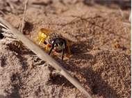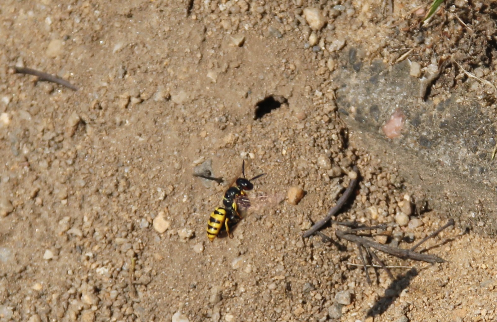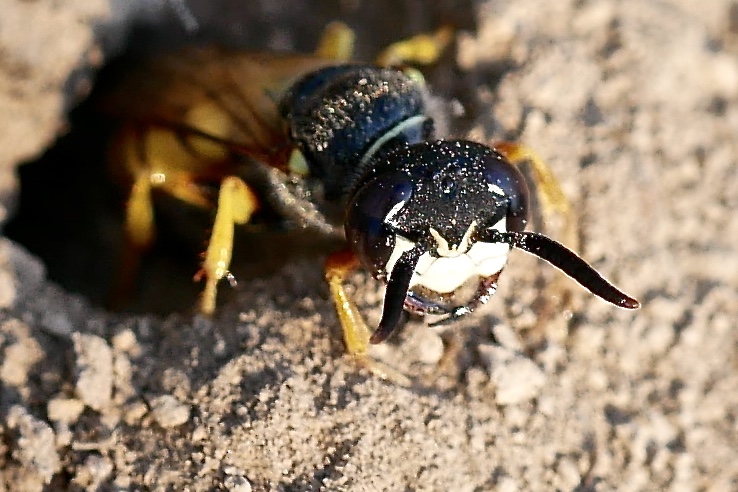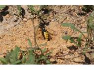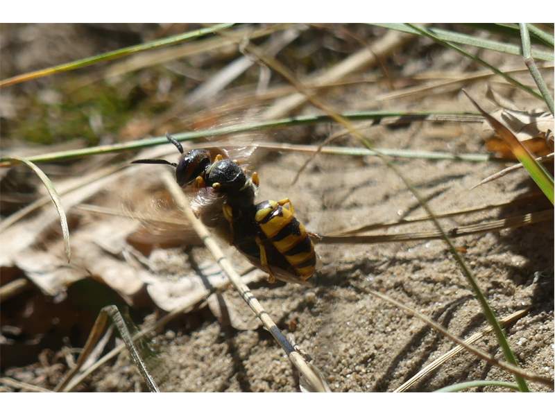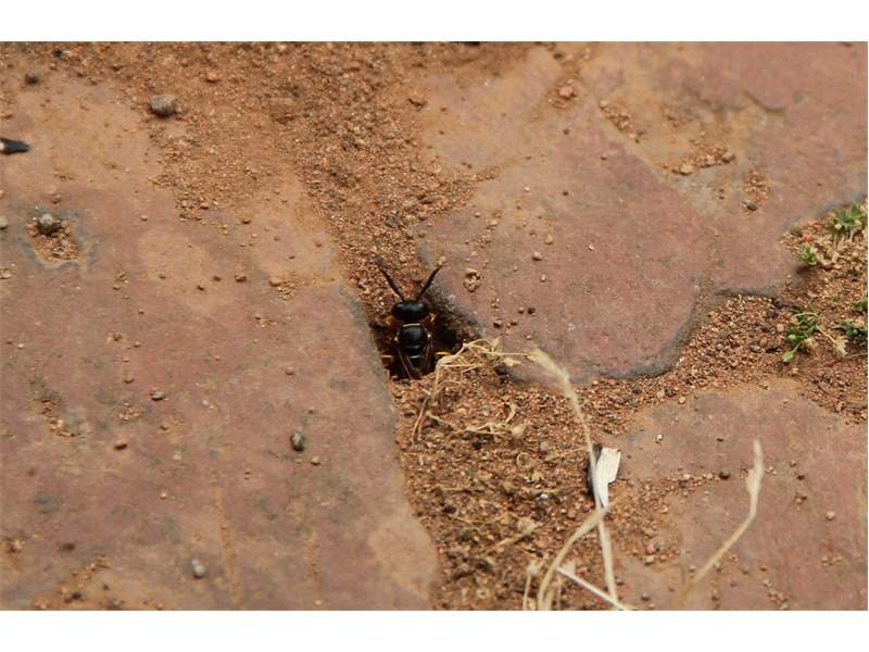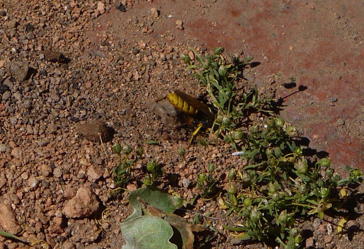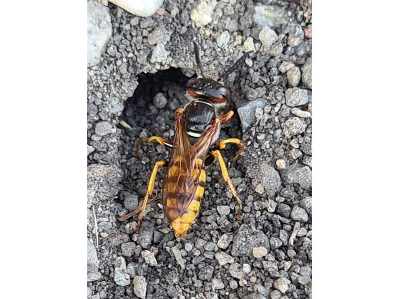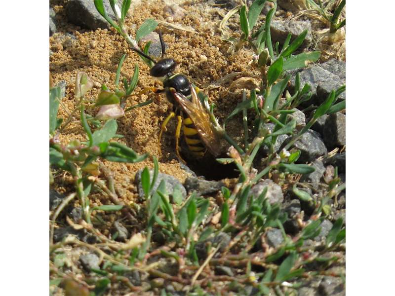 Bienenwolf, Weibchen beim Nestbau auf einem Gehweg, daneben liegt eine tote Honigbiene, Leipzig, Ortsteil Reudnitz-Thonberg, Juli 2009 (© Victor Weiler)( Bild vergrößern)