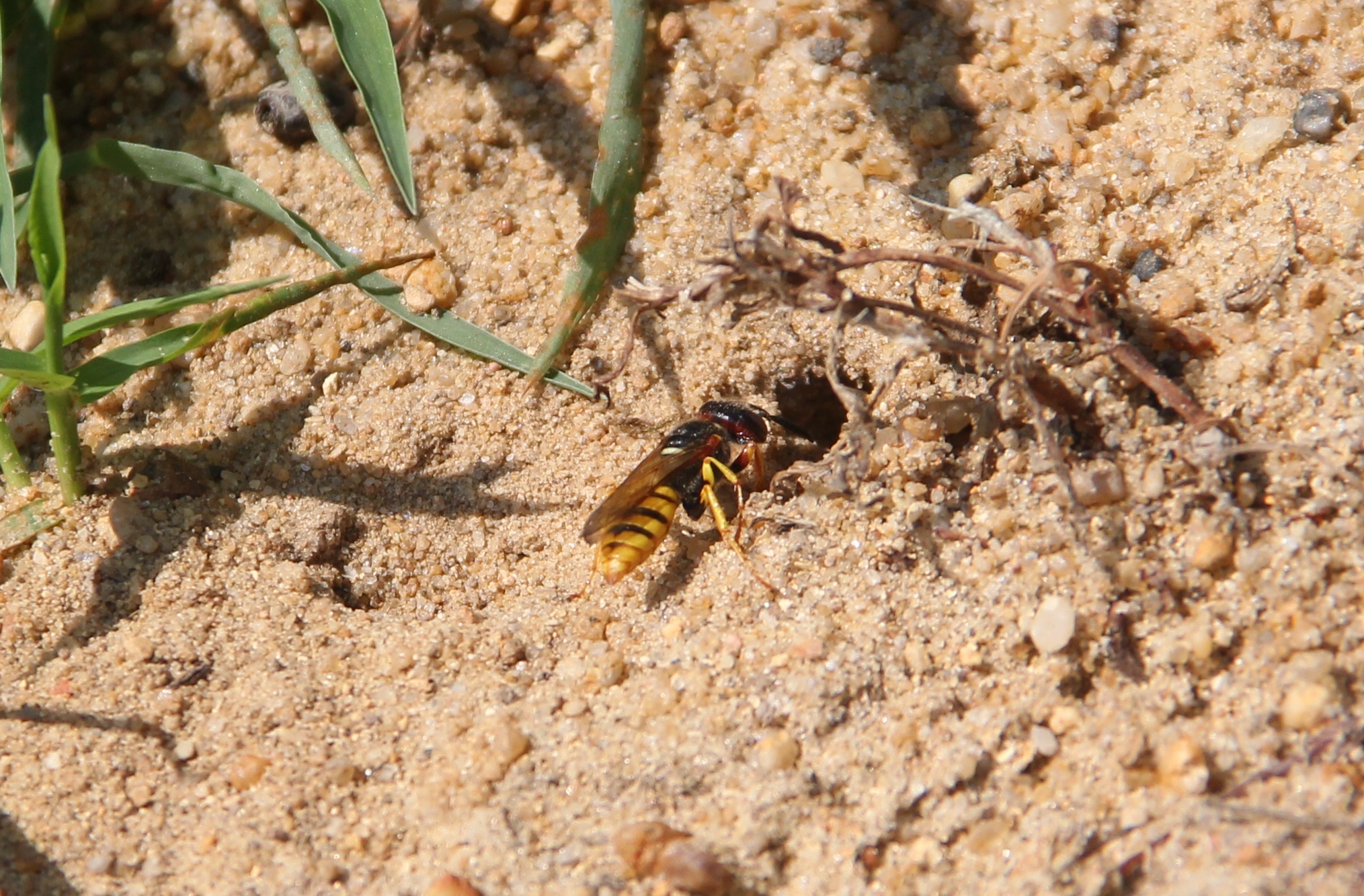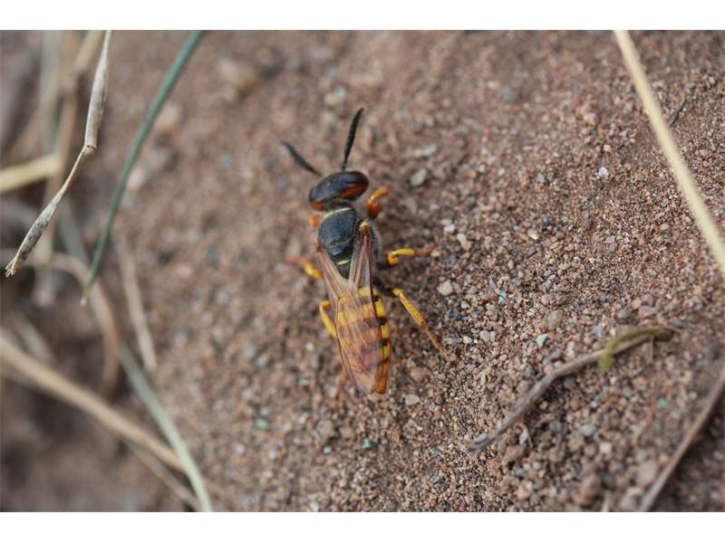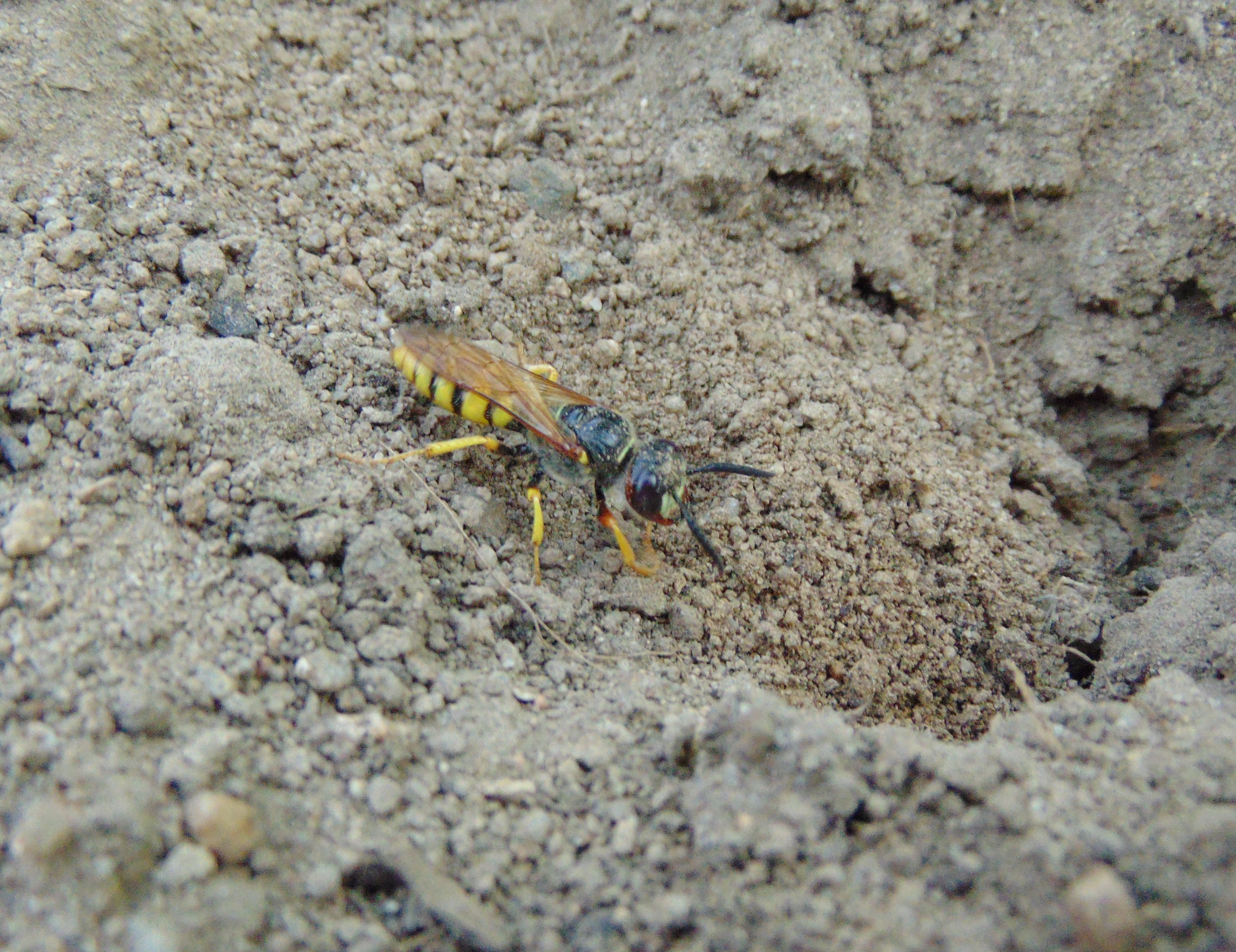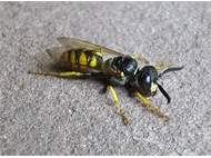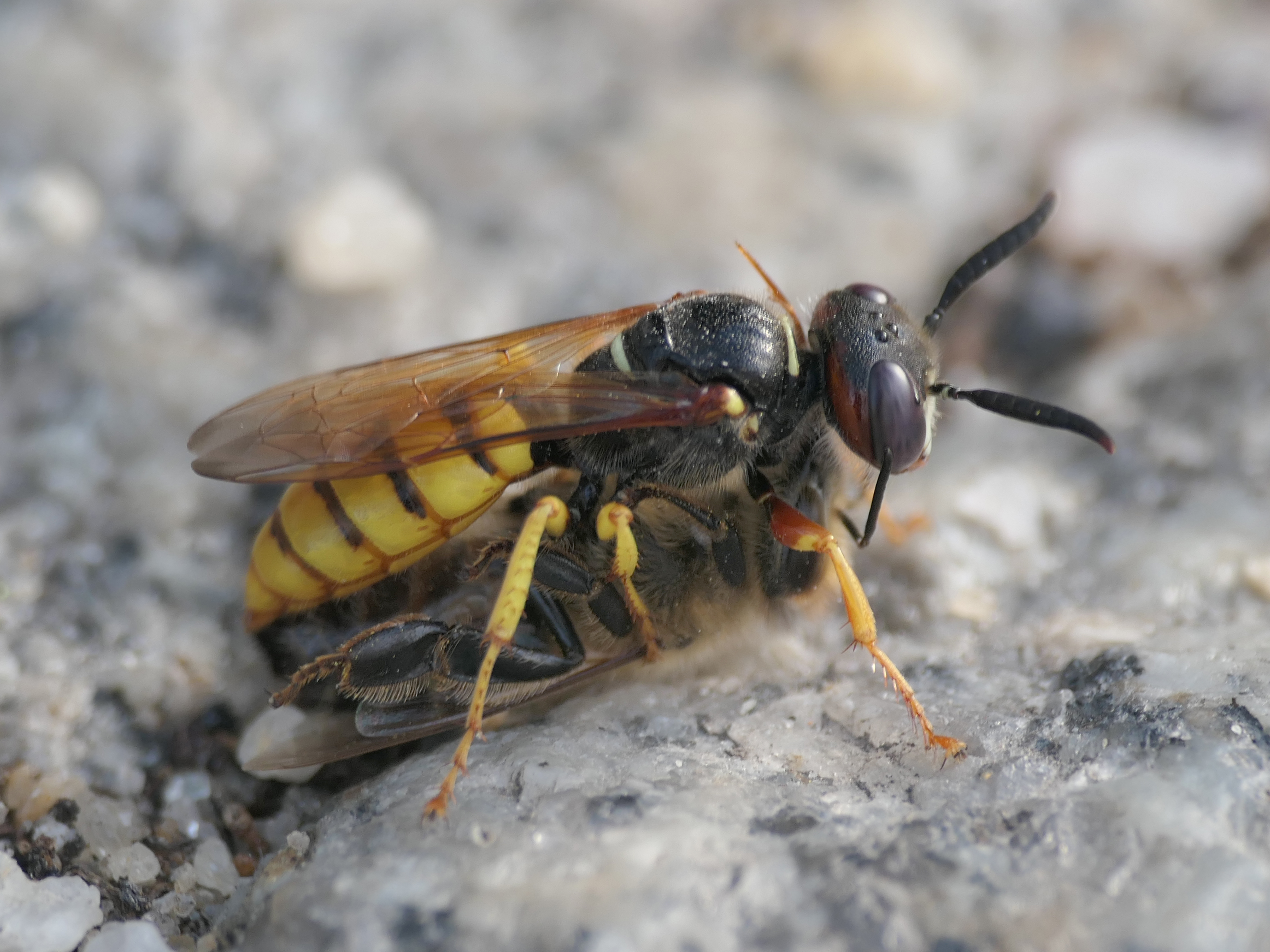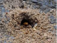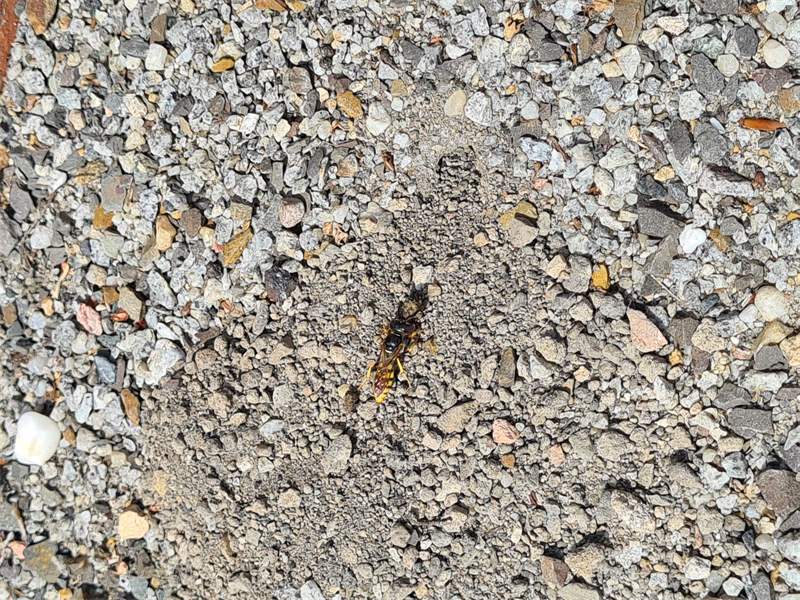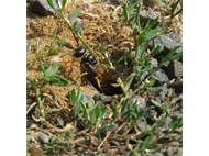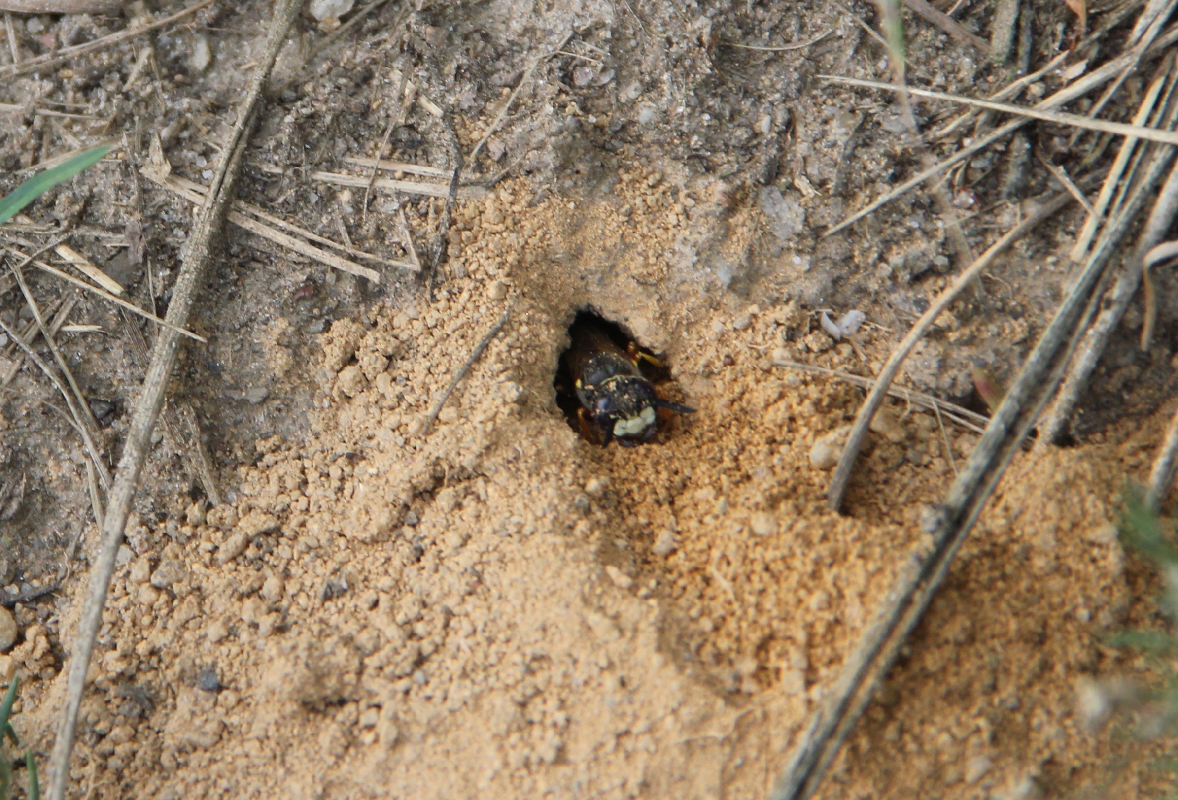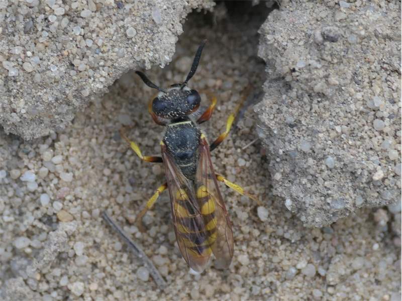 Bienenwolf, Weibchen beim Nestbau auf einem Gehweg, daneben liegt eine tote Honigbiene, Leipzig, Ortsteil Reudnitz-Thonberg, Juli 2009 (© Victor Weiler)( Bild vergrößern)