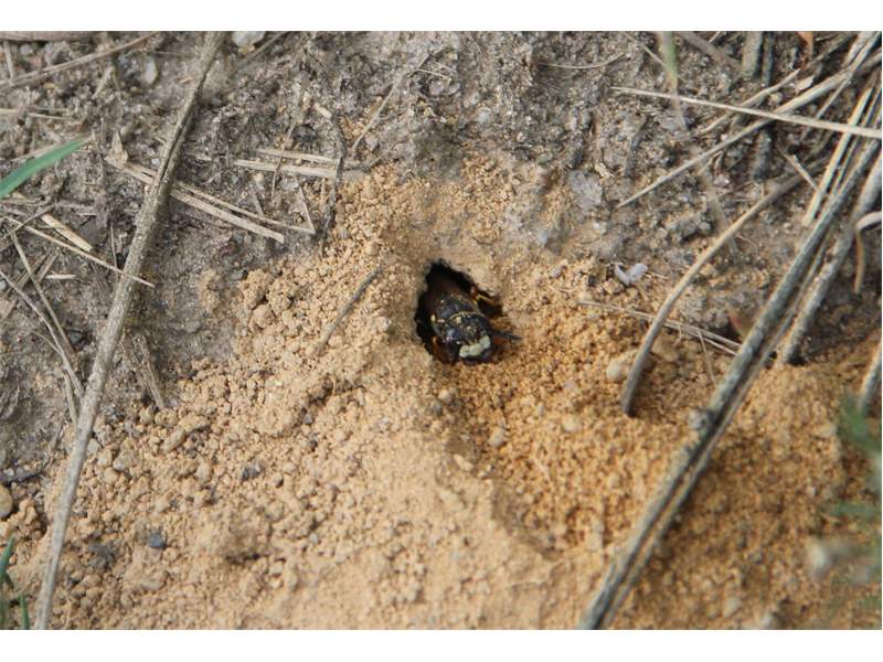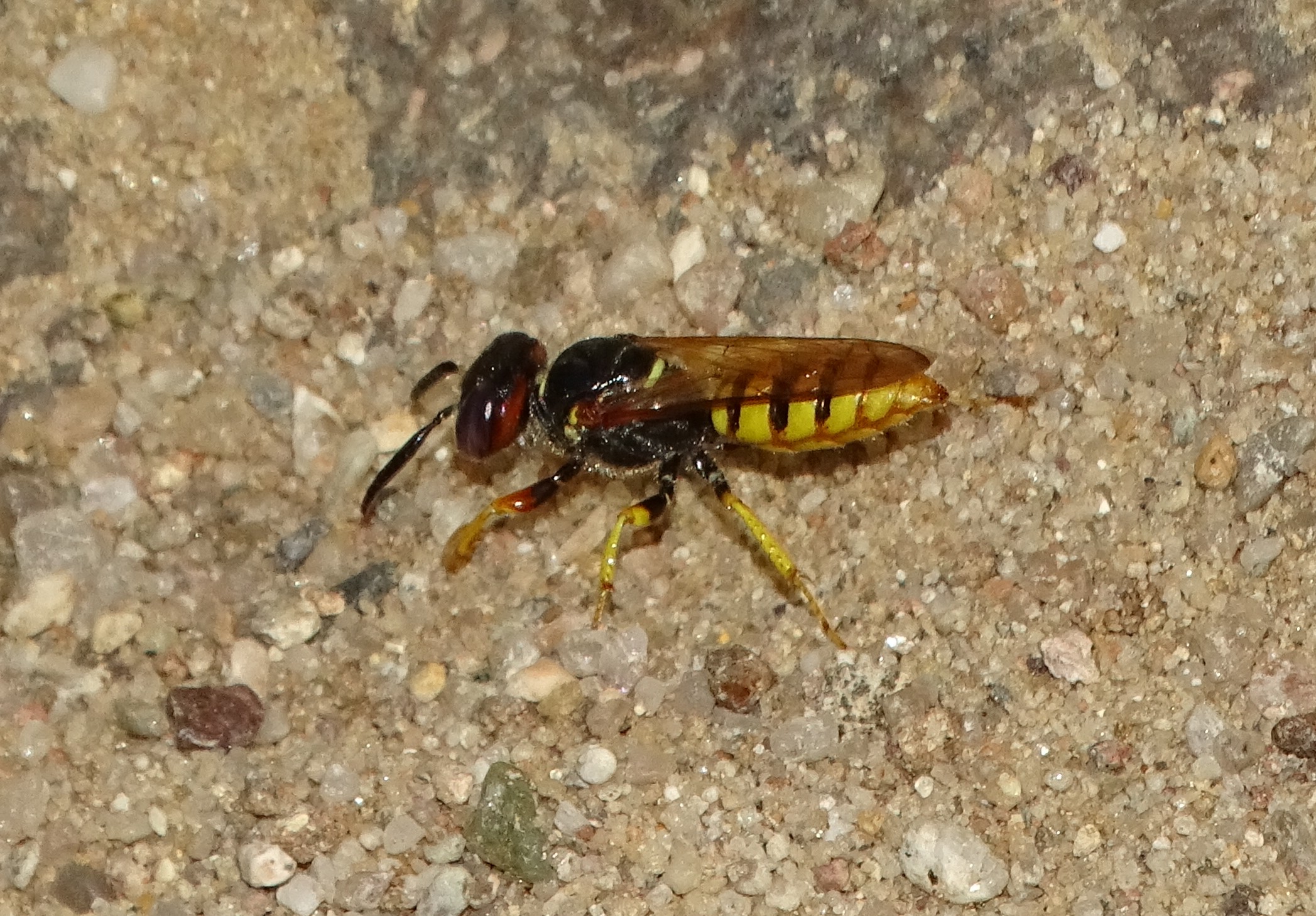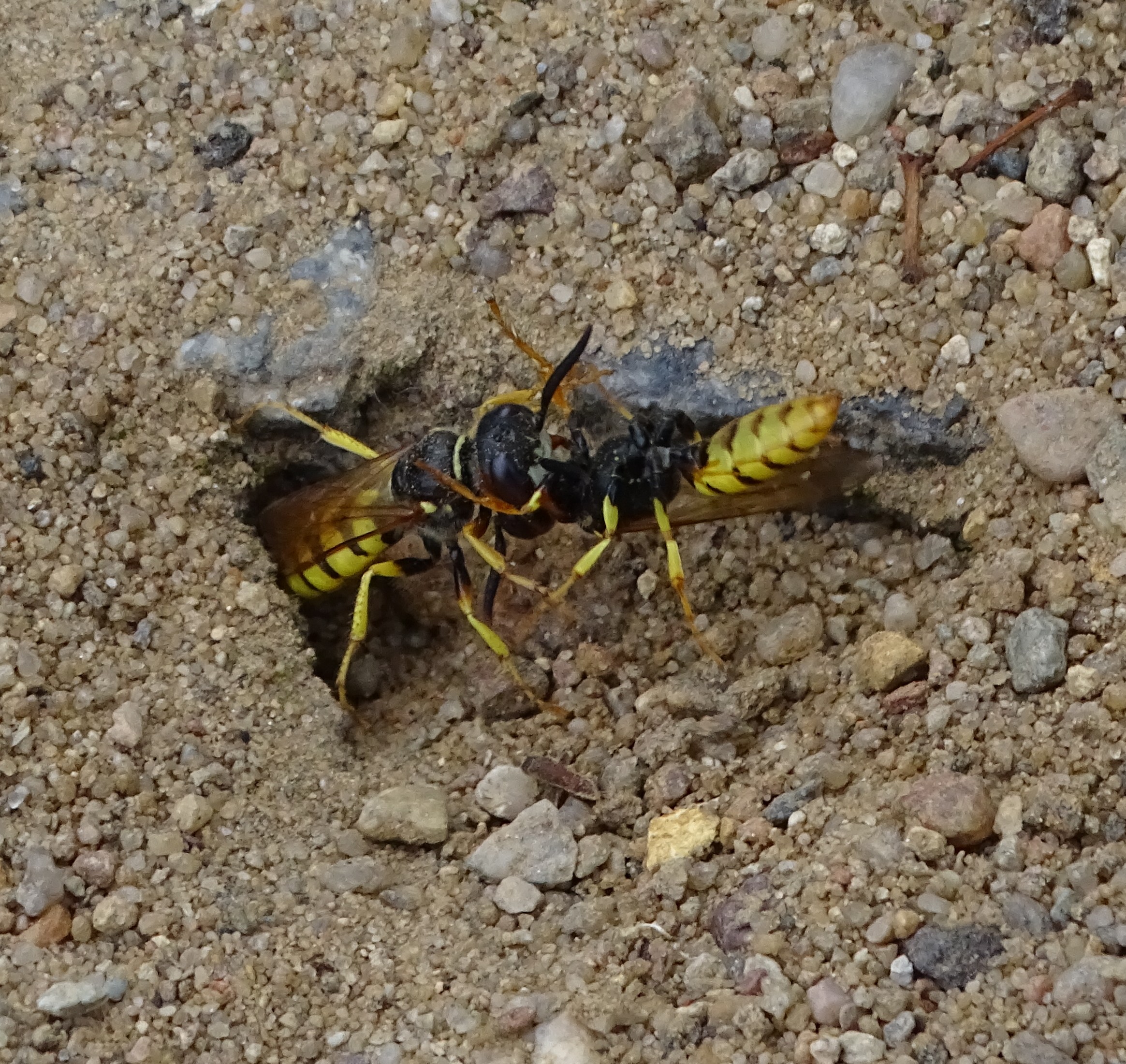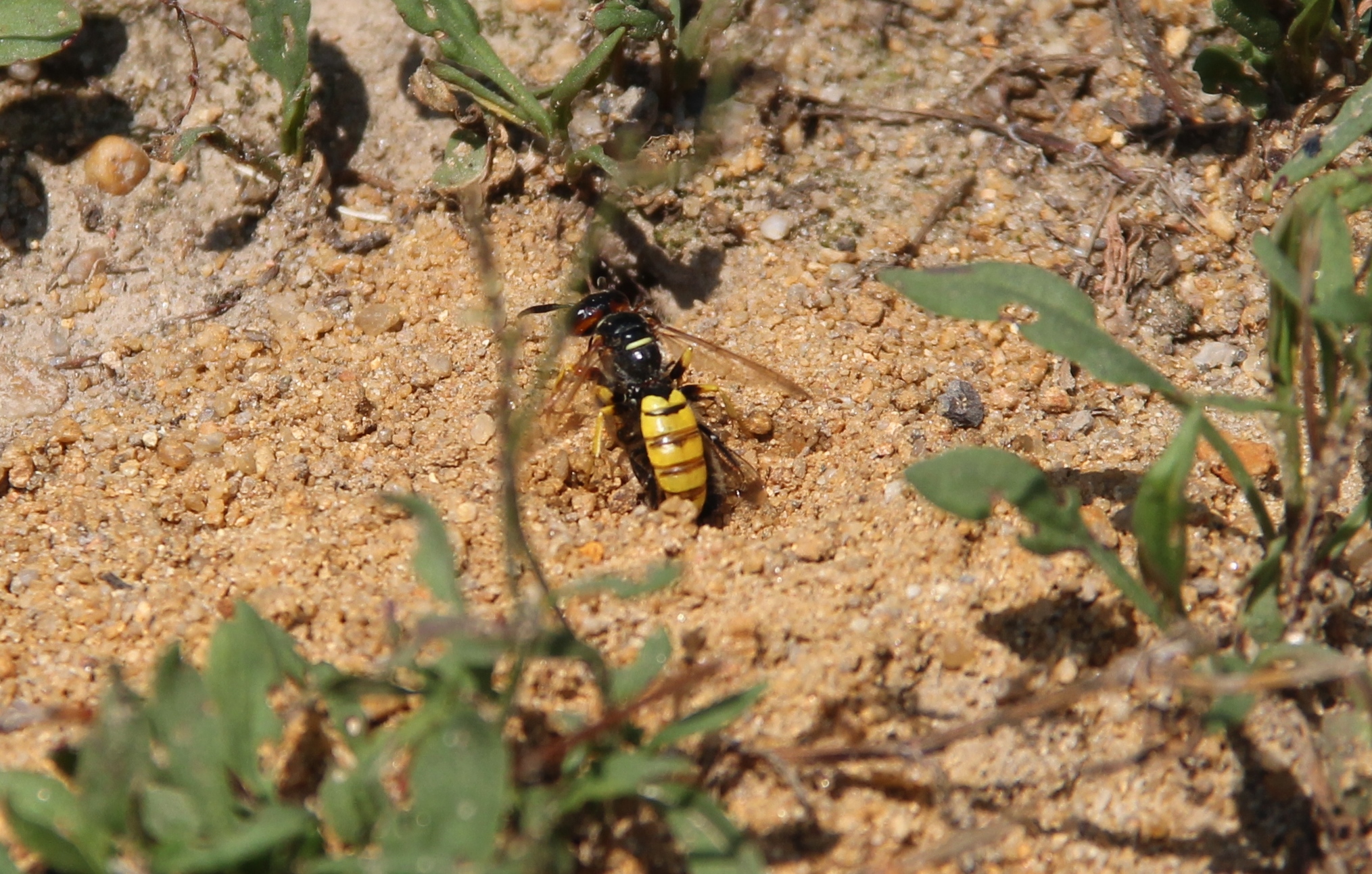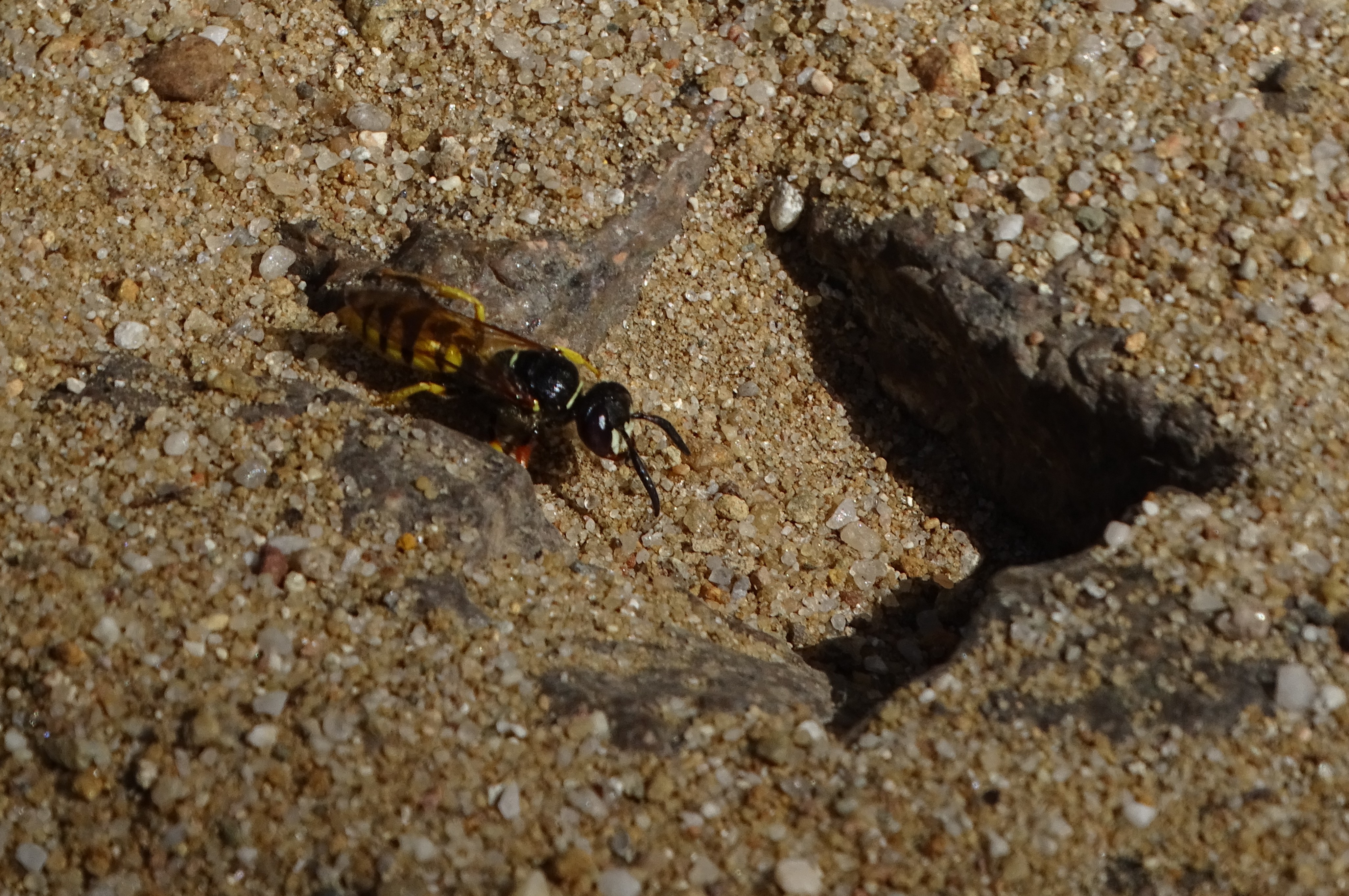 Bienenwolf, Weibchen beim Nestbau auf einem Gehweg, daneben liegt eine tote Honigbiene, Leipzig, Ortsteil Reudnitz-Thonberg, Juli 2009 (© Victor Weiler)( Bild vergrößern)
